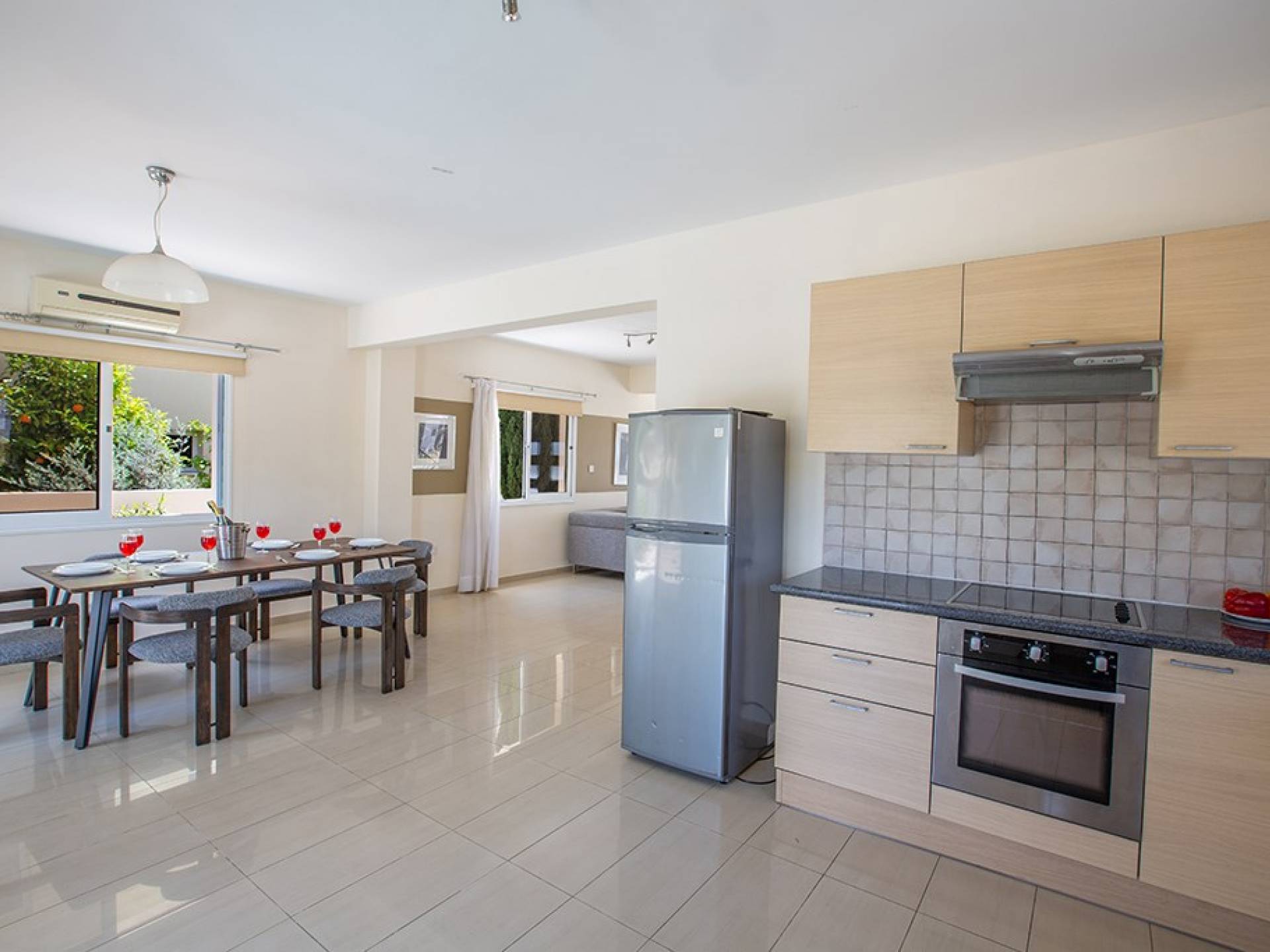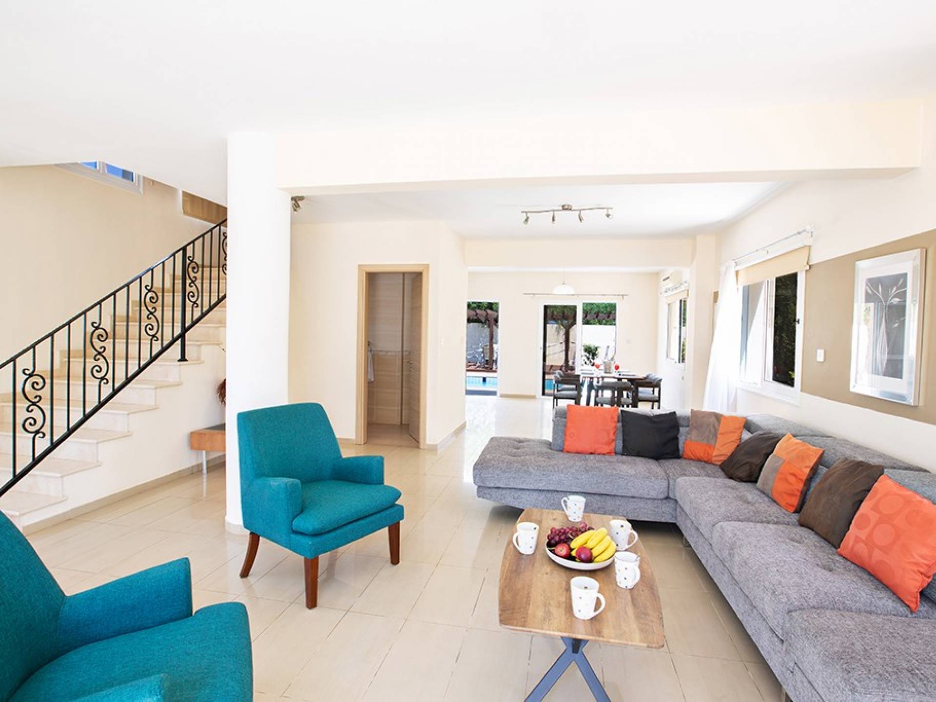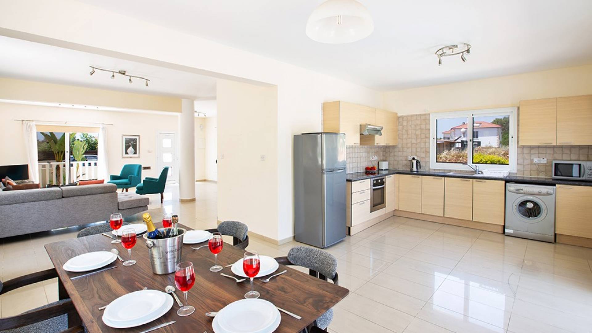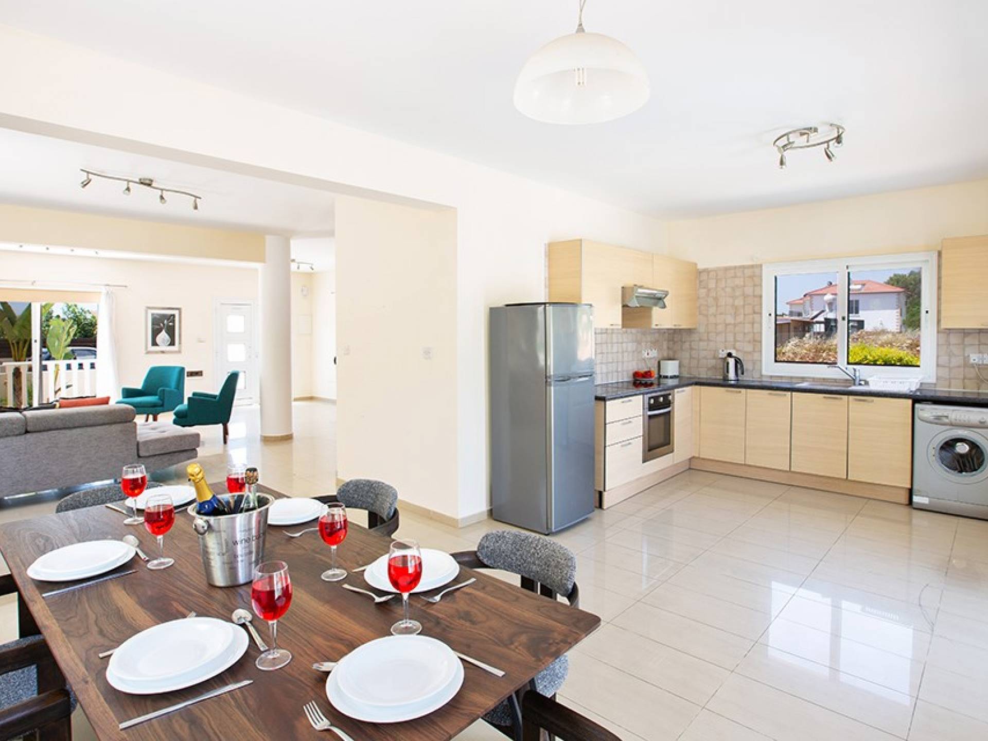 Modern and spacious, the villa is fully equipped with everything required for a relaxing stay. It features a comfortable open-plan living area, dining area with seating for 6 persons and a fitted kitchen with modern appliances. There is also a downstairs W/C.