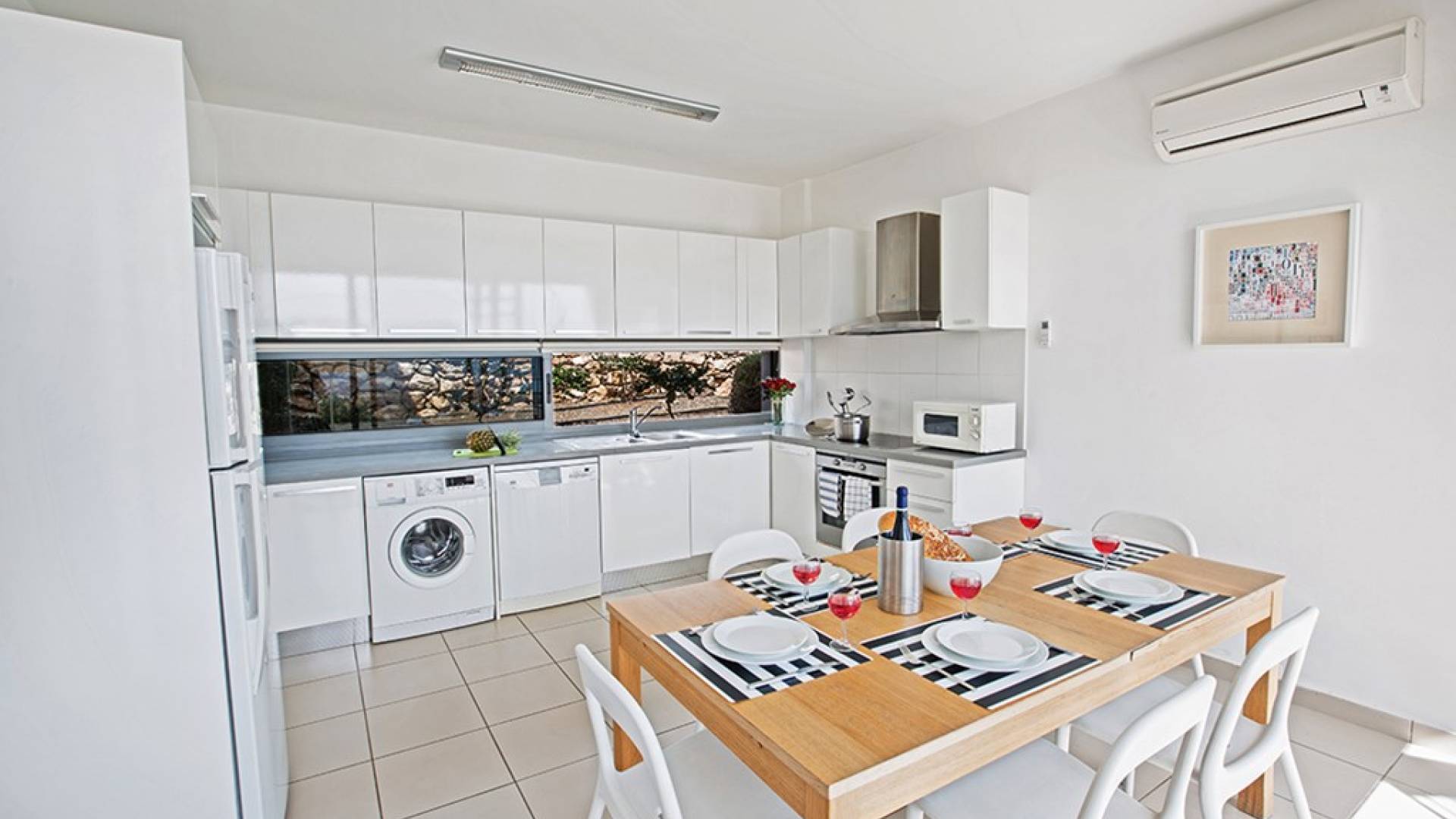 Downstairs, the villa features an open-plan living area that enjoys spectacular sea views along with soft furnishings, a satellite TV, a DVD player, and an open fireplace. The dining area seats 6 and the contemporary kitchen features all main appliances needed for a comfortable self-catering stay. A double bedroom and separate bathroom with shower and bathtub are also located on the ground floor.