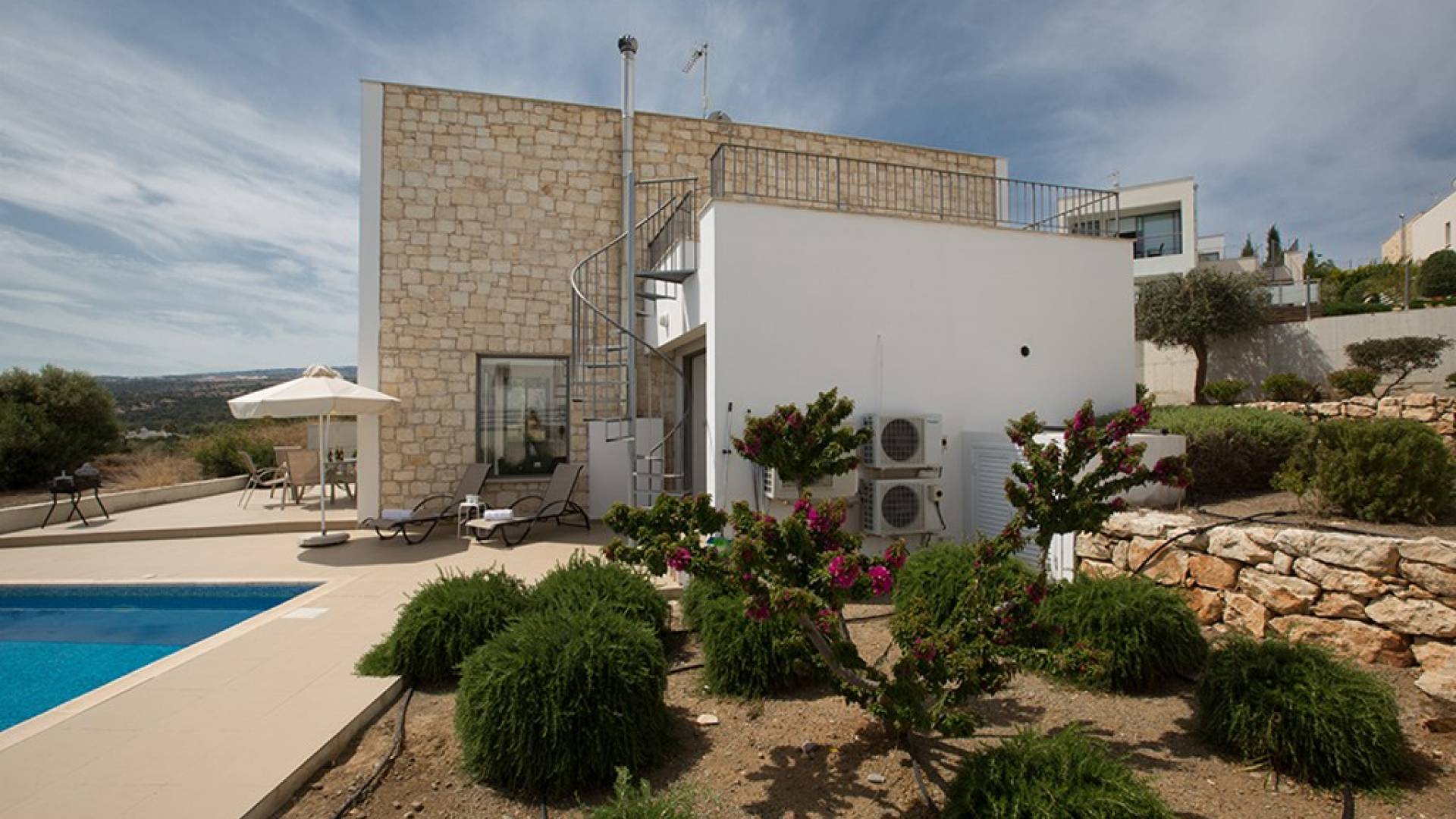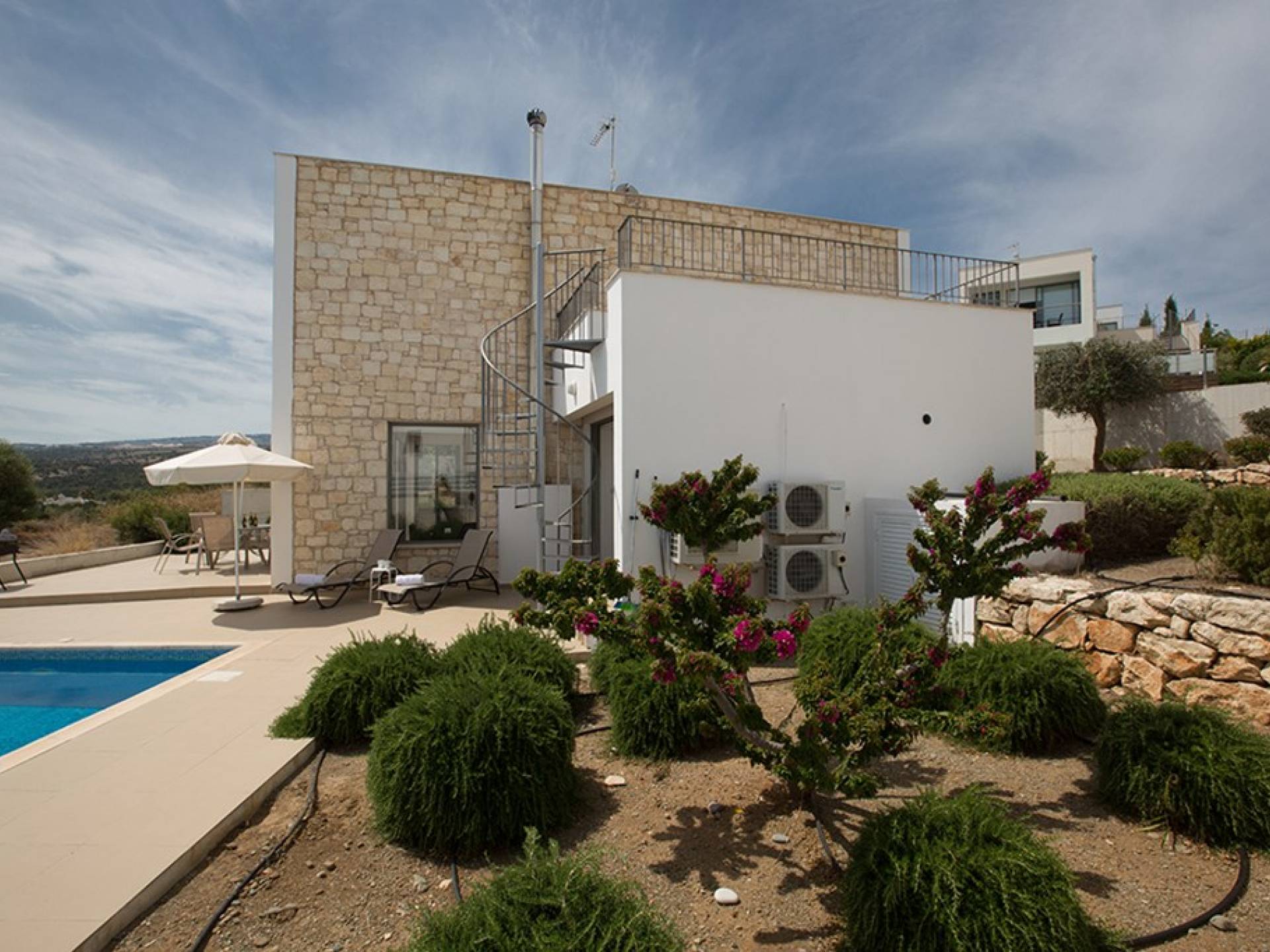 A marble staircase leads up to the first floor to a further two bedrooms, one twin and one double, both with en-suite shower rooms. Outside the villa, you will find a spacious and sunny garden area with an 8m x 4m private pool and a variety of plants and trees. There is ample space for sunbathing and outside dining and a winding staircase leads up to an open first-floor balcony area, where the late afternoon sun can be enjoyed. This villa is magnificent in every way and located in one of the most picturesque areas of Cyprus.