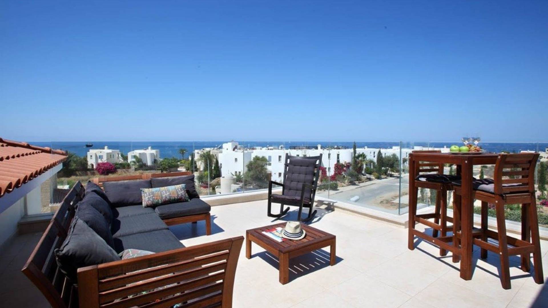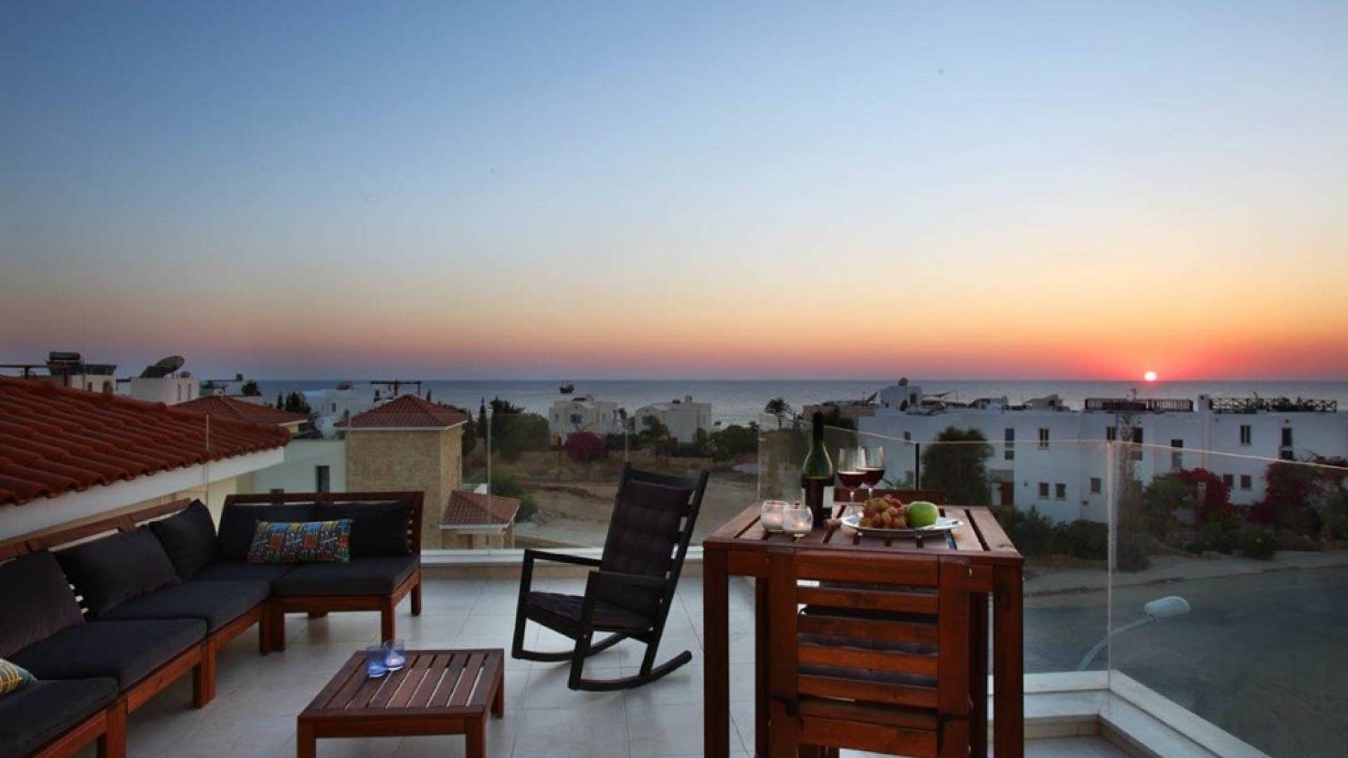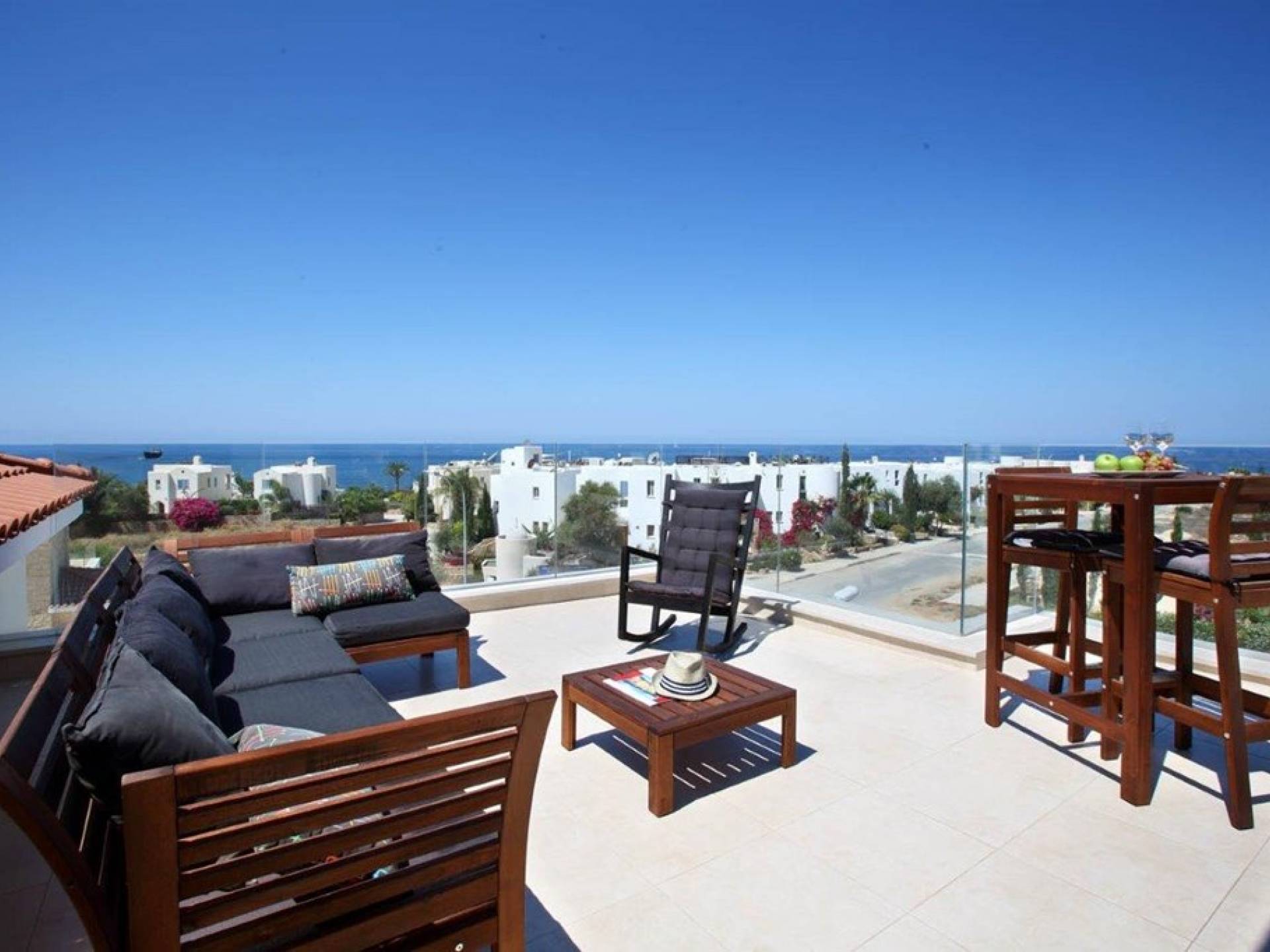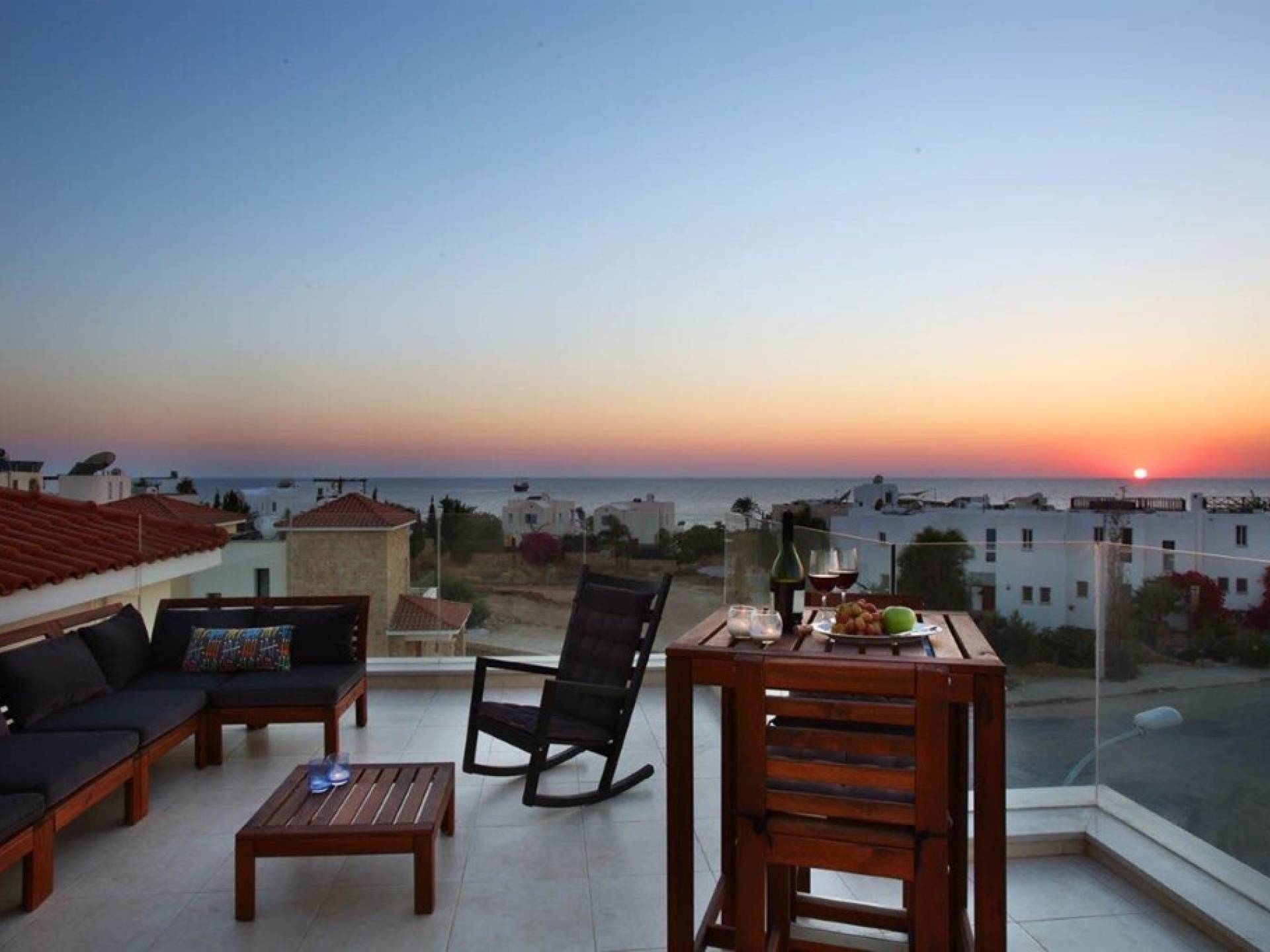 Free wi-fi and Android box for your entertainment. The villa has air-conditioning throughout for both cooling and heating and is included in the rental price. All the bedrooms are modern and stylish and provide top-quality beddings for your comfort. Each room has an en-suite bathroom or shower. The patio and garden just next to the villa’s private pool, are the perfect place for spending warm summer days. Here you will find sun loungers, outdoor dining for 6, and a BBQ area. The villa also offers a spacious roof garden with views overlooking the Mediterranean. A glass of wine is a must here, in order for you to enjoy the view and the Cyprus sun or sunset.