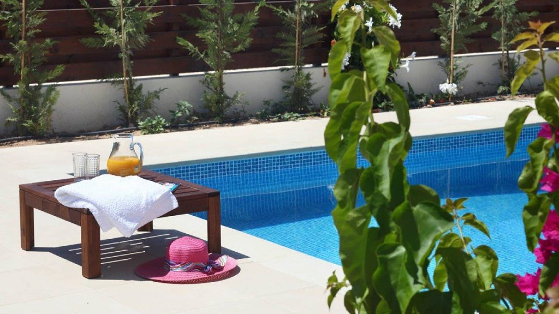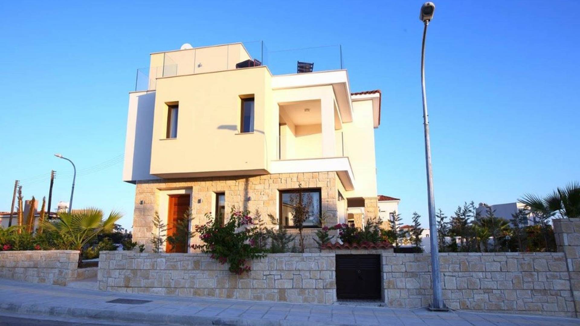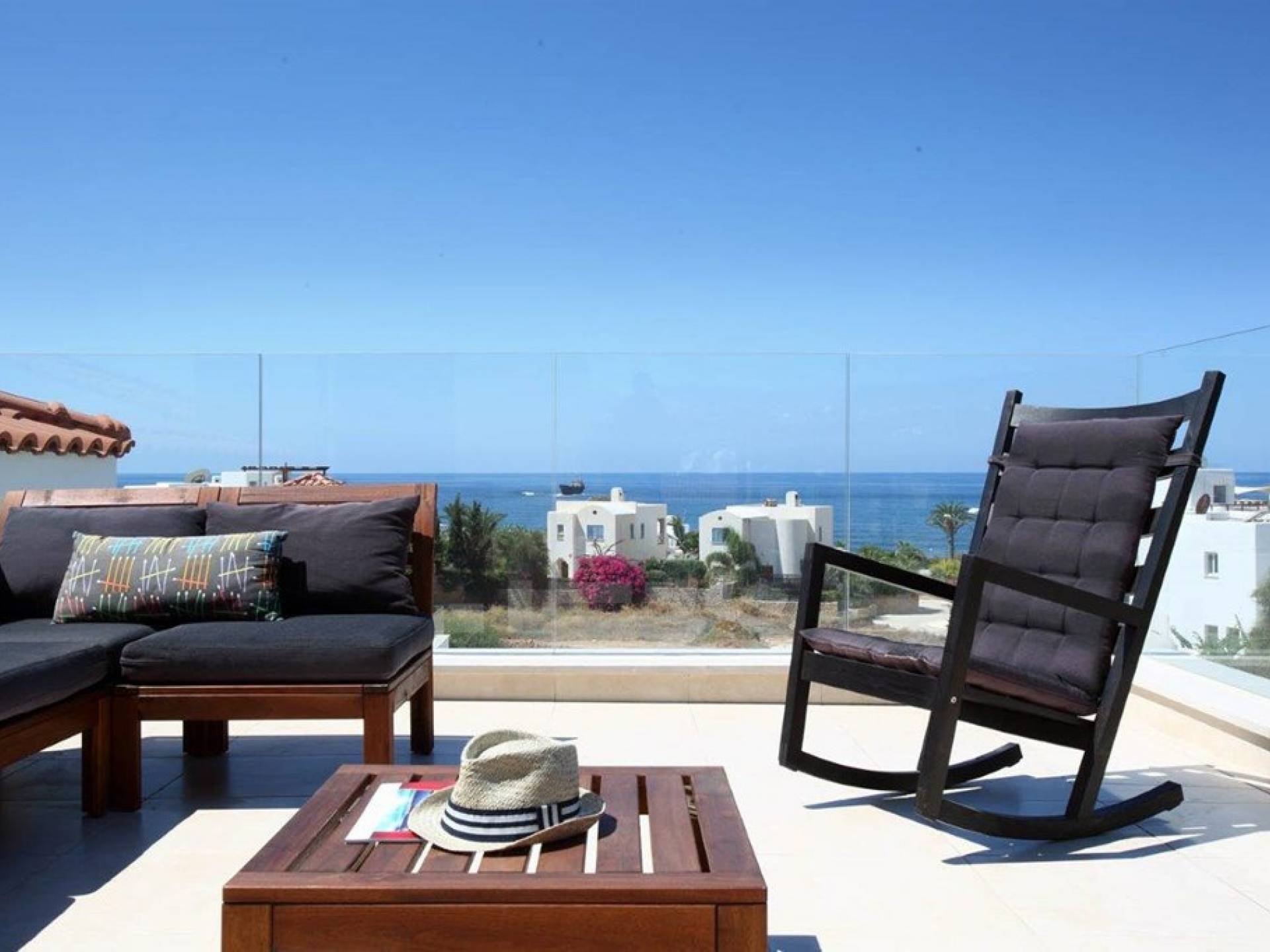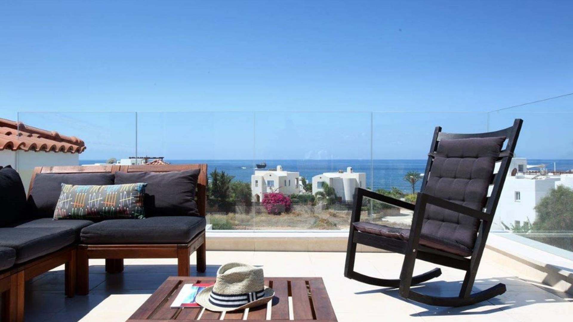 Free wi-fi and Android box for your entertainment. The villa has air-conditioning throughout for both cooling and heating and is included in the rental price. All the bedrooms are modern and stylish and provide top-quality beddings for your comfort. Each room has an en-suite bathroom or shower. The patio and garden just next to the villa’s private pool, are the perfect place for spending warm summer days. Here you will find sun loungers, outdoor dining for 6, and a BBQ area. The villa also offers a spacious roof garden with views overlooking the Mediterranean. A glass of wine is a must here, in order for you to enjoy the view and the Cyprus sun or sunset.