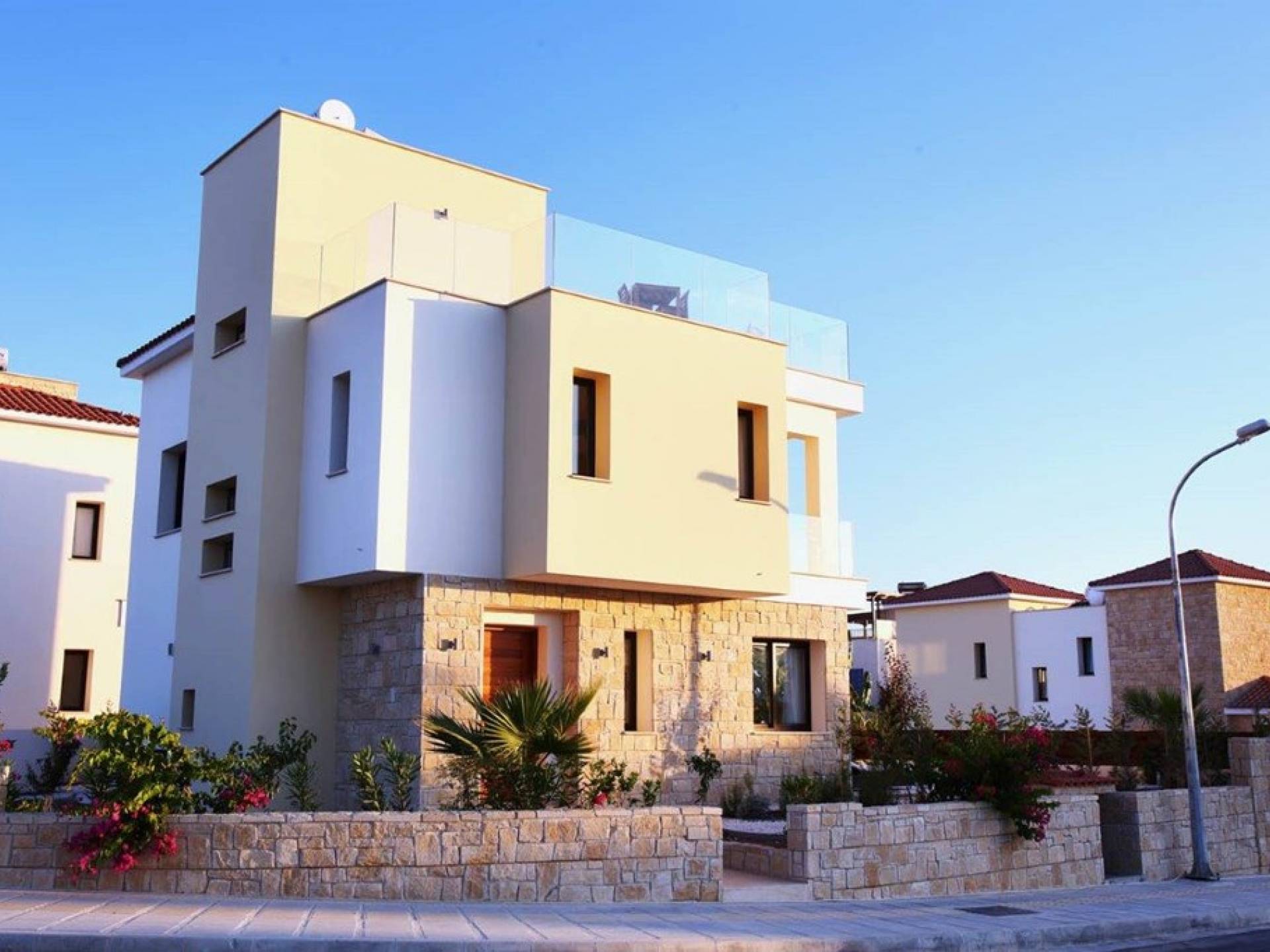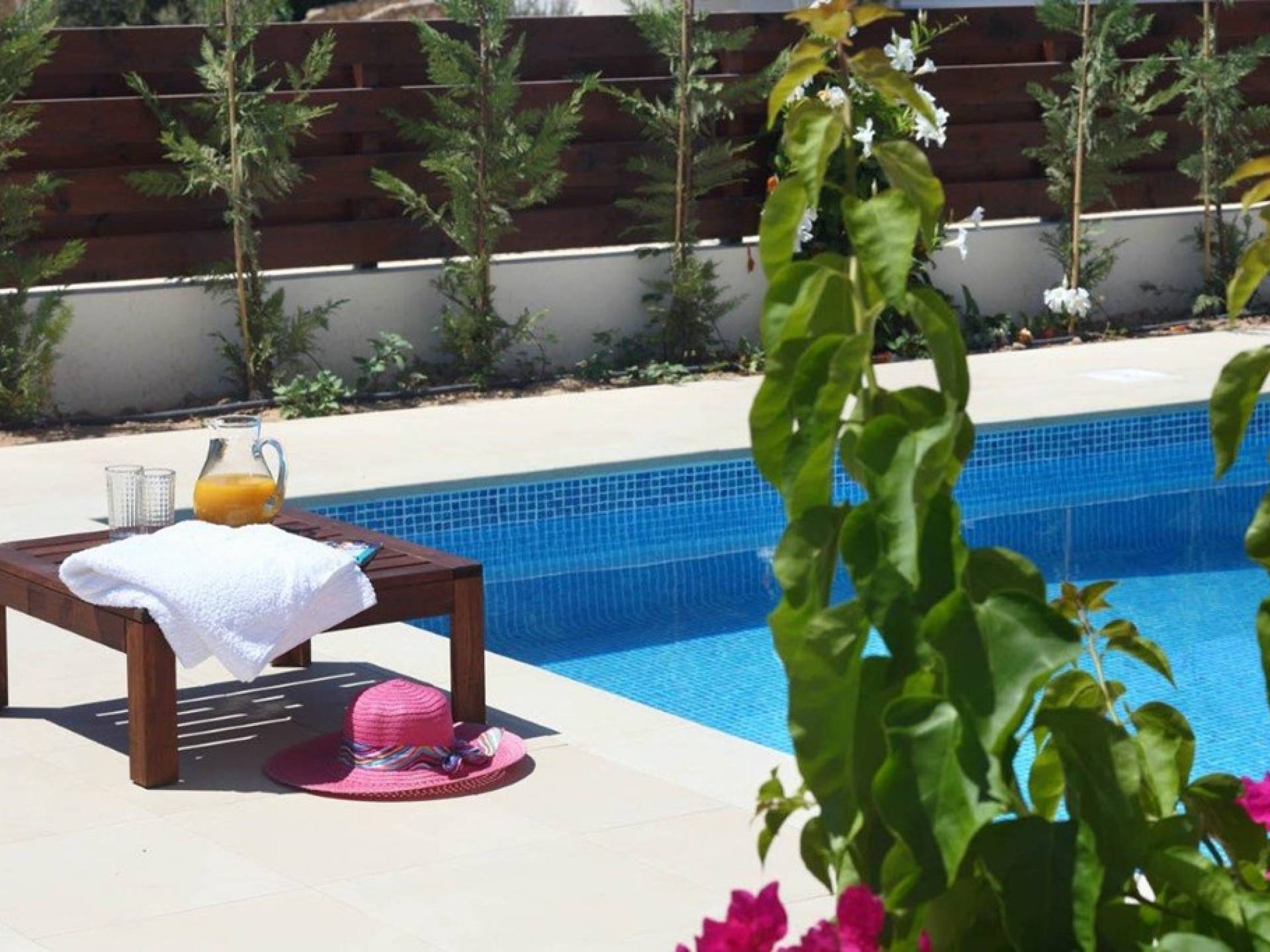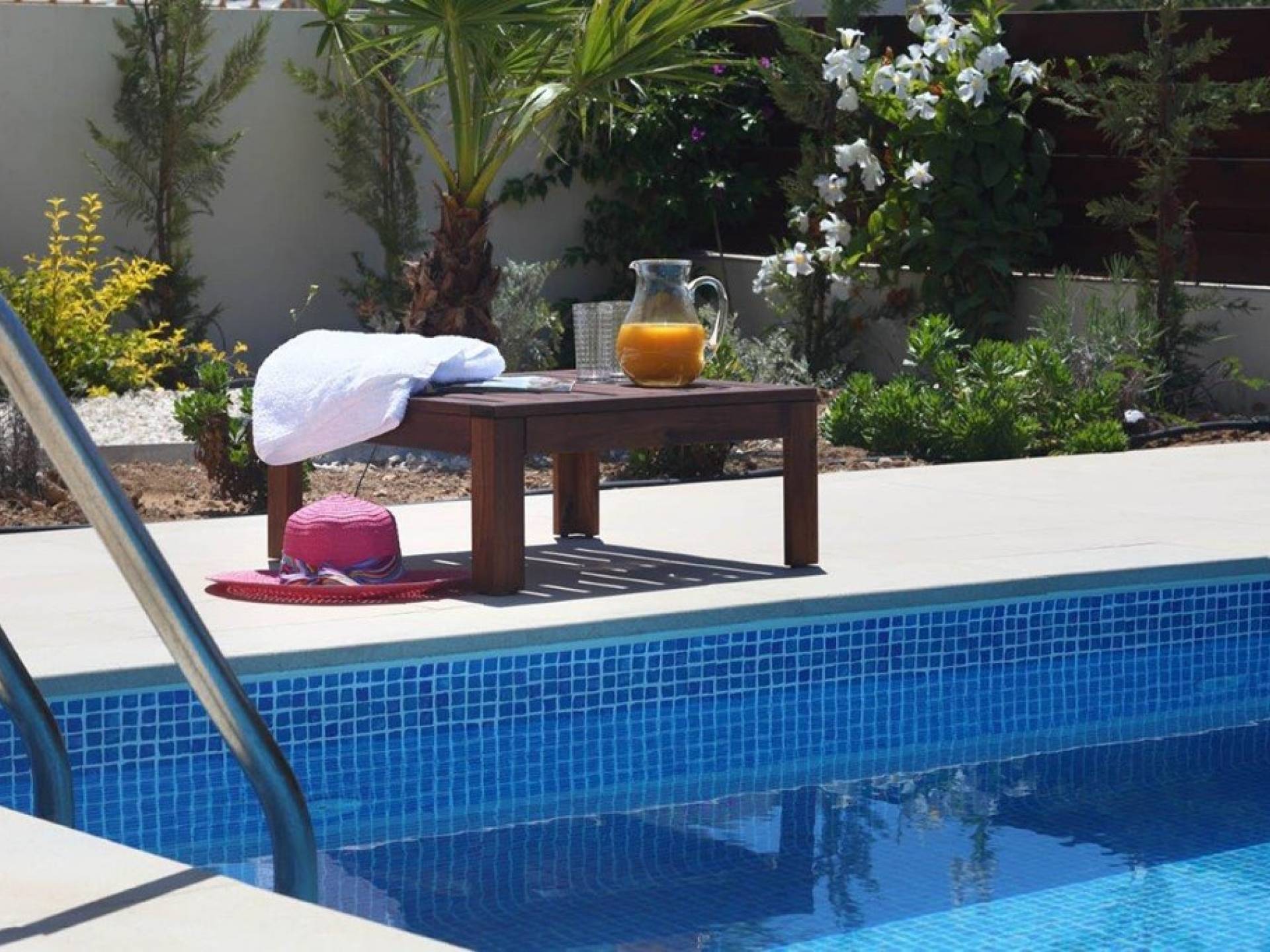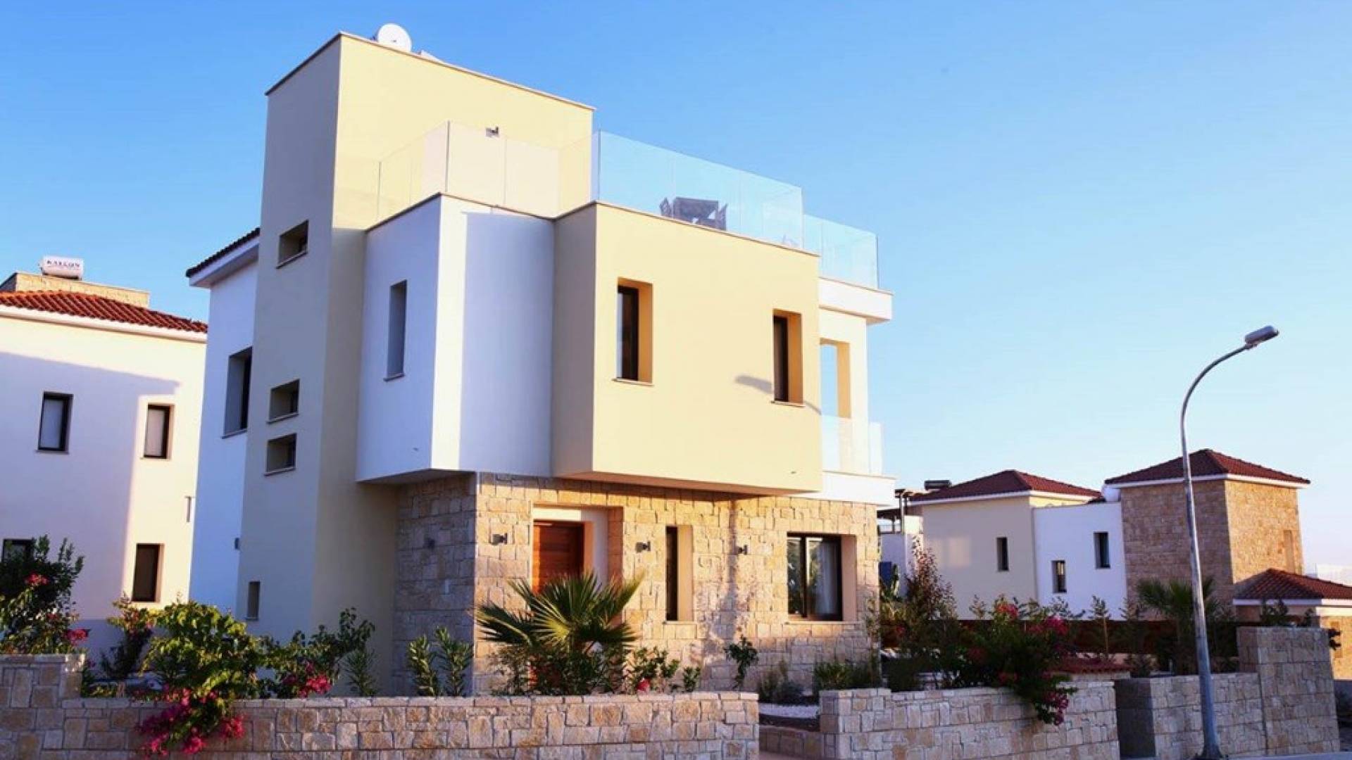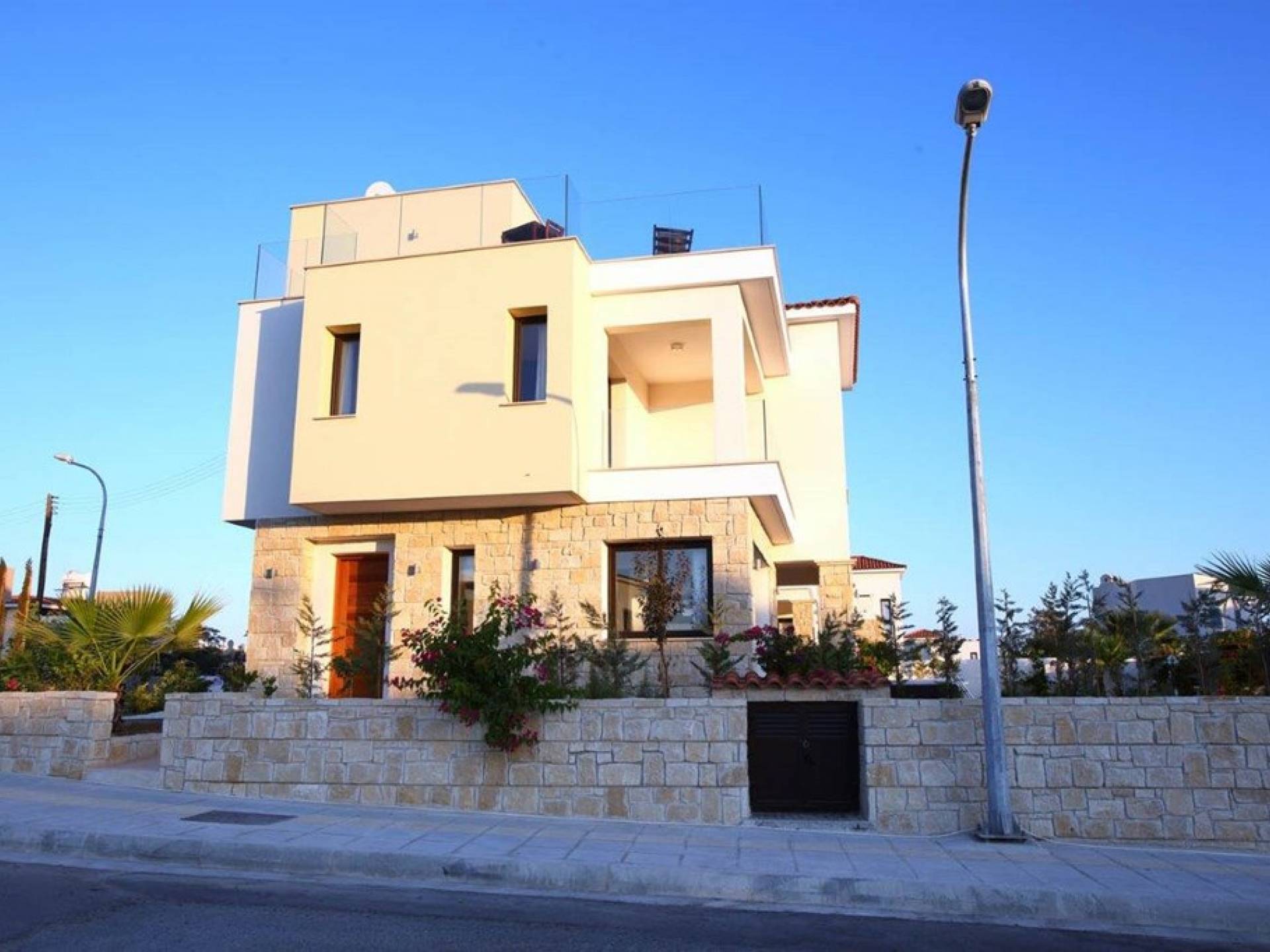 Free wi-fi and Android box for your entertainment. The villa has air-conditioning throughout for both cooling and heating and is included in the rental price. All the bedrooms are modern and stylish and provide top-quality beddings for your comfort. Each room has an en-suite bathroom or shower. The patio and garden just next to the villa’s private pool, are the perfect place for spending warm summer days. Here you will find sun loungers, outdoor dining for 6, and a BBQ area. The villa also offers a spacious roof garden with views overlooking the Mediterranean. A glass of wine is a must here, in order for you to enjoy the view and the Cyprus sun or sunset.