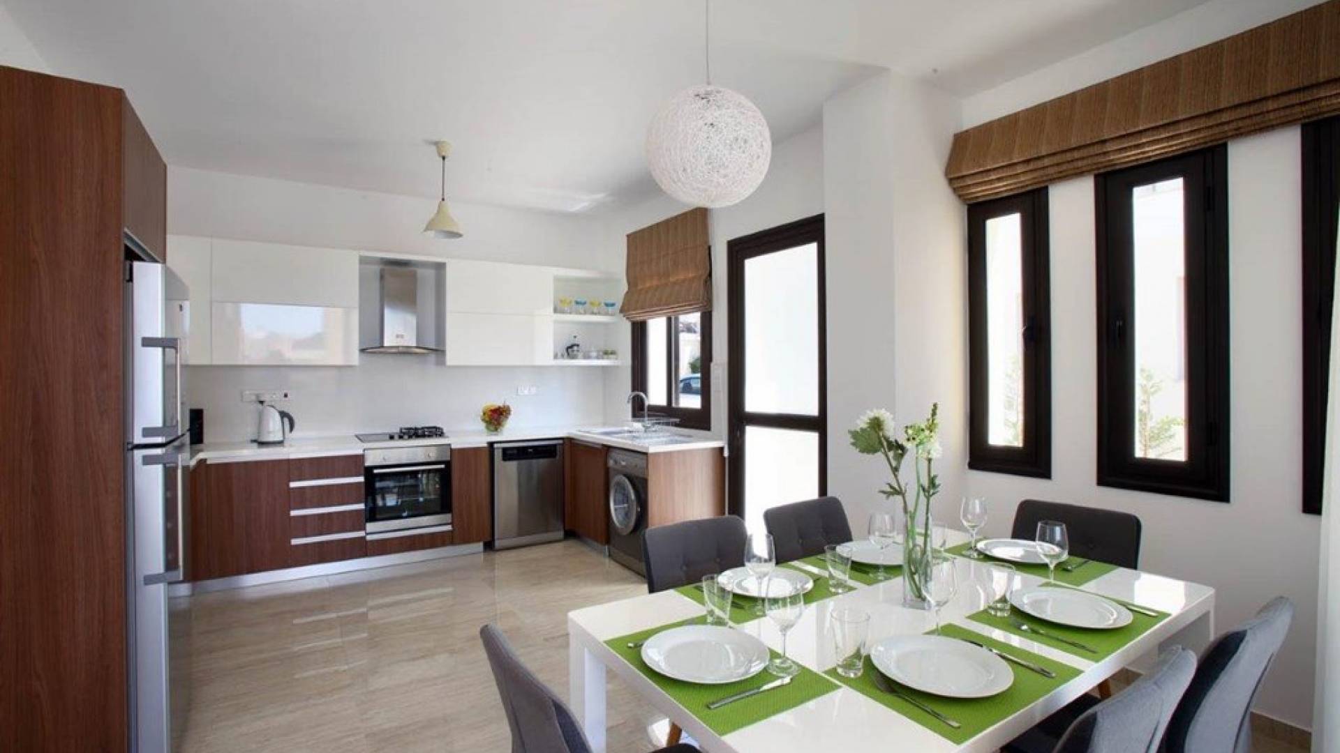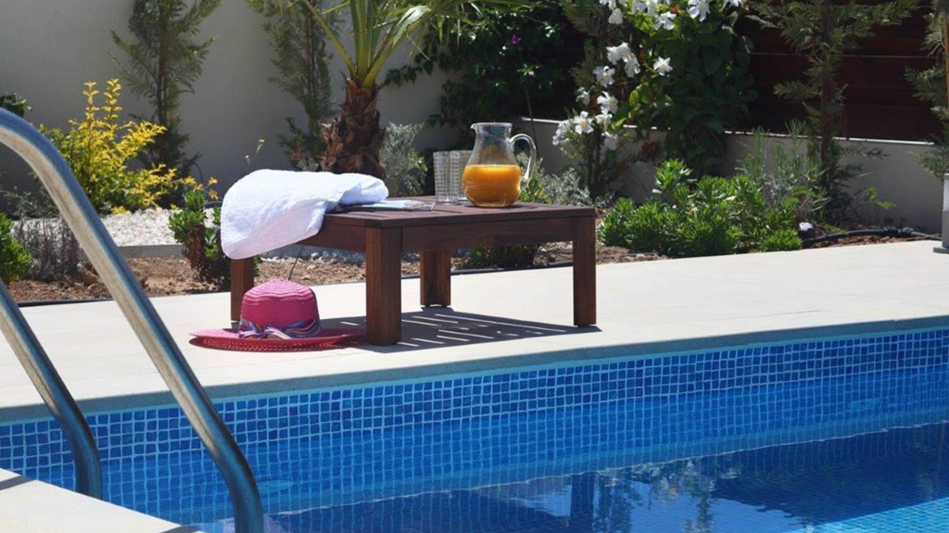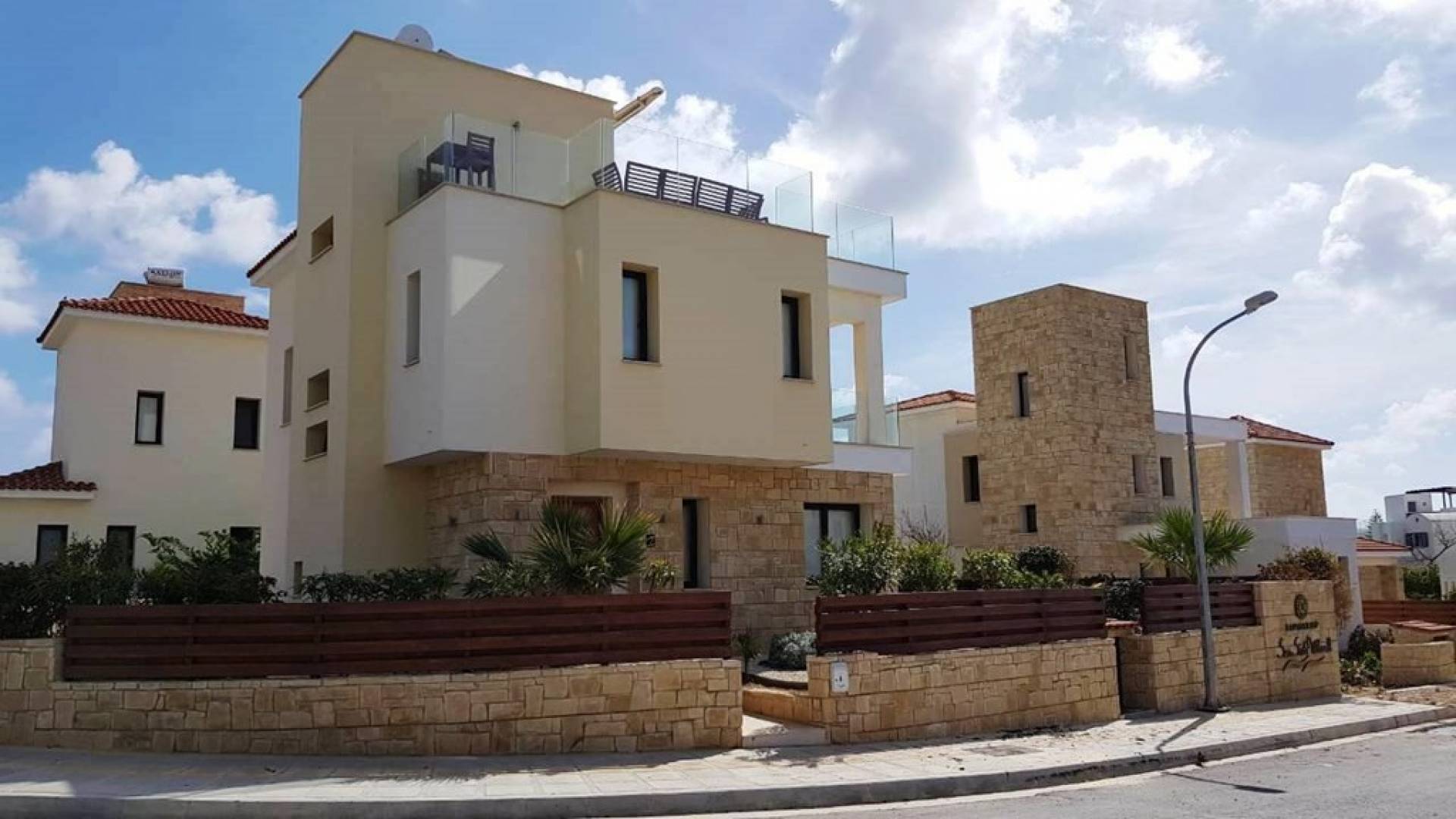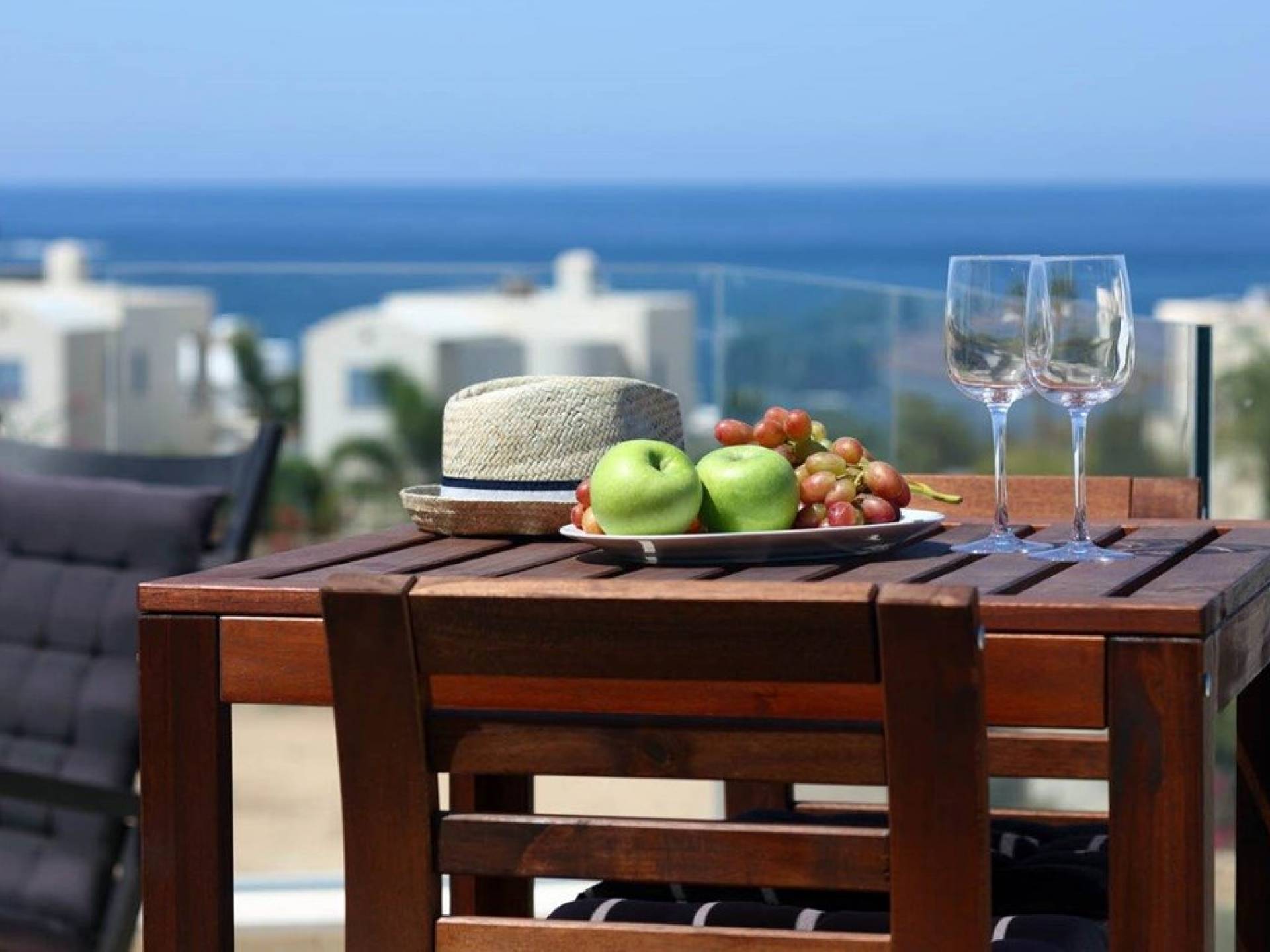 Free wi-fi and Android box for your entertainment. The villa has air-conditioning throughout for both cooling and heating and is included in the rental price. All the bedrooms are modern and stylish and provide top-quality beddings for your comfort. Each room has an en-suite bathroom or shower. The patio and garden just next to the villa’s private pool, are the perfect place for spending warm summer days. Here you will find sun loungers, outdoor dining for 6, and a BBQ area. The villa also offers a spacious roof garden with views overlooking the Mediterranean. A glass of wine is a must here, in order for you to enjoy the view and the Cyprus sun or sunset.