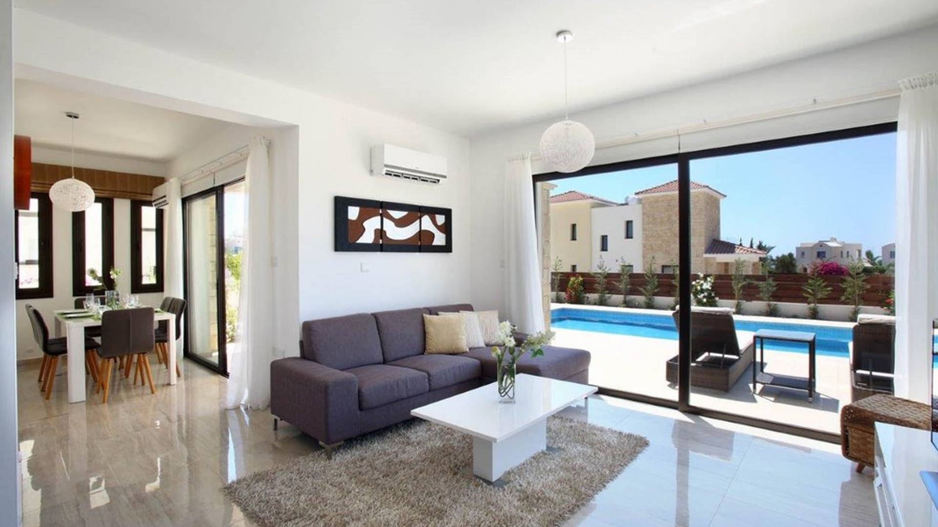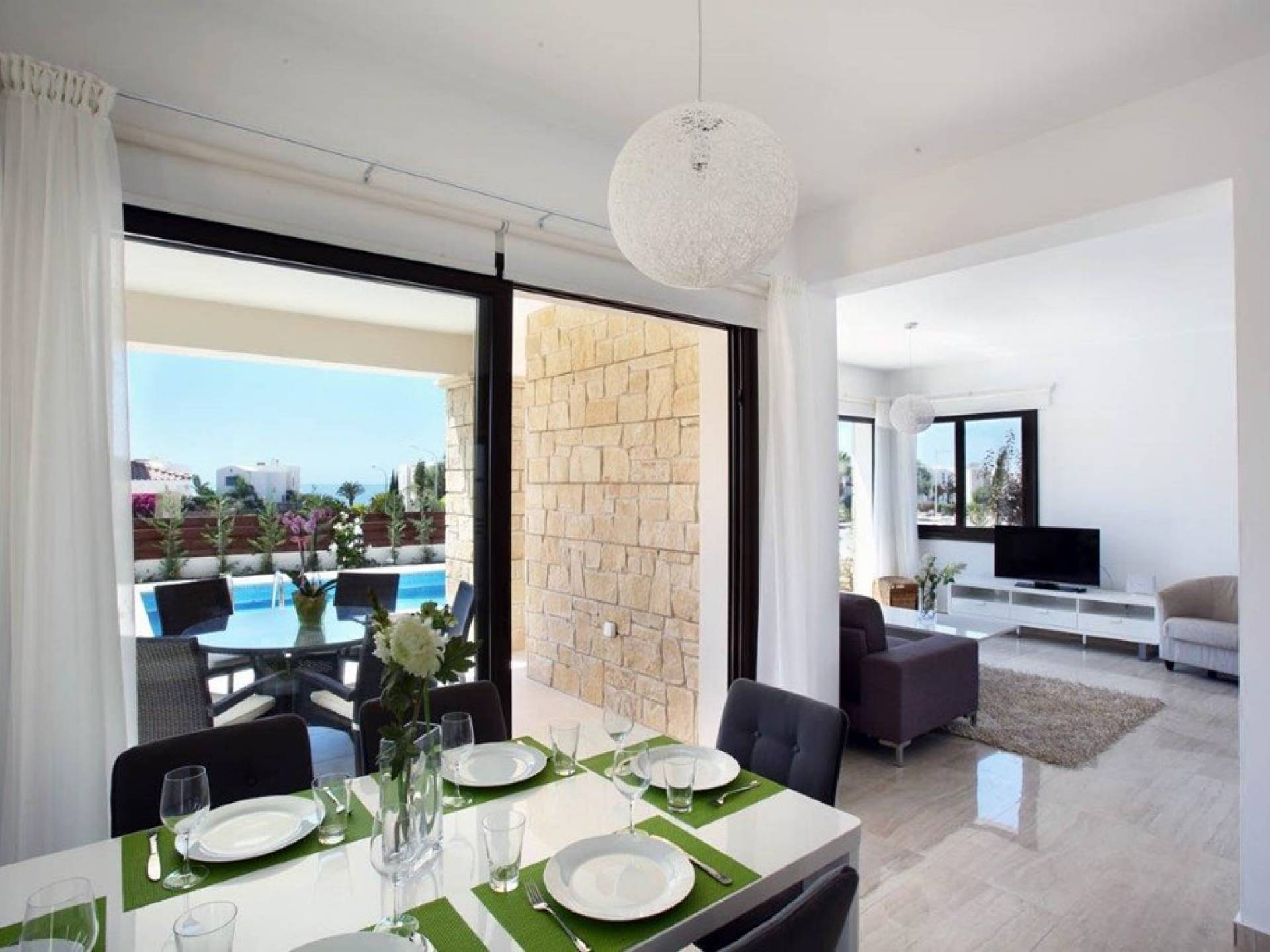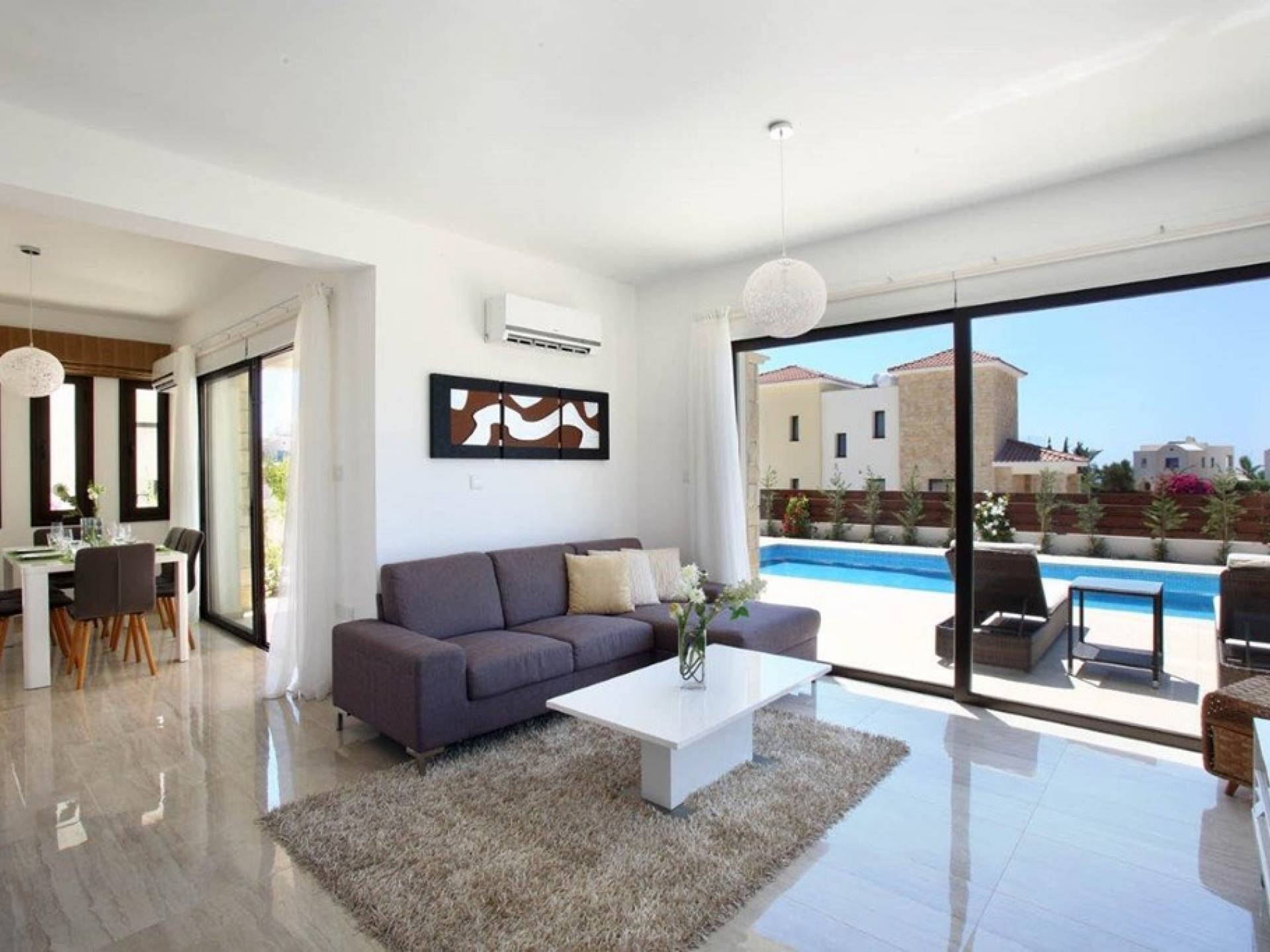 Inside, the open plan living area is light, spacious, and filled with luxurious furnishings and colorful artwork. The open-plan design kitchen comes fully equipped in order for you to enjoy your gourmet masterpieces cooked by your own hands. The fully equipped kitchen features an oven, hob, fridge freezer, washing machine, dishwasher and microwave. The dining area seats 6 guests comfortably and offers views of the pool and garden. The lounge is just off from the dining area and has a large couch, a TV, and sliding doors leading out to the private pool.