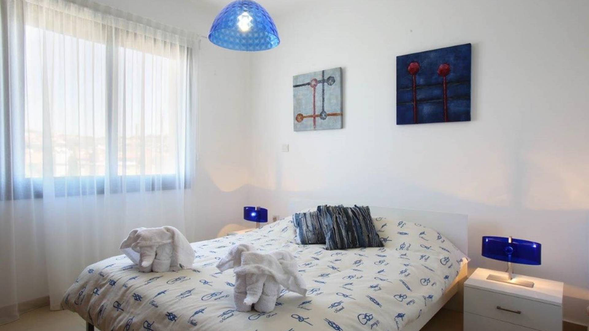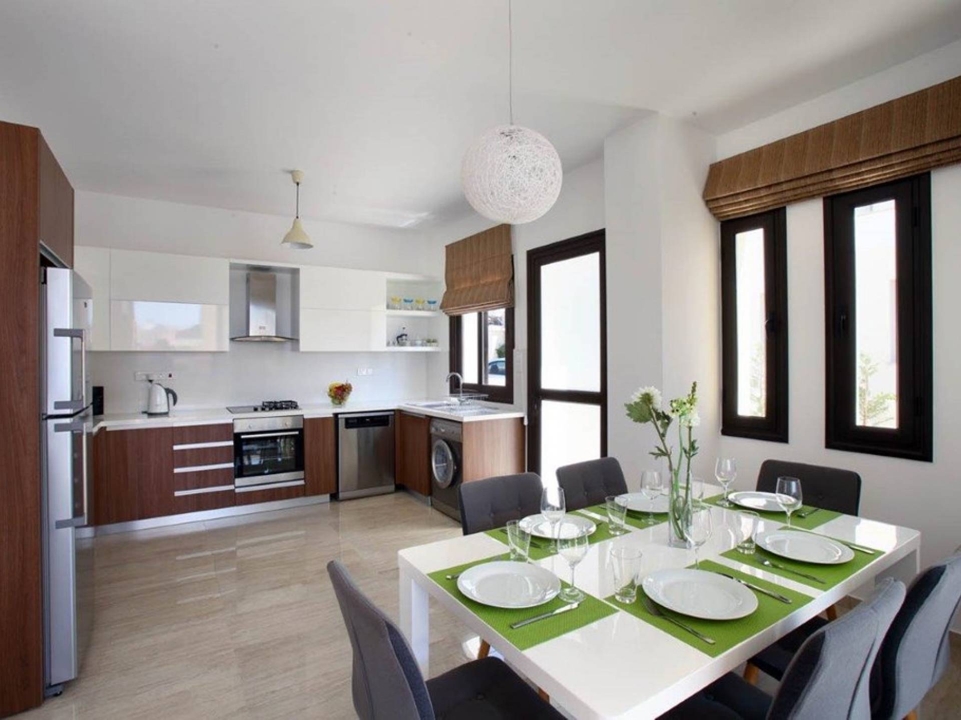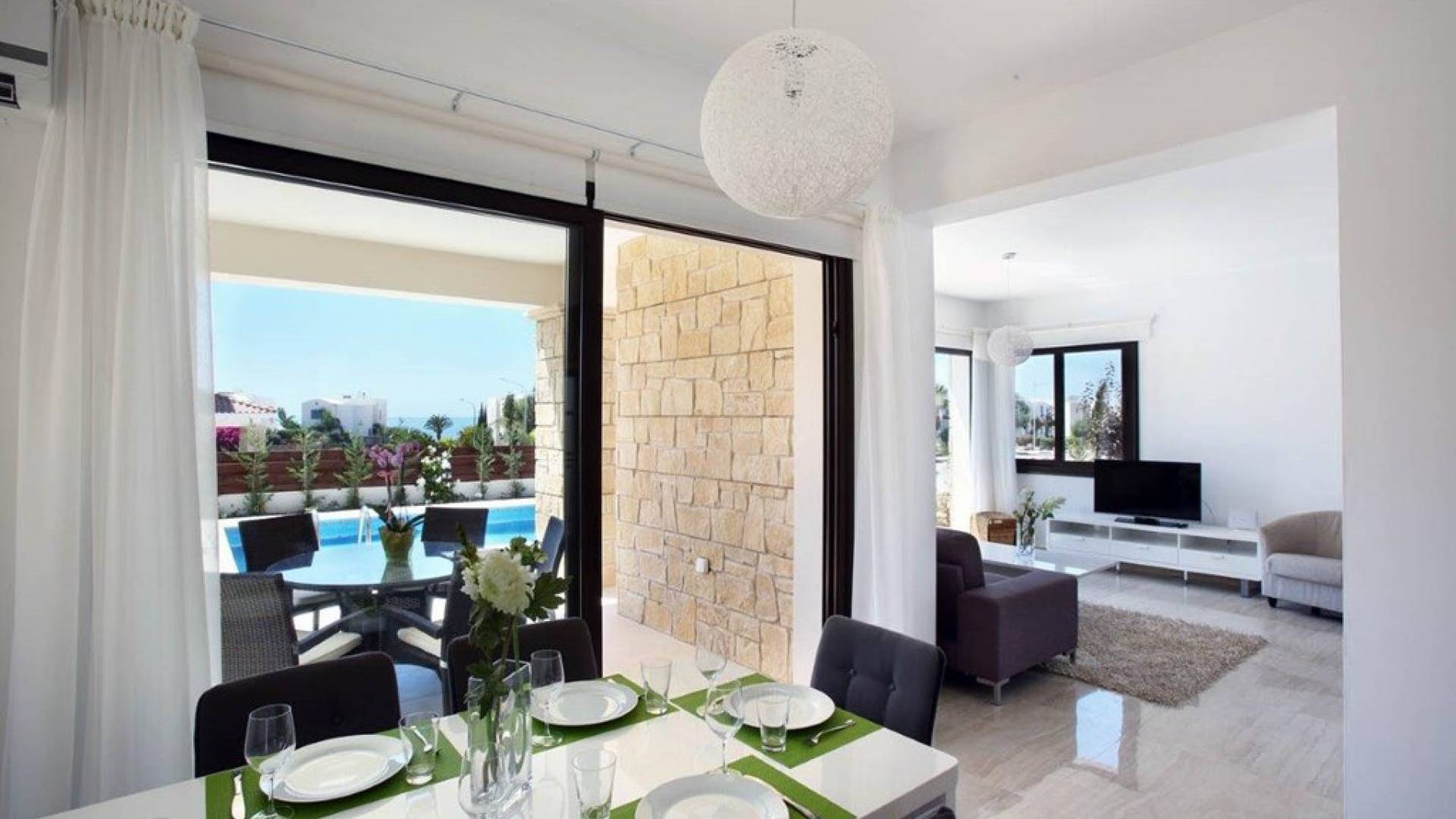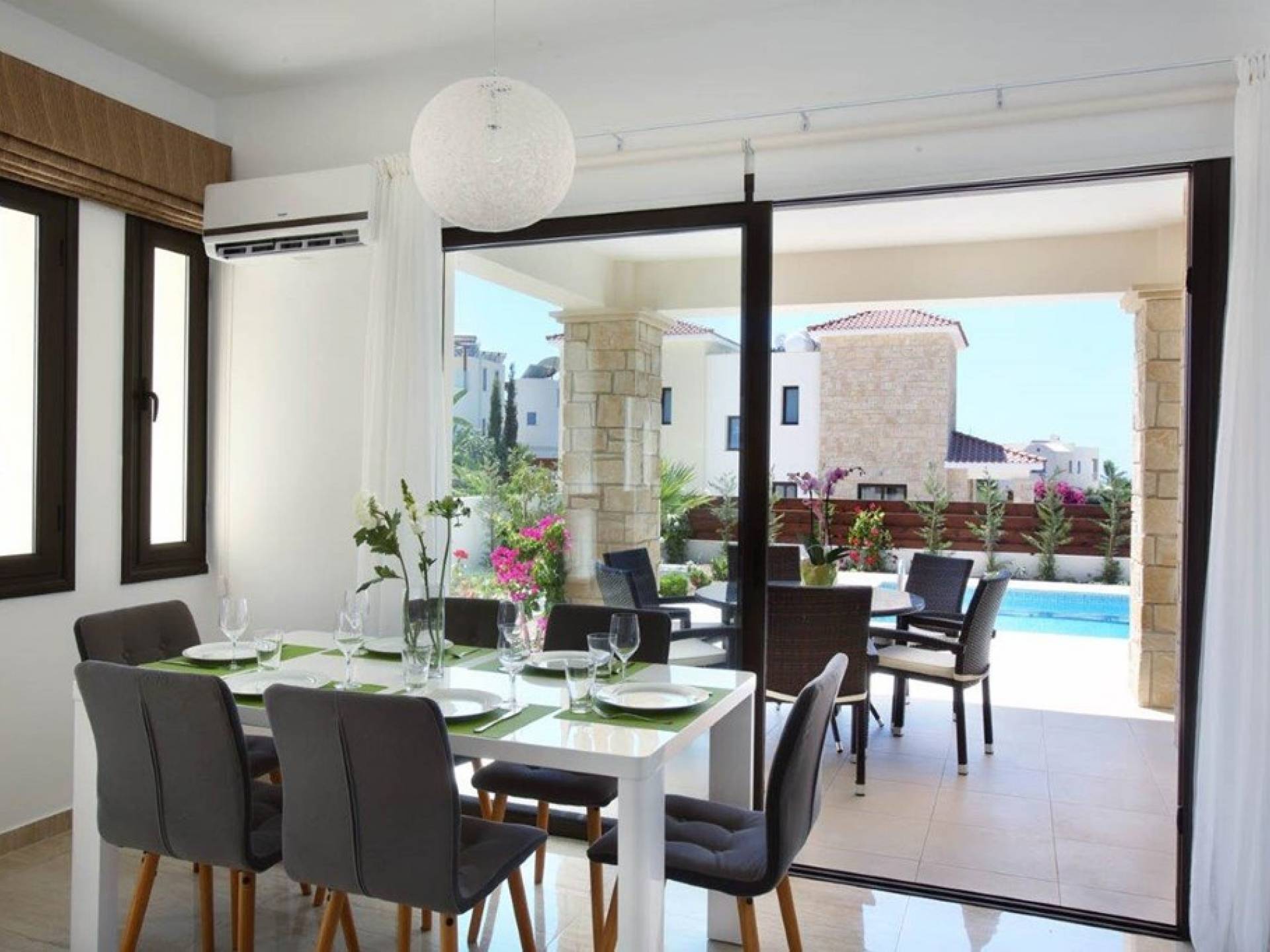 Inside, the open plan living area is light, spacious, and filled with luxurious furnishings and colorful artwork. The open-plan design kitchen comes fully equipped in order for you to enjoy your gourmet masterpieces cooked by your own hands. The fully equipped kitchen features an oven, hob, fridge freezer, washing machine, dishwasher and microwave. The dining area seats 6 guests comfortably and offers views of the pool and garden. The lounge is just off from the dining area and has a large couch, a TV, and sliding doors leading out to the private pool.