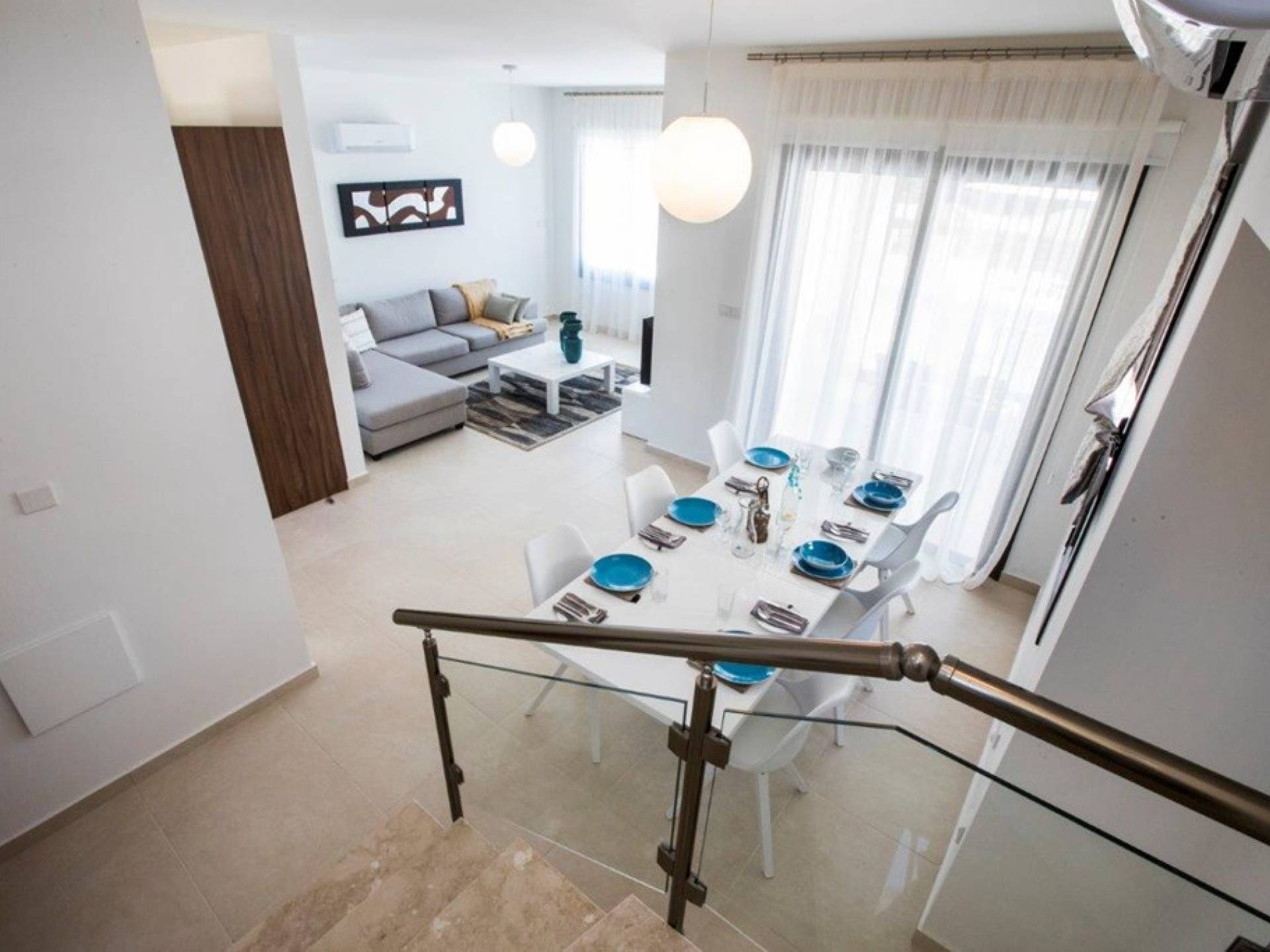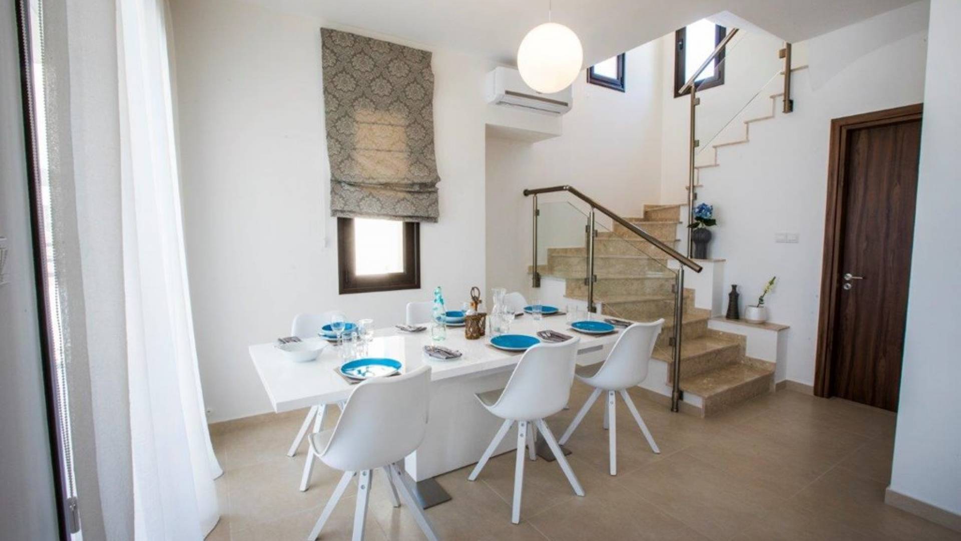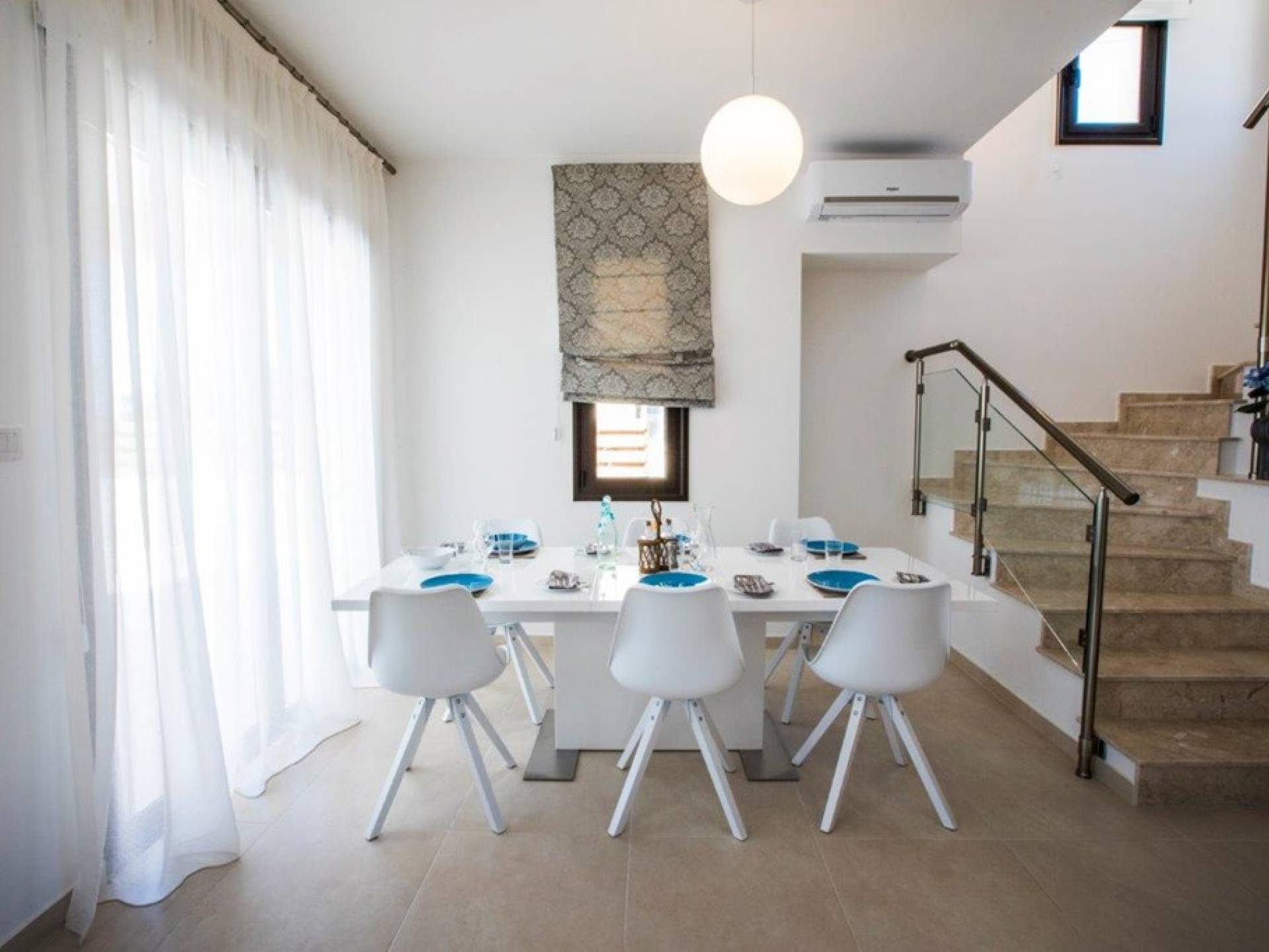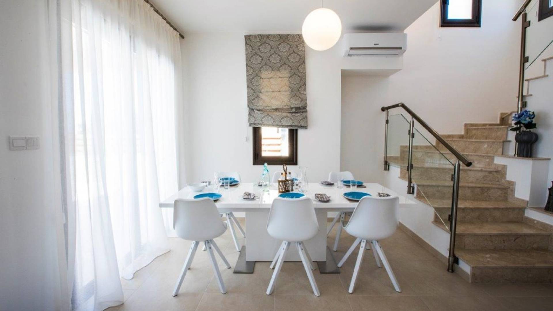Upon entering the villa you will find on the ground floor a modern furnished open plan dining and living area, with a corner sofa and a flat-screen with an Android box with unlimited channels and movies for your entertainment. Free wi-fi all over the villa. The modern kitchen is equipped with a fridge/freezer, electric oven, 4 ring hob, kettle, toaster, microwave, and a washing machine. Further on the ground floor, you will find a separate WC.