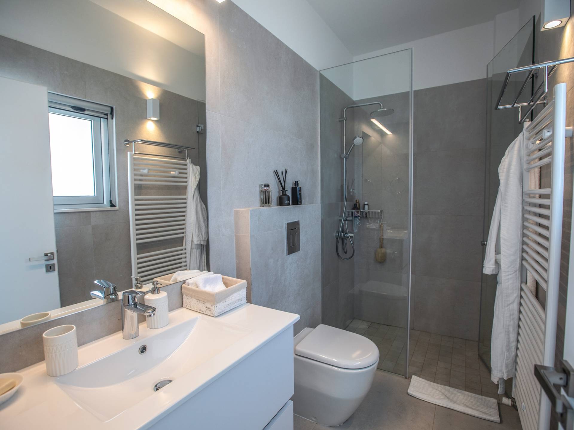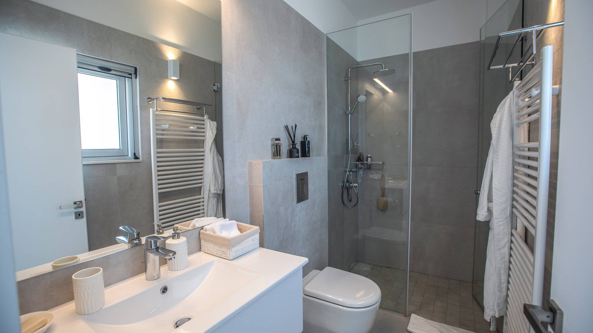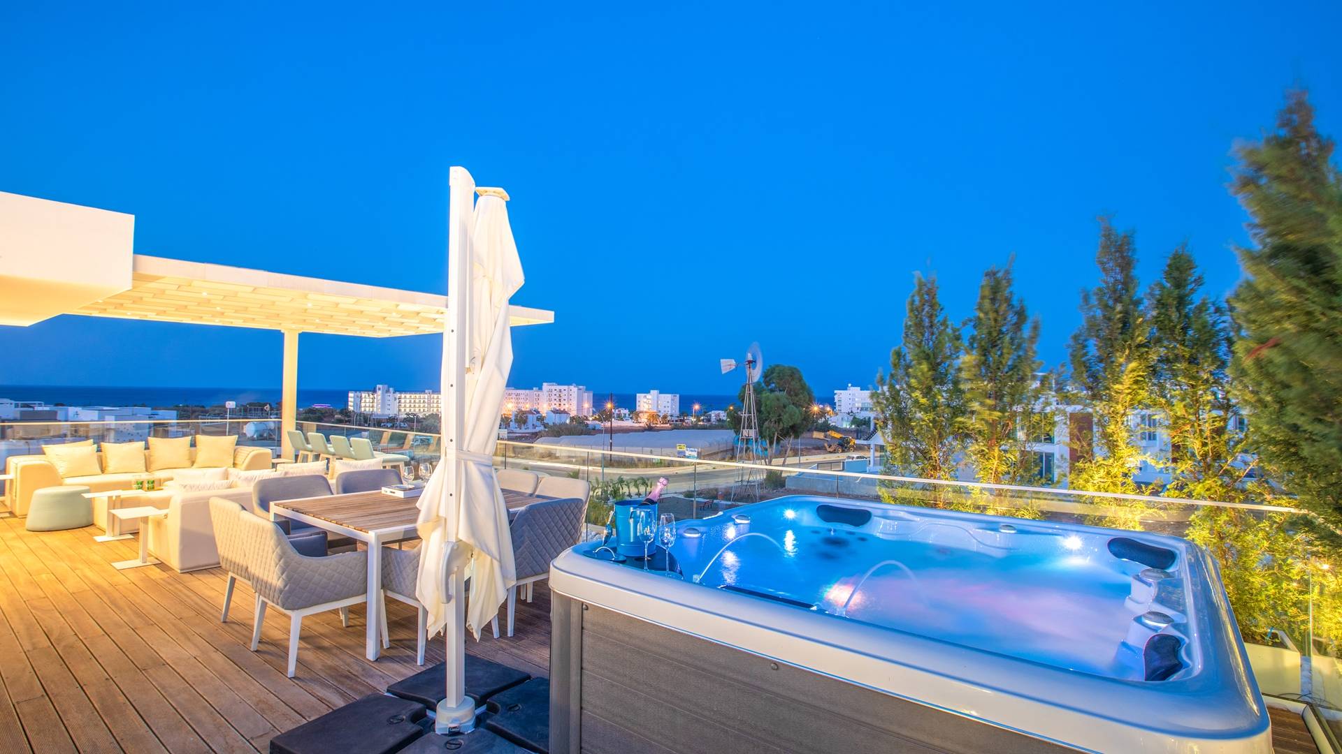 Upstairs, you will find the remaining 3 bedrooms, one double and two twins, all of which have en-suite bathrooms and a very large, shared balcony that is complete with a seating area as well as sun-loungers. One of the main features of this villa is the extravagant roof terrace overlooking the sea views. With its spacious and shaded seating area, dining area, and the bonus of a hot tub, it is ideal for spending your evenings just relaxing, unwinding, and enjoying a drink whilst appreciating the views on offer