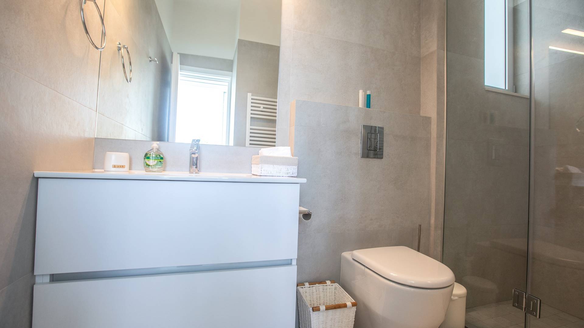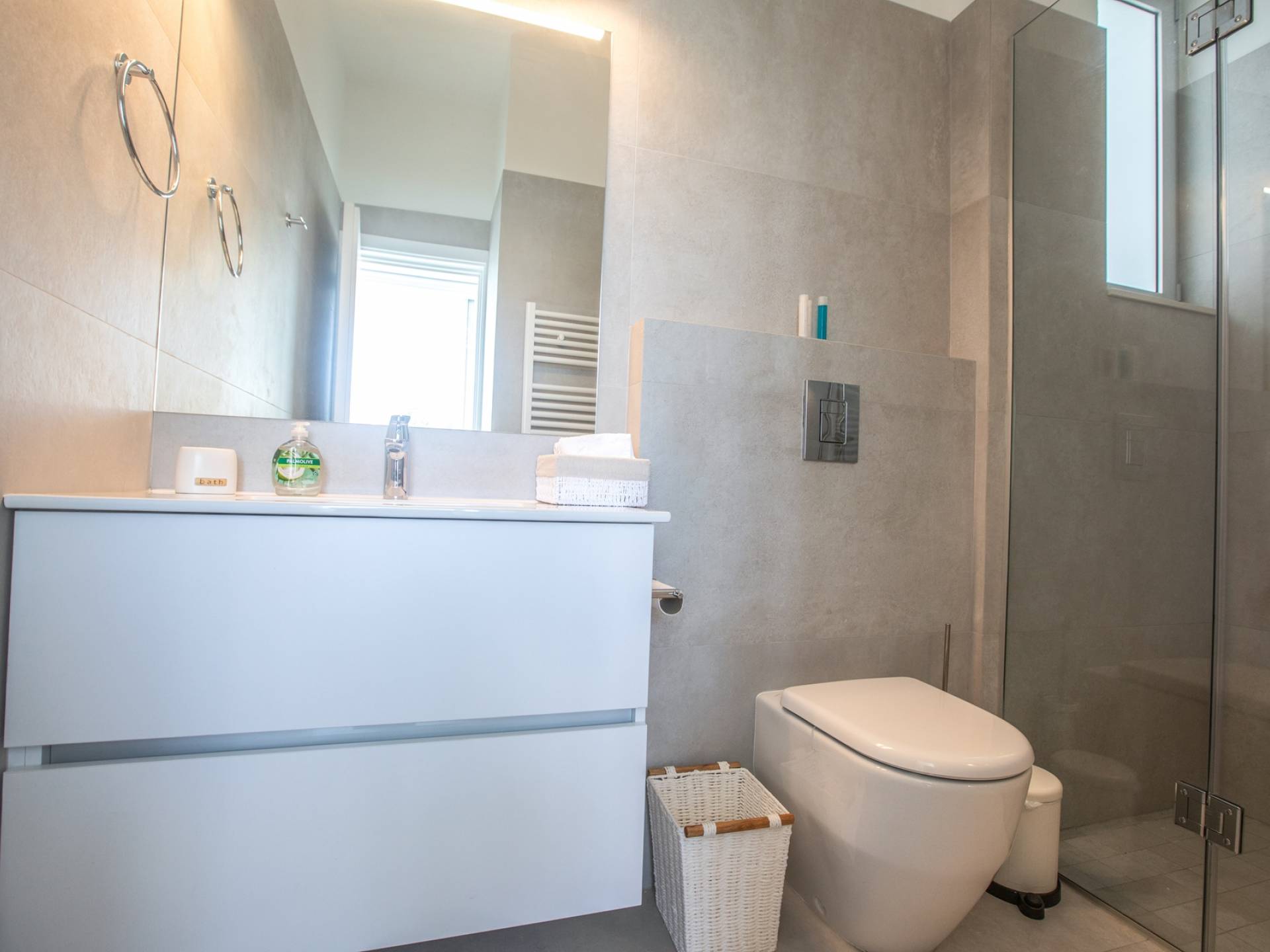 As you enter the villa, you will find the grand and highly stylish open-plan living room, kitchen, and dining area, surrounded by bi-fold patio doors leading to the garden and pool area The living room is complete with comfortable sofas, widescreen, and Satellite TV, the dining area has a table and chairs to seat 8 people and a modern kitchen that is complete with all appliances and utensils needed for a self-catering stay and includes a breakfast bar with extra seating for 4 people. One of the four bedrooms can be found on this floor with an en-suite bathroom, double bed, and full access to the garden and pool area. The added luxury of an elevator is also on this floor.