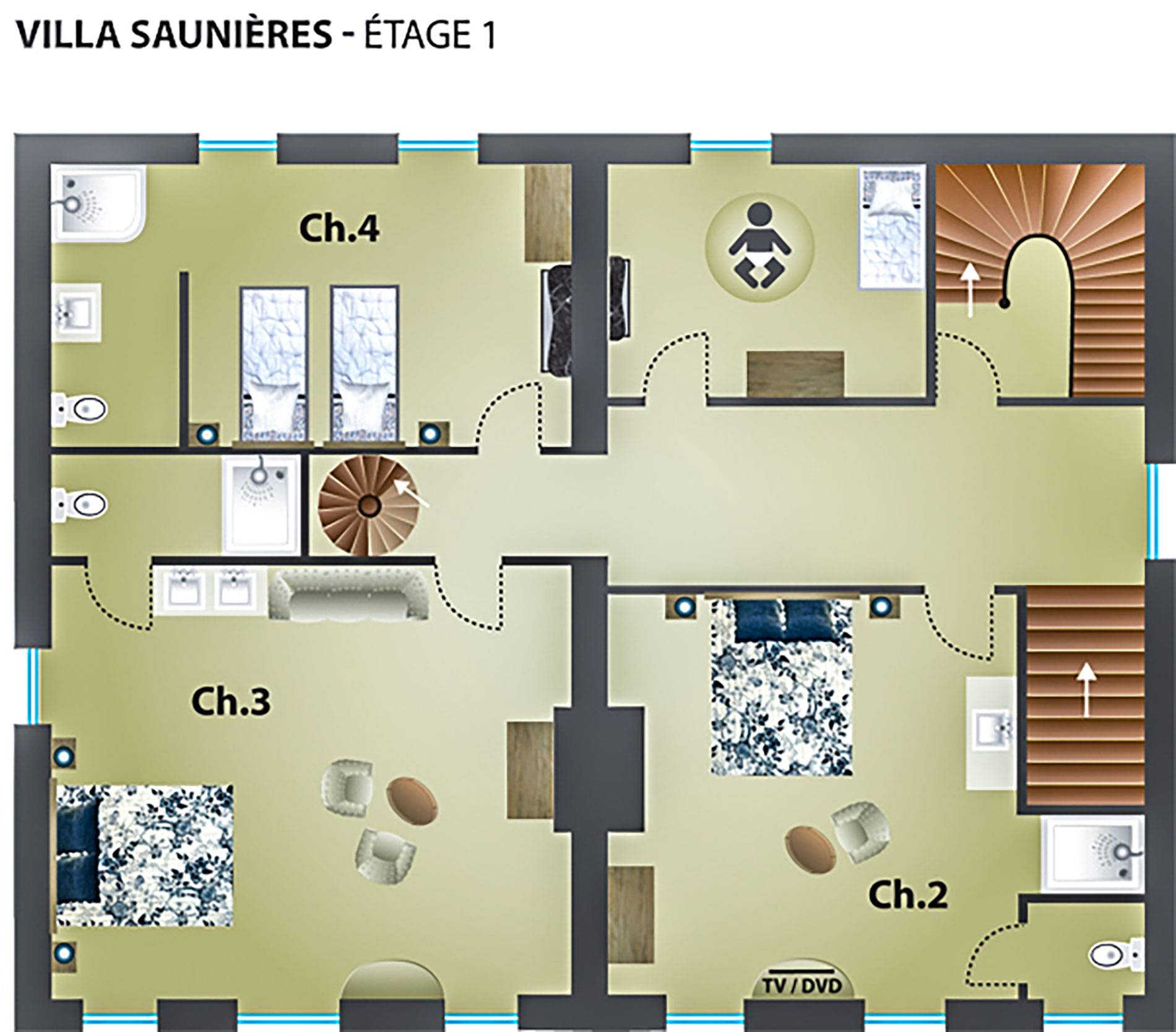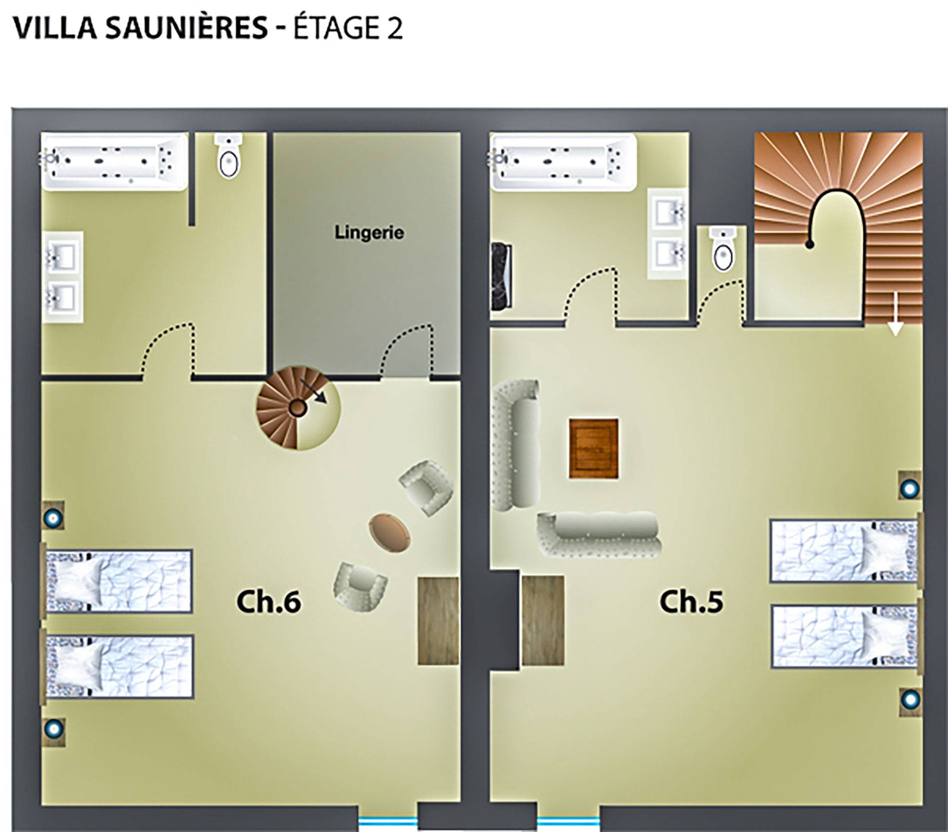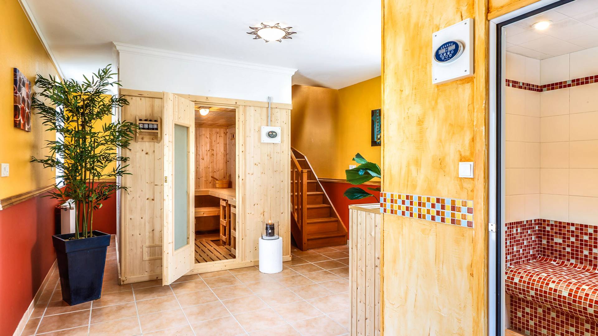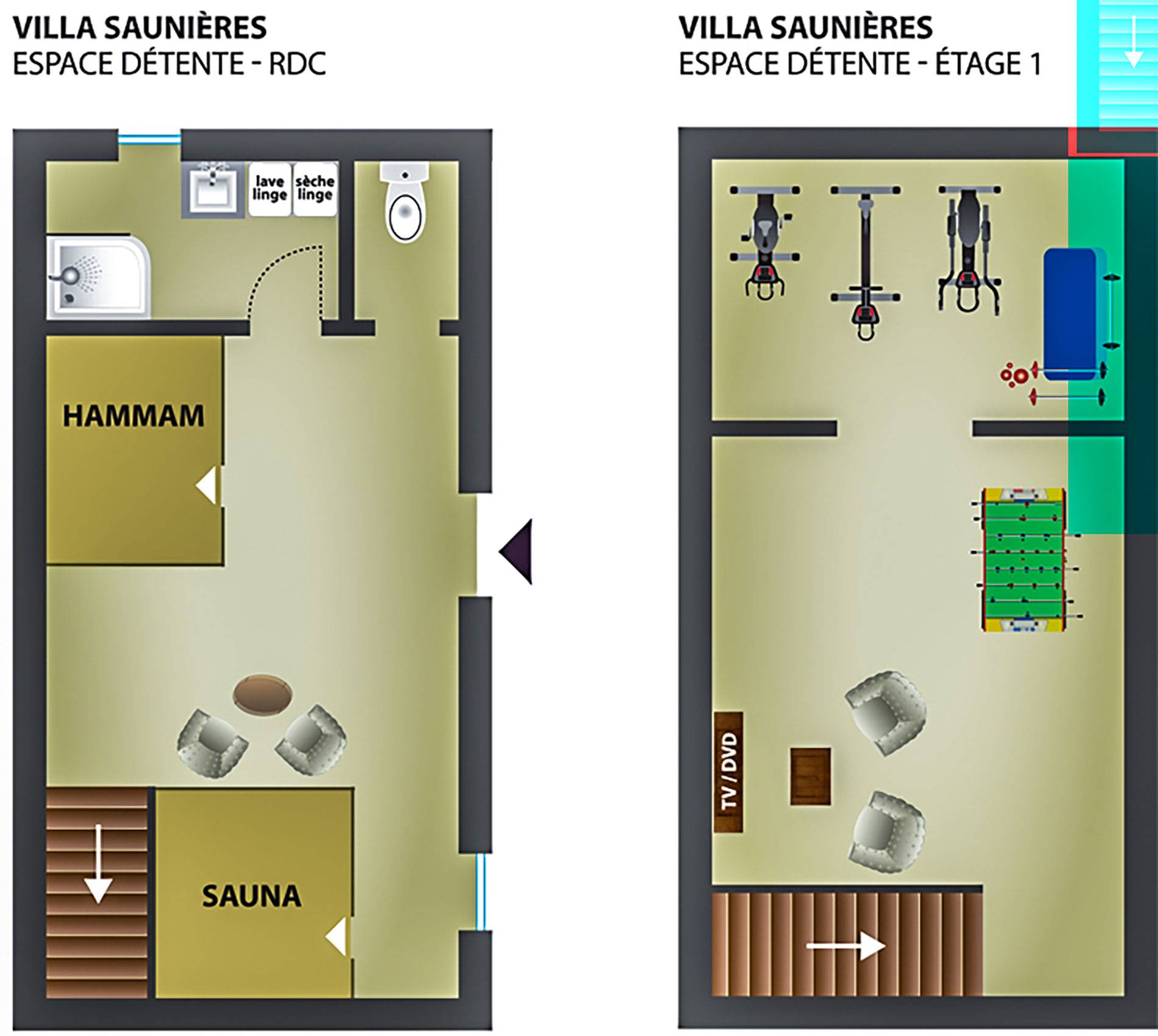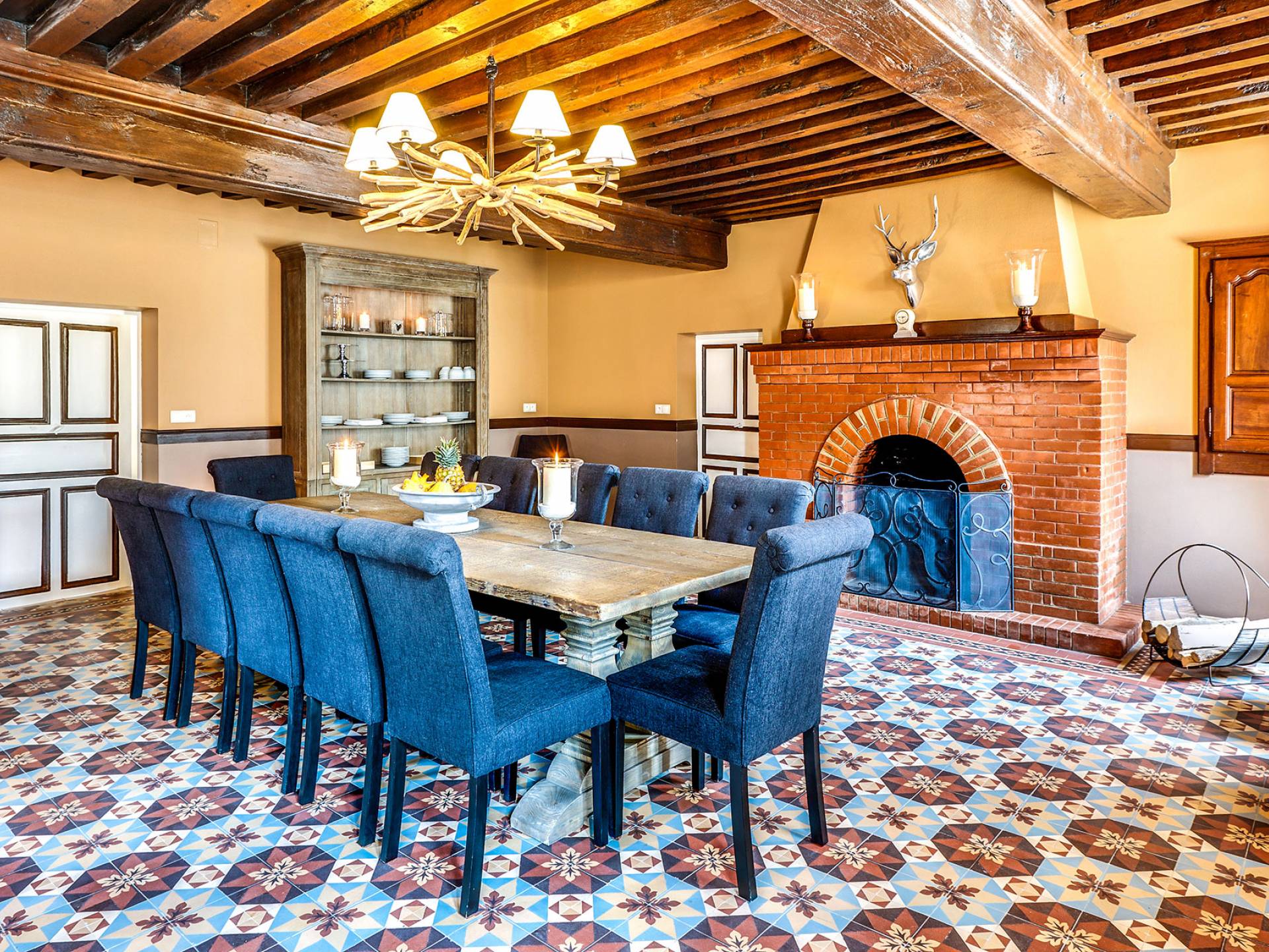 Villa Saunieres Burgundy offers 6 luxurious and spacious bedrooms with 6 "ensuite" bathrooms, fitness room, sauna, steam room, "cosy" living room with fireplace, dining room and kitchen. The kitchen opens directly on the terrace of the swimming pool which will enable lots of conviviality for your outside meals.