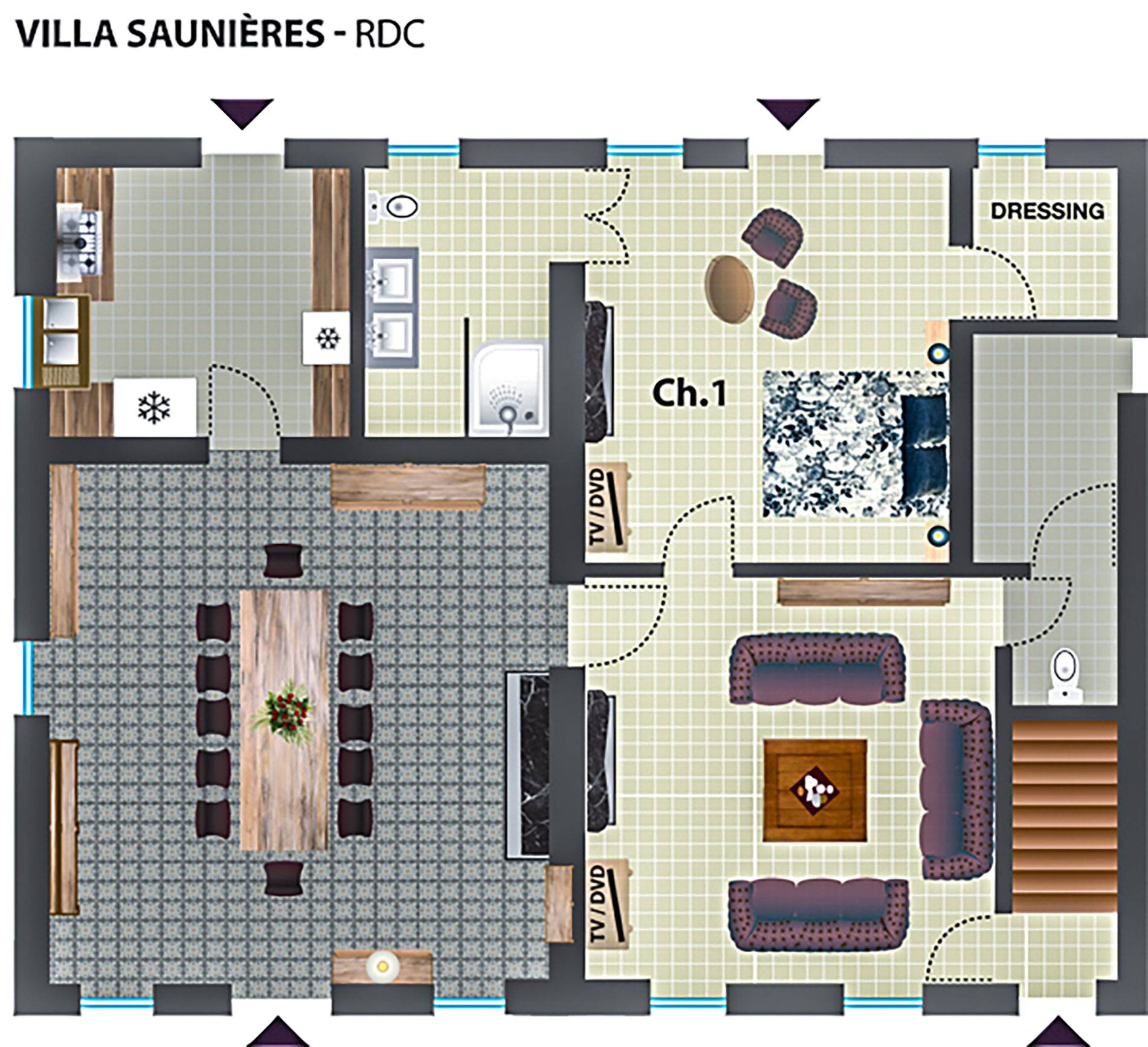 The living room, dining room and some bedrooms have kept their old tiles on the floor, their french style ceilings, their fireplaces dating back to the construction of the Villa. The decoration and furniture have been chosen with great care by Sylvia. you can expect again a great marriage between tradition and modernity.