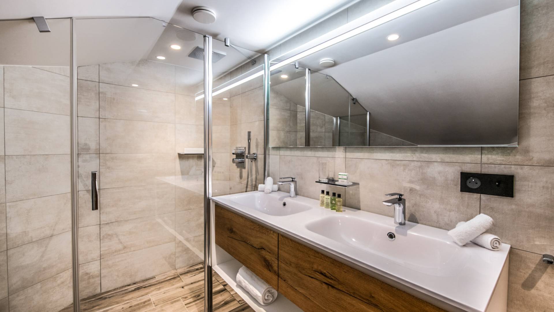 The Makalu Signature suite, located on the 6th floor of the Manali Lodge Courchevel 1650, with a surface area of 178 sqm, is perfect to welcome up to 8 people. This suite has four bedrooms with a double bed, one with a dressing, and four en-suite bathrooms. The large living room with a TV and a fireplace has also a fully equipped kitchen and two large balconies with a view over the mountains and the ski slopes. During your holidays, you can benefit from a parking space in the private car park, a ski locker, and Wi-Fi access.