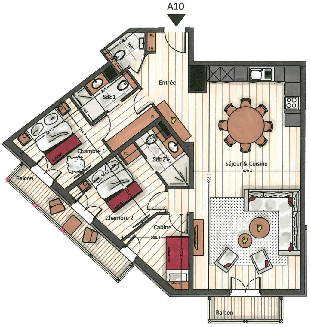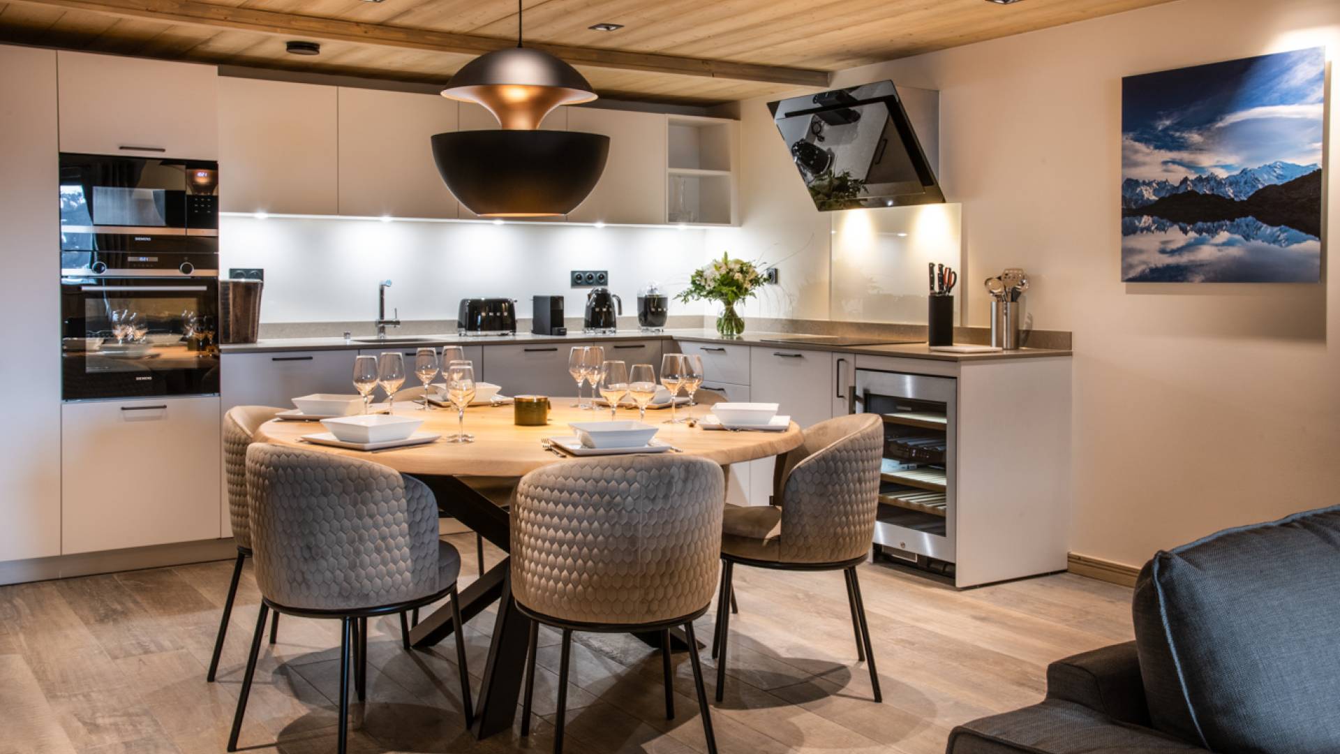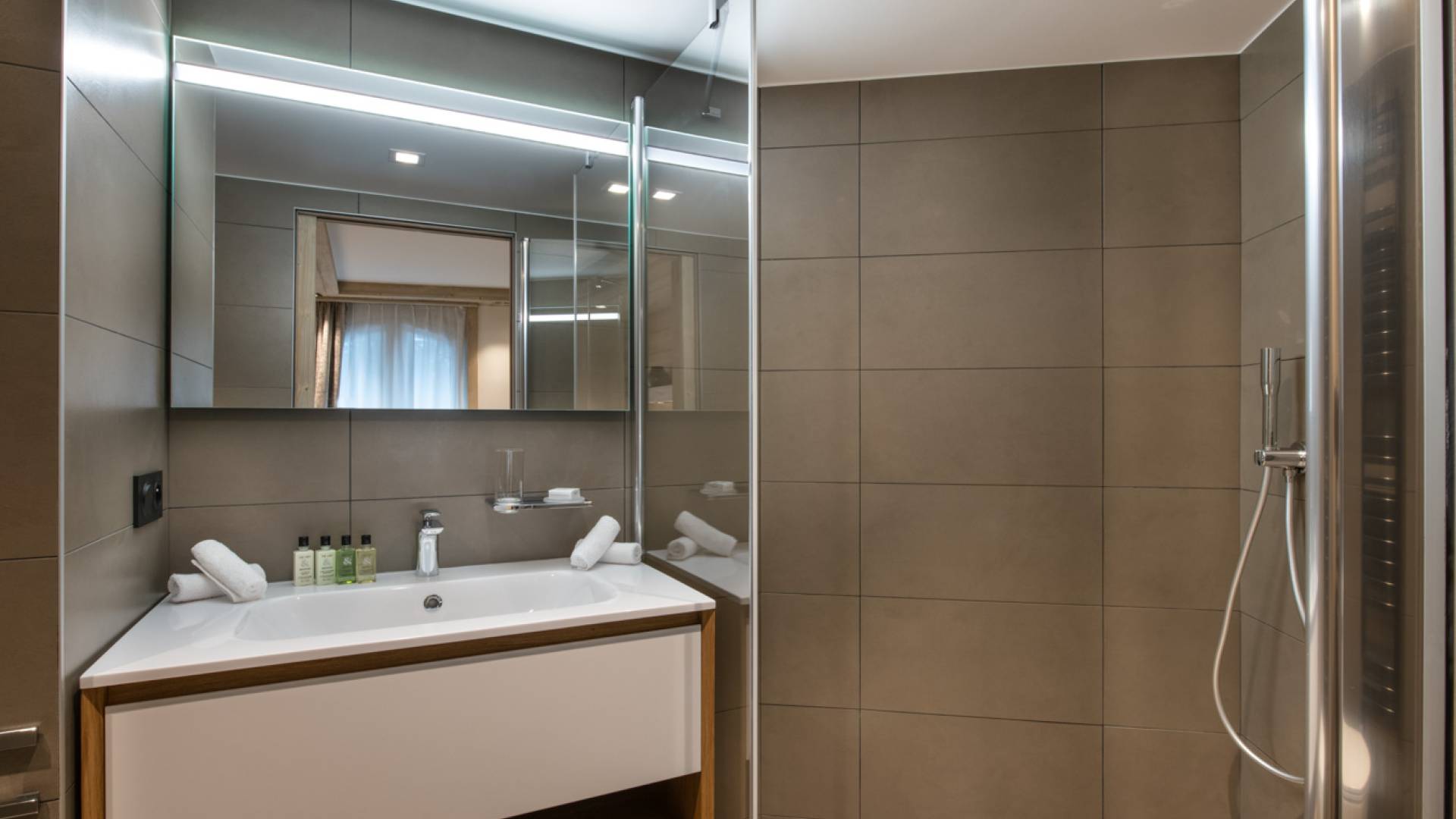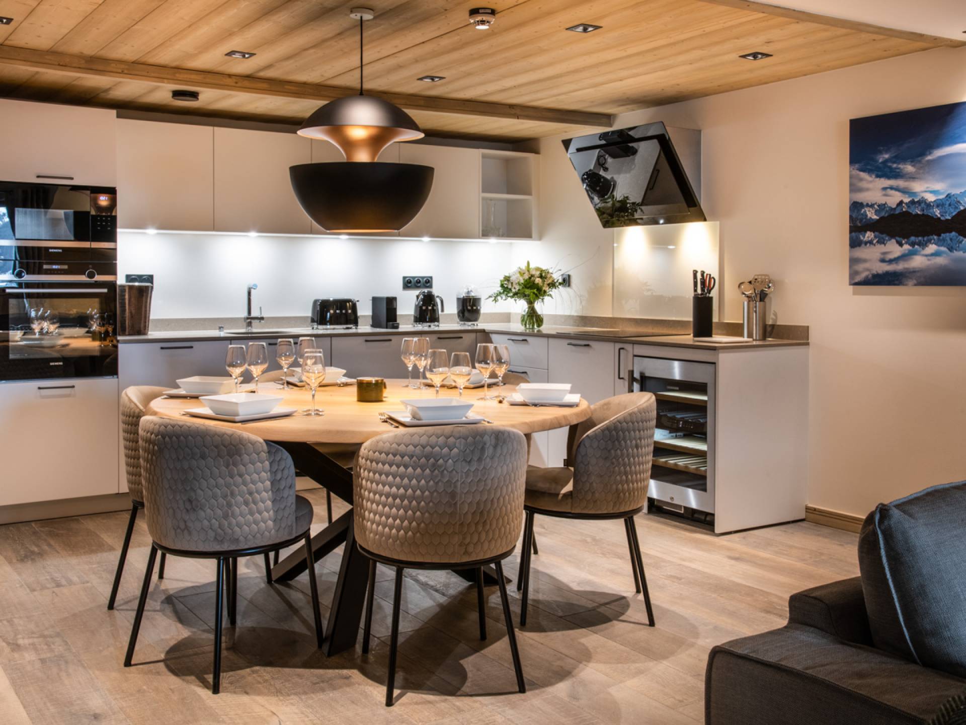 The Nagadi suite, located on the 4th floor of the Manali Lodge Courchevel 1650, with a surface area of 98 sqm, is perfect to welcome up to 6 people with a maximum of 4 adults. This suite has two bedrooms with a double bed, a bedroom cabin with a bunk bed and two bathrooms. The living room with a TV has also a fully equipped kitchen and a balcony with a view over the mountains. During your holidays, you can benefit from a parking space in the private car park, a ski locker and Wi-Fi access.