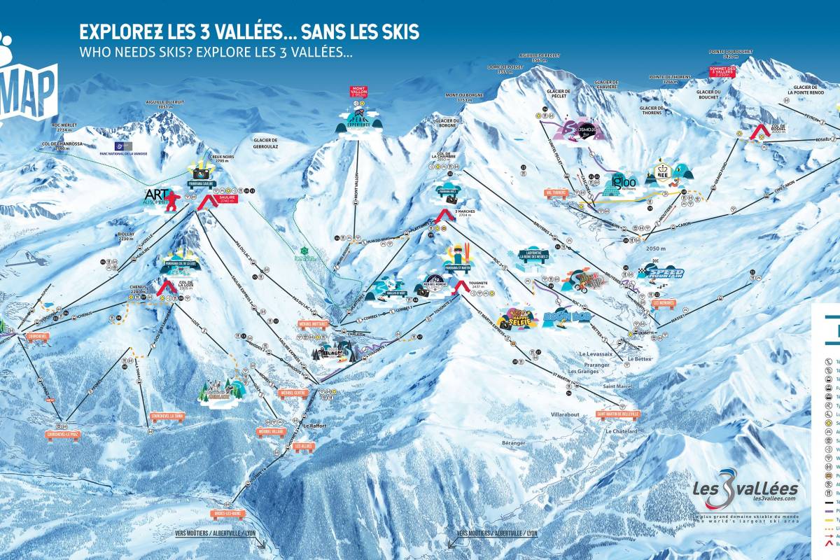 There are also 8 free drag lifts spread over the ski area, 3 of them at 1850, 2 at 1650, 1 at 1550, 1 at Le Prag and 1 at La Tania. Intermediates will find probably the world's best selection of blue and red trails. One of the best red runs is 'Park City'. Experts will love Jean Blanc and the runs from La Saulire which are some of the most challenging including 'The Ugly Sisters'.