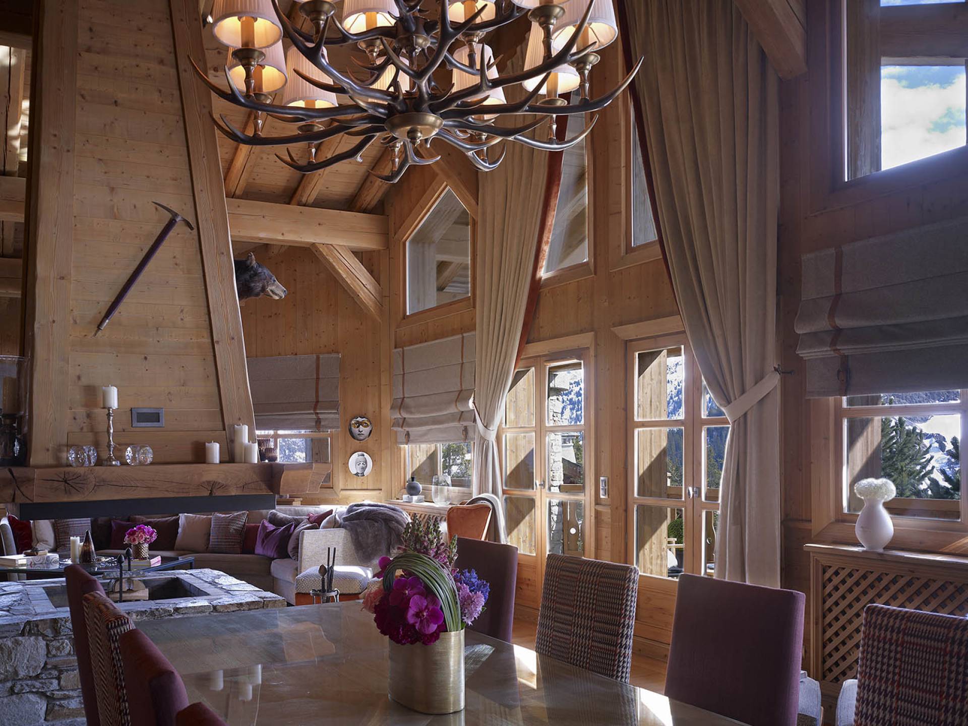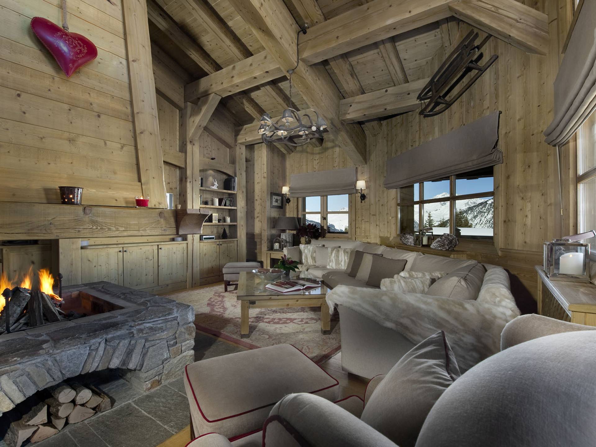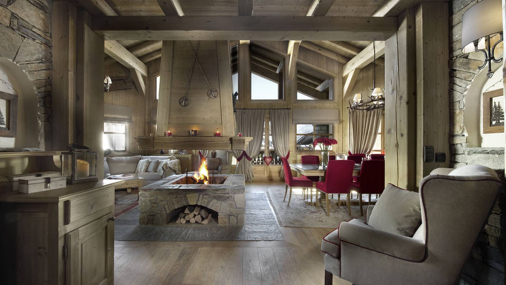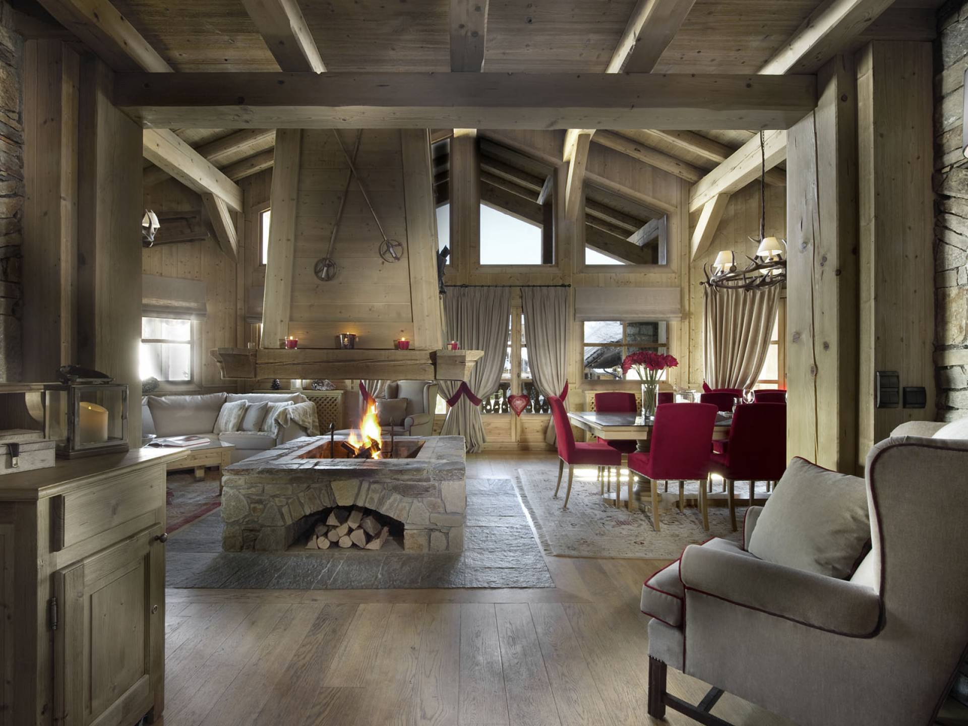 Chalet Les Sorbiers Courchevel 1850 also has an elevator to provide easy access to all floors. Exposed wooden beams and waxed oak floors throughout the chalet give it a modern yet authentic ambience. Open stonework on the fireplace and throughout the building adds to its rustic feel. The main living space boasts a spectacular double-height ceiling that makes the most of the dramatic vista.