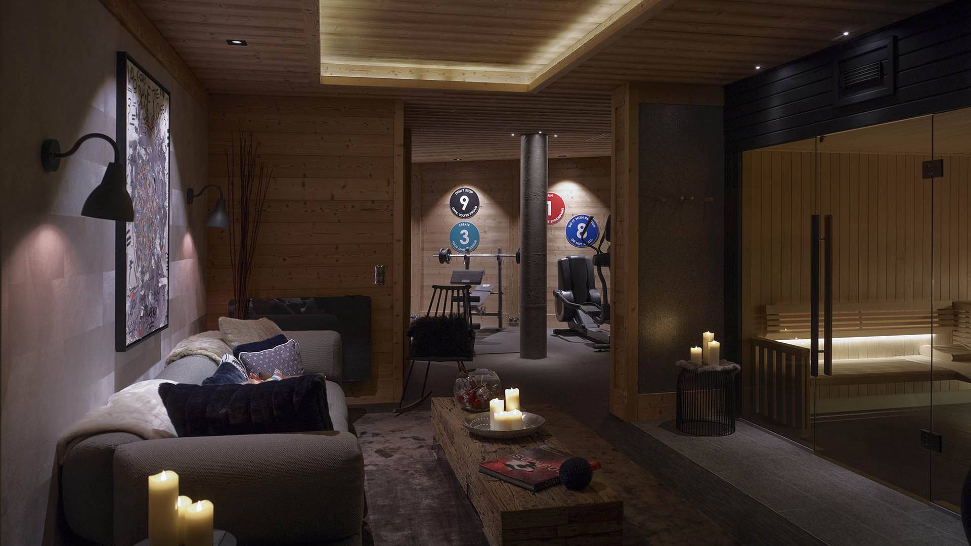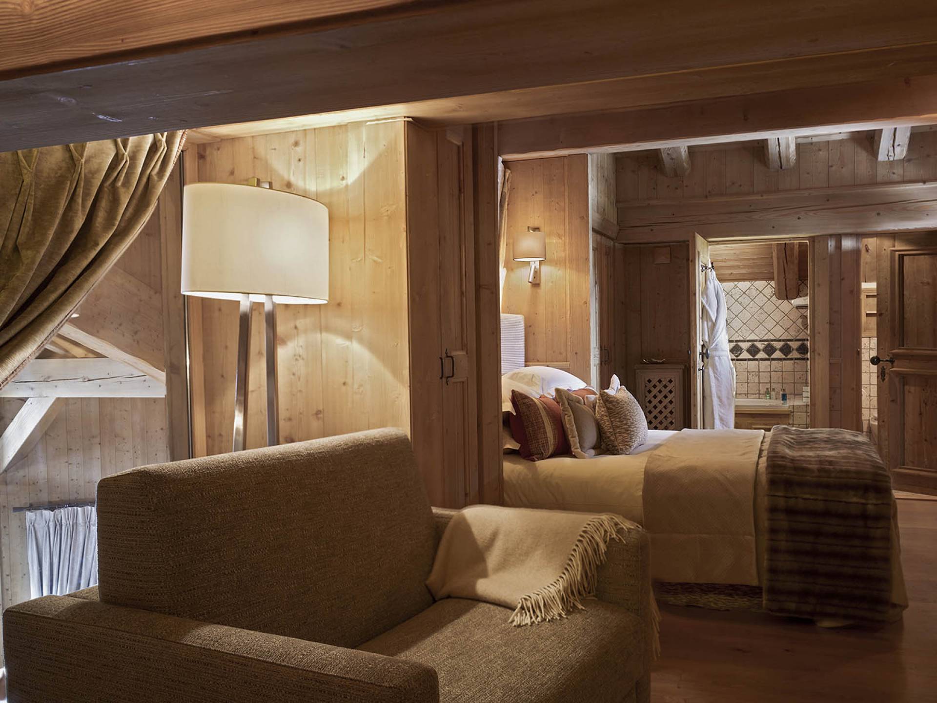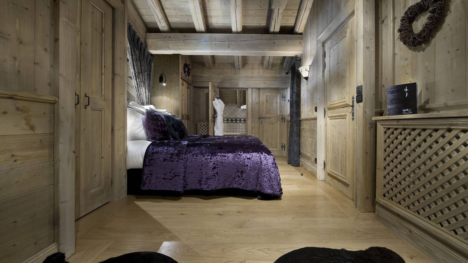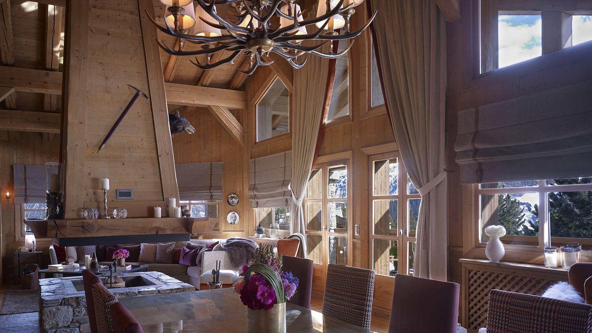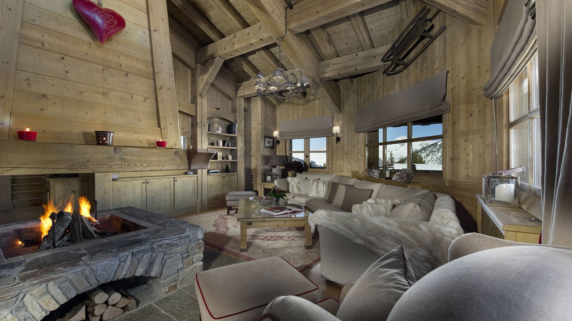 Chalet Les Sorbiers Courchevel 1850 also has an elevator to provide easy access to all floors. Exposed wooden beams and waxed oak floors throughout the chalet give it a modern yet authentic ambience. Open stonework on the fireplace and throughout the building adds to its rustic feel. The main living space boasts a spectacular double-height ceiling that makes the most of the dramatic vista.