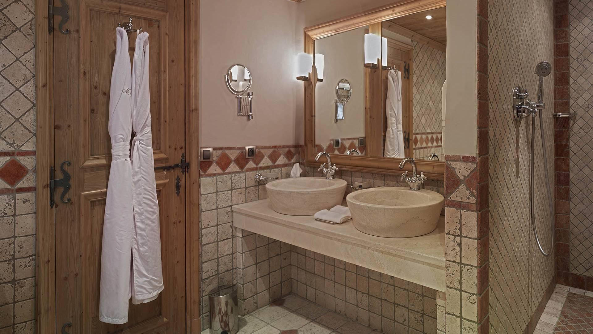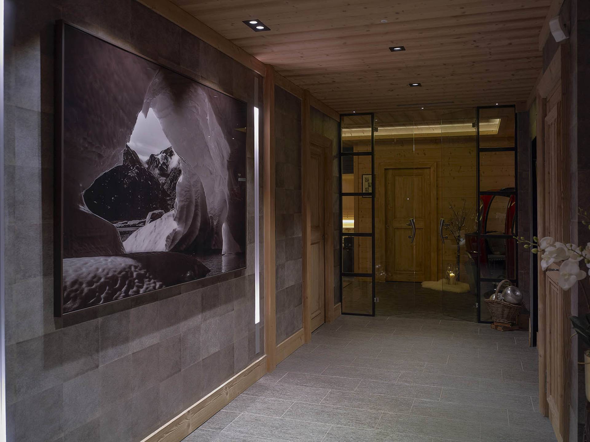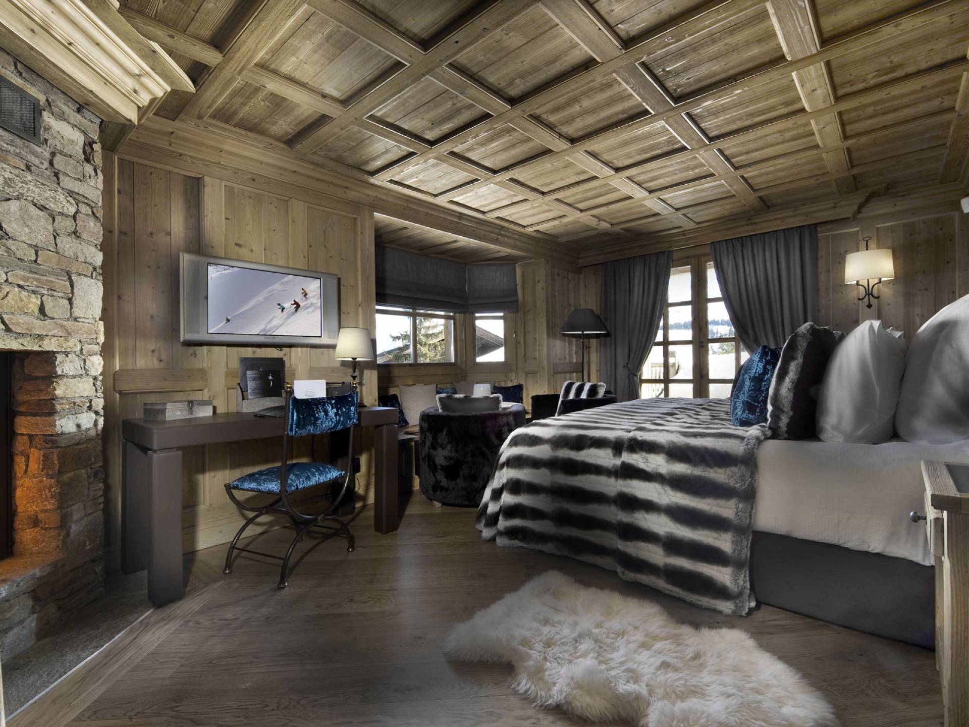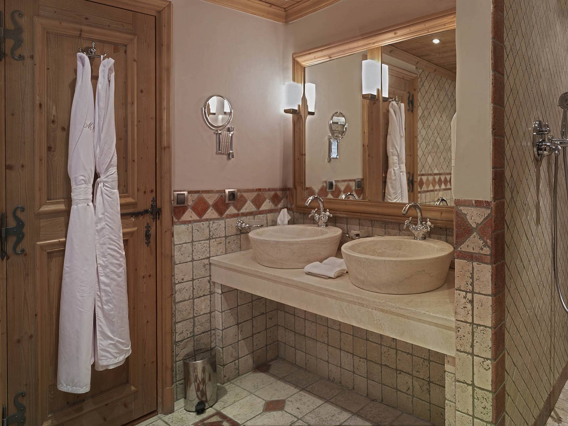 Chalet Les Sorbiers Courchevel 1850 also has an elevator to provide easy access to all floors. Exposed wooden beams and waxed oak floors throughout the chalet give it a modern yet authentic ambience. Open stonework on the fireplace and throughout the building adds to its rustic feel. The main living space boasts a spectacular double-height ceiling that makes the most of the dramatic vista.