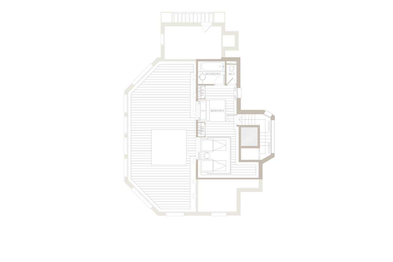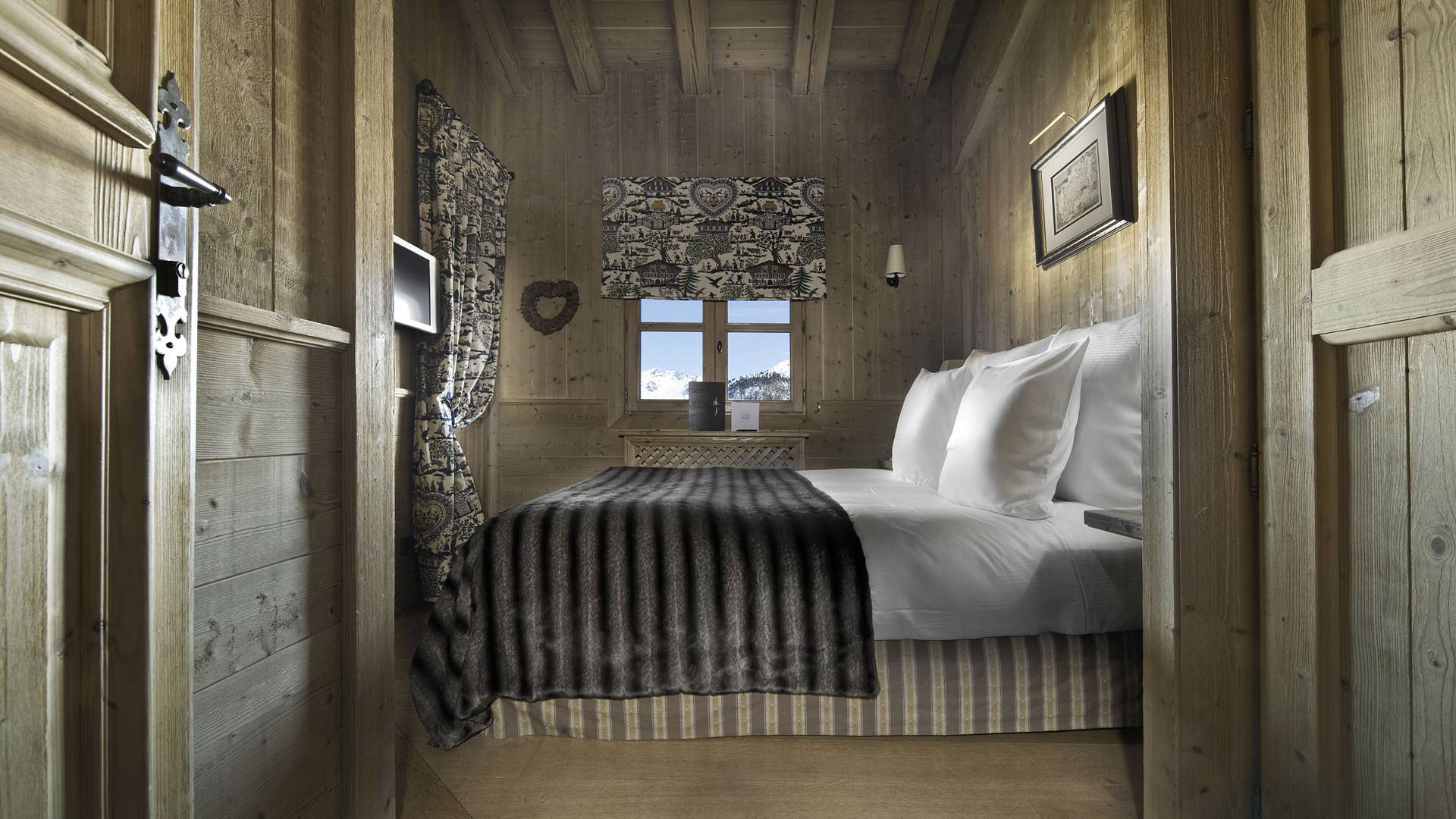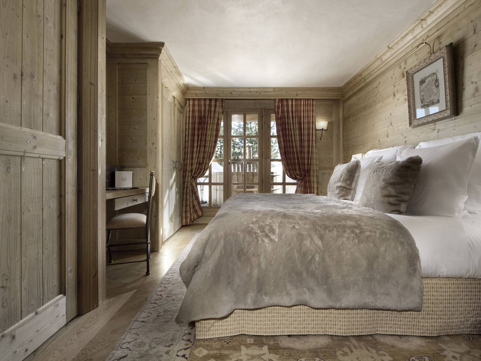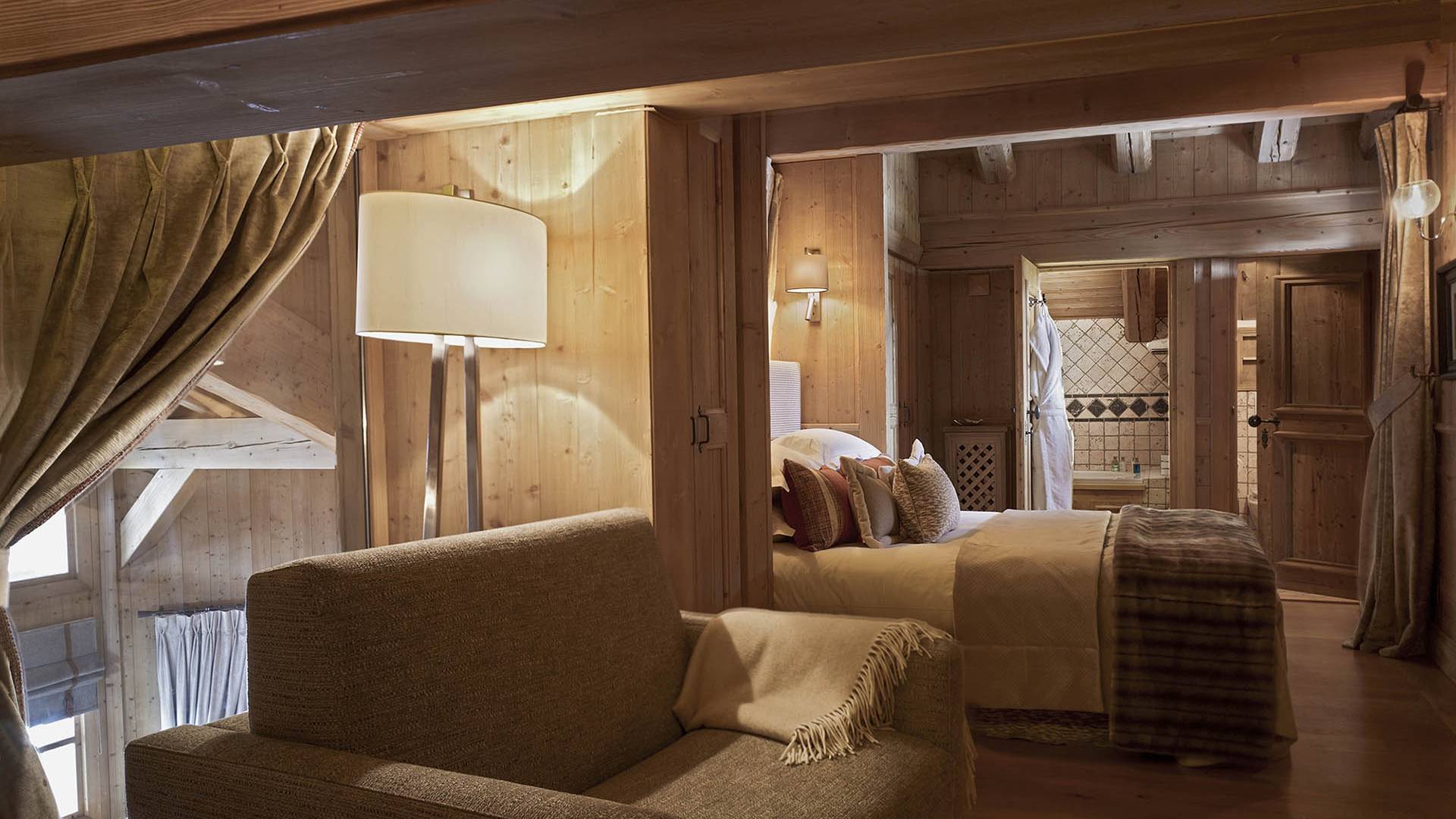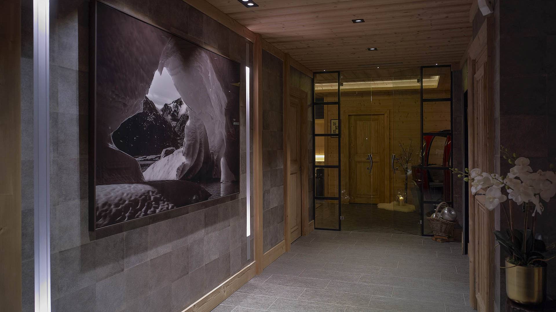 Chalet Les Sorbiers Courchevel 1850 also has an elevator to provide easy access to all floors. Exposed wooden beams and waxed oak floors throughout the chalet give it a modern yet authentic ambience. Open stonework on the fireplace and throughout the building adds to its rustic feel. The main living space boasts a spectacular double-height ceiling that makes the most of the dramatic vista.