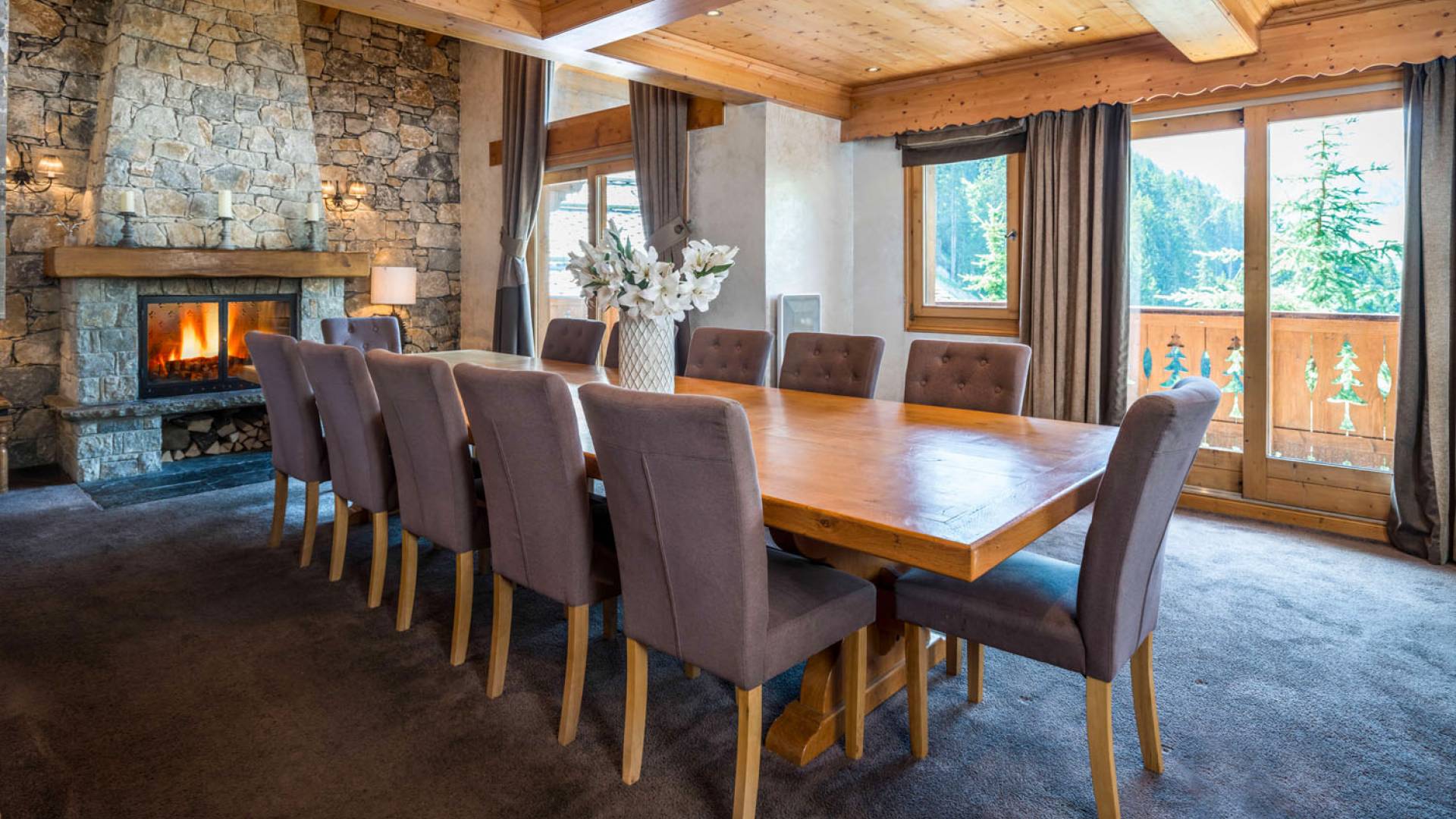 Built in the traditional Savoyarde style and to the highest specifications, Chalet Genepi Meribel offers accommodation over four floors. The center-piece being the expansive south-facing living room featuring luxuriously comfortable deep cushion sofas, a stone-clad fireplace, HD satellite, digital and Apple television, DVD player, iPod, and surround sound music systems. The equally impressive south-facing dining room features a magnificent oak dining table complimented by a floor-to-ceiling stone-clad fireplace.