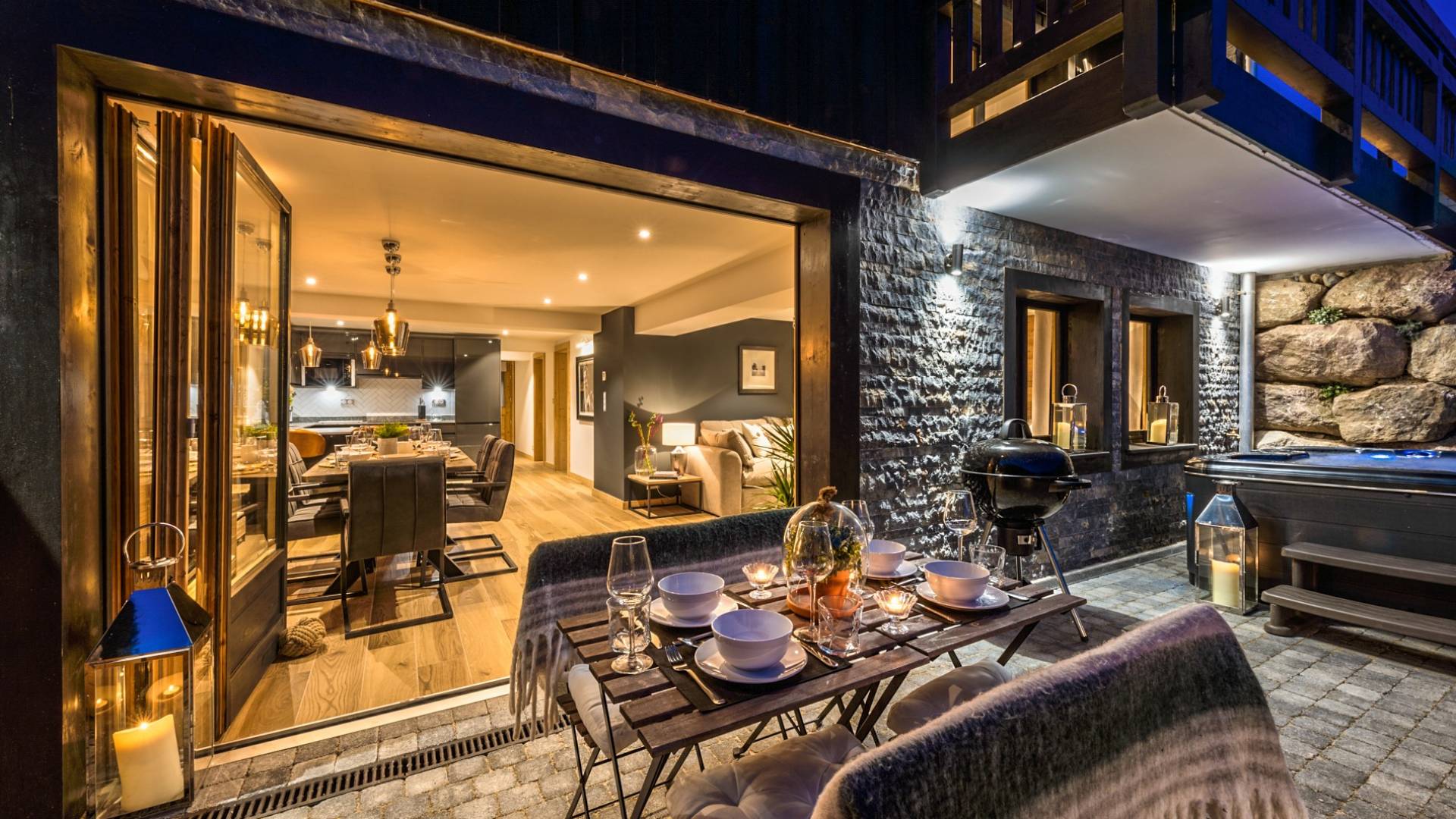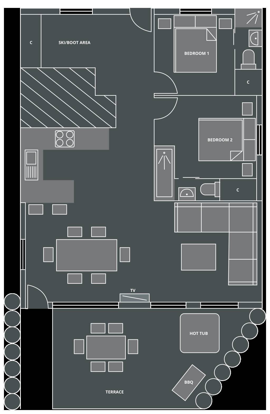 This brand new, two-bedroom apartment takes advantage of its position with bi-folding doors opening onto a sunny terrace with a hot tub and gas barbecue. A bus stop located at the end of the road offers several routes into the town center and the slopes or you can add on our driver service making it an excellent self-catered option.
