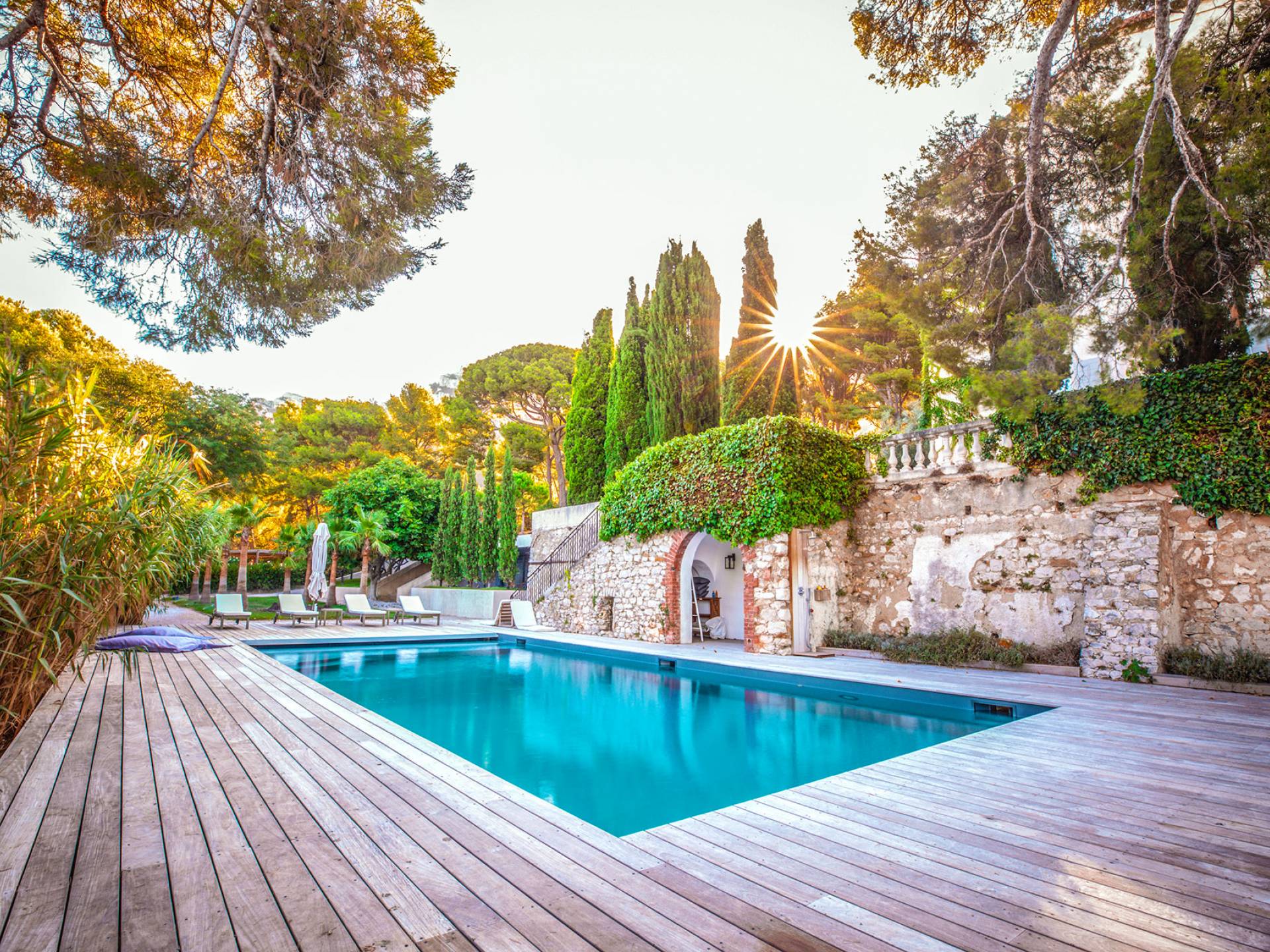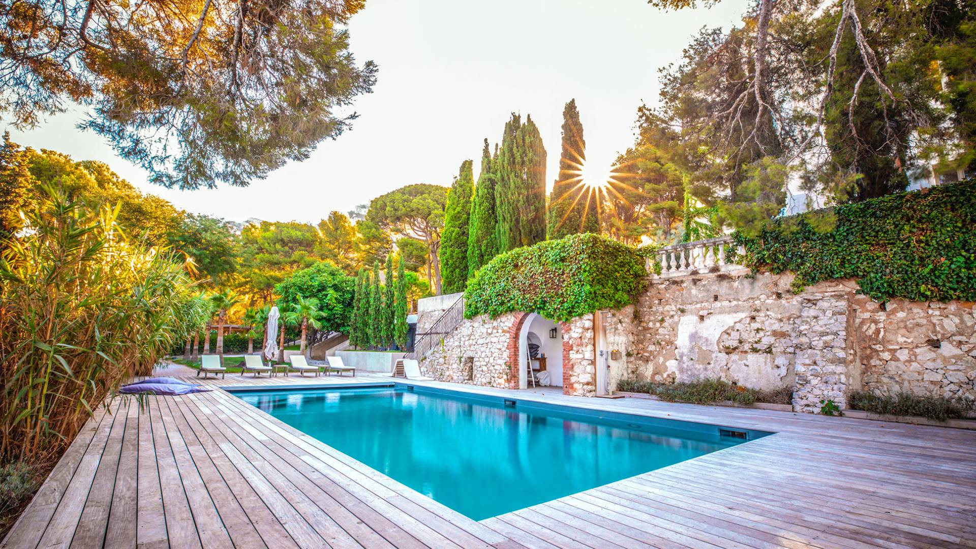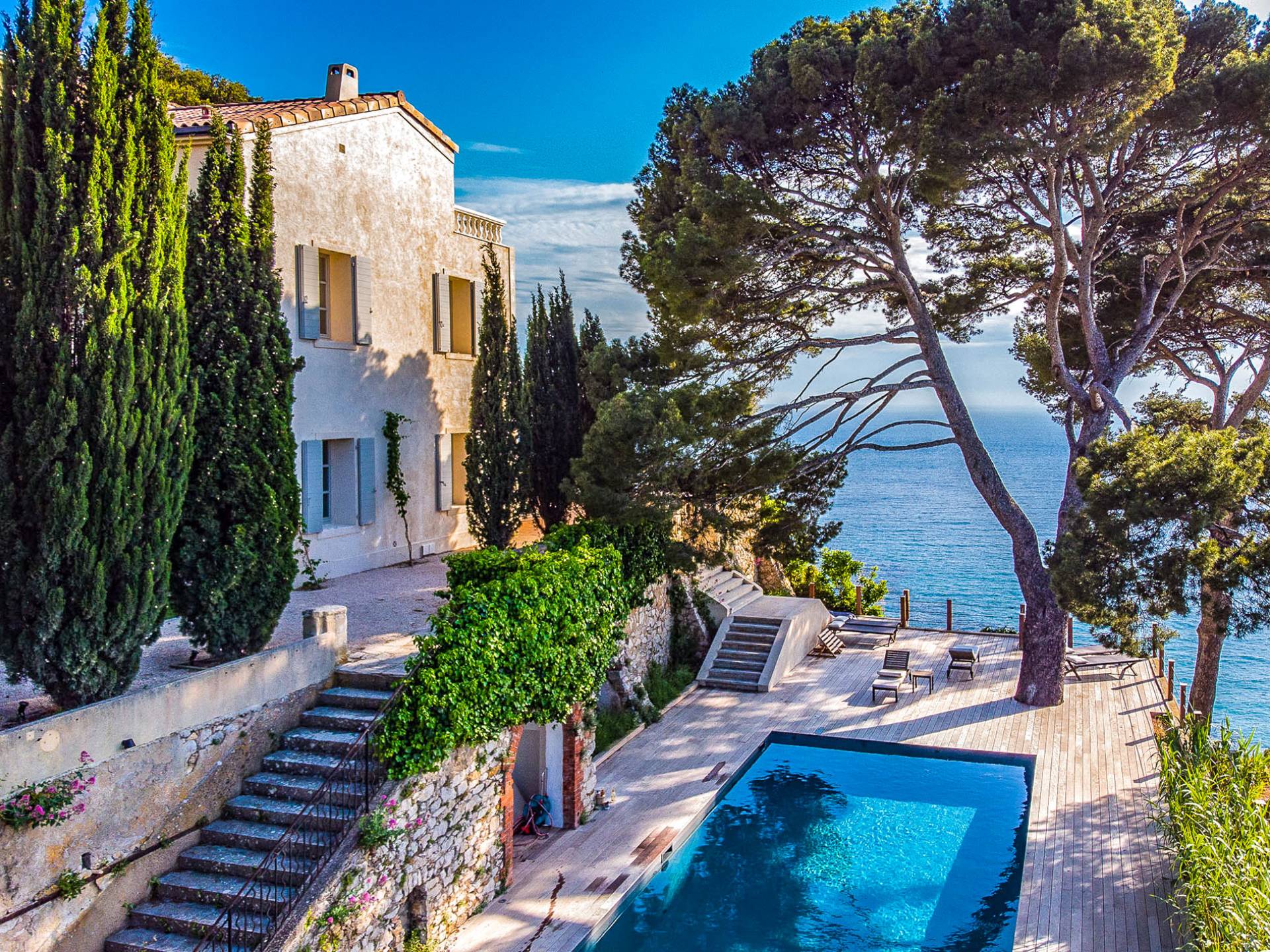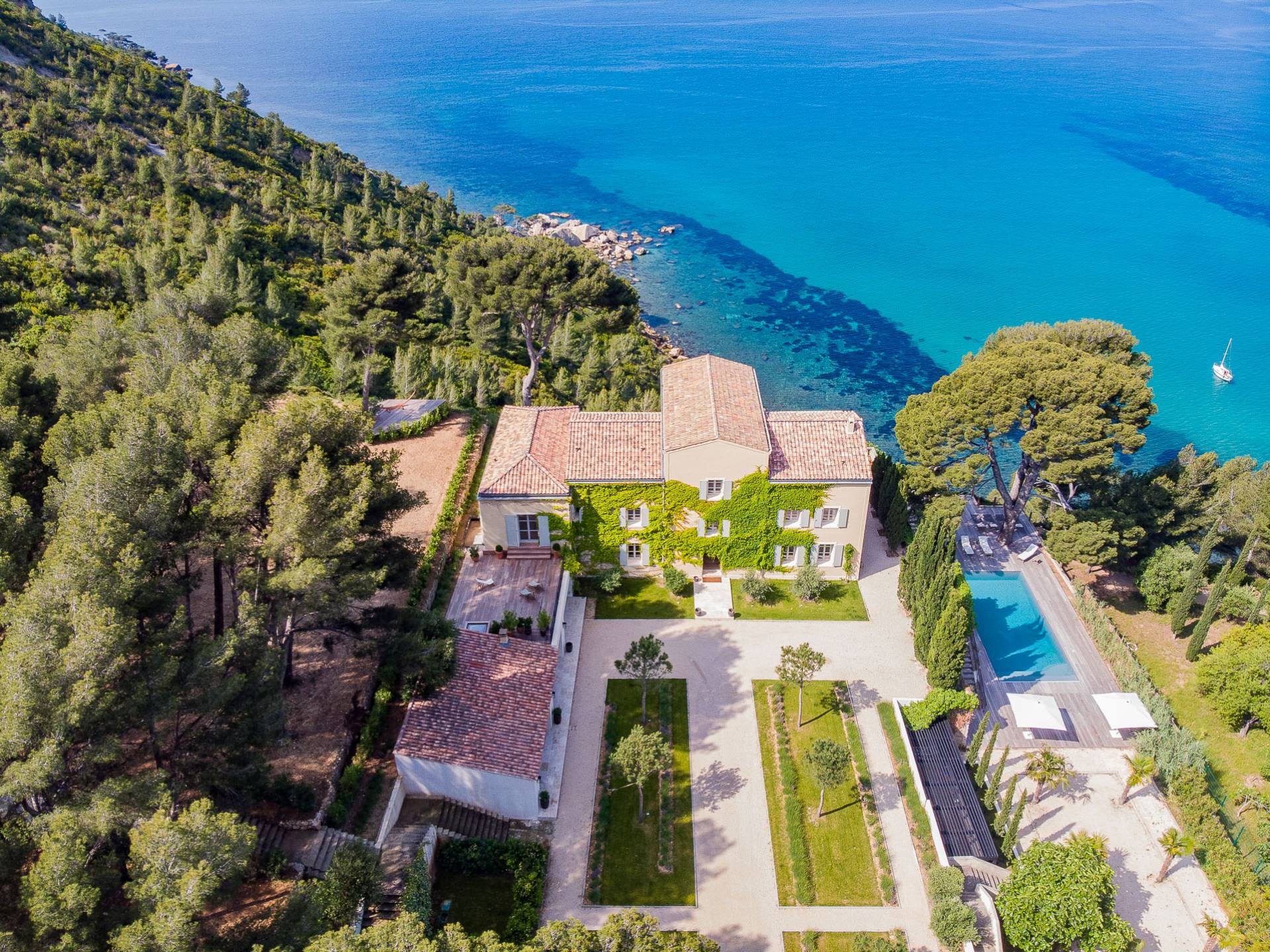 Formerly the Revestel Hotel, which welcomed Virginia Woolf in the ’20s, this 6500 sq. ft (600 m2) mansion was entirely renovated in 2017 to combine modernity, simplicity, and comfort. Its four reception rooms on the sea and the eleven bedrooms allow it to comfortably accommodate twenty-four guests. The huge terrace of 5000 sqft (500 m2) overlooks a beautiful beach with turquoise waters, accessible on foot by a private path in 5 minutes. The property has a large heated 42-foot (13m) swimming pool, an orangery, and a petanque. Cassis village and harbor are less than 15 minutes away by foot. The Domaine de Canaille is a fully-serviced mansion available with its staff for holiday rentals, private and corporate events, seminars as well as wellness retreats. I can organize all activities and bookings