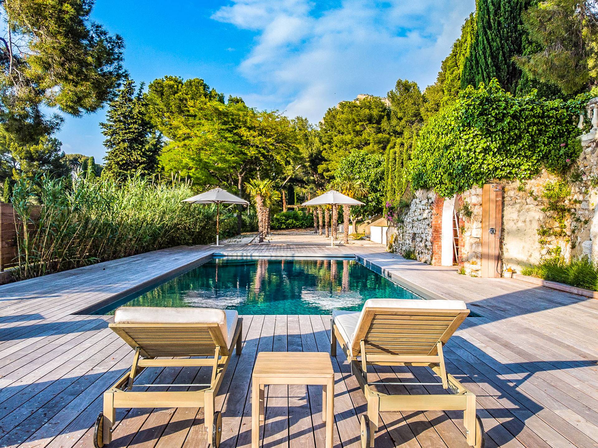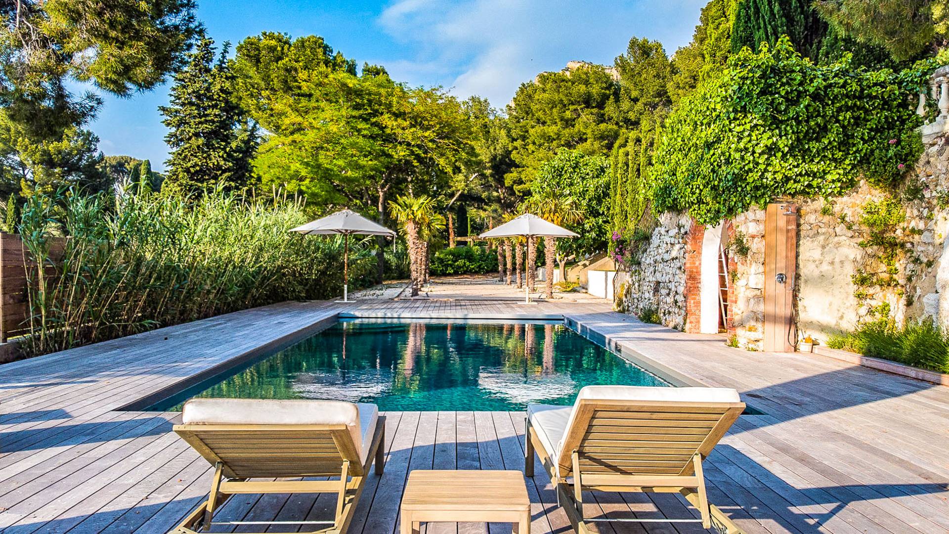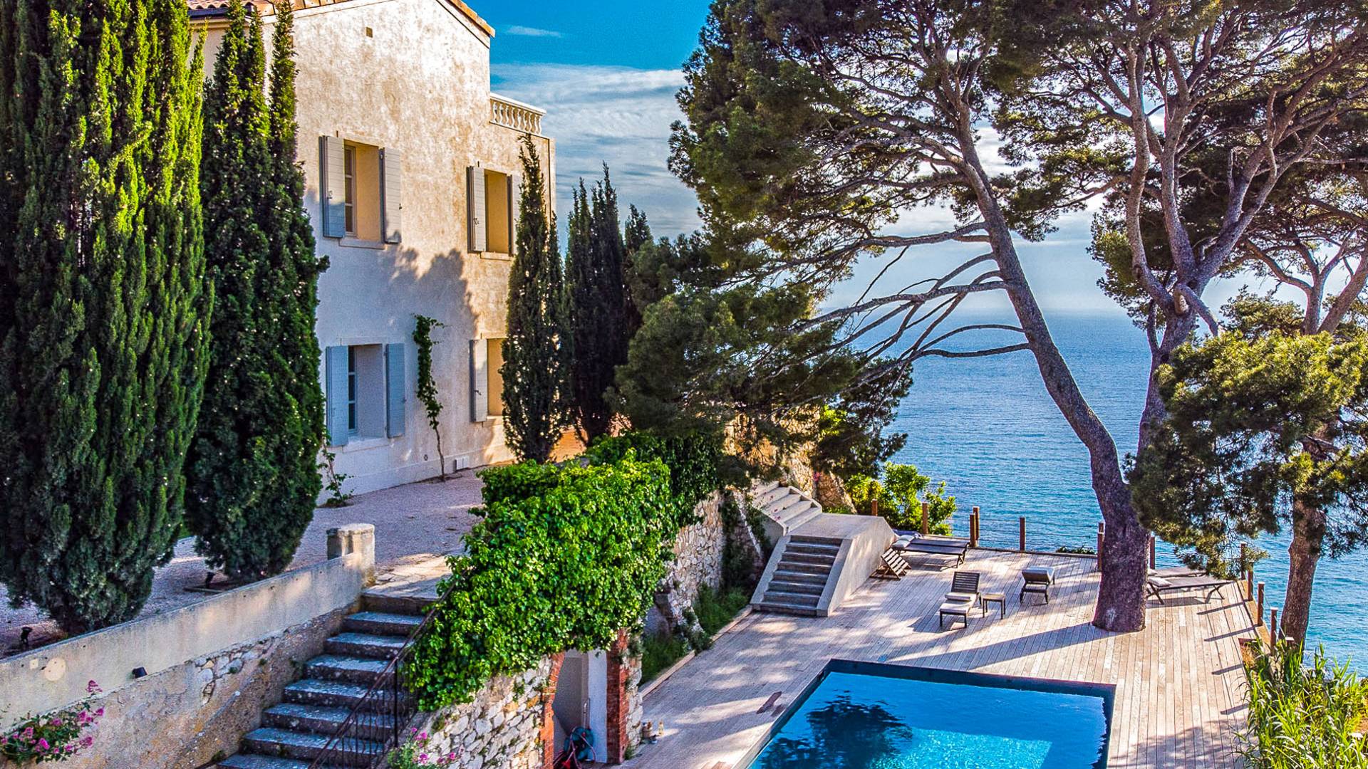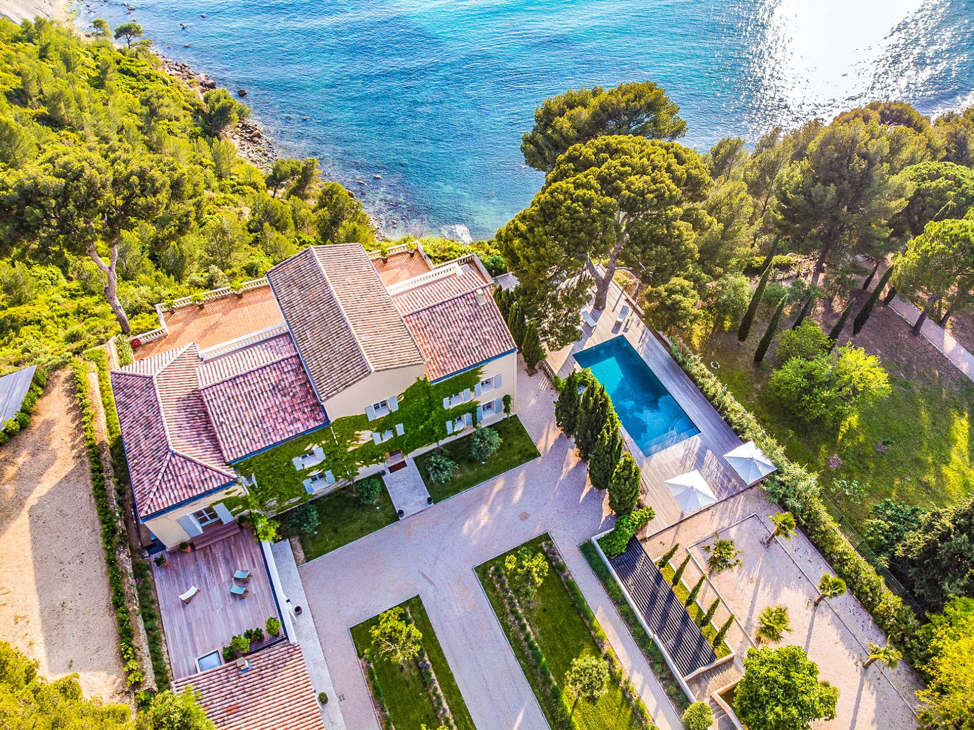 Formerly the Revestel Hotel, which welcomed Virginia Woolf in the ’20s, this 6500 sq. ft (600 m2) mansion was entirely renovated in 2017 to combine modernity, simplicity, and comfort. Its four reception rooms on the sea and the eleven bedrooms allow it to comfortably accommodate twenty-four guests. The huge terrace of 5000 sqft (500 m2) overlooks a beautiful beach with turquoise waters, accessible on foot by a private path in 5 minutes. The property has a large heated 42-foot (13m) swimming pool, an orangery, and a petanque. Cassis village and harbor are less than 15 minutes away by foot. The Domaine de Canaille is a fully-serviced mansion available with its staff for holiday rentals, private and corporate events, seminars as well as wellness retreats. I can organize all activities and bookings