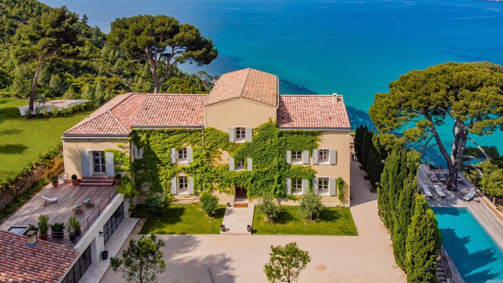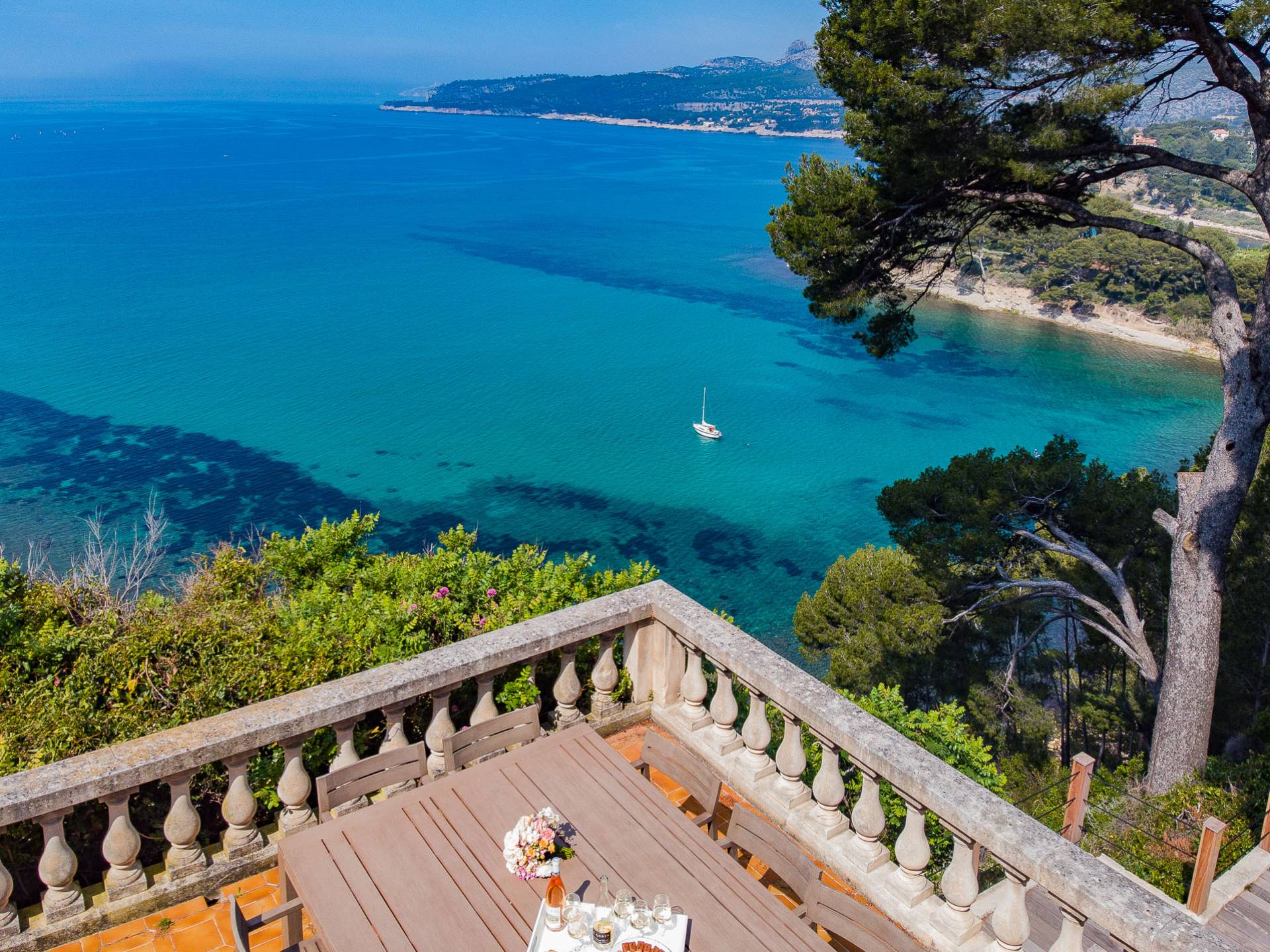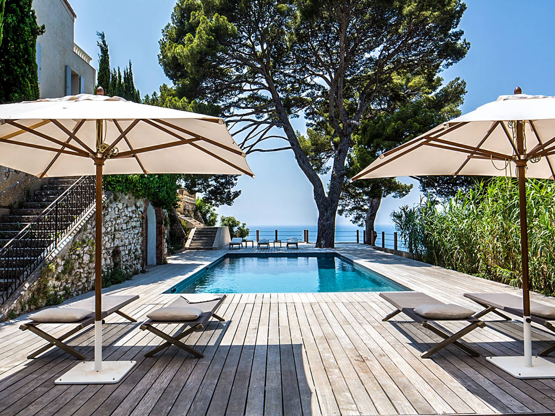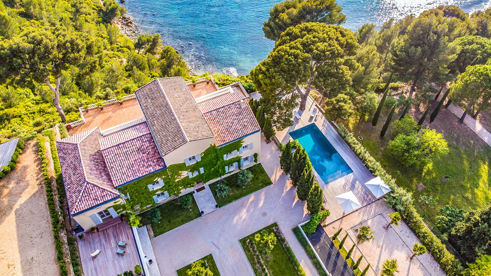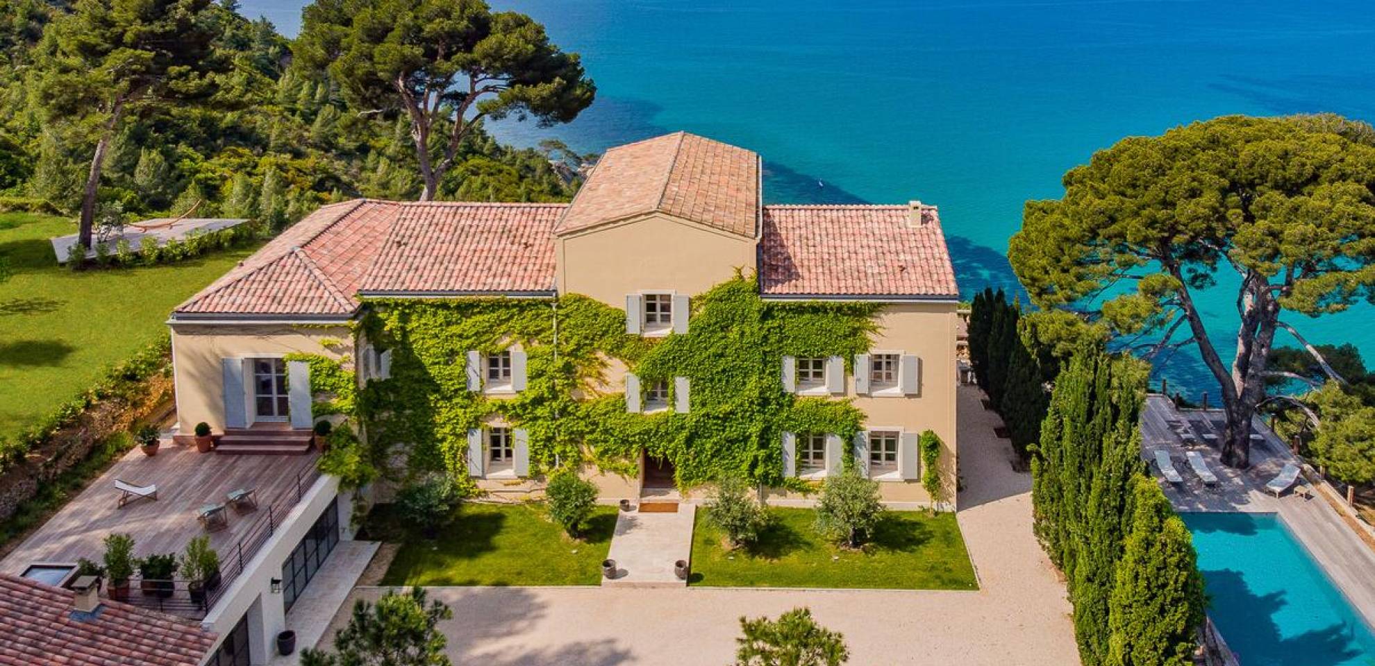 Formerly the Revestel Hotel, which welcomed Virginia Woolf in the ’20s, this 6500 sq. ft (600 m2) mansion was entirely renovated in 2017 to combine modernity, simplicity, and comfort. Its four reception rooms on the sea and the eleven bedrooms allow it to comfortably accommodate twenty-four guests. The huge terrace of 5000 sqft (500 m2) overlooks a beautiful beach with turquoise waters, accessible on foot by a private path in 5 minutes. The property has a large heated 42-foot (13m) swimming pool, an orangery, and a petanque. Cassis village and harbor are less than 15 minutes away by foot. The Domaine de Canaille is a fully-serviced mansion available with its staff for holiday rentals, private and corporate events, seminars as well as wellness retreats. I can organize all activities and bookings