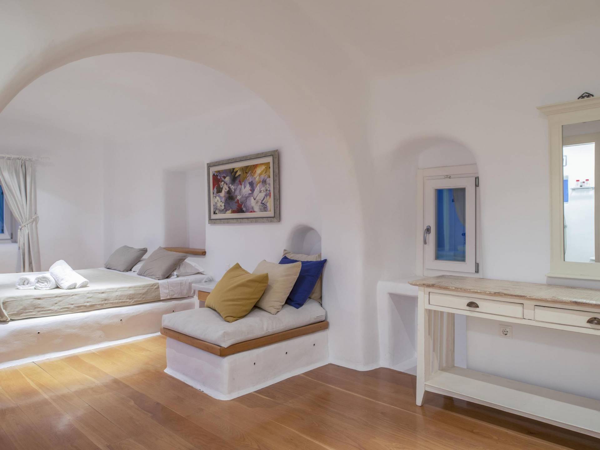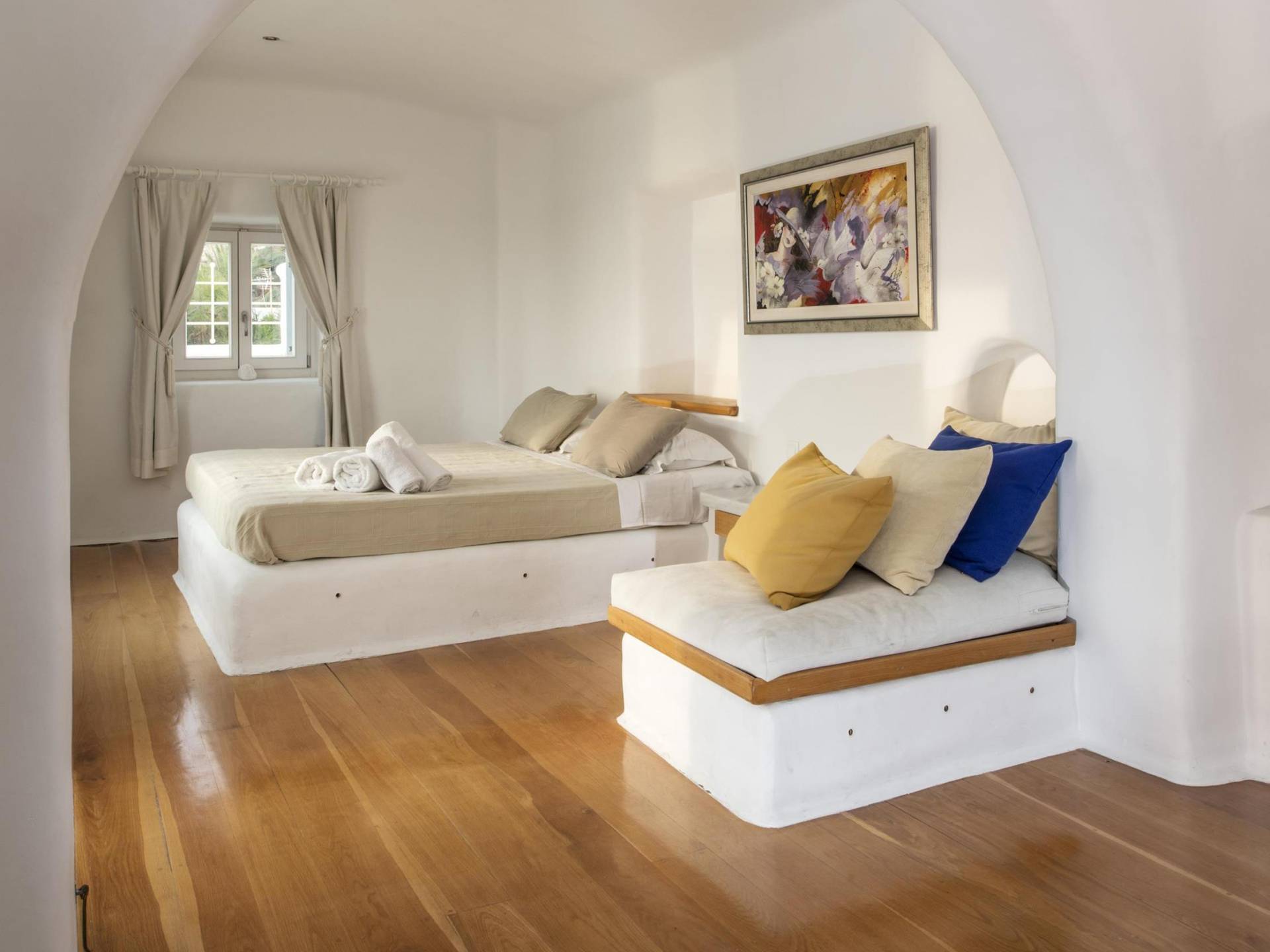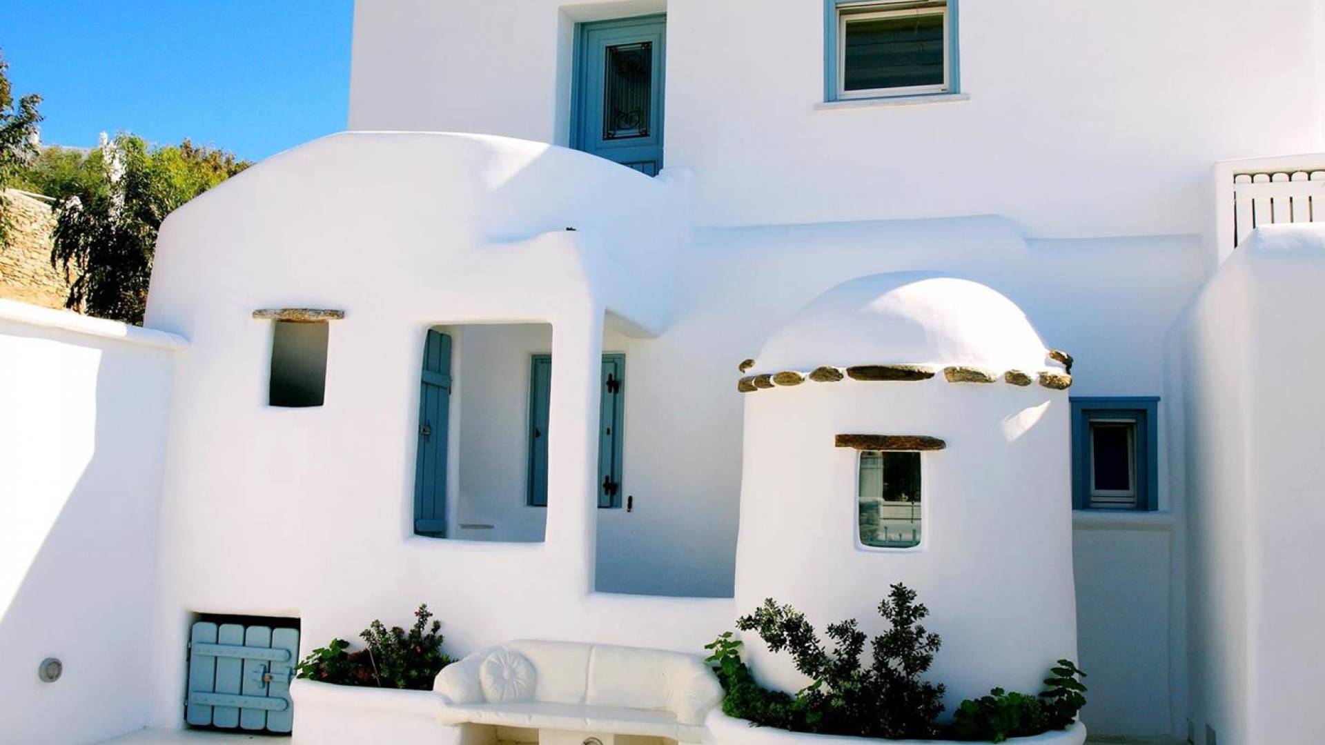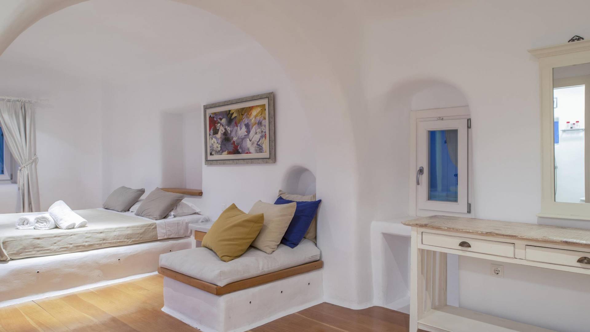 Villa Princess Mykonos is renovated by renowned local artist Zannis Koukas. The interior has kept its Cycladic character, painted white, with curved archways and floors made of sand. An added touch is the inbuilt wall lights and the discreet elements of luxury. They are combined with modern facilities, like a state-of-the-art sound system and a wireless internet connection, so that you won’t lose in comfort on your holiday.