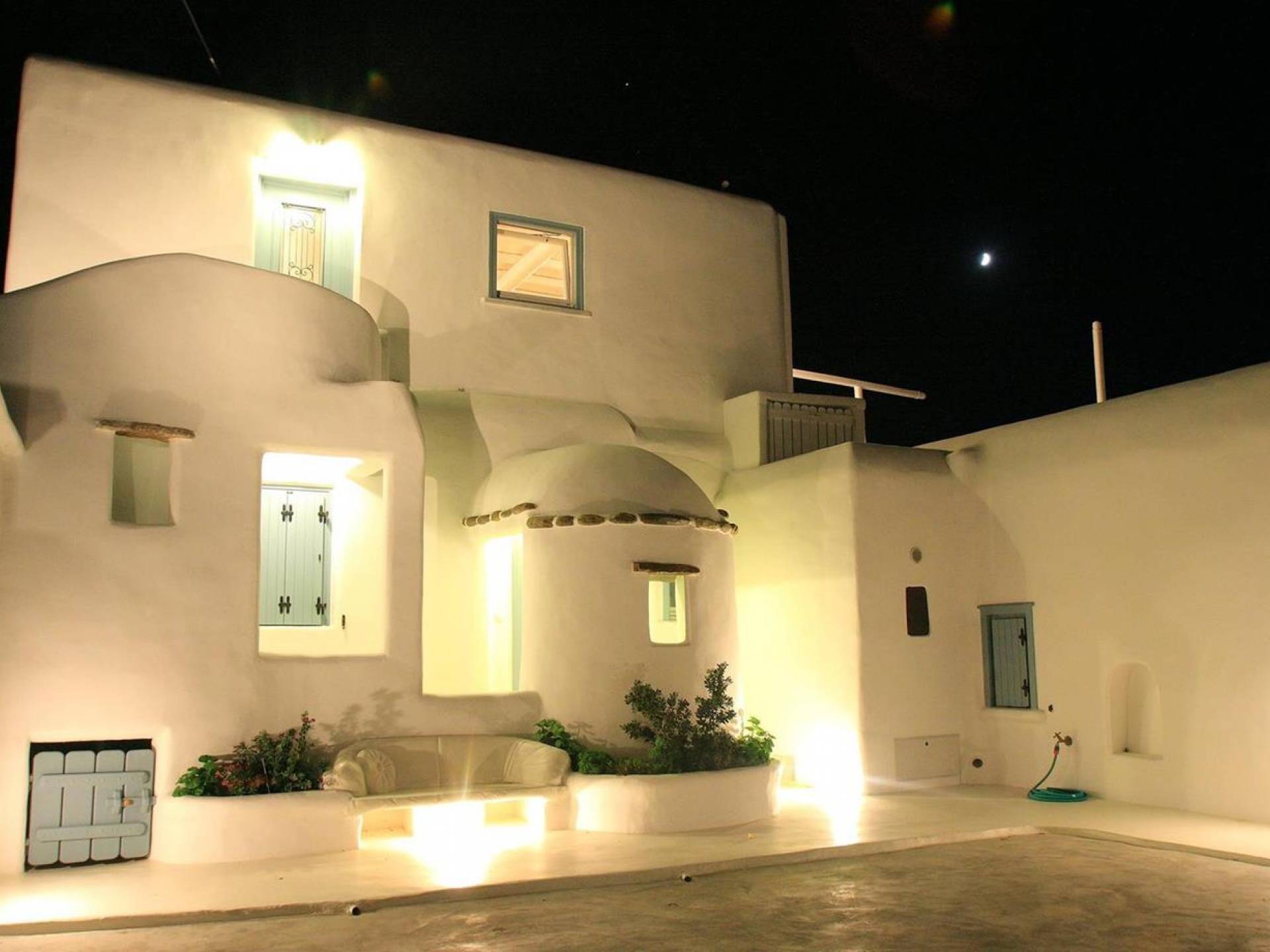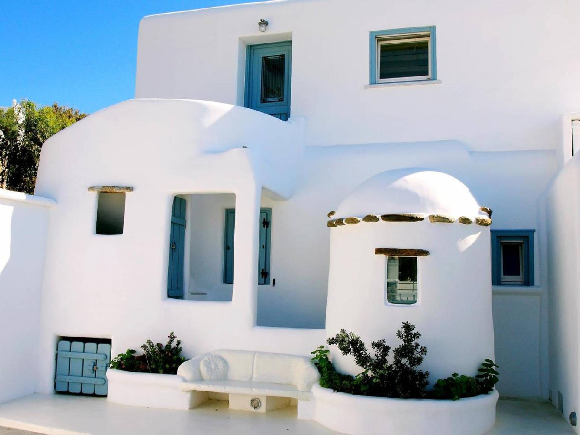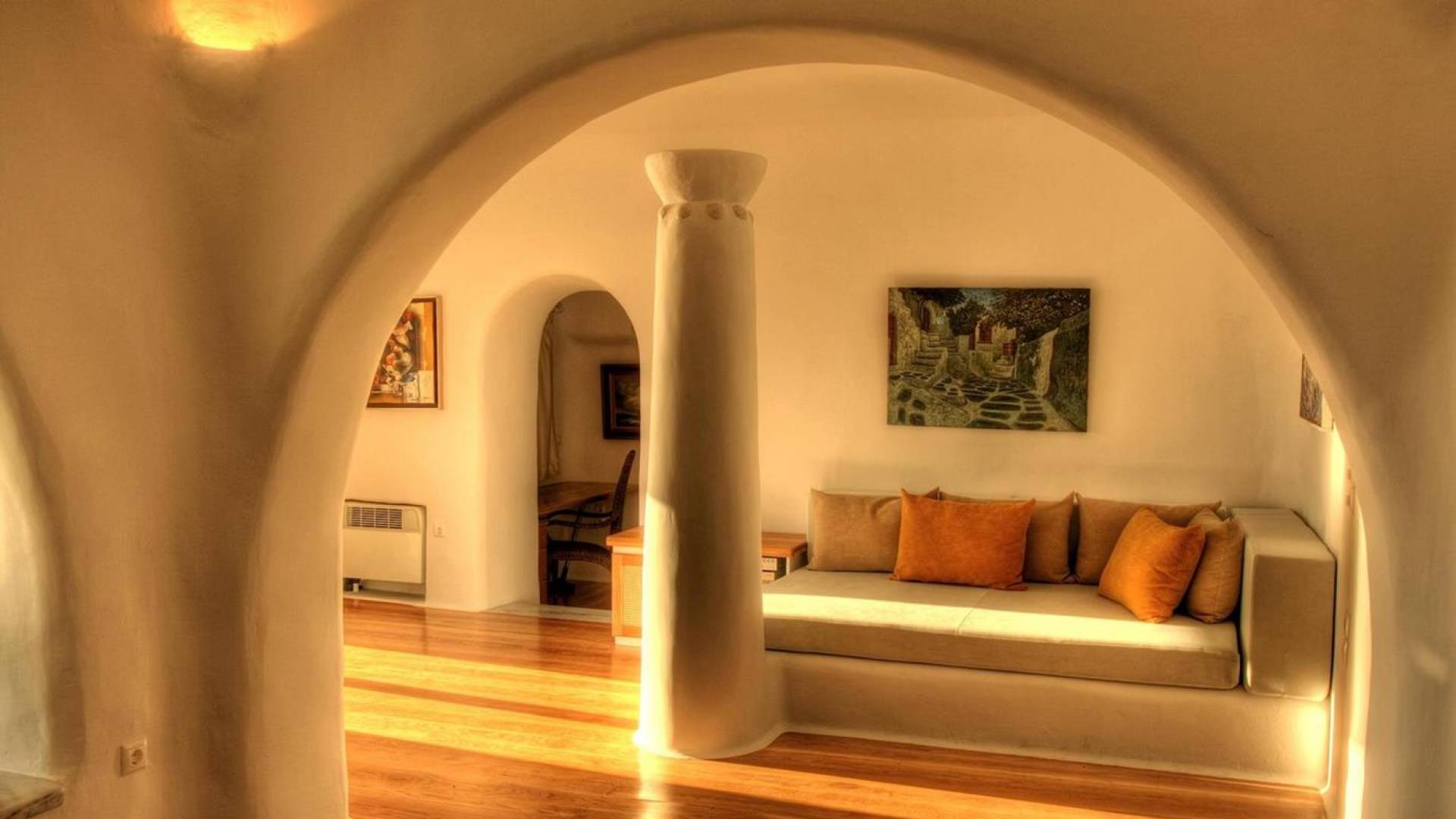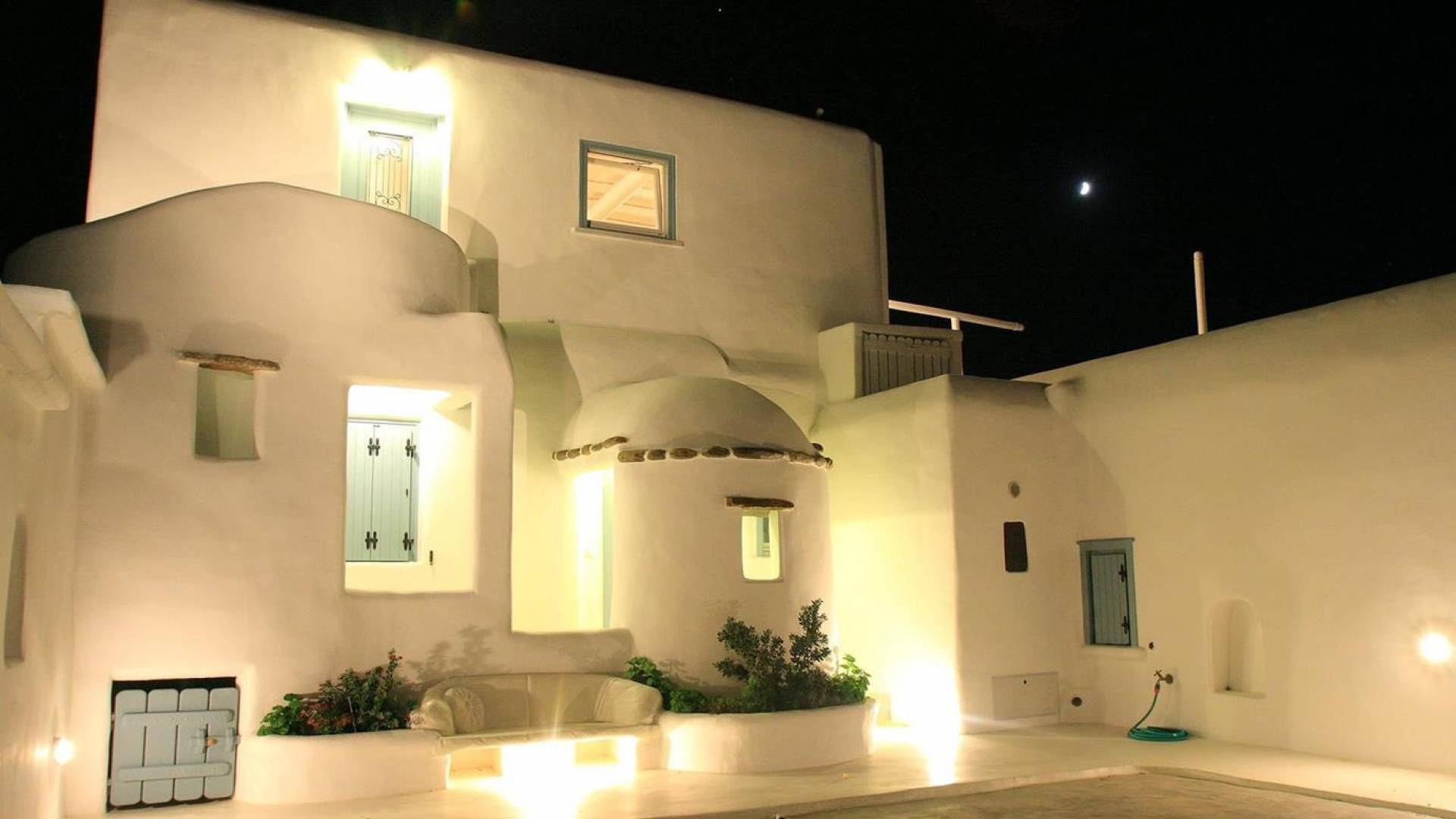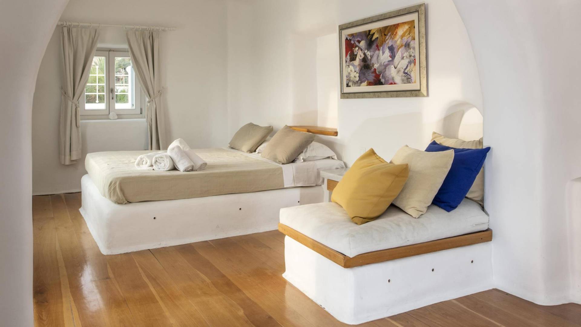 Villa Princess Mykonos is renovated by renowned local artist Zannis Koukas. The interior has kept its Cycladic character, painted white, with curved archways and floors made of sand. An added touch is the inbuilt wall lights and the discreet elements of luxury. They are combined with modern facilities, like a state-of-the-art sound system and a wireless internet connection, so that you won’t lose in comfort on your holiday.