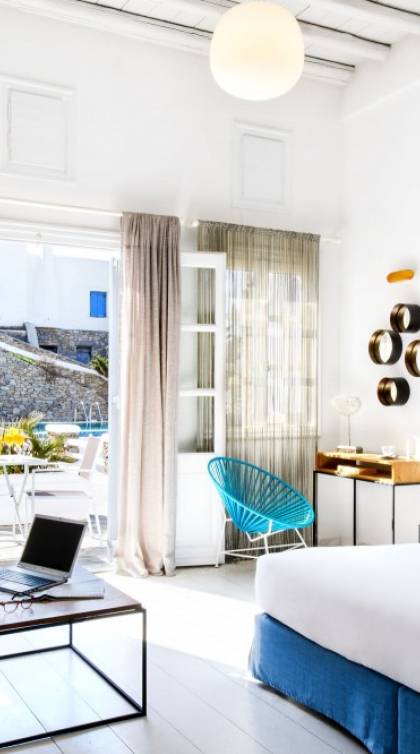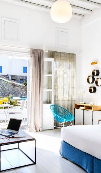 There is nothing Standard about this room, which boasts superb aesthetics and unique design. Hosting up to three individuals, Standard Rooms come with a king-size bed or twin beds, a private balcony or veranda with partial sea view, and luxurious amenities adding to the overall accommodation experience of our distinguished guests. In an area of 30 square meters, guests are welcome to enjoy the powerful elements of stone and wood, blended with the infinite Cycladic white of the décor in a unique combination that awakens the senses.