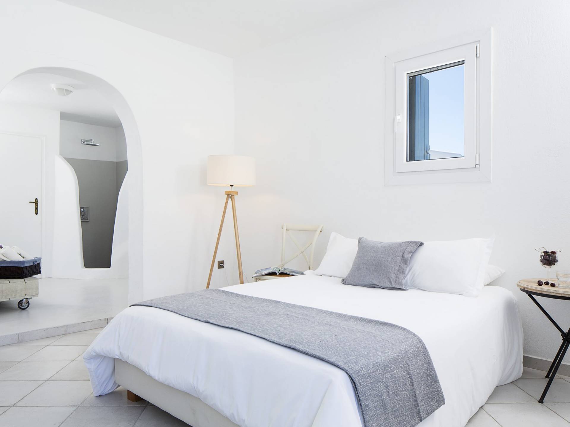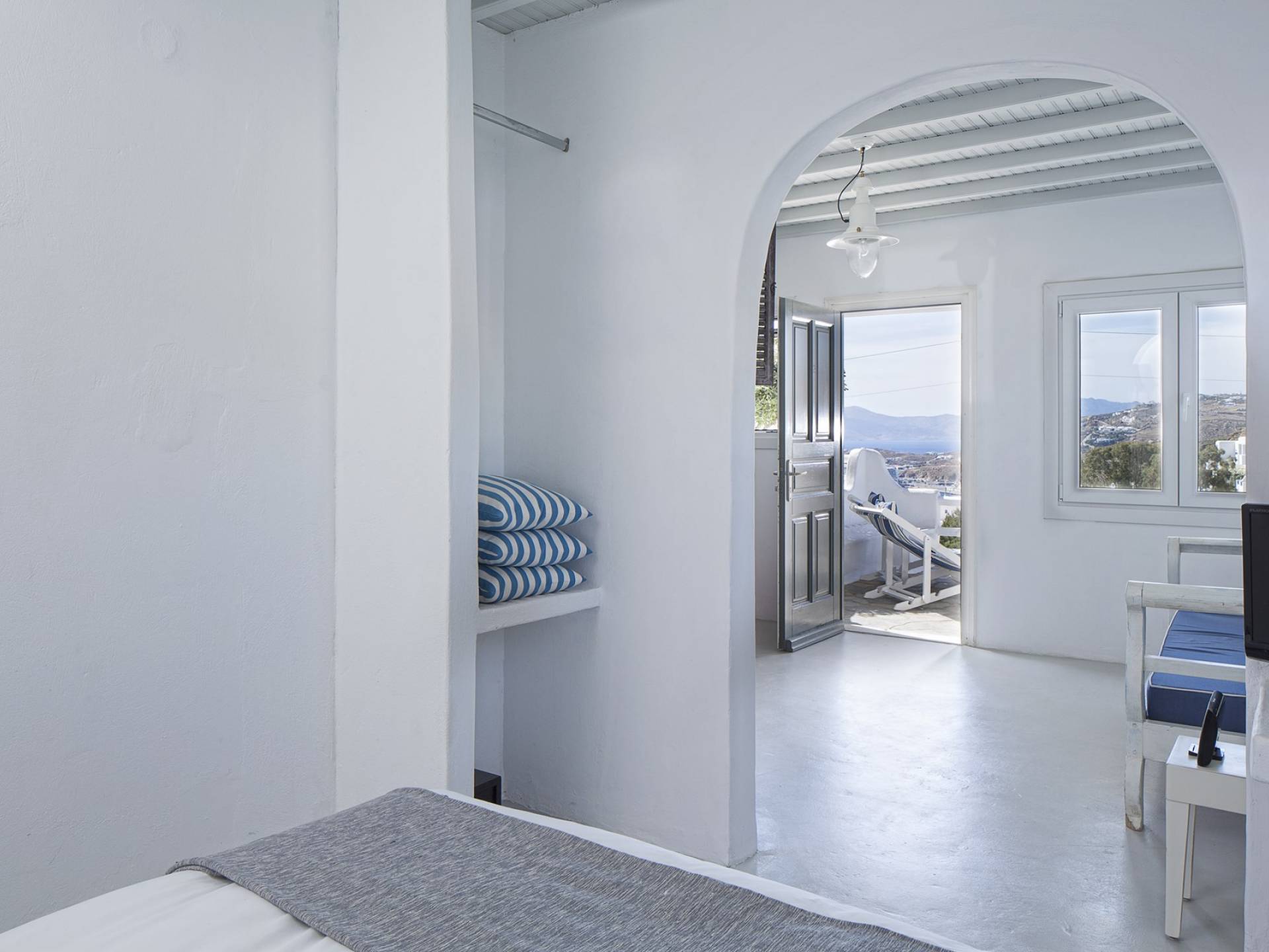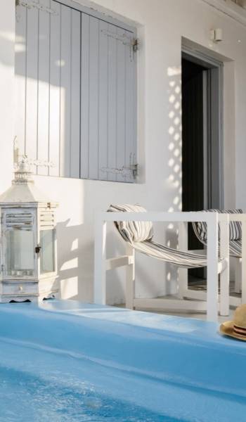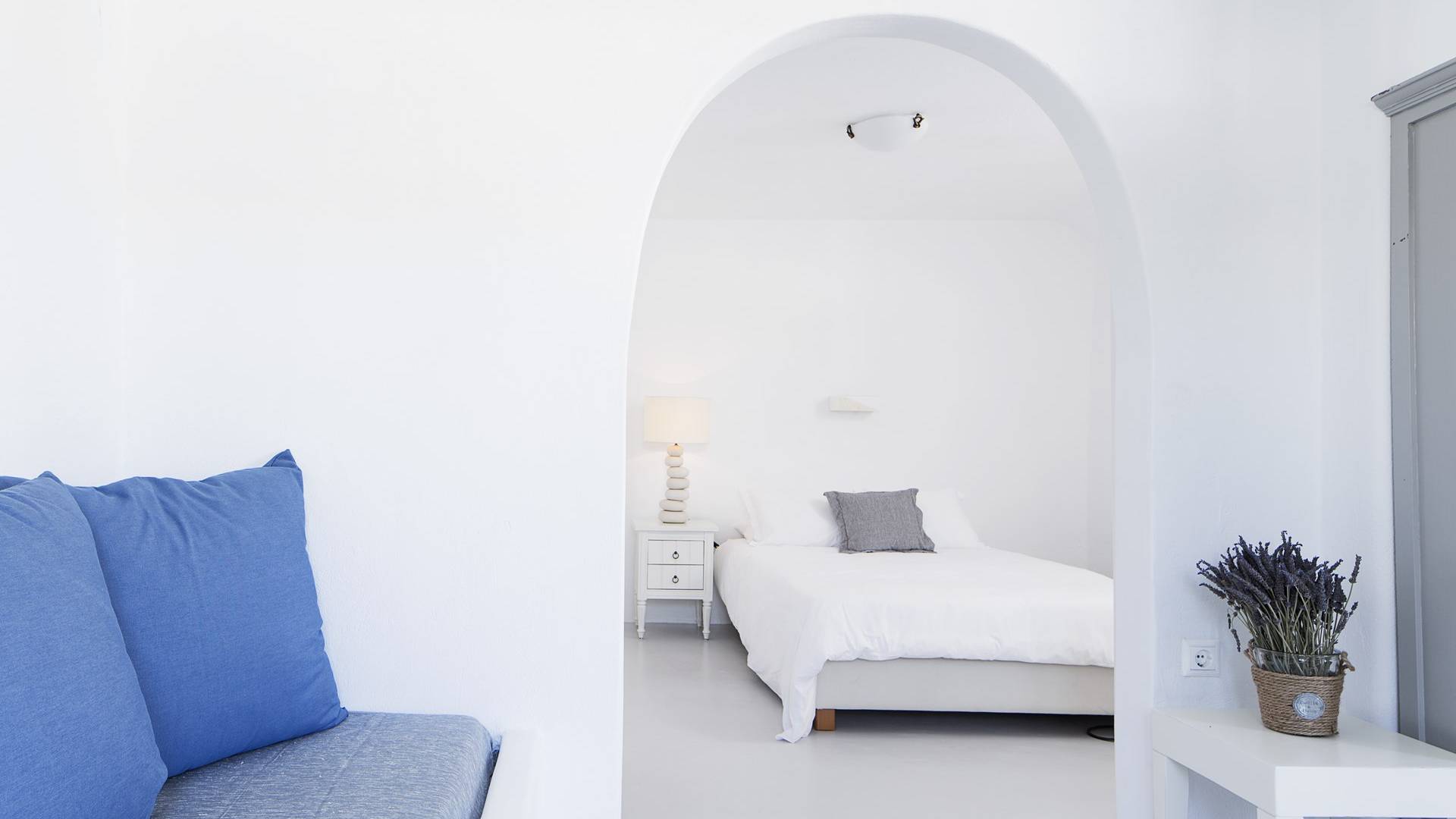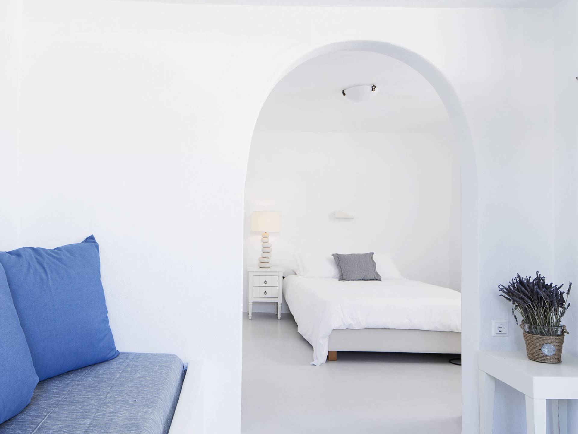 Built-in the style of true Myconian architecture, the minimalist interiors of each suite and villa epitomize contemporary design furnished with authentic details. Whitewashed walls, smooth arches and open plan spacing is seen throughout the complex create a relaxing and soothing ambiance. Each suite and villa has a different size and character of its own, to suit all kinds of groups. All rooms are air-conditioned, and have wifi and direct access to the shared pool & lounge areas.