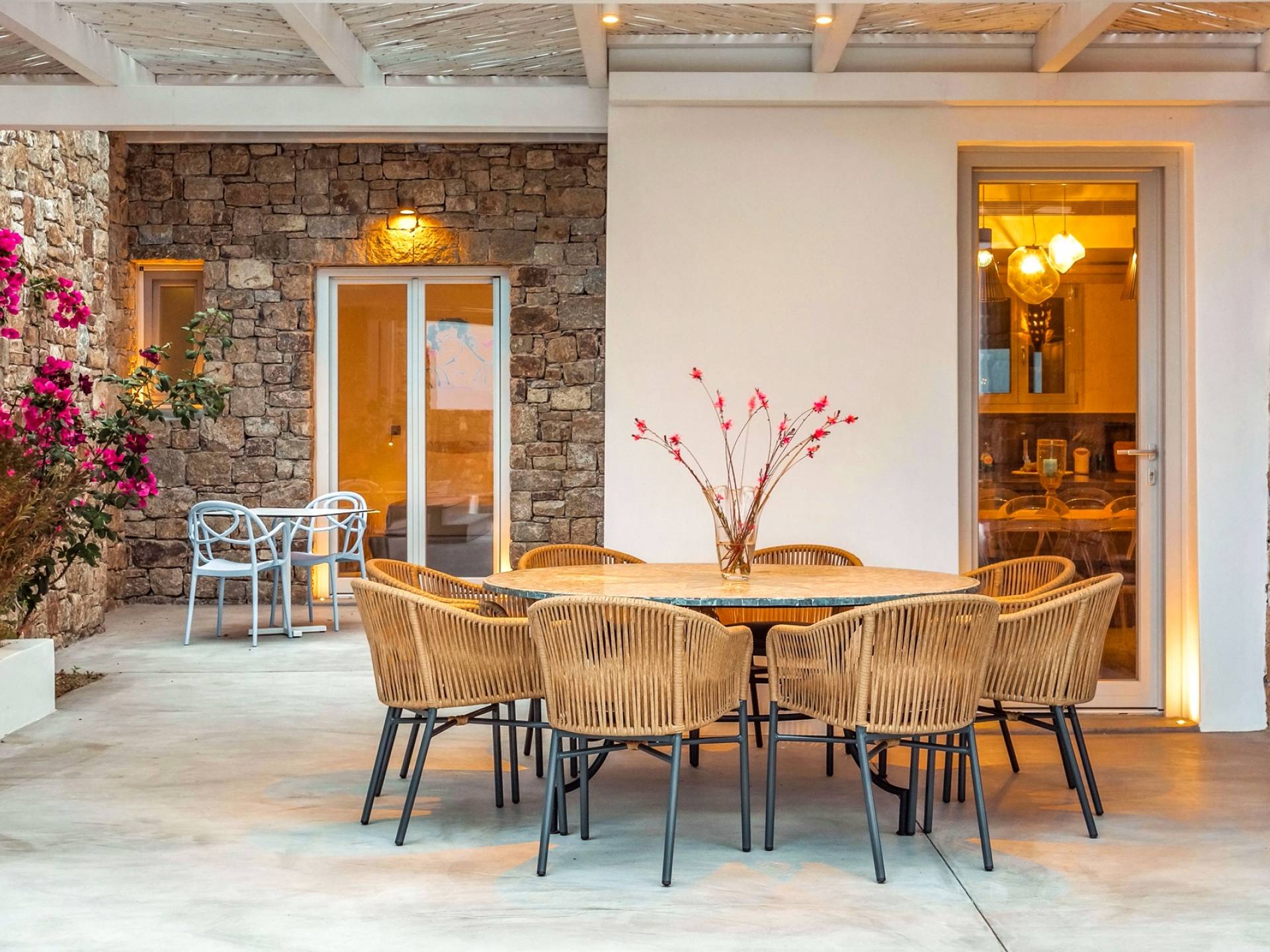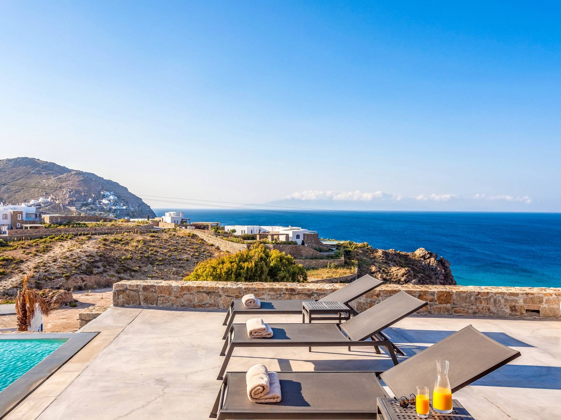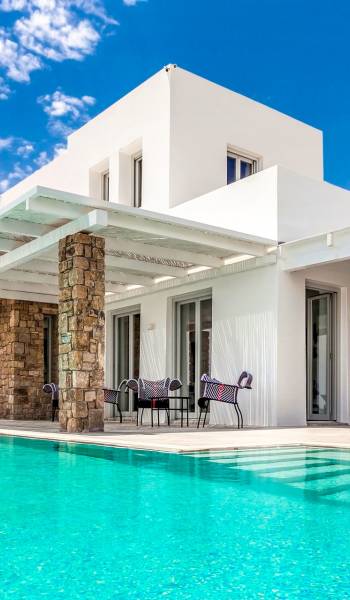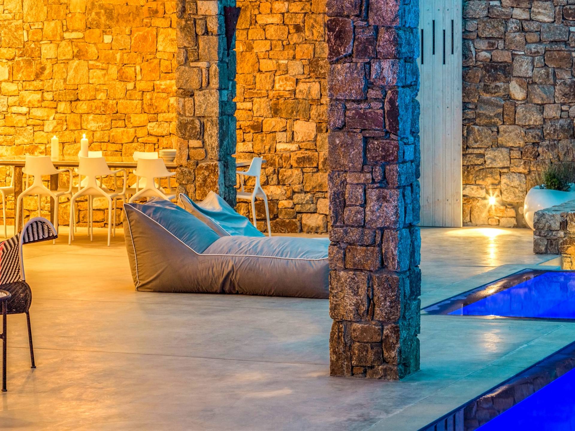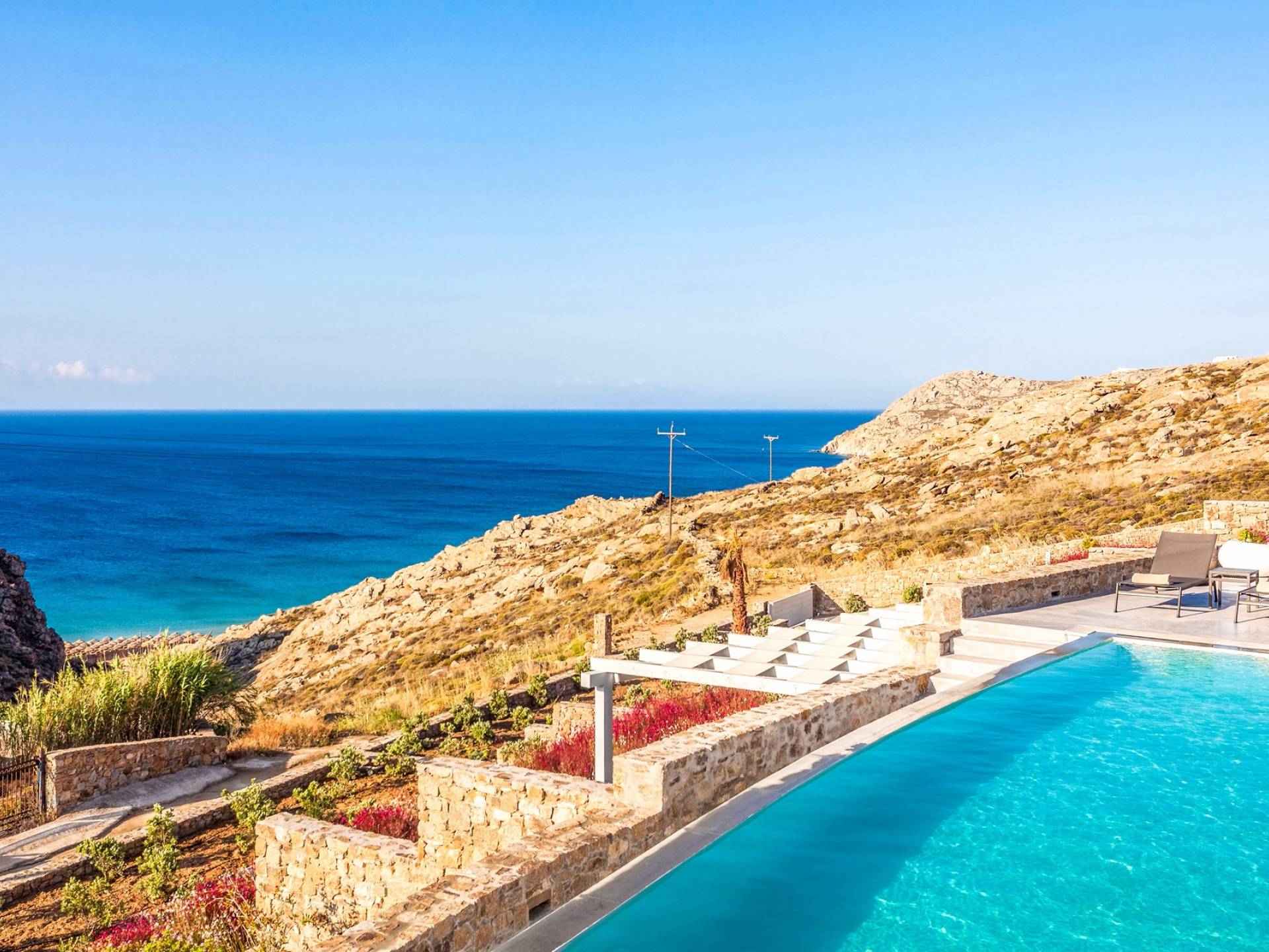 Ariel is a breathtaking seven-bedroom villa with sea views and a swimming pool in Mykonos's southeast, near Elia Beach. The property is new in style and equipped with modern amenities, but it retains aspects of traditional Mykonian architecture, such as beautiful white stone walls. It has a main villa and separate guest rooms, making it suitable for separate families or groups of friends traveling together.