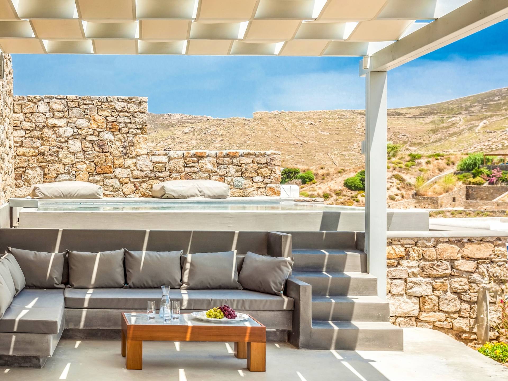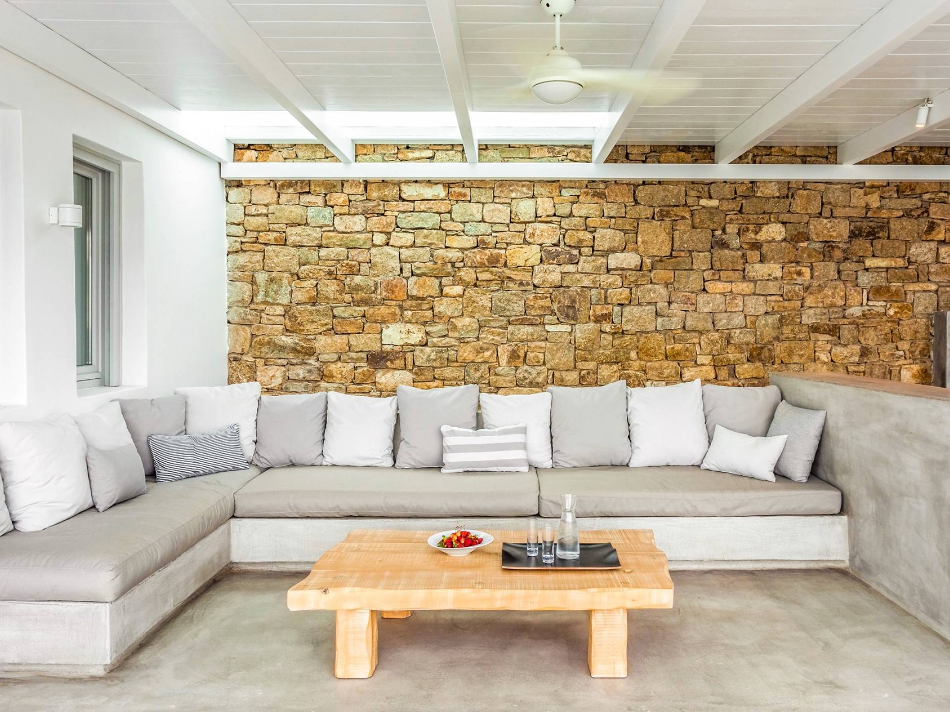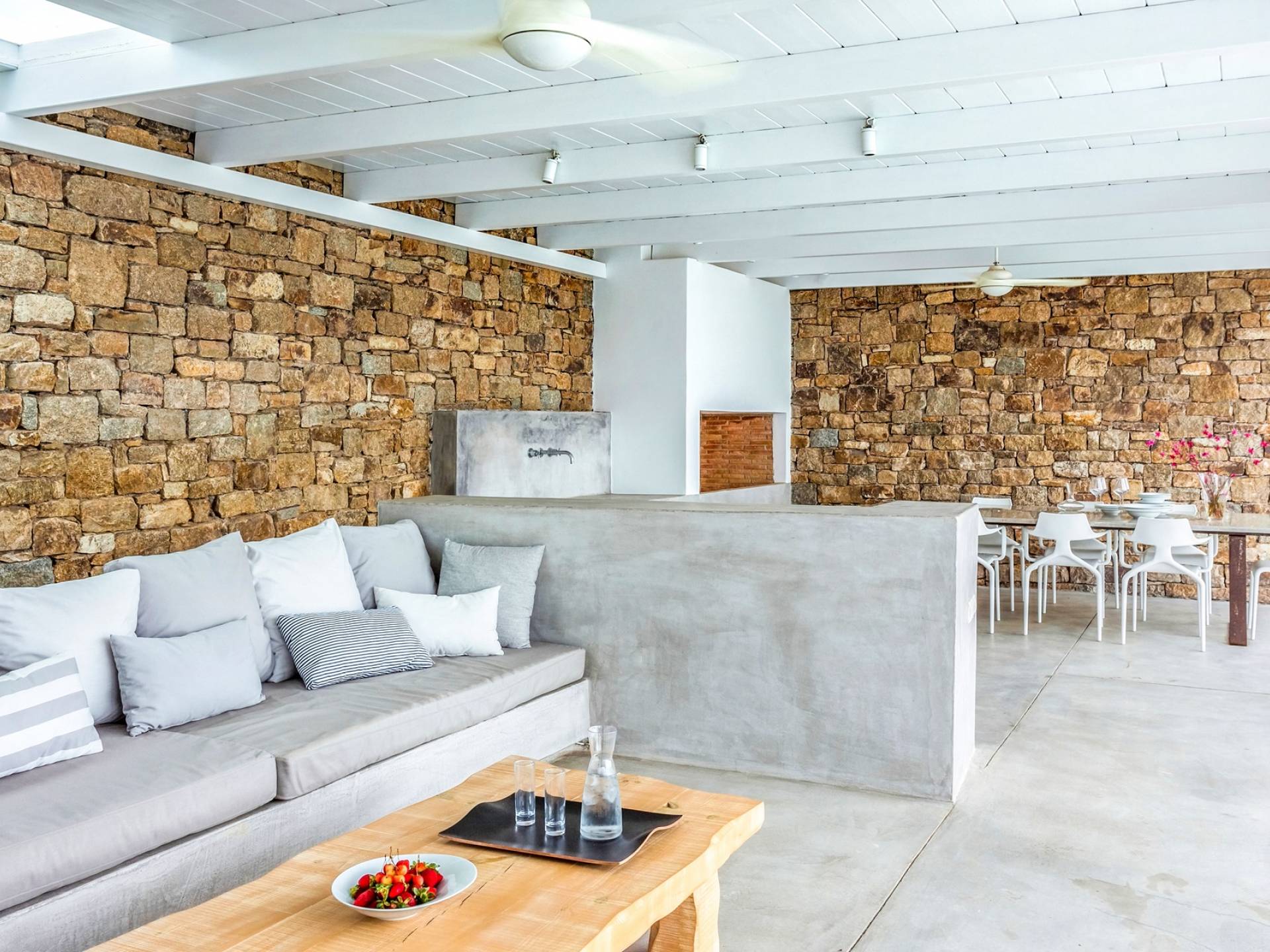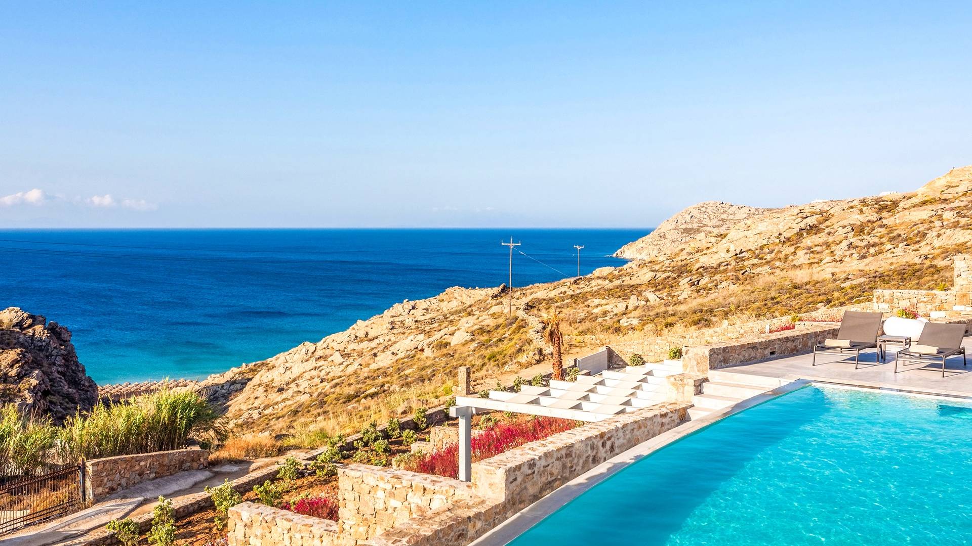 Ariel is a breathtaking seven-bedroom villa with sea views and a swimming pool in Mykonos's southeast, near Elia Beach. The property is new in style and equipped with modern amenities, but it retains aspects of traditional Mykonian architecture, such as beautiful white stone walls. It has a main villa and separate guest rooms, making it suitable for separate families or groups of friends traveling together.