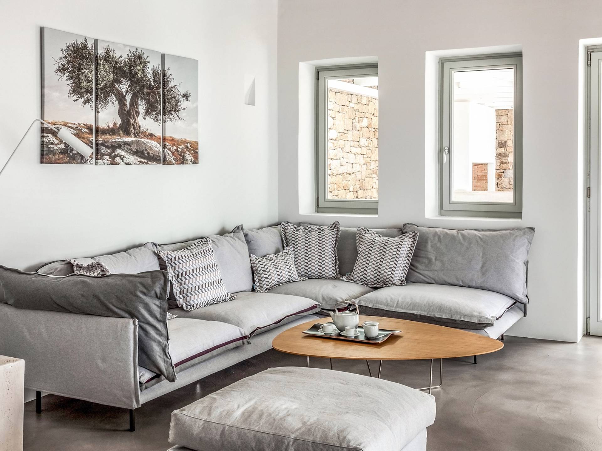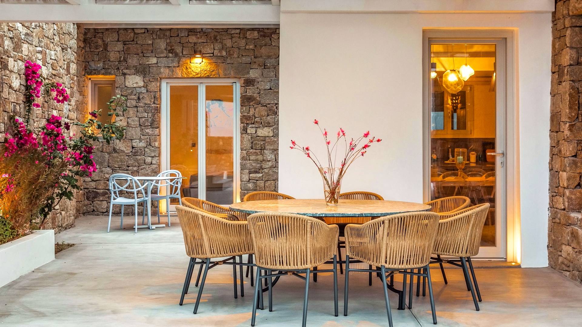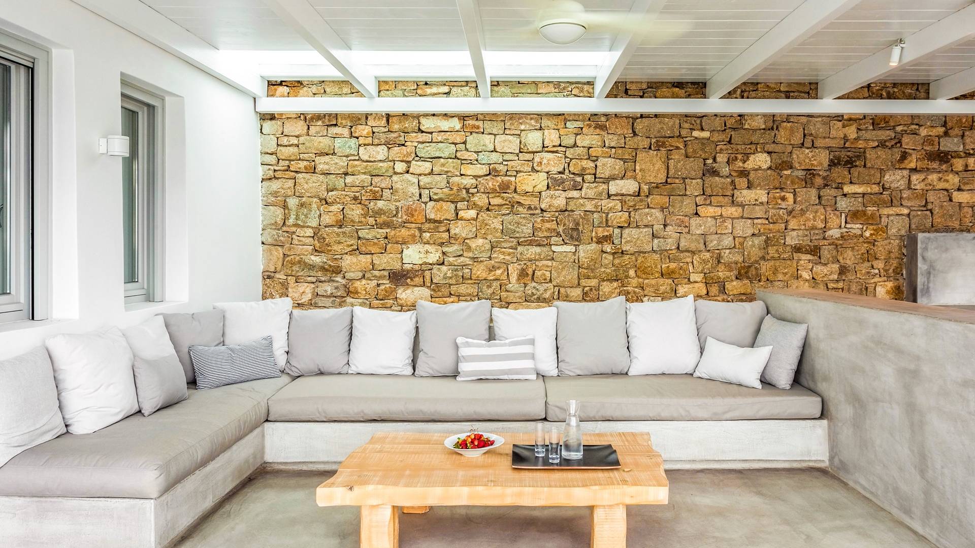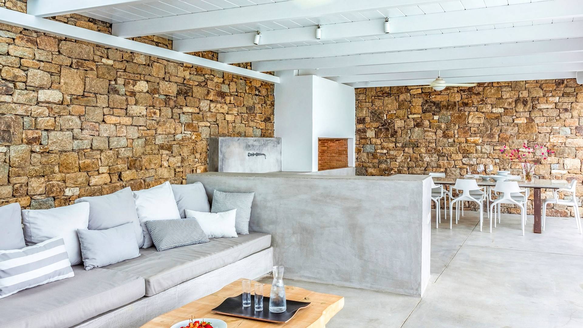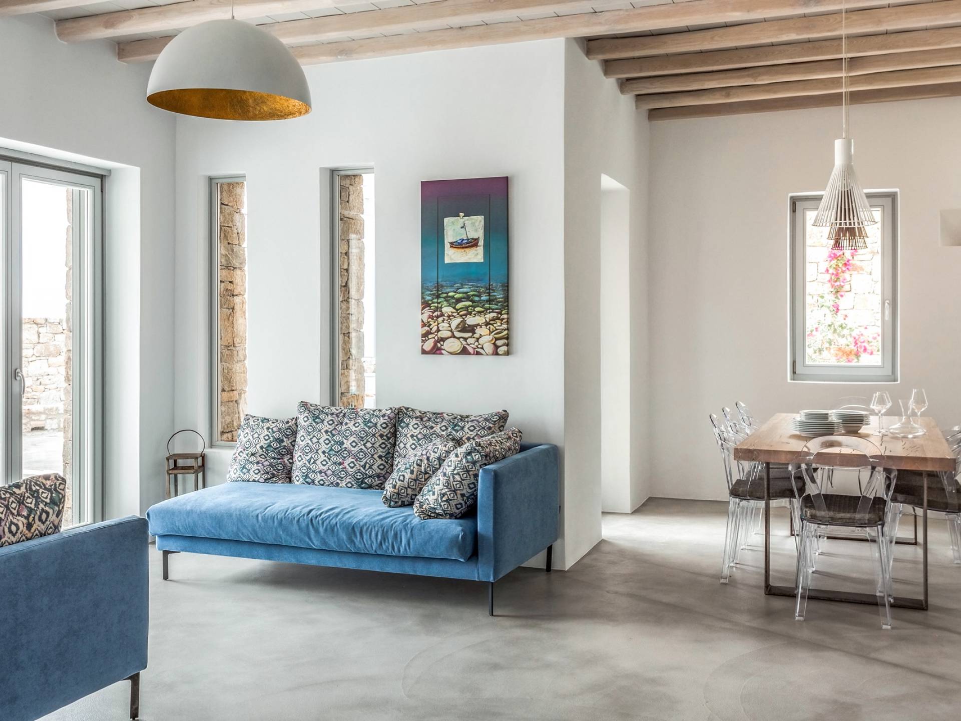 Ariel is a breathtaking seven-bedroom villa with sea views and a swimming pool in Mykonos's southeast, near Elia Beach. The property is new in style and equipped with modern amenities, but it retains aspects of traditional Mykonian architecture, such as beautiful white stone walls. It has a main villa and separate guest rooms, making it suitable for separate families or groups of friends traveling together.