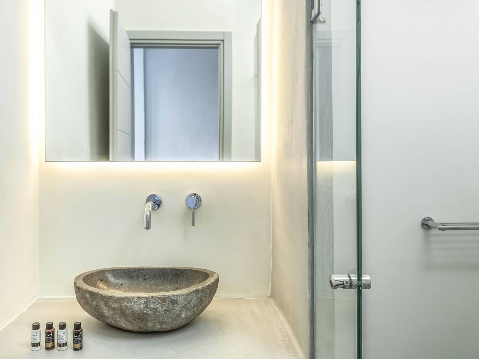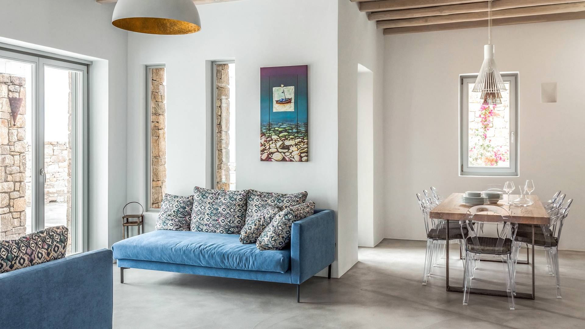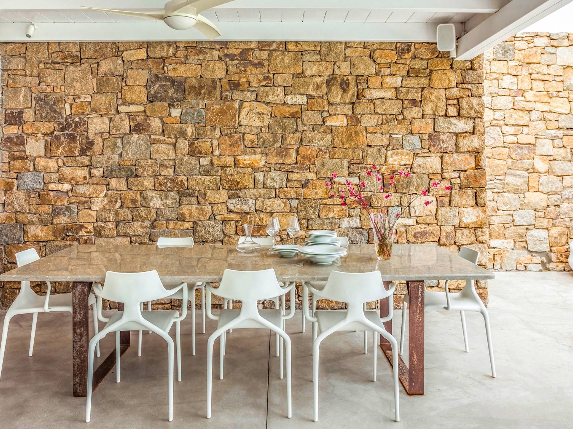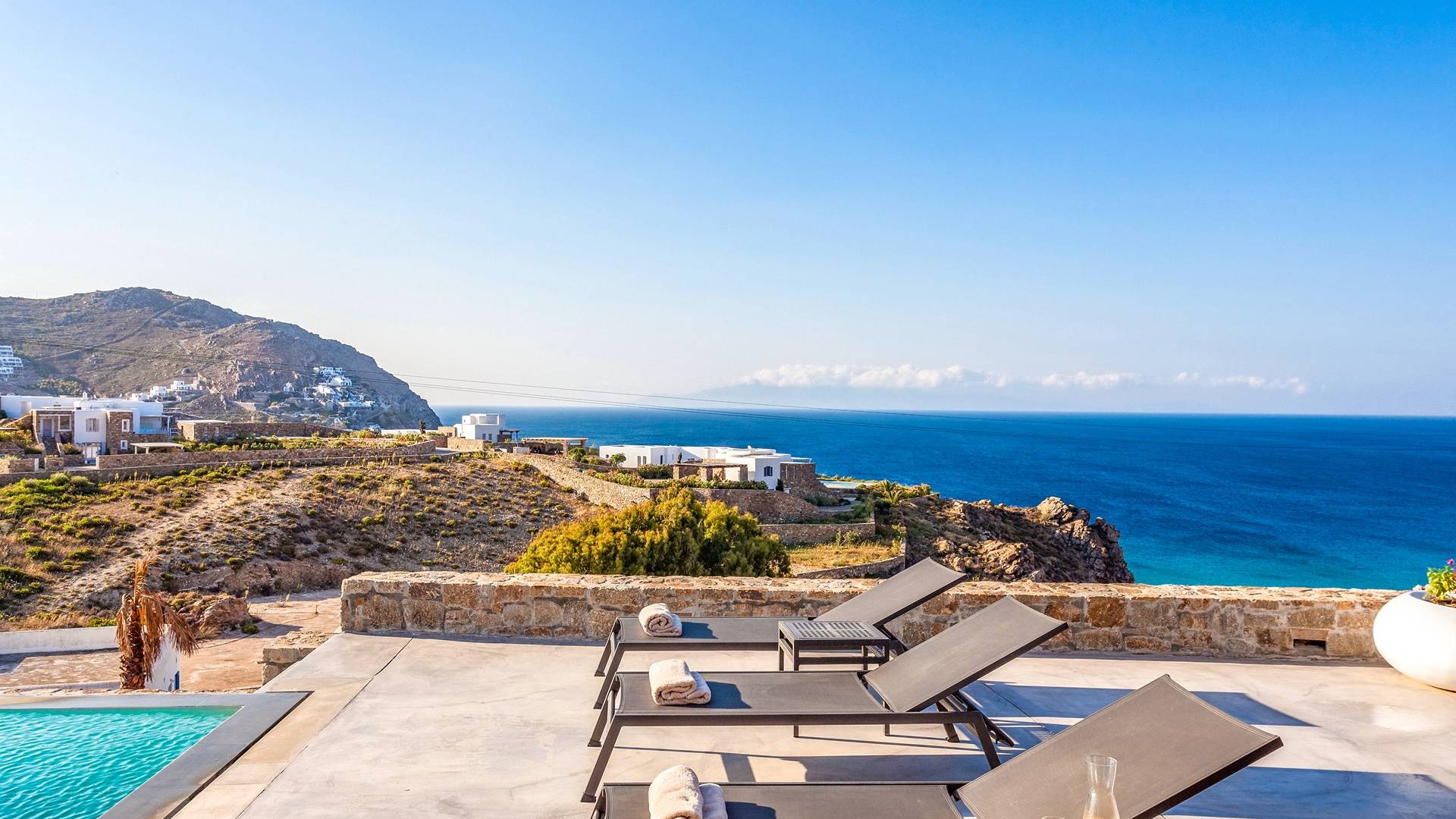 Ariel is a breathtaking seven-bedroom villa with sea views and a swimming pool in Mykonos's southeast, near Elia Beach. The property is new in style and equipped with modern amenities, but it retains aspects of traditional Mykonian architecture, such as beautiful white stone walls. It has a main villa and separate guest rooms, making it suitable for separate families or groups of friends traveling together.