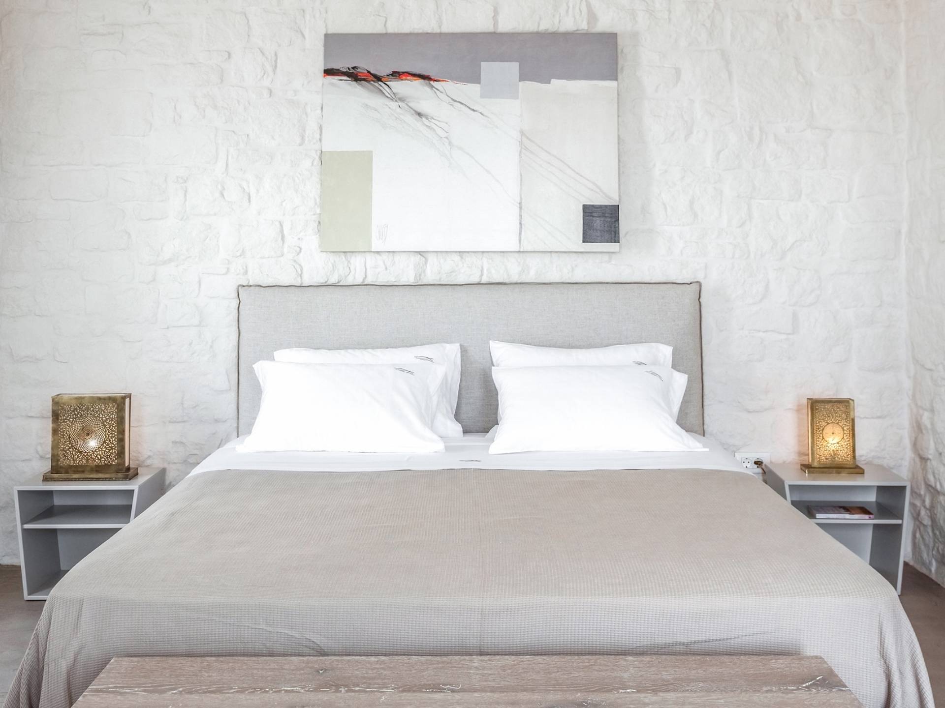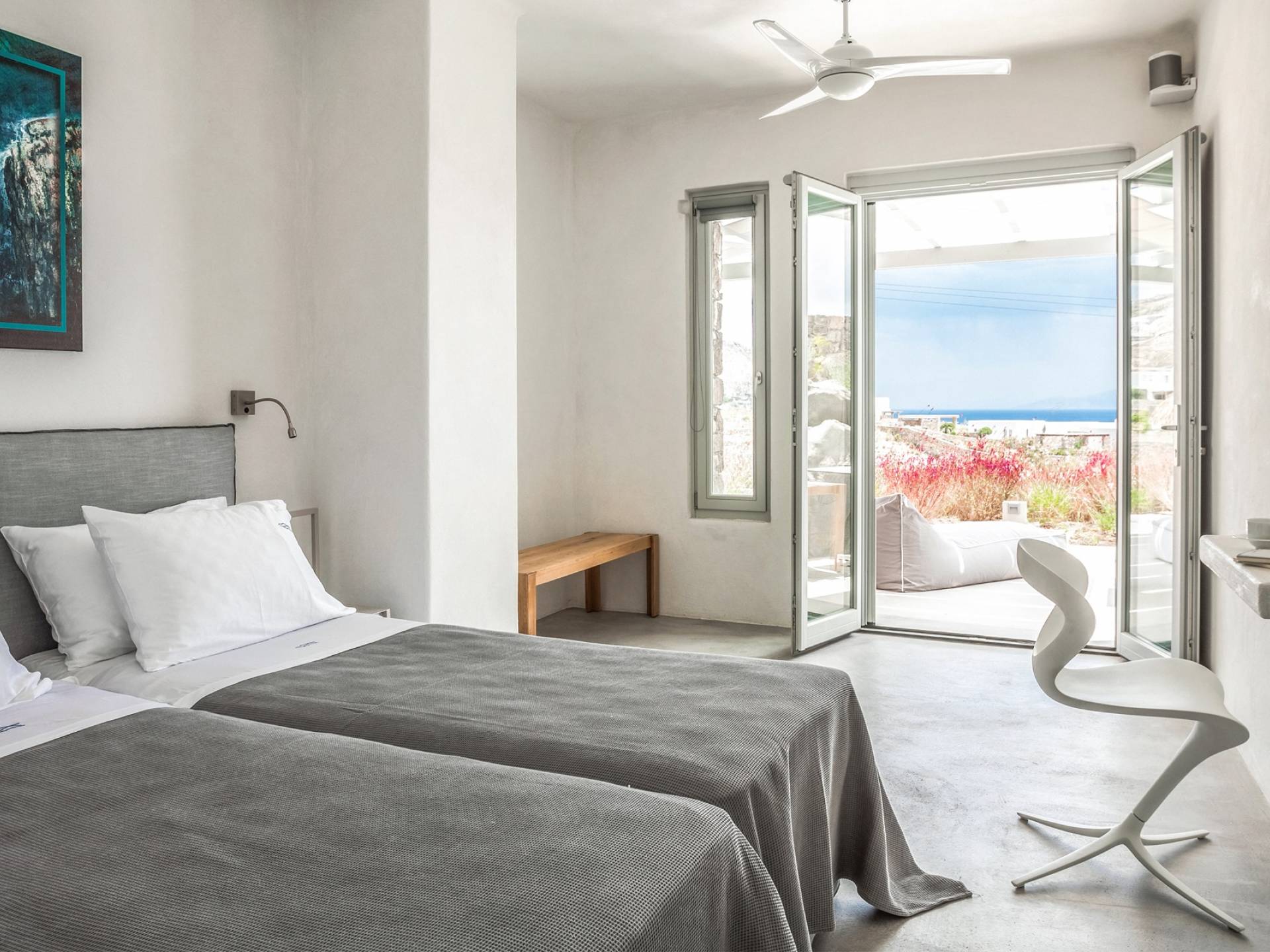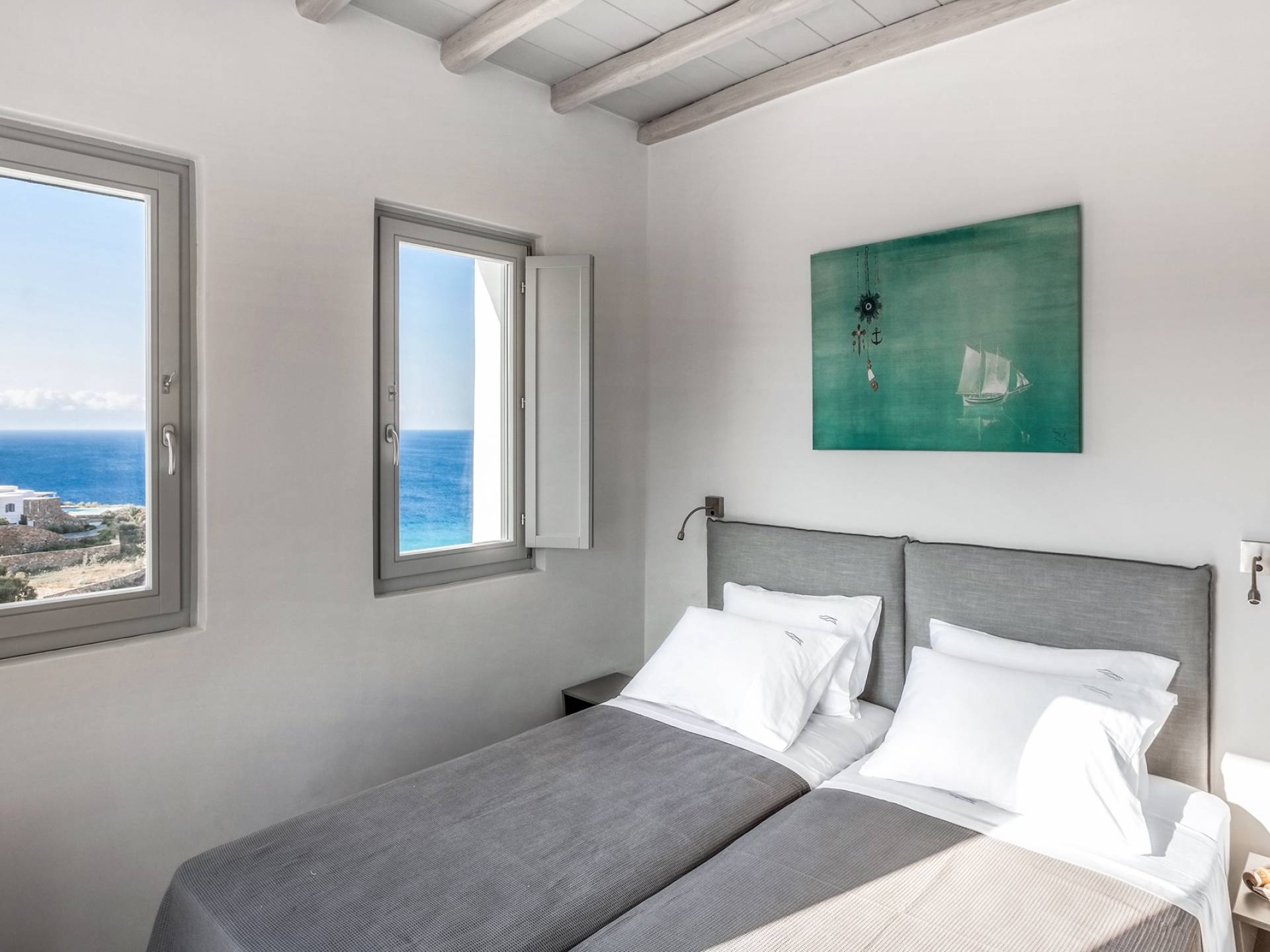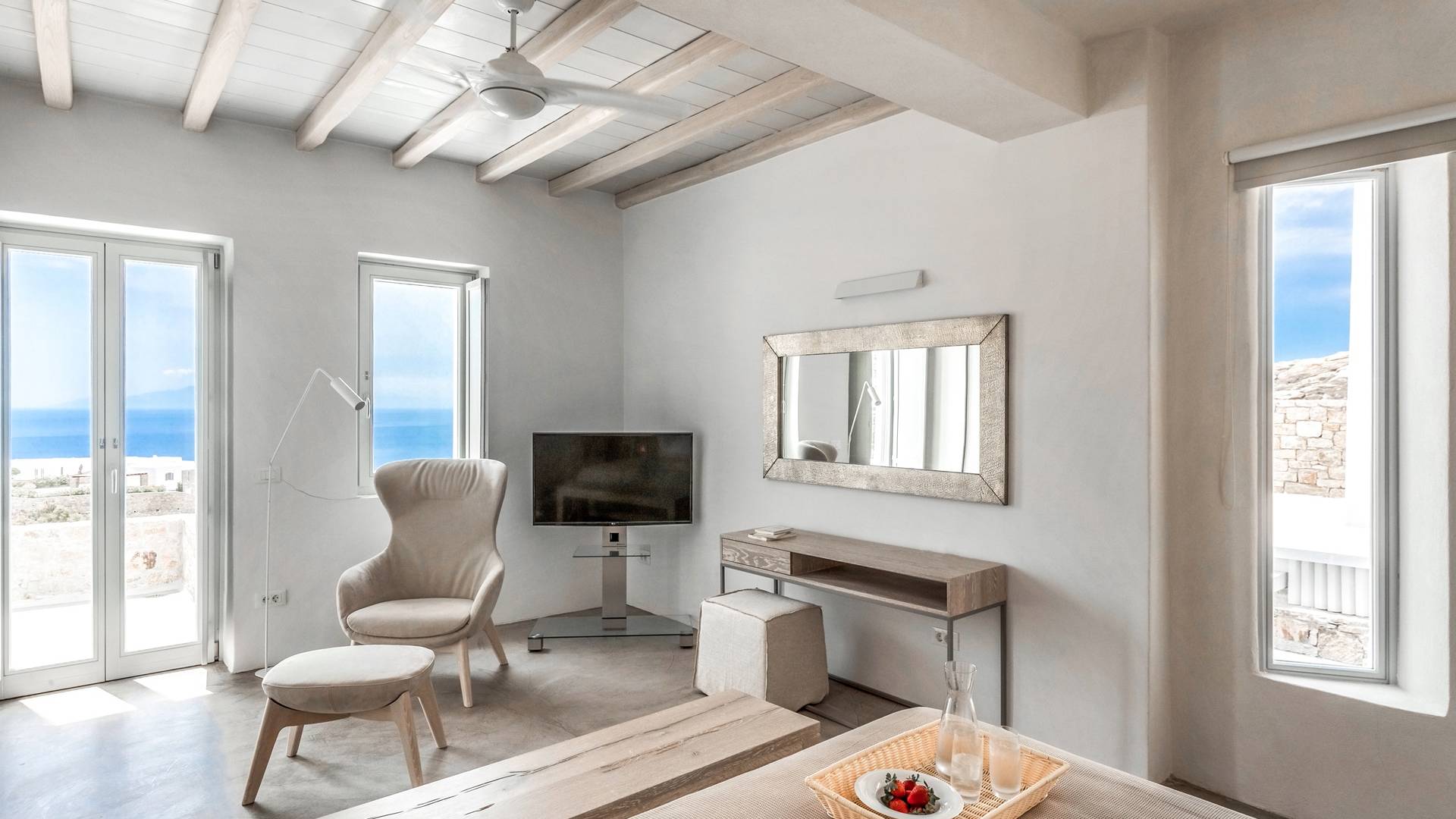 Villa Ariel has three bedrooms in the main structure, three master suites in the guest quarters, and one staff room with private entry. Many of the bedrooms have en-suite bathrooms and premium bedding to ensure a restful night's sleep. Villa Ariel provides the ideal atmosphere for a luxurious vacation in Mykonos, with its breathtaking scenery, comfortable living rooms, and modern amenities