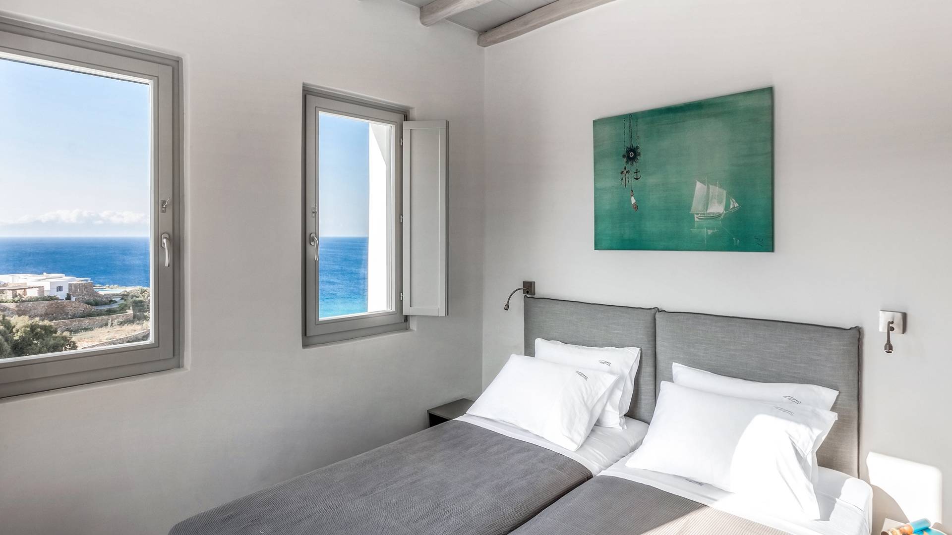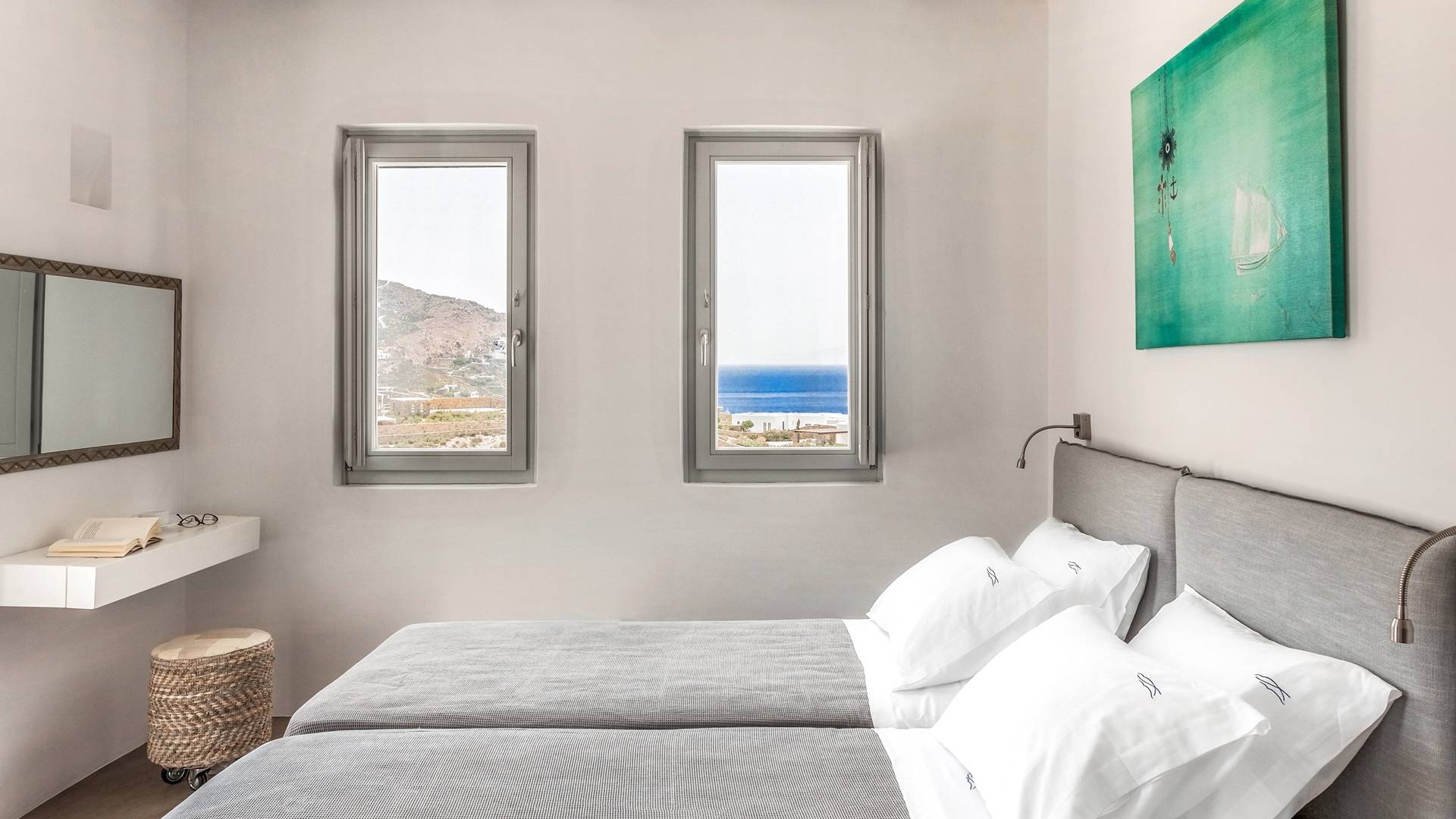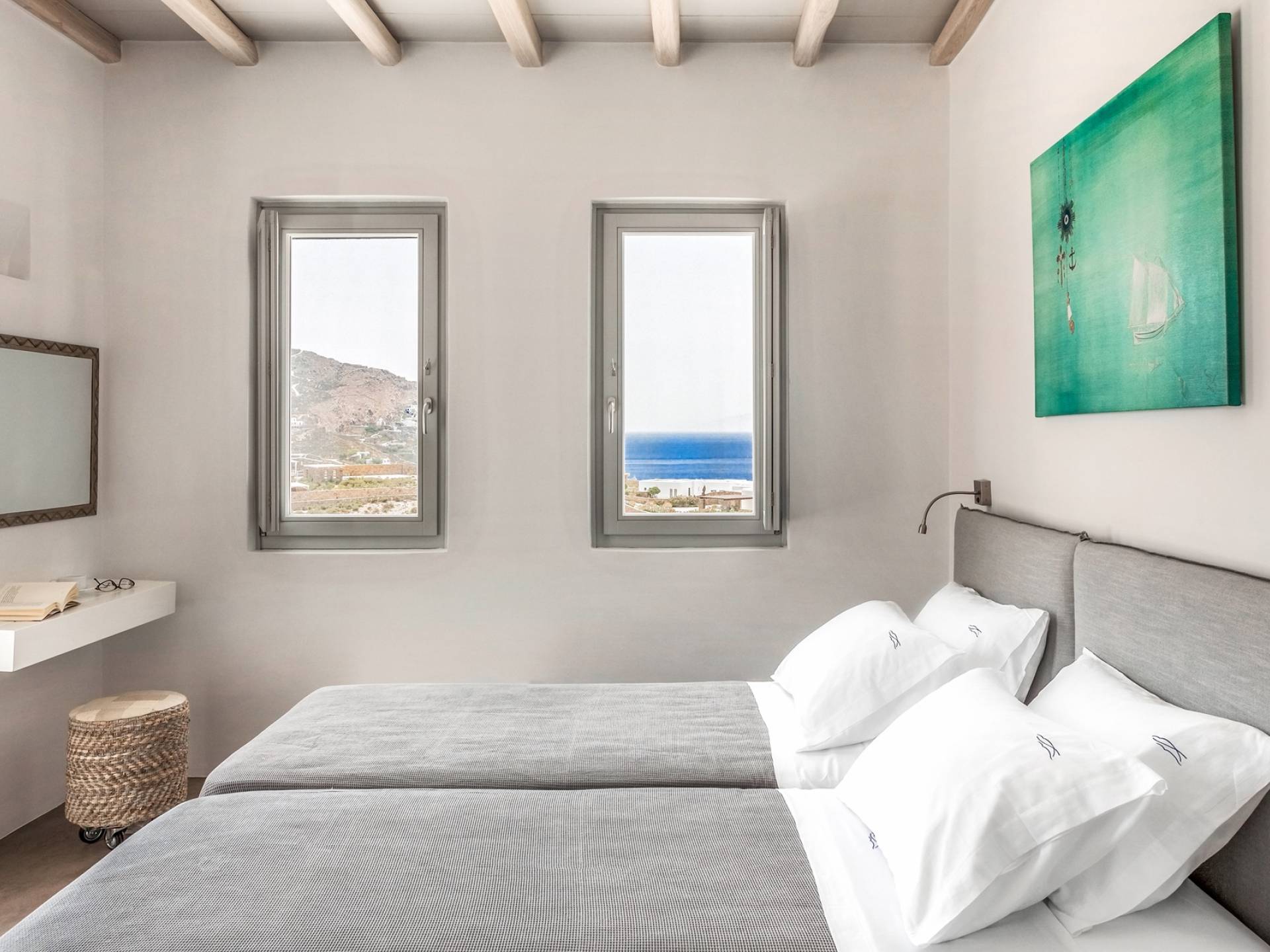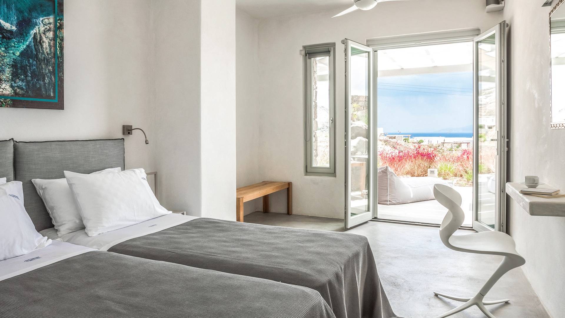 Villa Ariel has three bedrooms in the main structure, three master suites in the guest quarters, and one staff room with private entry. Many of the bedrooms have en-suite bathrooms and premium bedding to ensure a restful night's sleep. Villa Ariel provides the ideal atmosphere for a luxurious vacation in Mykonos, with its breathtaking scenery, comfortable living rooms, and modern amenities