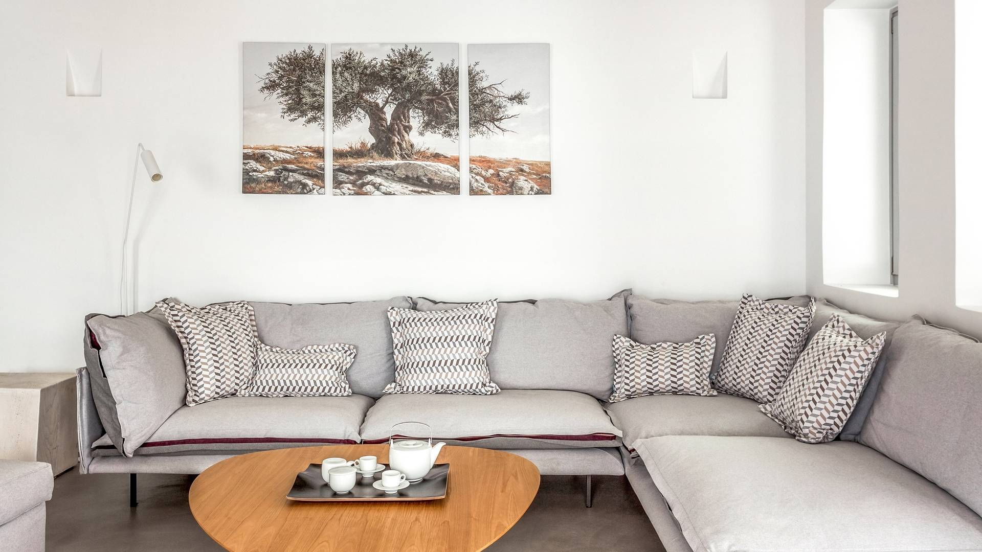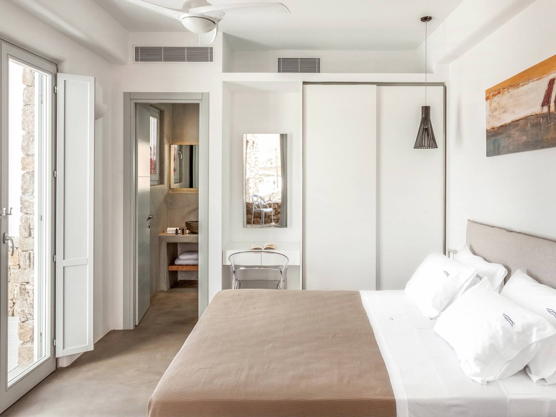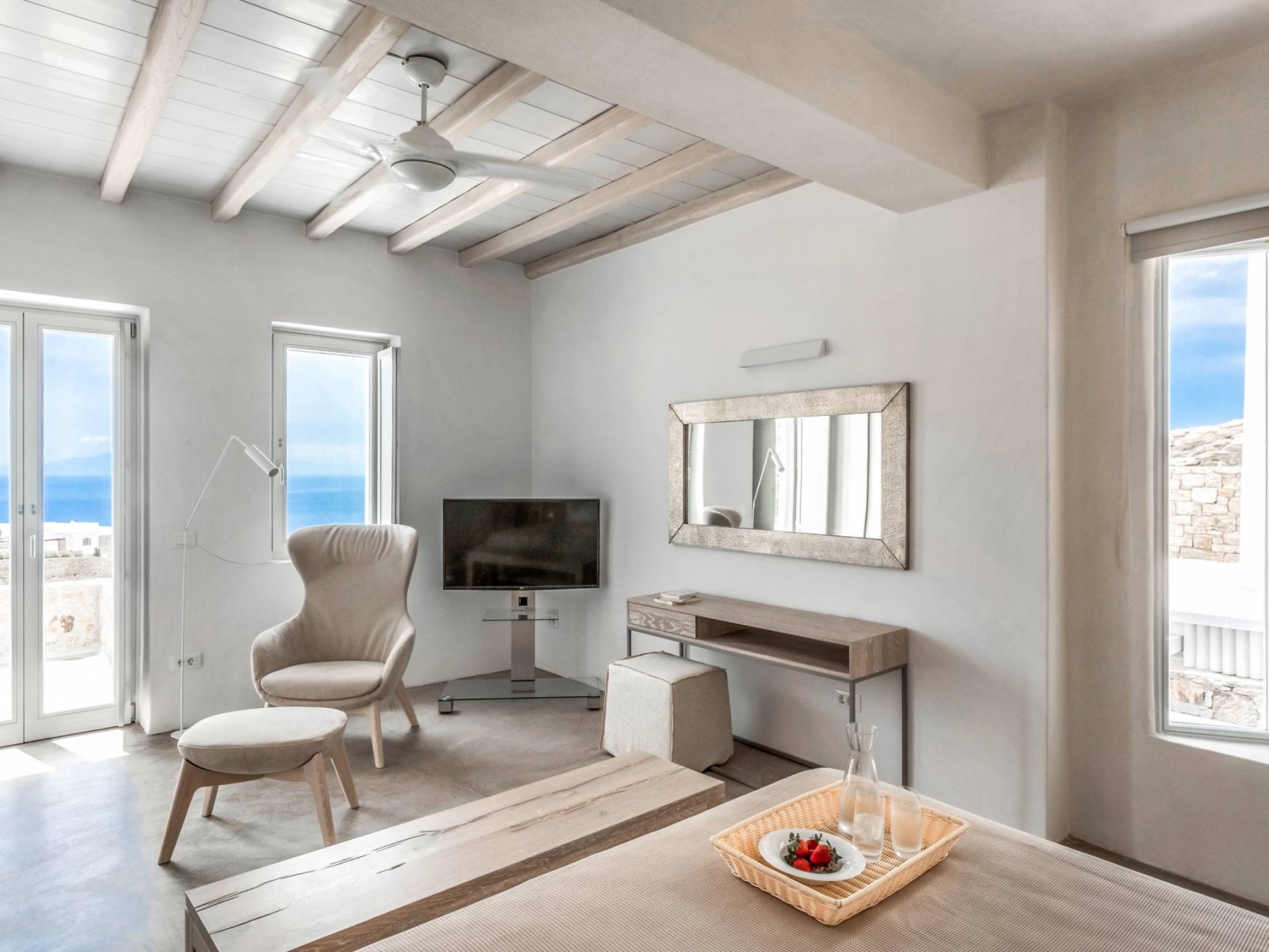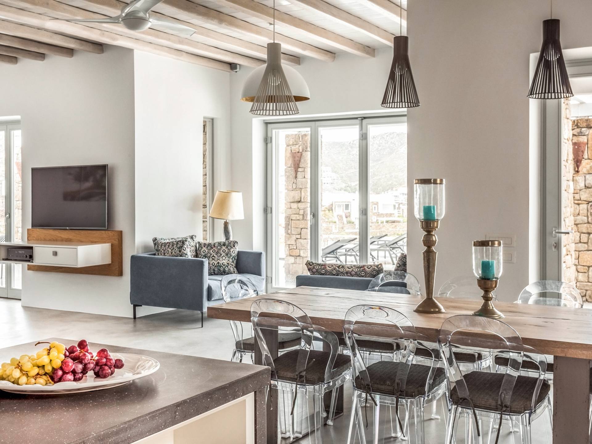 Villa Ariel has three bedrooms in the main structure, three master suites in the guest quarters, and one staff room with private entry. Many of the bedrooms have en-suite bathrooms and premium bedding to ensure a restful night's sleep. Villa Ariel provides the ideal atmosphere for a luxurious vacation in Mykonos, with its breathtaking scenery, comfortable living rooms, and modern amenities