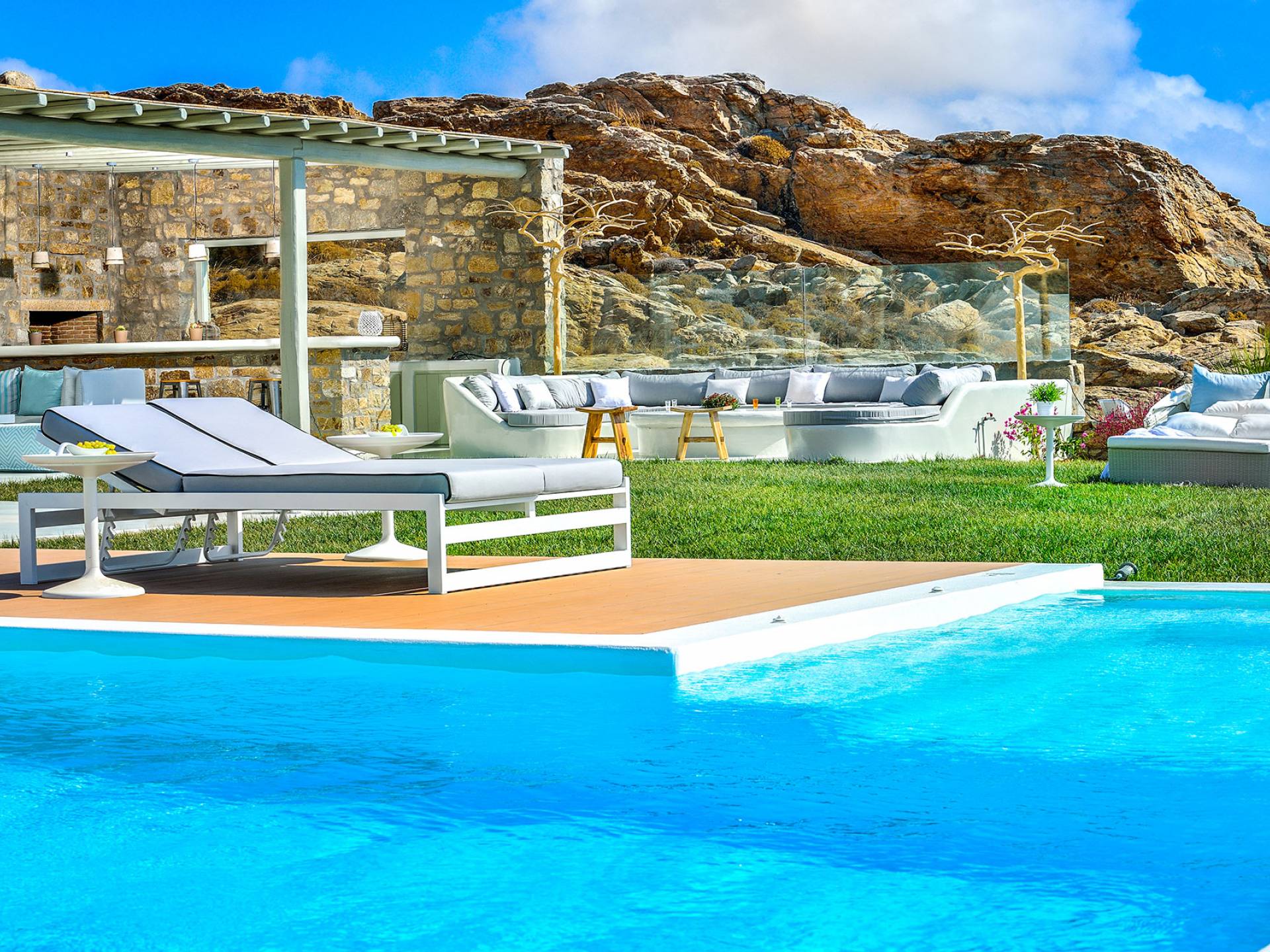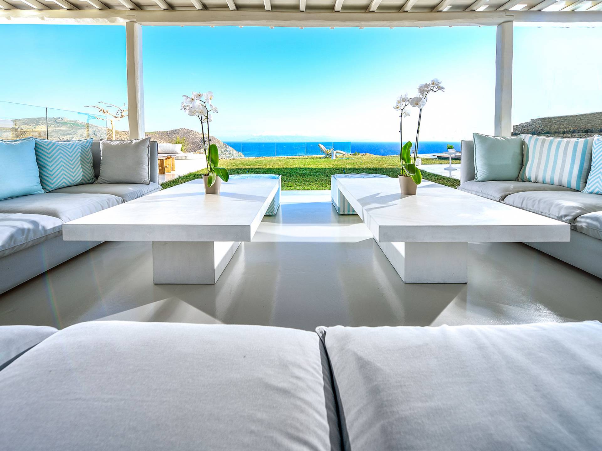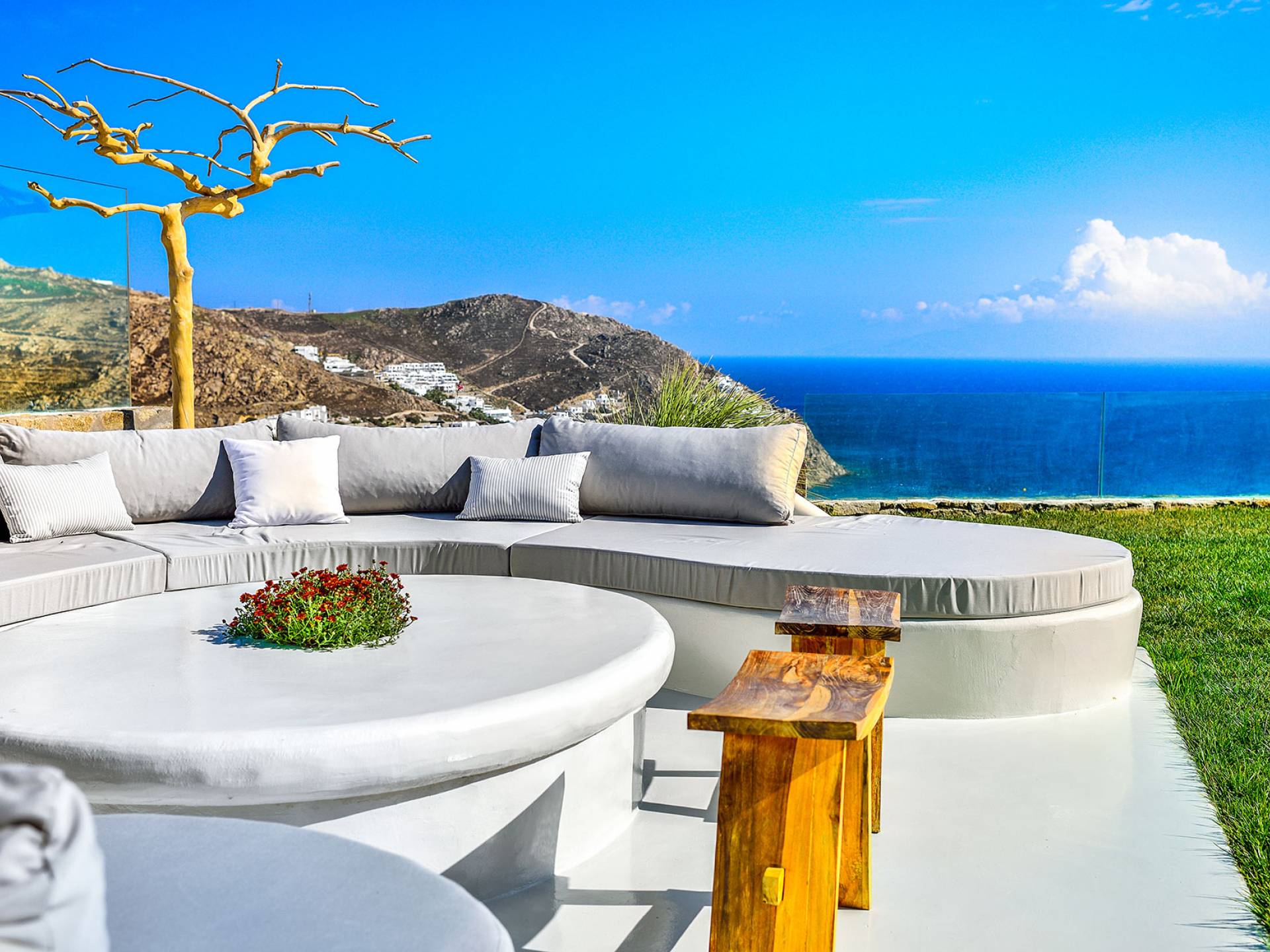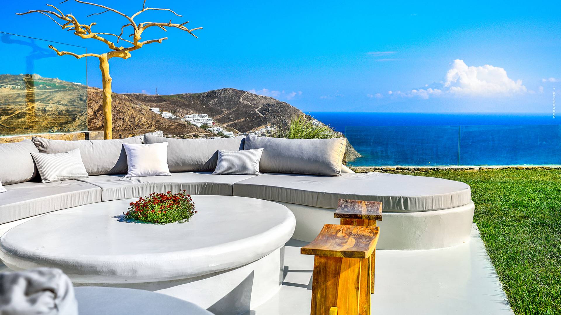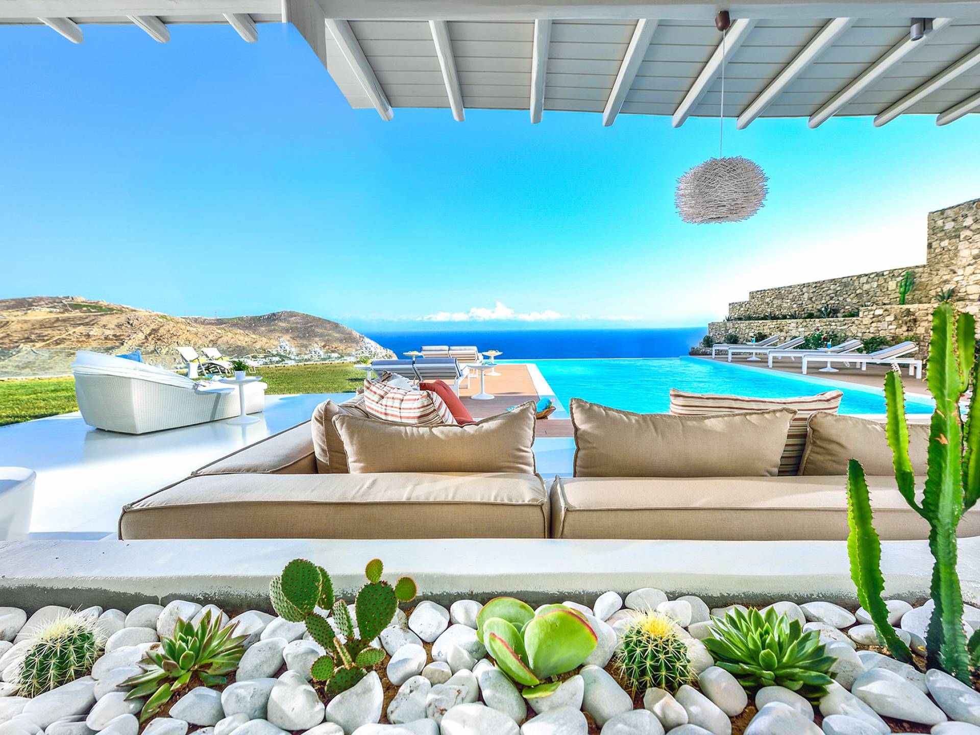 The 2.000 sq. m. plot with flowers, cactuses and other decorative plants give the guests an abundance of spaces to enjoy and offer the opportunity to relax on the exquisite outdoor area with its Infinity Pool (which is surrounded by grass), multiple large lounges and the dining area with a bar and a built-in BBQ. A private parking lot for up to six cars can also be found within the Villa’s grounds while the region of Elia is less than a 20 minutes' drive from Mykonos Town and the island’s airport.