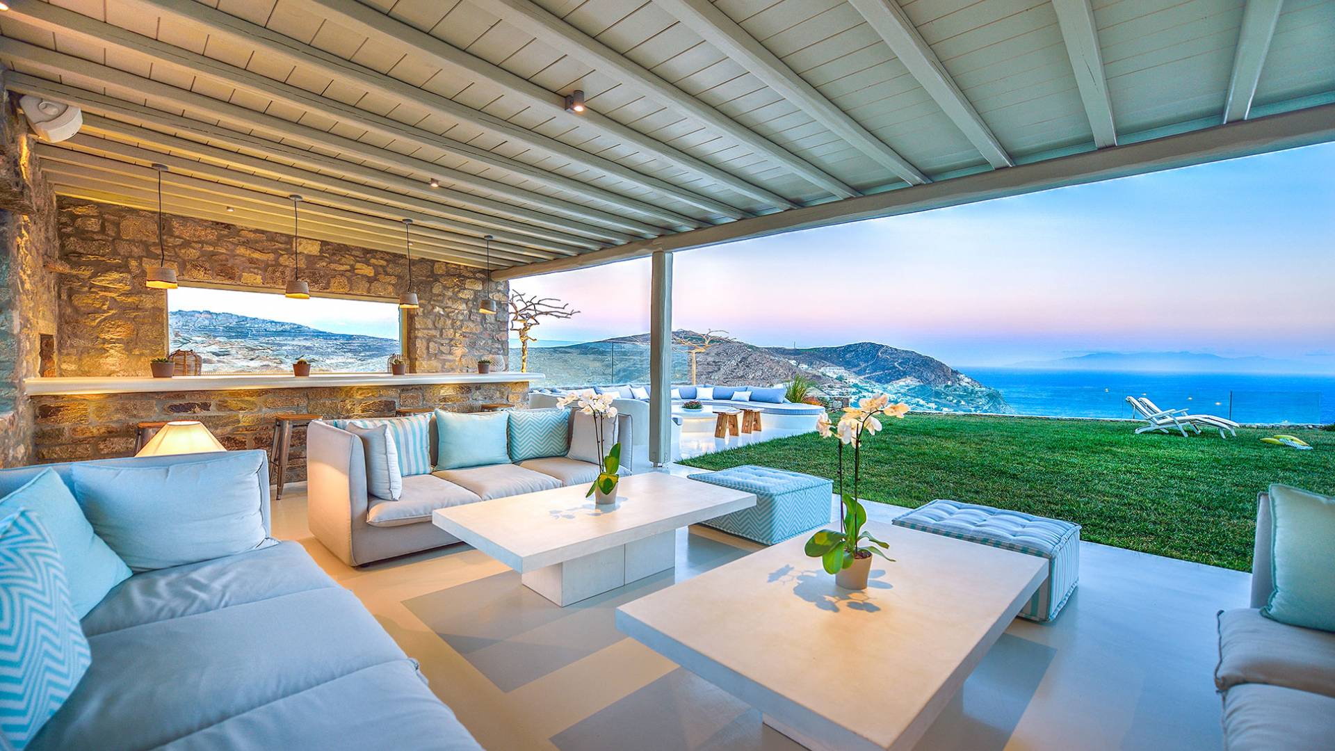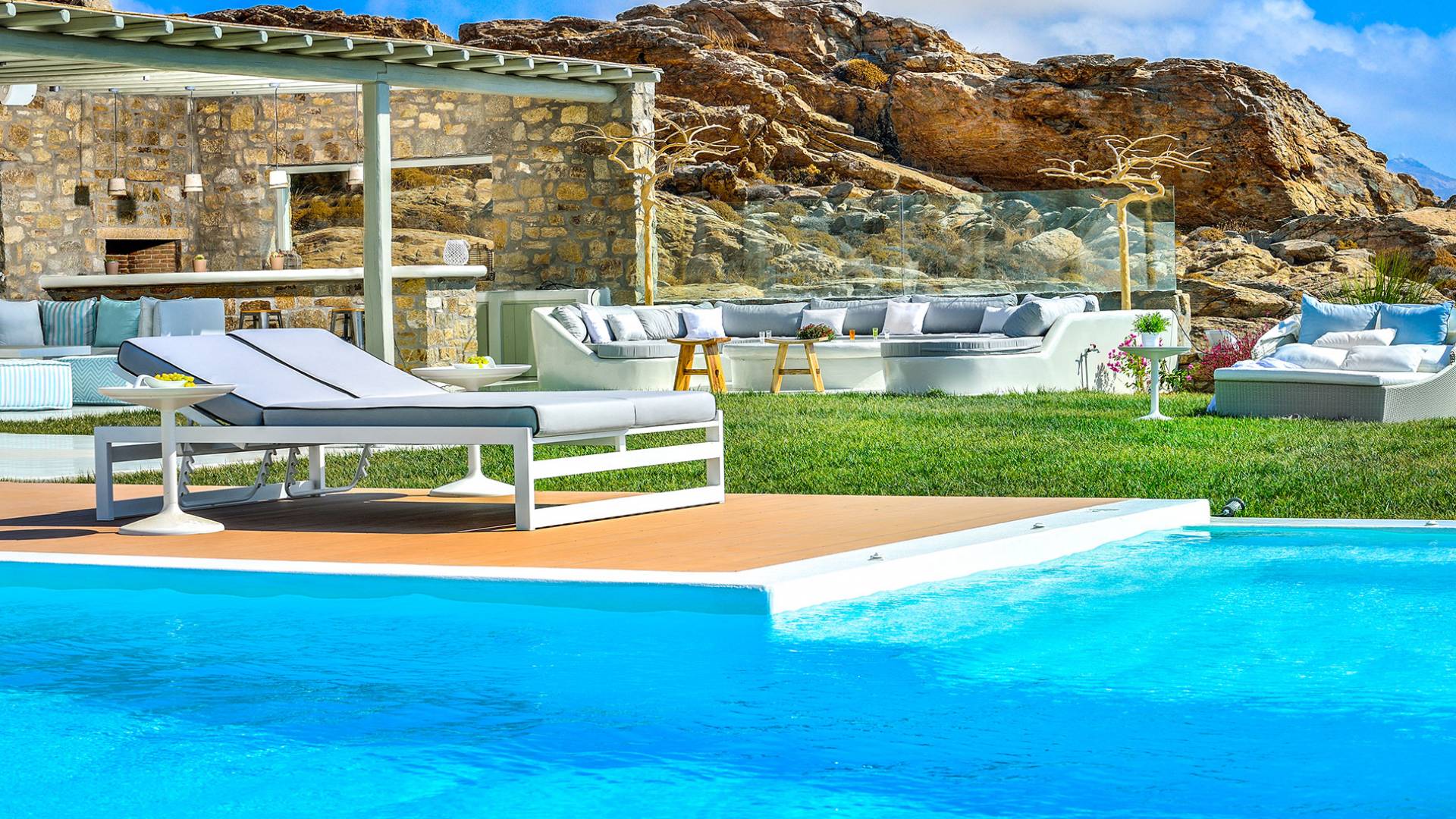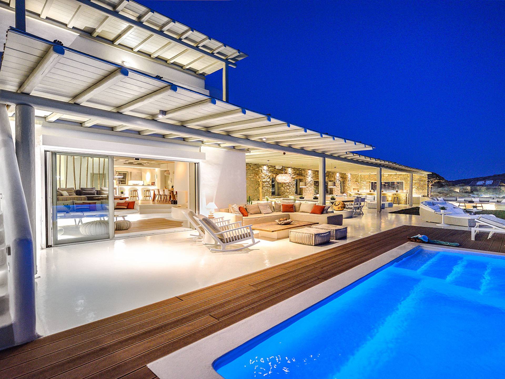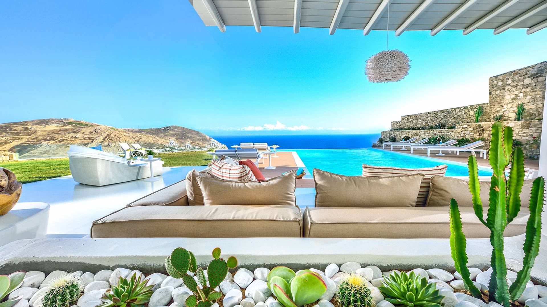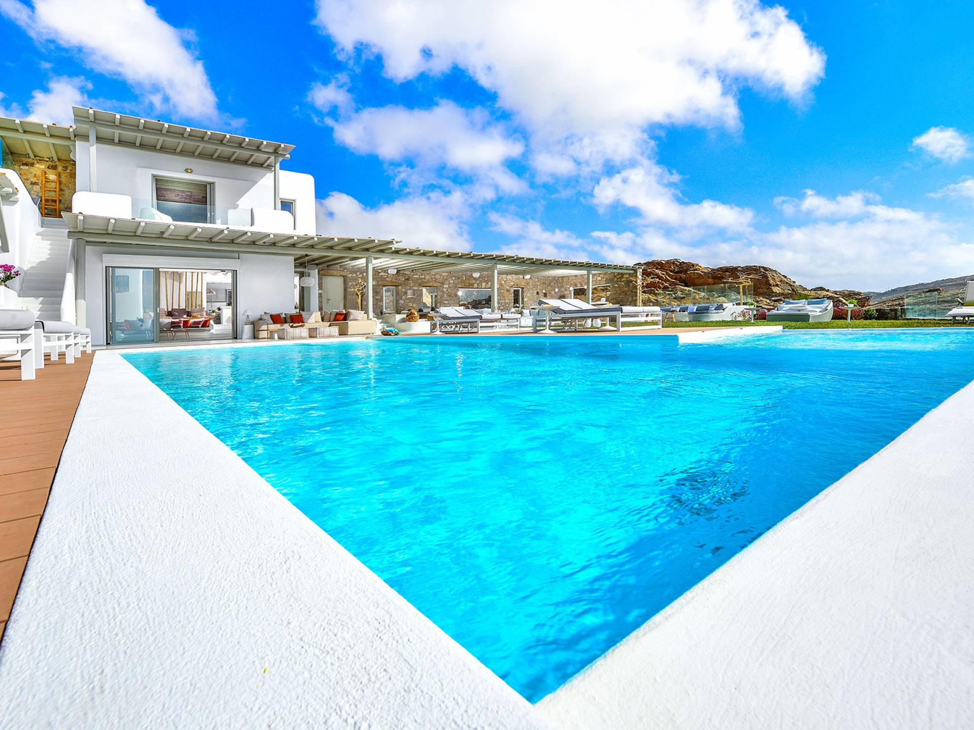 The 2.000 sq. m. plot with flowers, cactuses and other decorative plants give the guests an abundance of spaces to enjoy and offer the opportunity to relax on the exquisite outdoor area with its Infinity Pool (which is surrounded by grass), multiple large lounges and the dining area with a bar and a built-in BBQ. A private parking lot for up to six cars can also be found within the Villa’s grounds while the region of Elia is less than a 20 minutes' drive from Mykonos Town and the island’s airport.