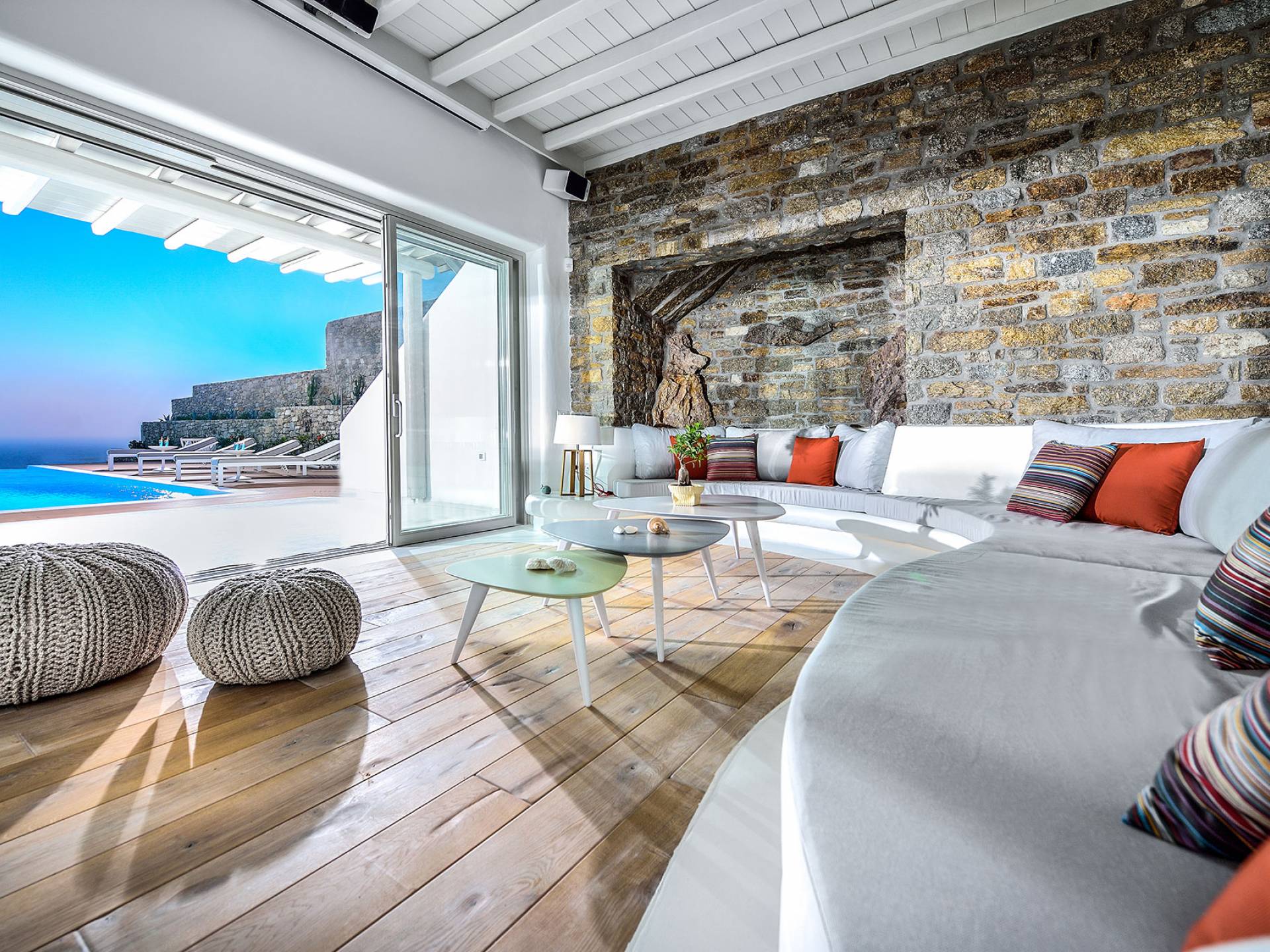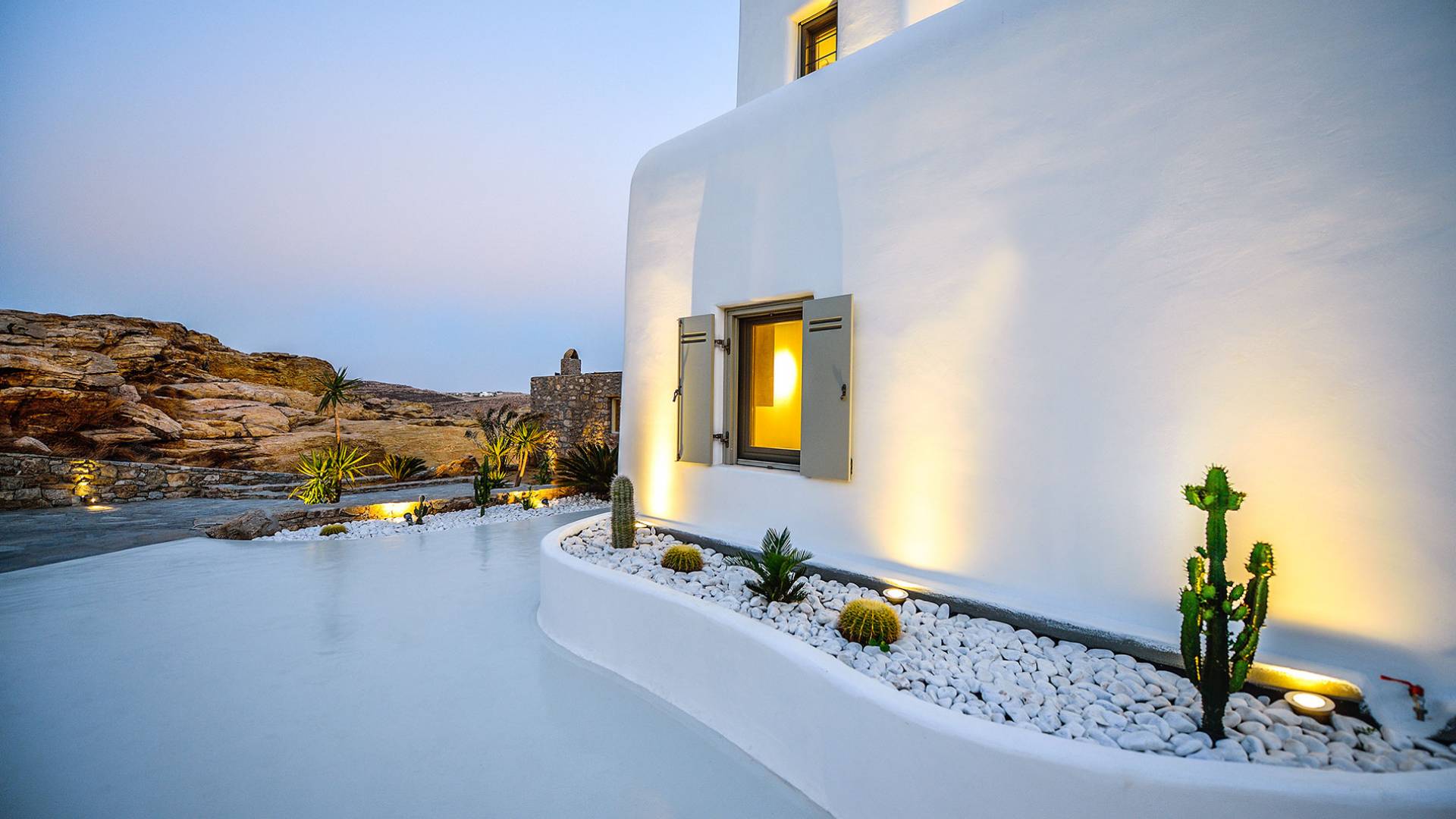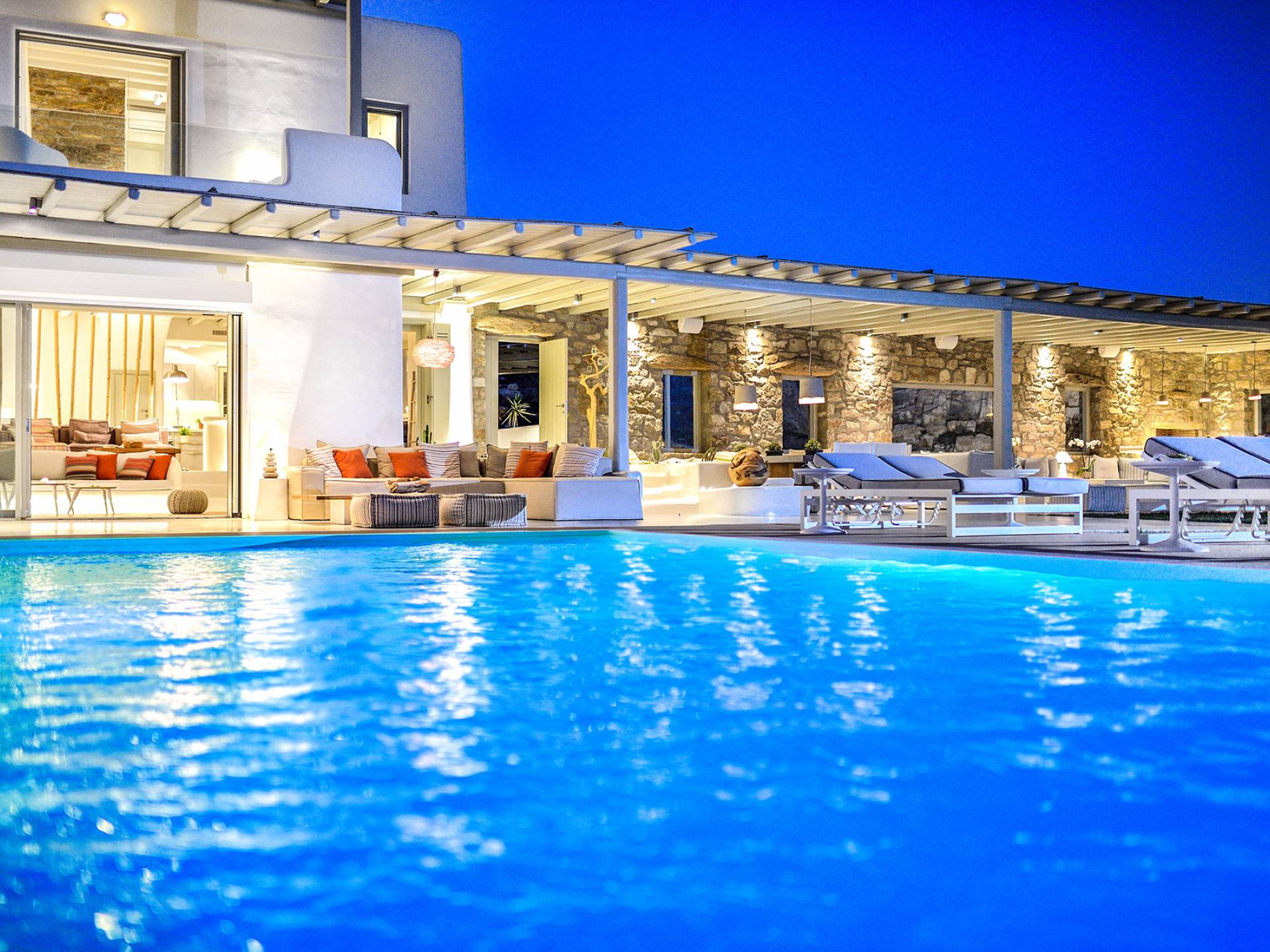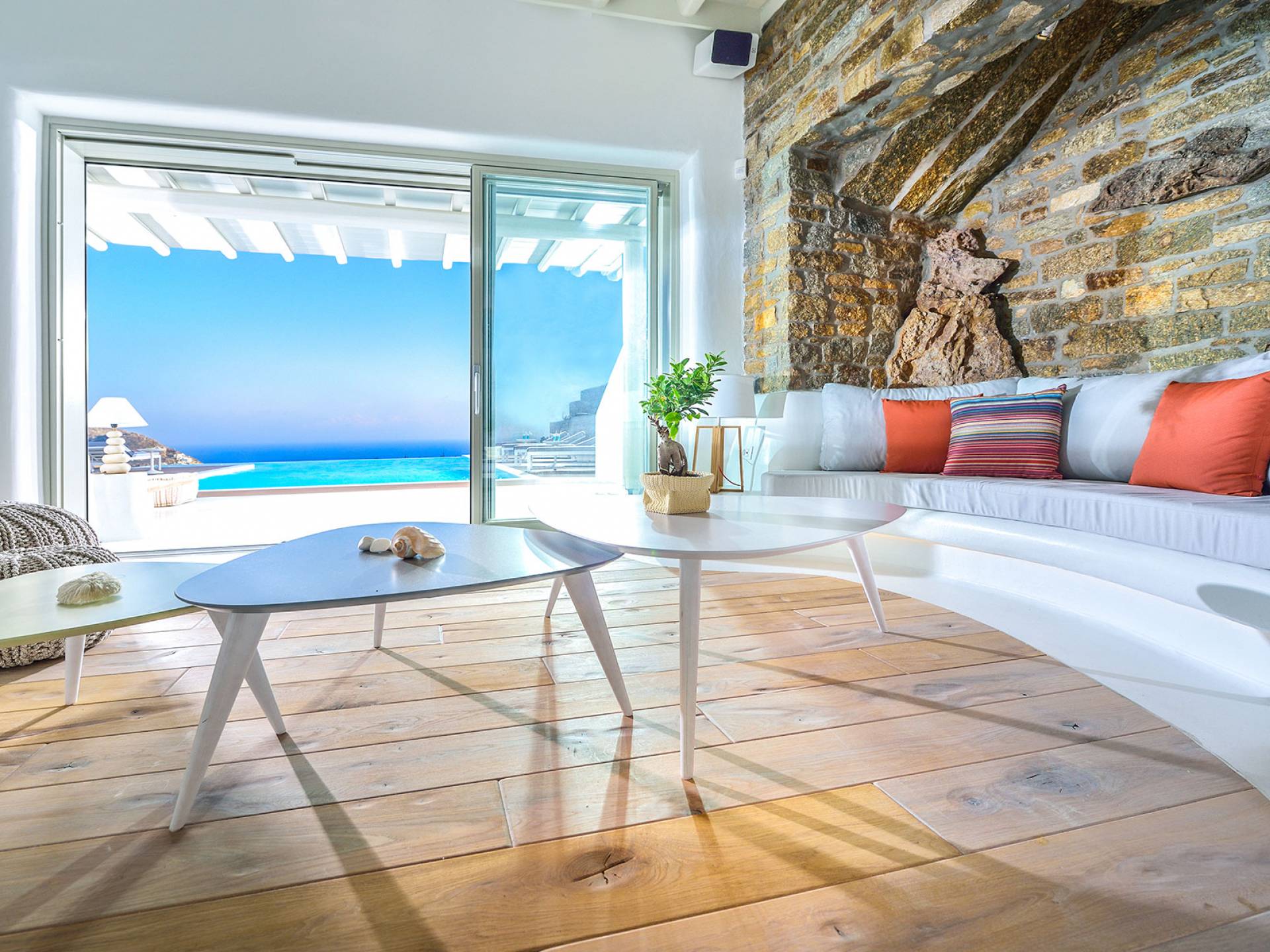The 2.000 sq. m. plot with flowers, cactuses and other decorative plants give the guests an abundance of spaces to enjoy and offer the opportunity to relax on the exquisite outdoor area with its Infinity Pool (which is surrounded by grass), multiple large lounges and the dining area with a bar and a built-in BBQ. A private parking lot for up to six cars can also be found within the Villa’s grounds while the region of Elia is less than a 20 minutes' drive from Mykonos Town and the island’s airport.