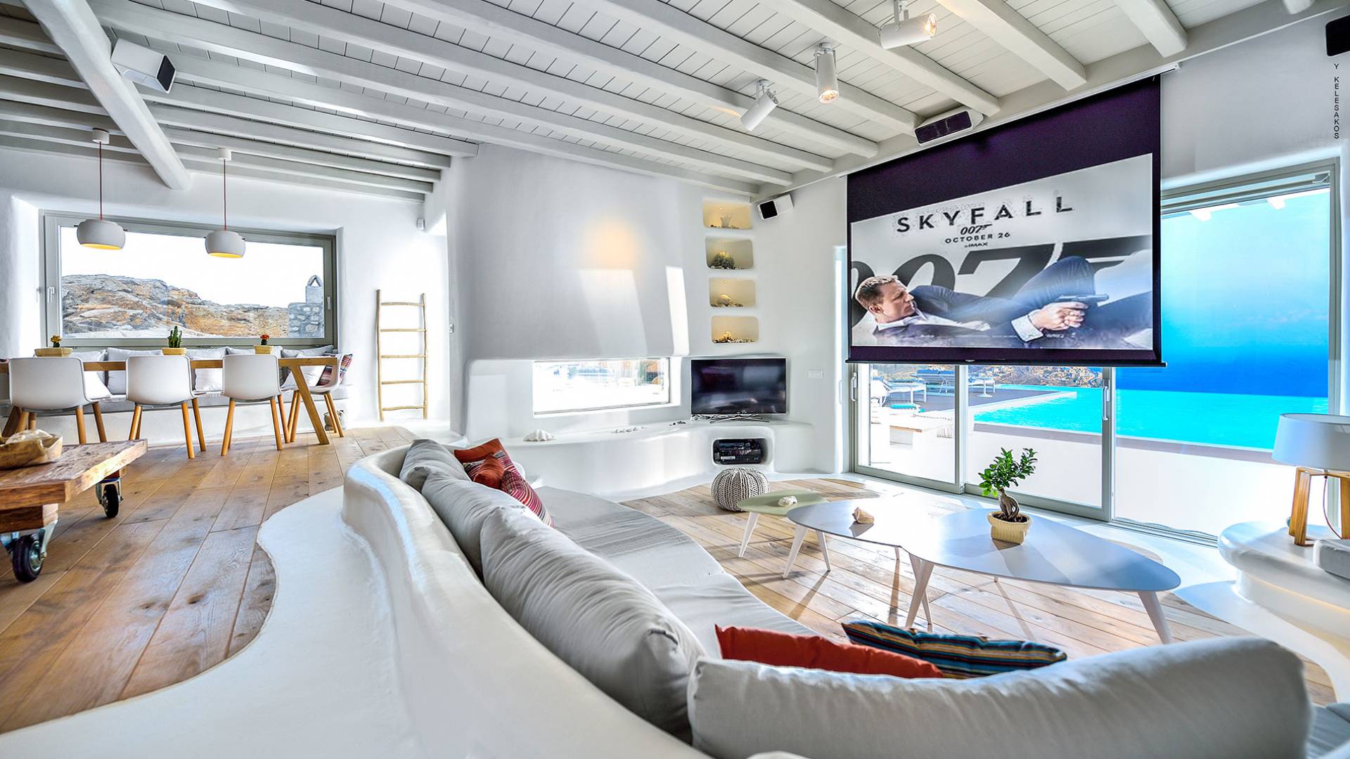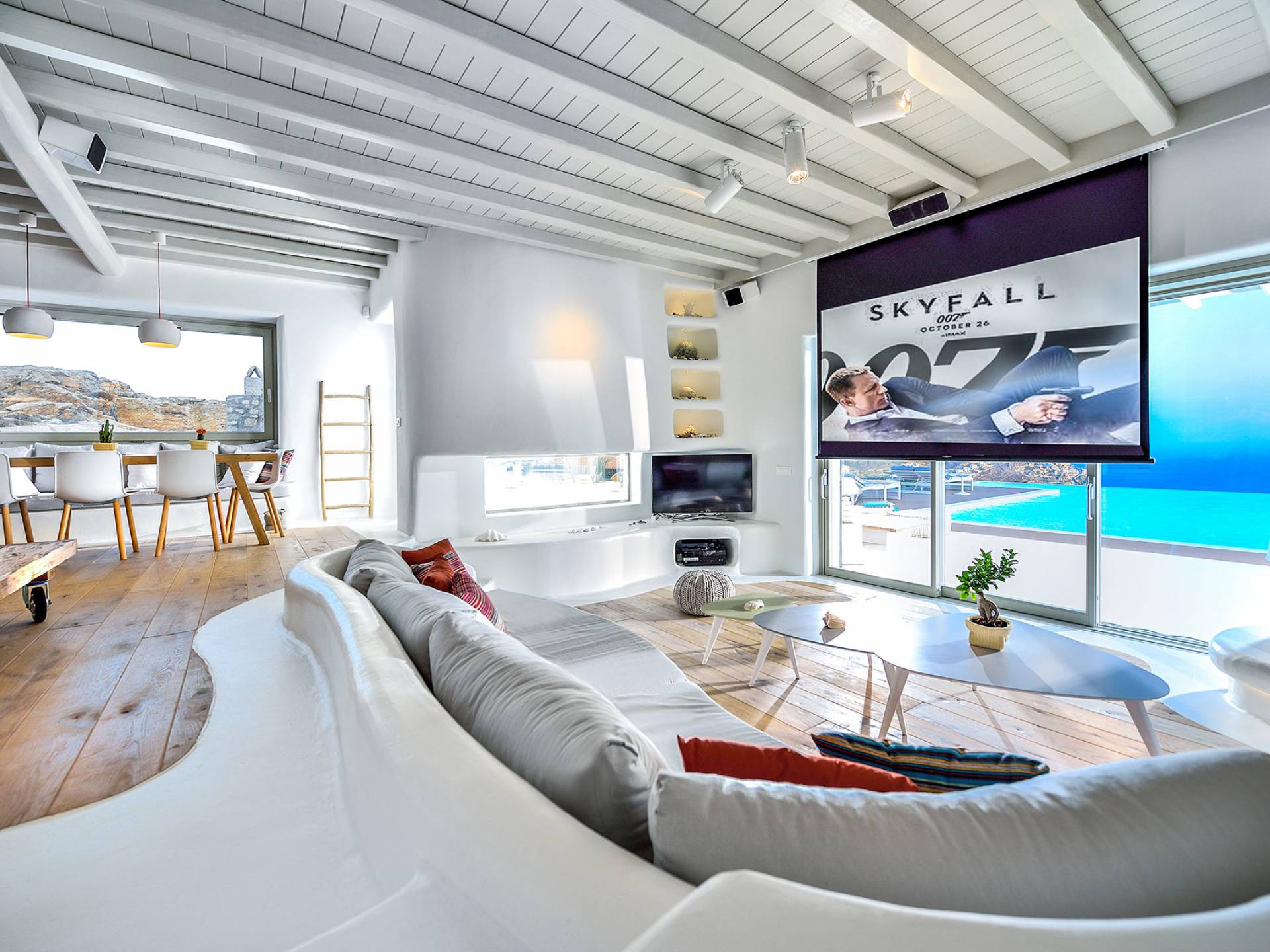 The property is a gorgeous Villa located at a hilltop above Elia beach, with 6 en suite bedrooms, out of which the master suite that is situated on the top level has a private terrace with a Jacuzzi. The lovely interior is fully equipped with the latest technology audio and video systems which include Smart TVs and a fully equipped Home Cinema with a ceiling projector.
