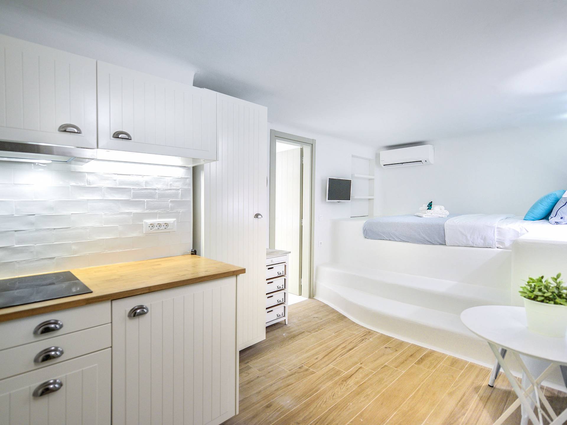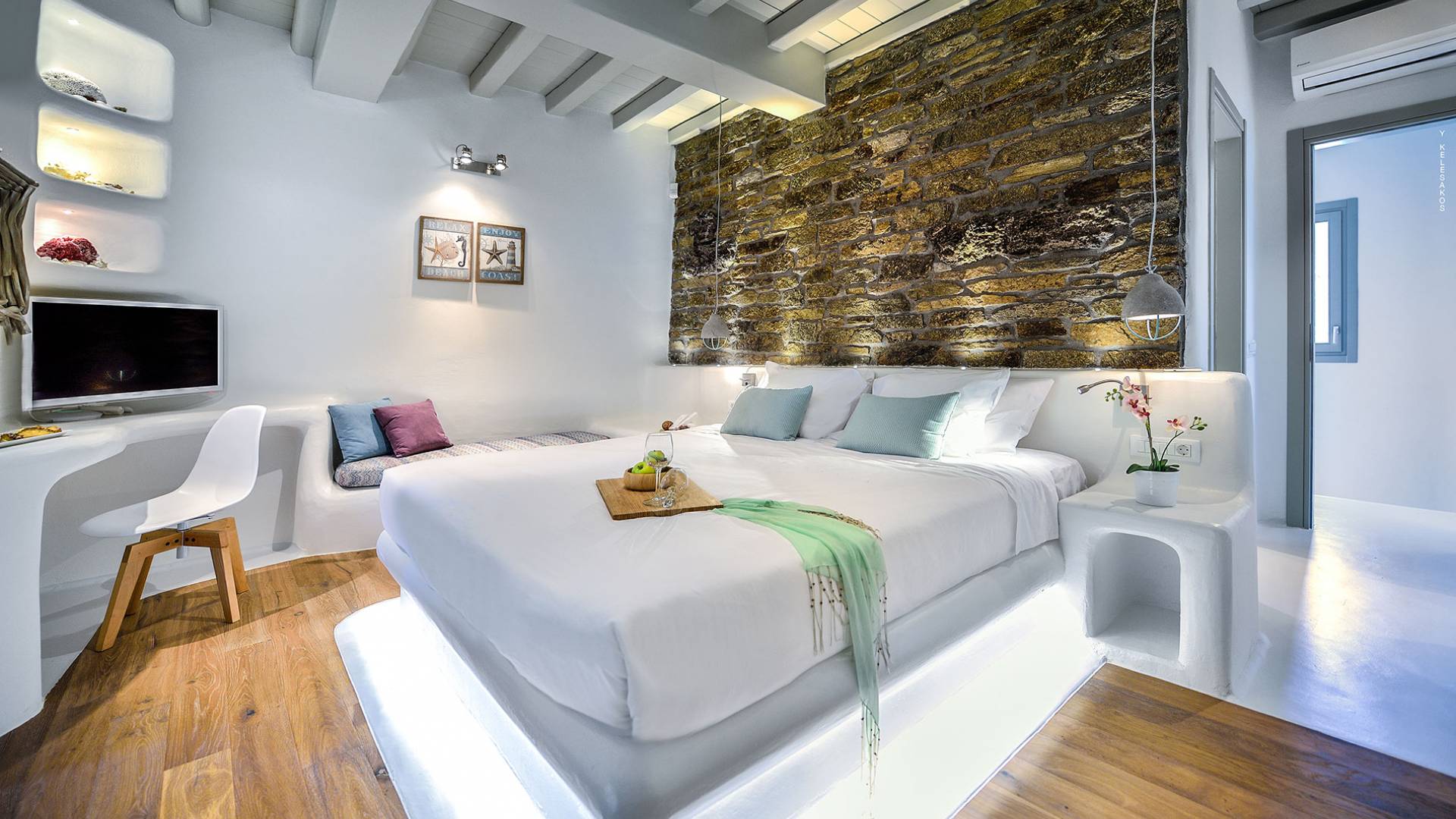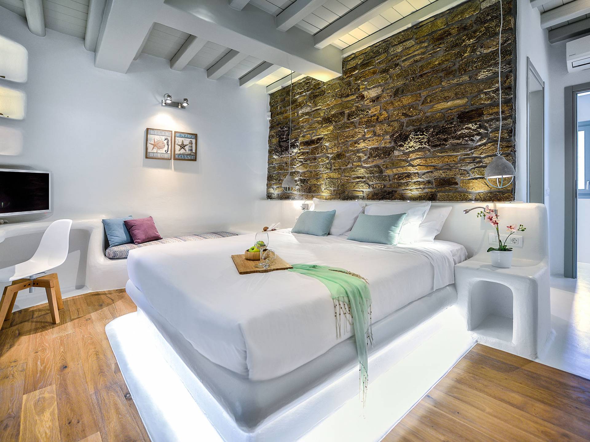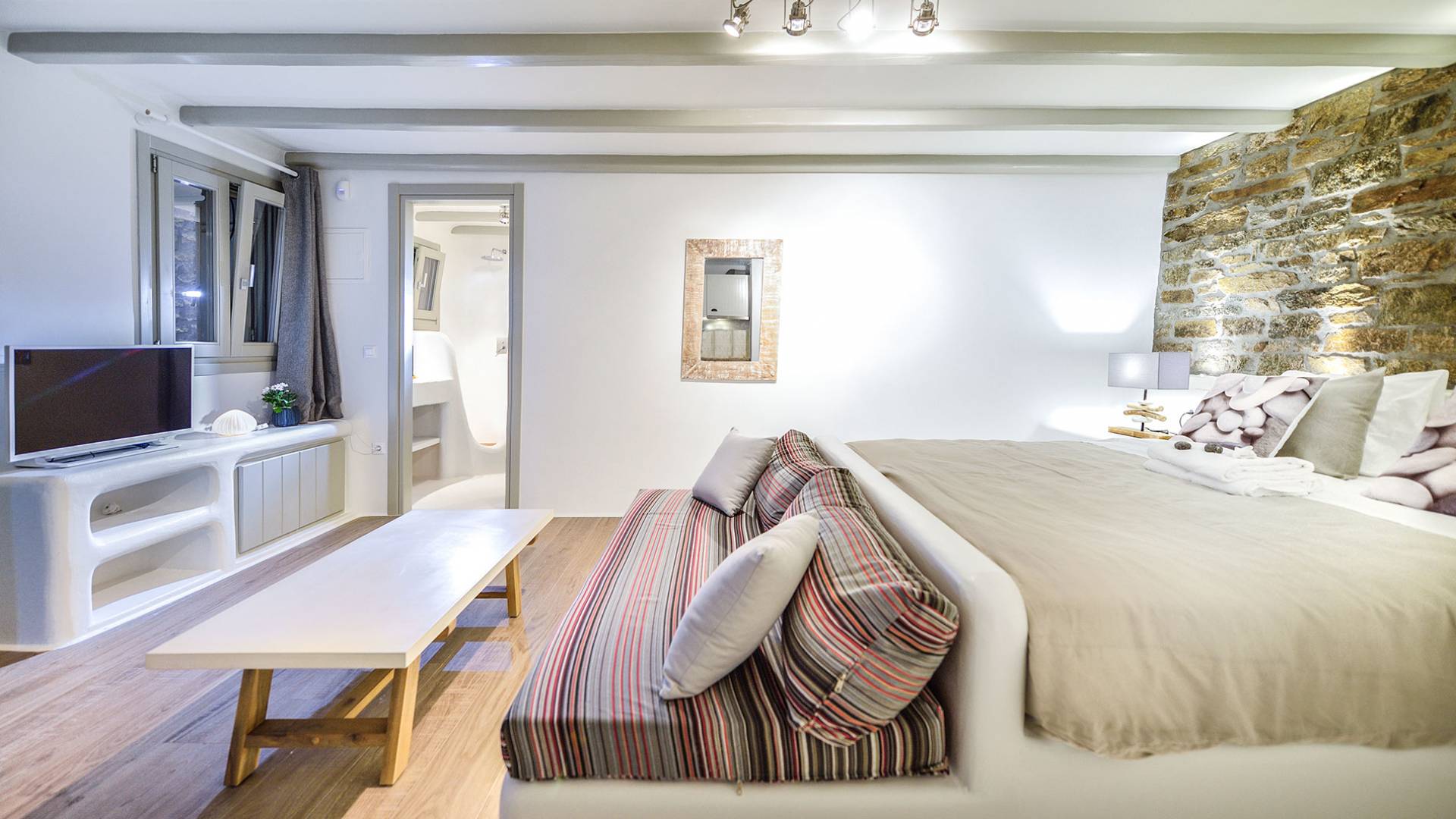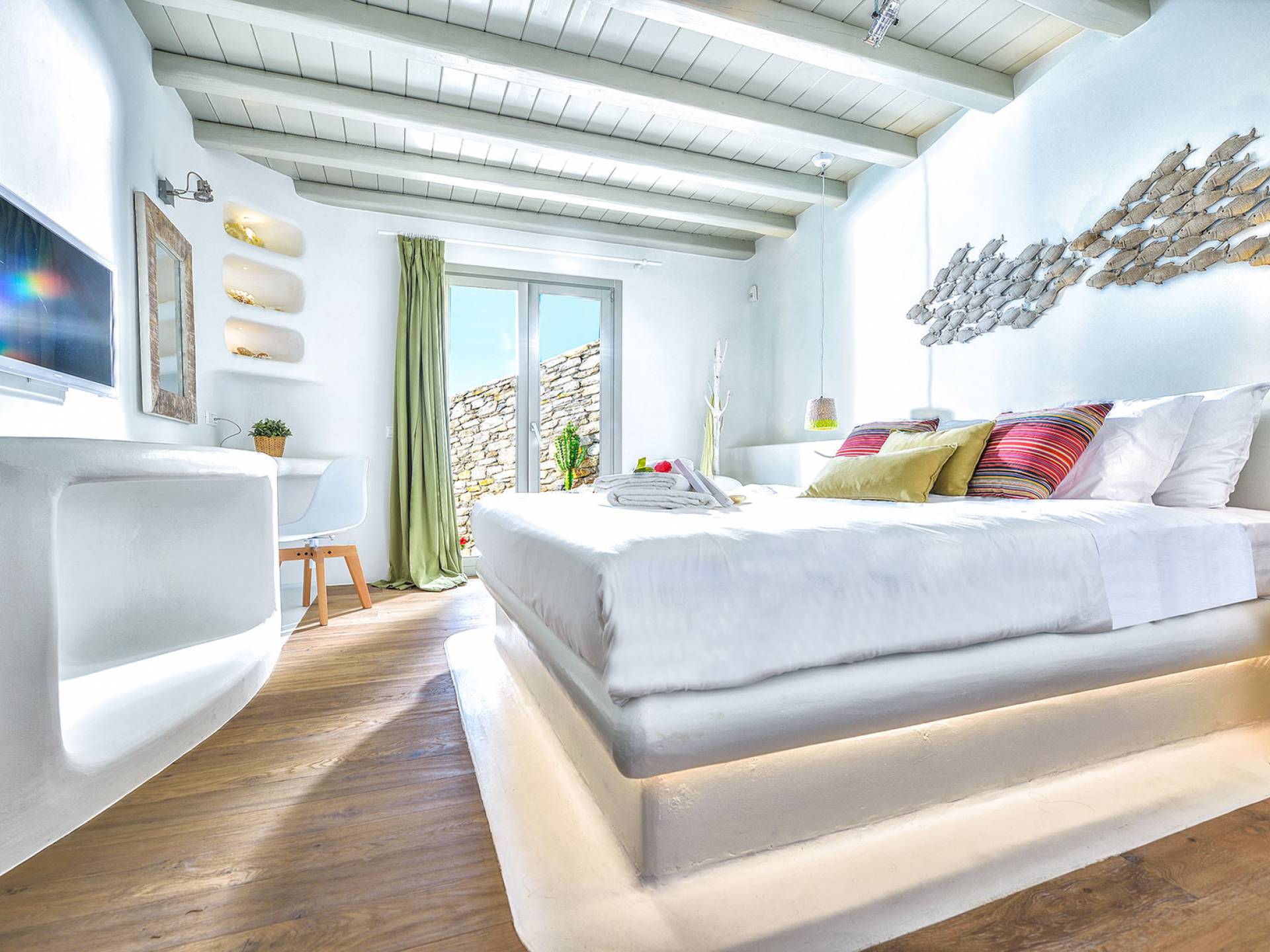 Daedalus is located at a hilltop above Elia beach. One can experience this immense feeling between heaven and earth, gazing at the everlasting view extending over the Aegean.