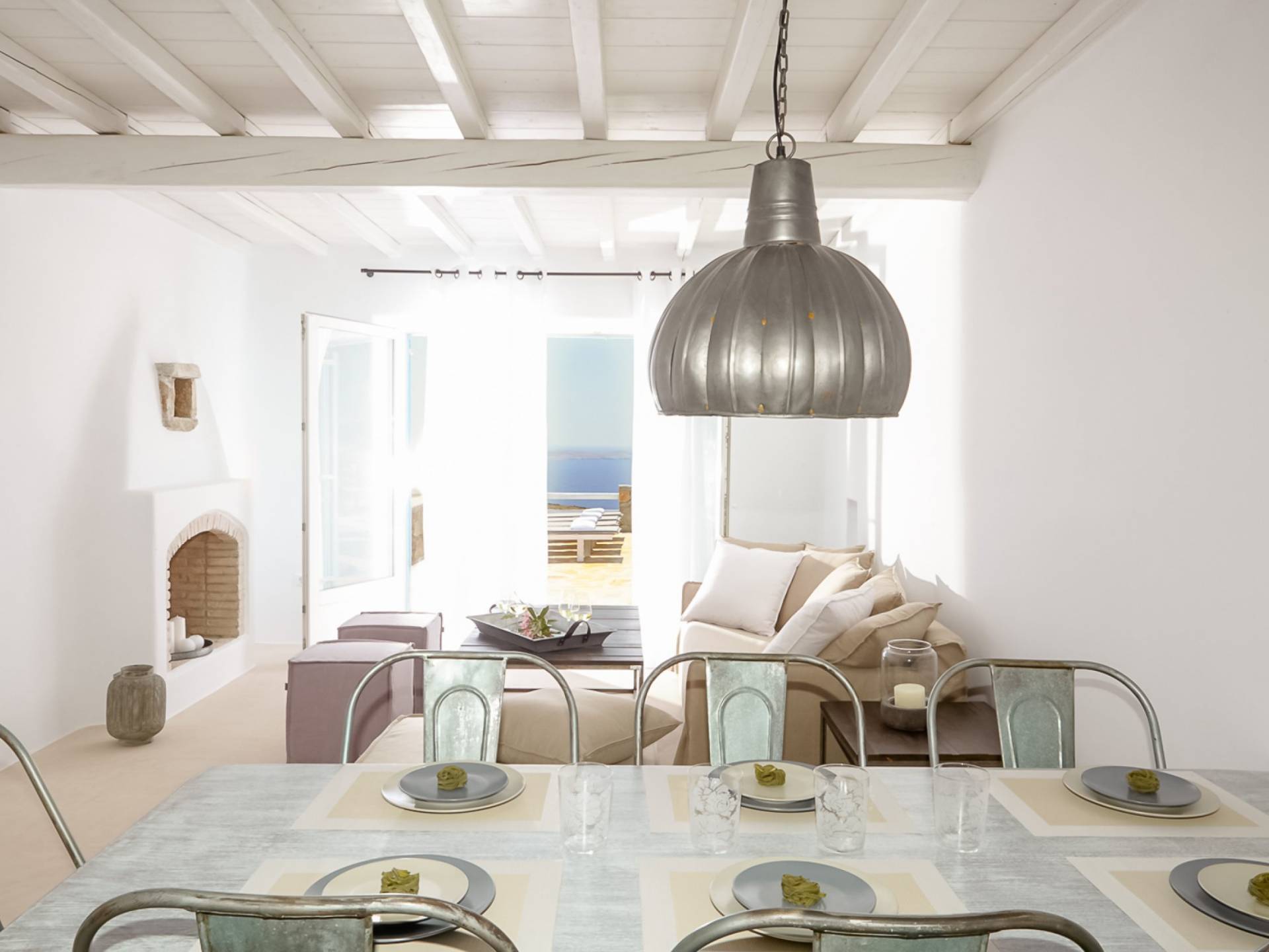Its outdoor area will offer you the chance to enjoy private moments sheltered from indiscrete eyes. The upper level features 2 master bedrooms with double beds and private bathrooms, a spacious living and dining area with a fireplace with an amazing view Crystal Light villa provides the perfect place for your dream vacation in Mykonos island. Seclusion and privacy can really help you enjoy your villa holiday.