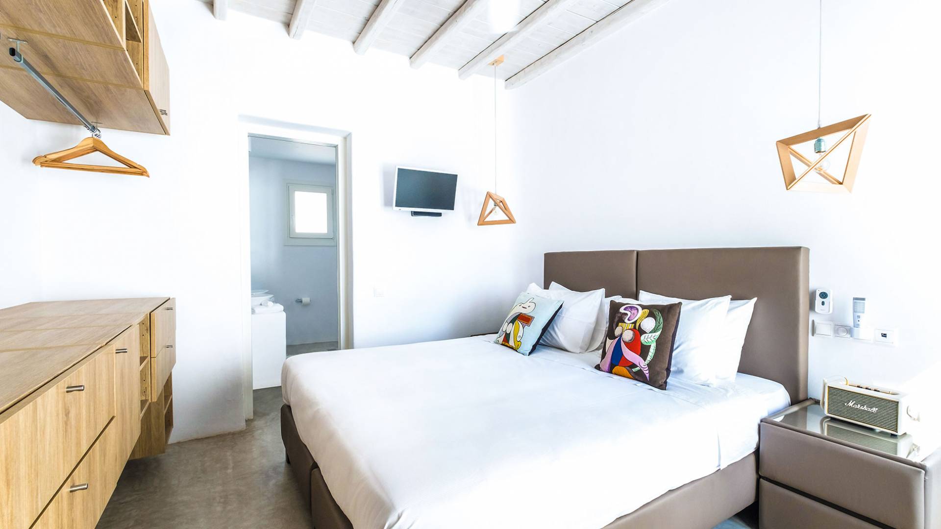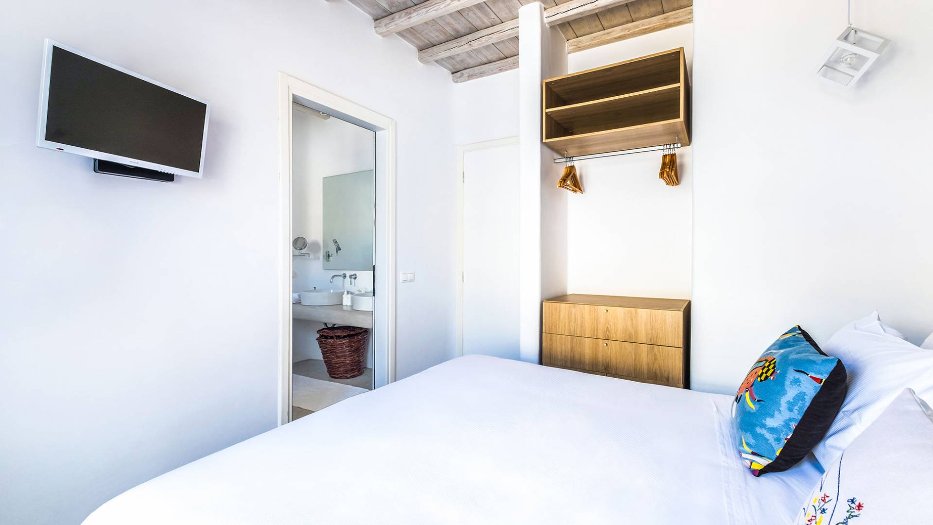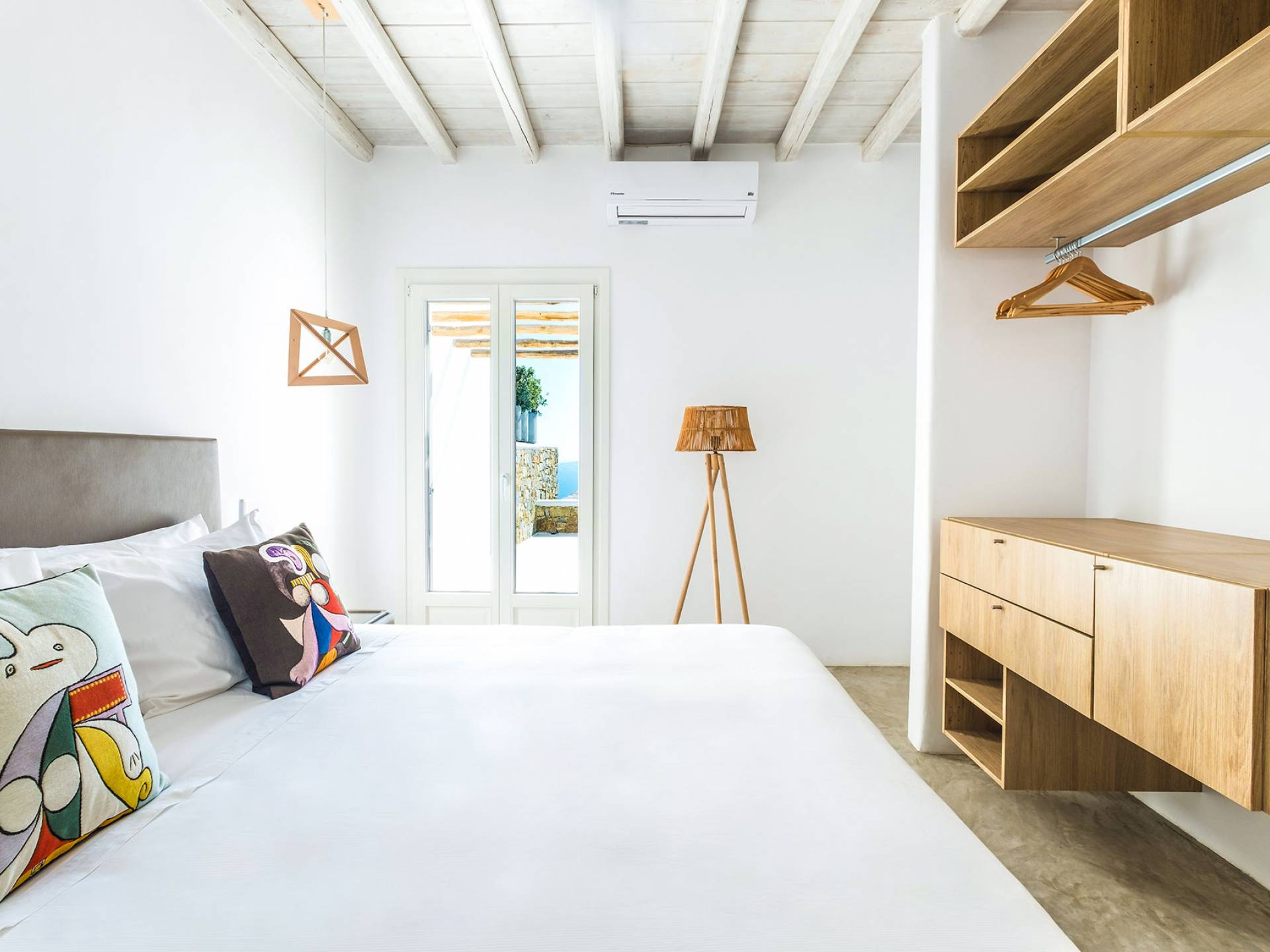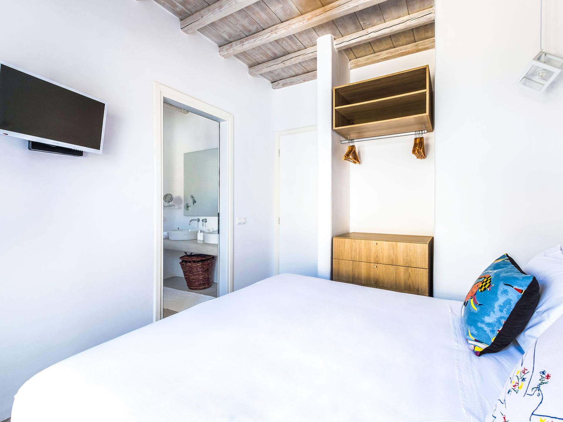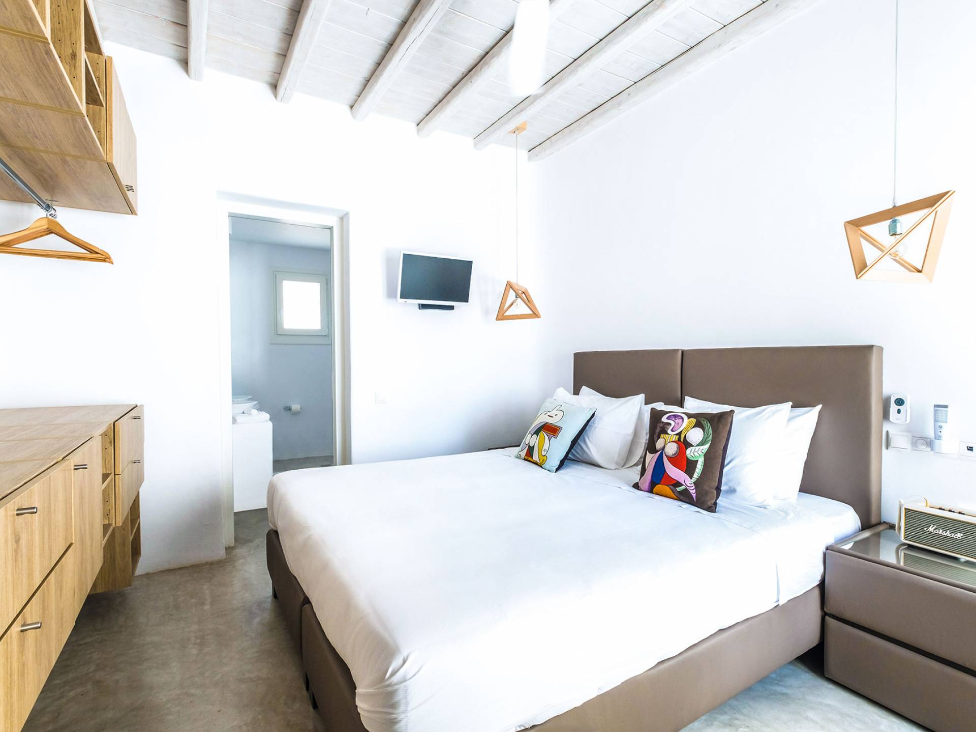 The Left Wing: First floor. Queen size bed. Sea view. TV Satellite. Air conditioning. Fan. Closet with a safe. Private bathroom. Double sink. Mykonian Shower. Quick room access to first-floor sunbeds. Size 19m2. The Back Side: First floor. Queen size bed.TV Satellite. Air conditioning. Closet with a safe. Private bathroom. Double sink. Mykonian shower. Quick room access to hammock room and rooftop stairs. Size 14m2.