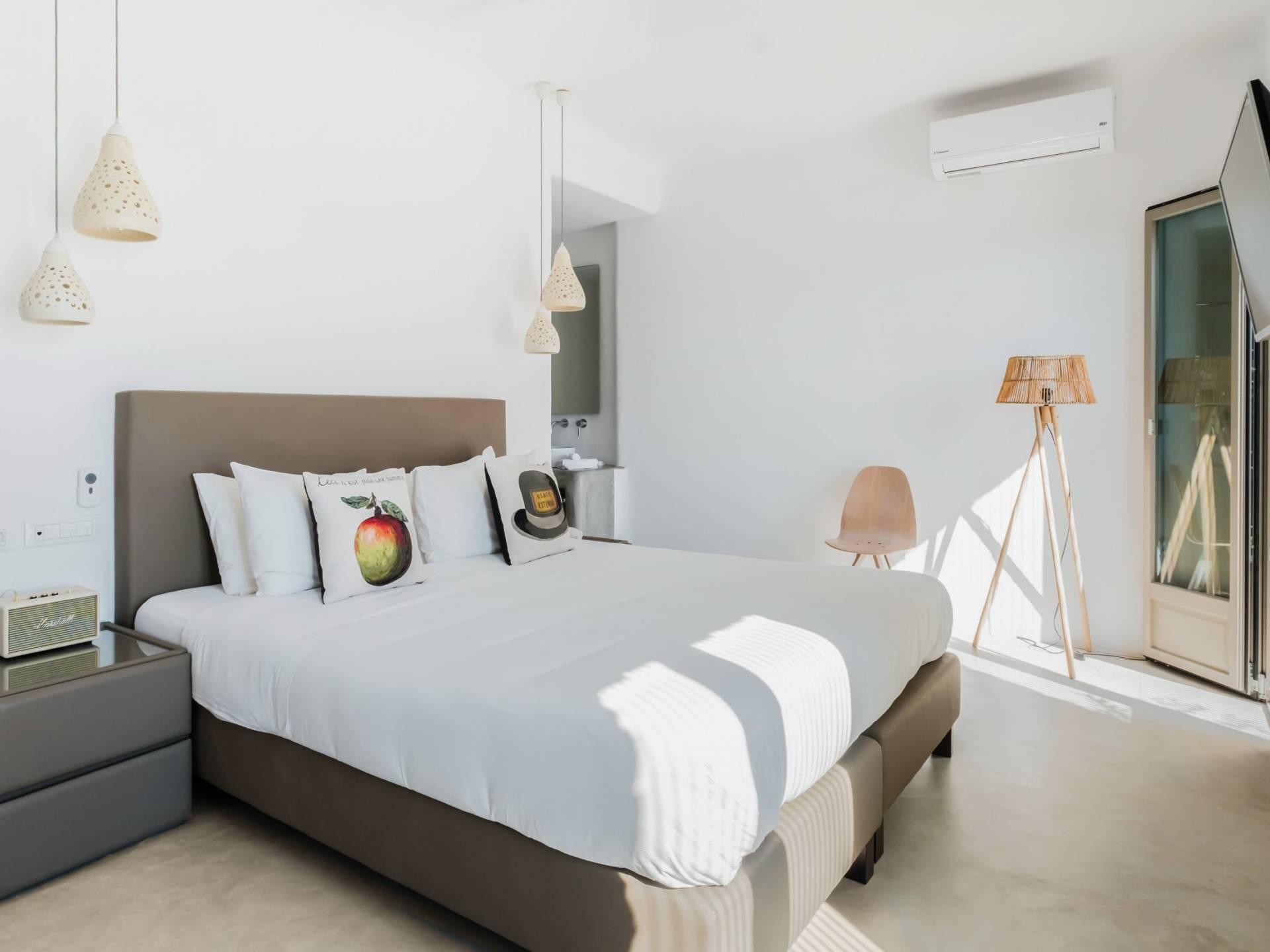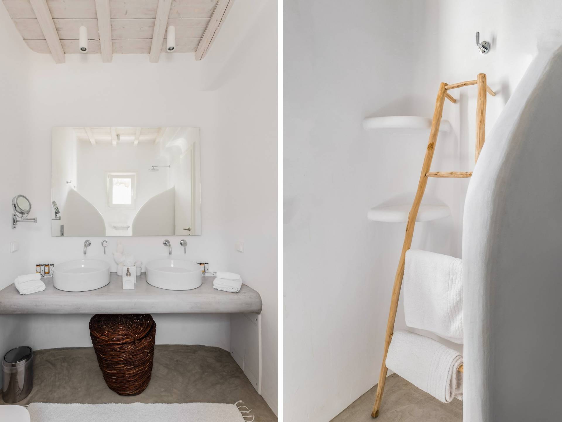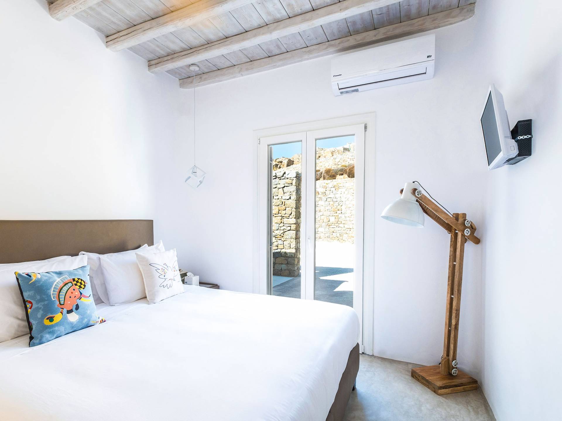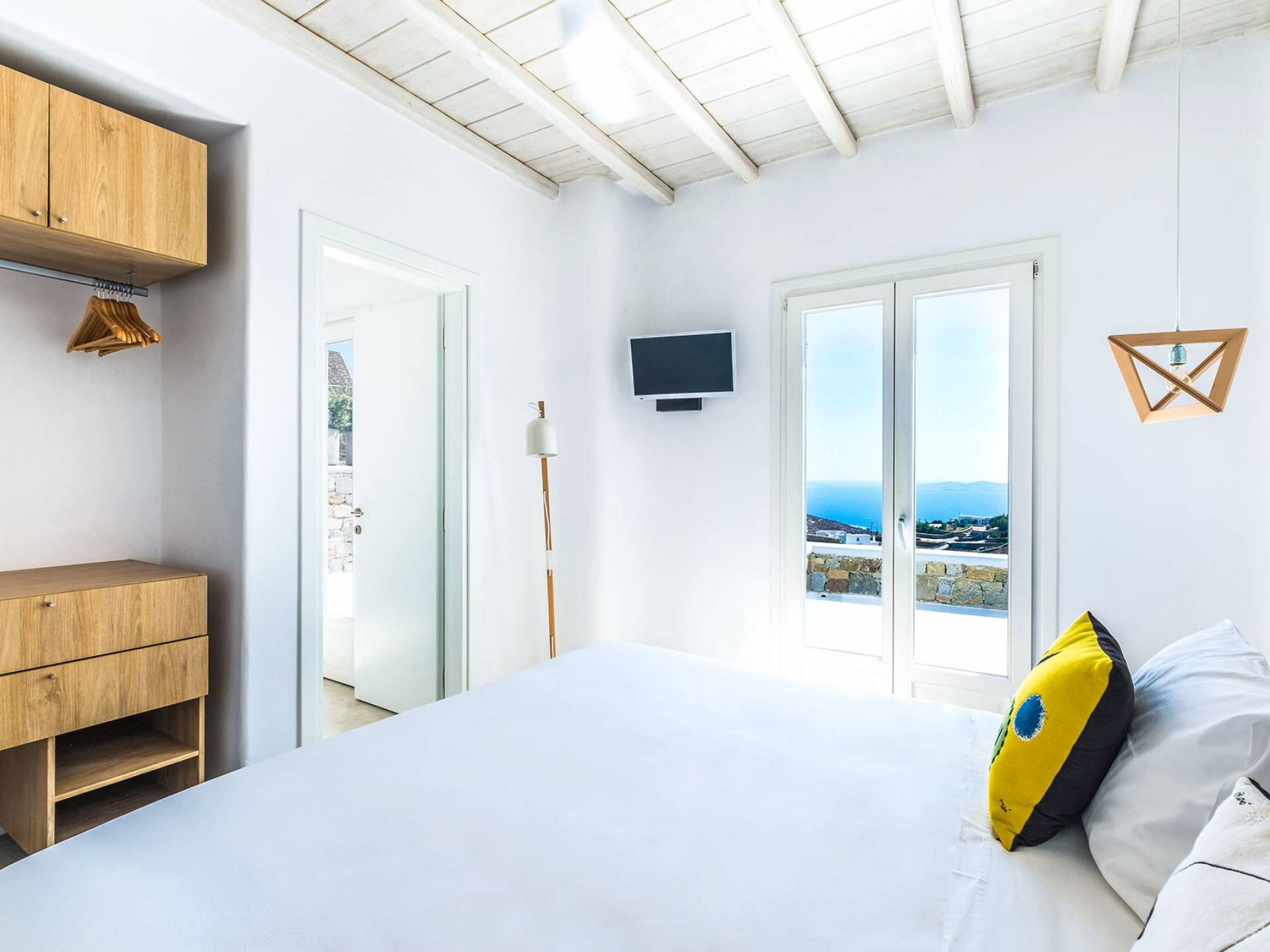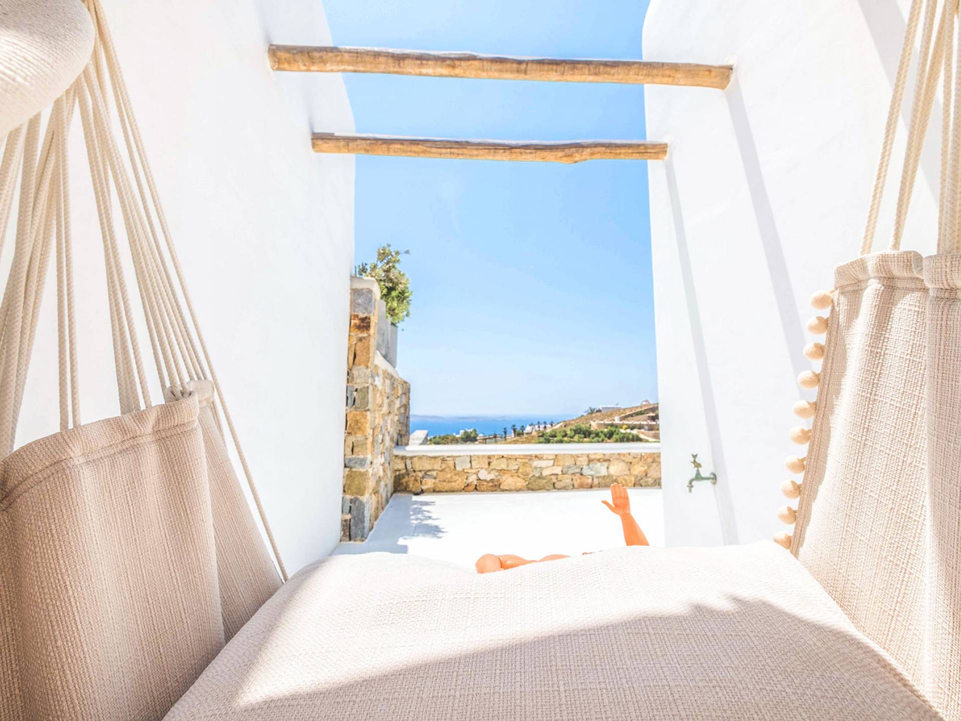 The Left Wing: First floor. Queen size bed. Sea view. TV Satellite. Air conditioning. Fan. Closet with a safe. Private bathroom. Double sink. Mykonian Shower. Quick room access to first-floor sunbeds. Size 19m2. The Back Side: First floor. Queen size bed.TV Satellite. Air conditioning. Closet with a safe. Private bathroom. Double sink. Mykonian shower. Quick room access to hammock room and rooftop stairs. Size 14m2.
