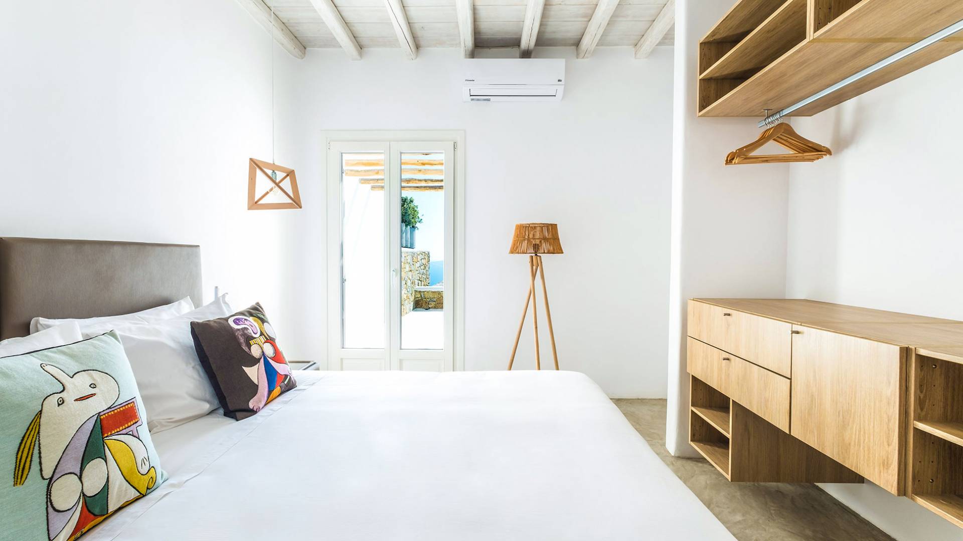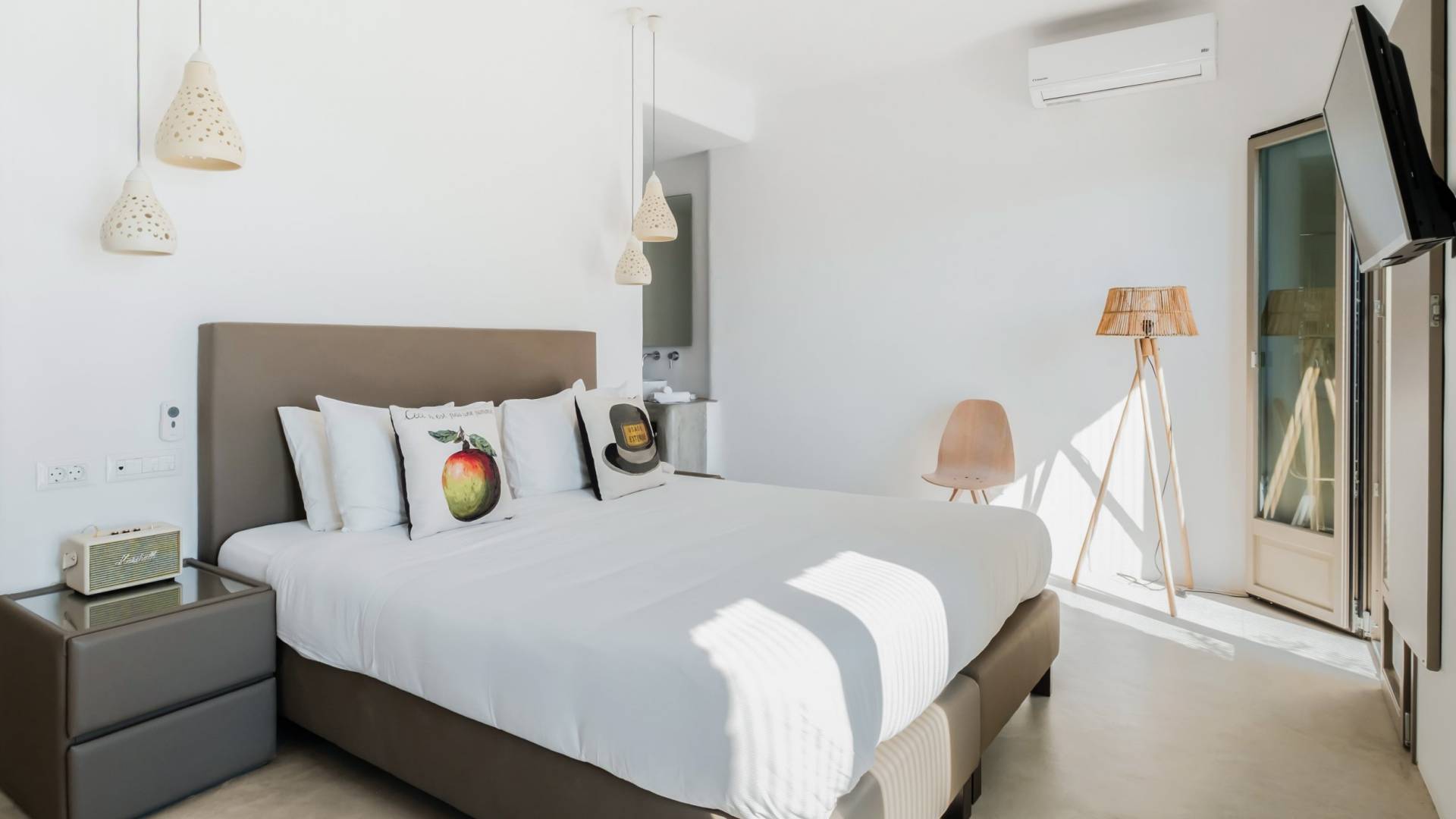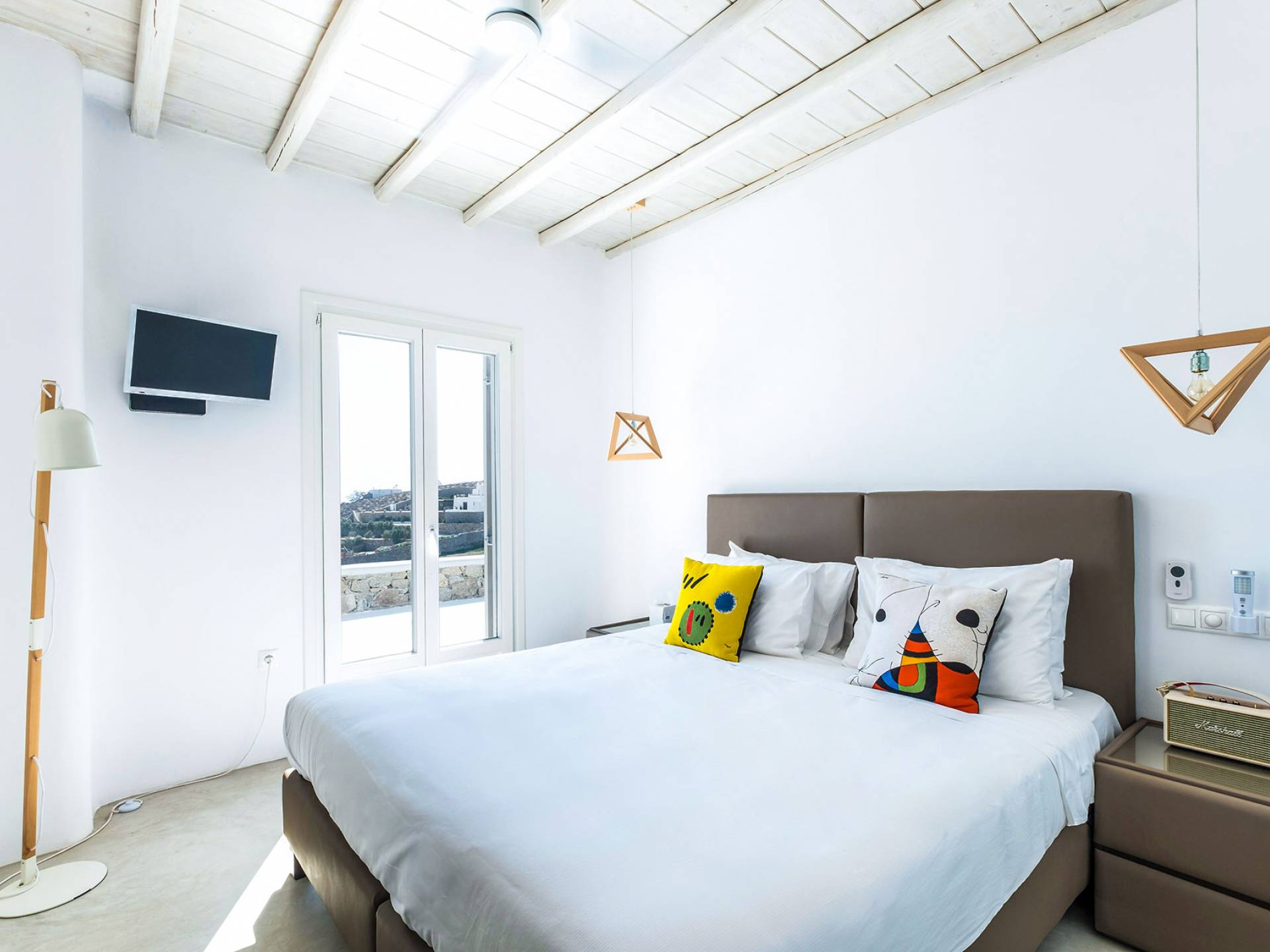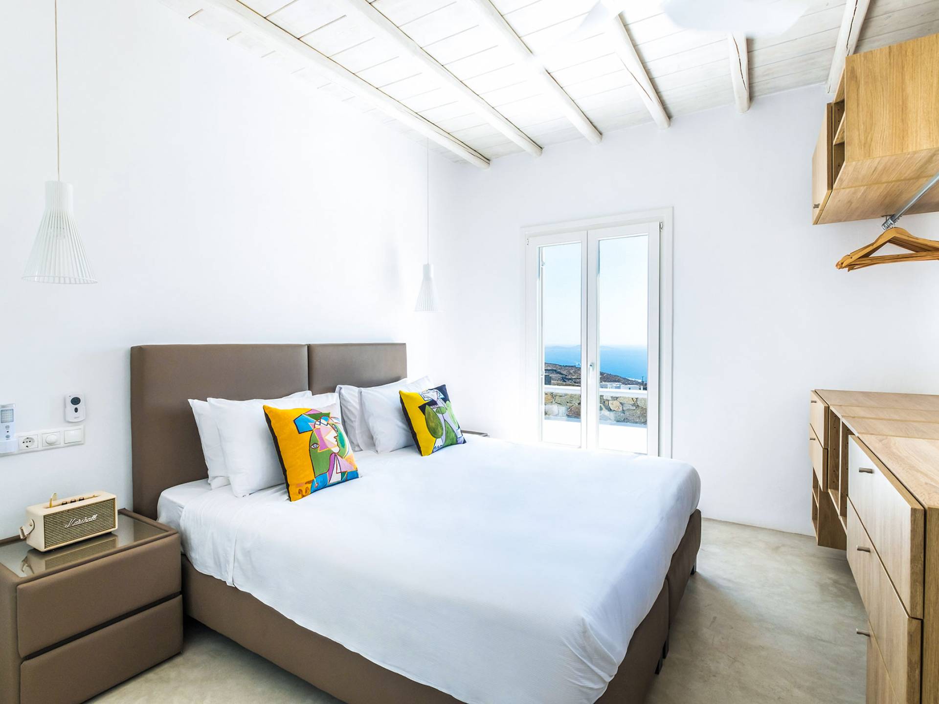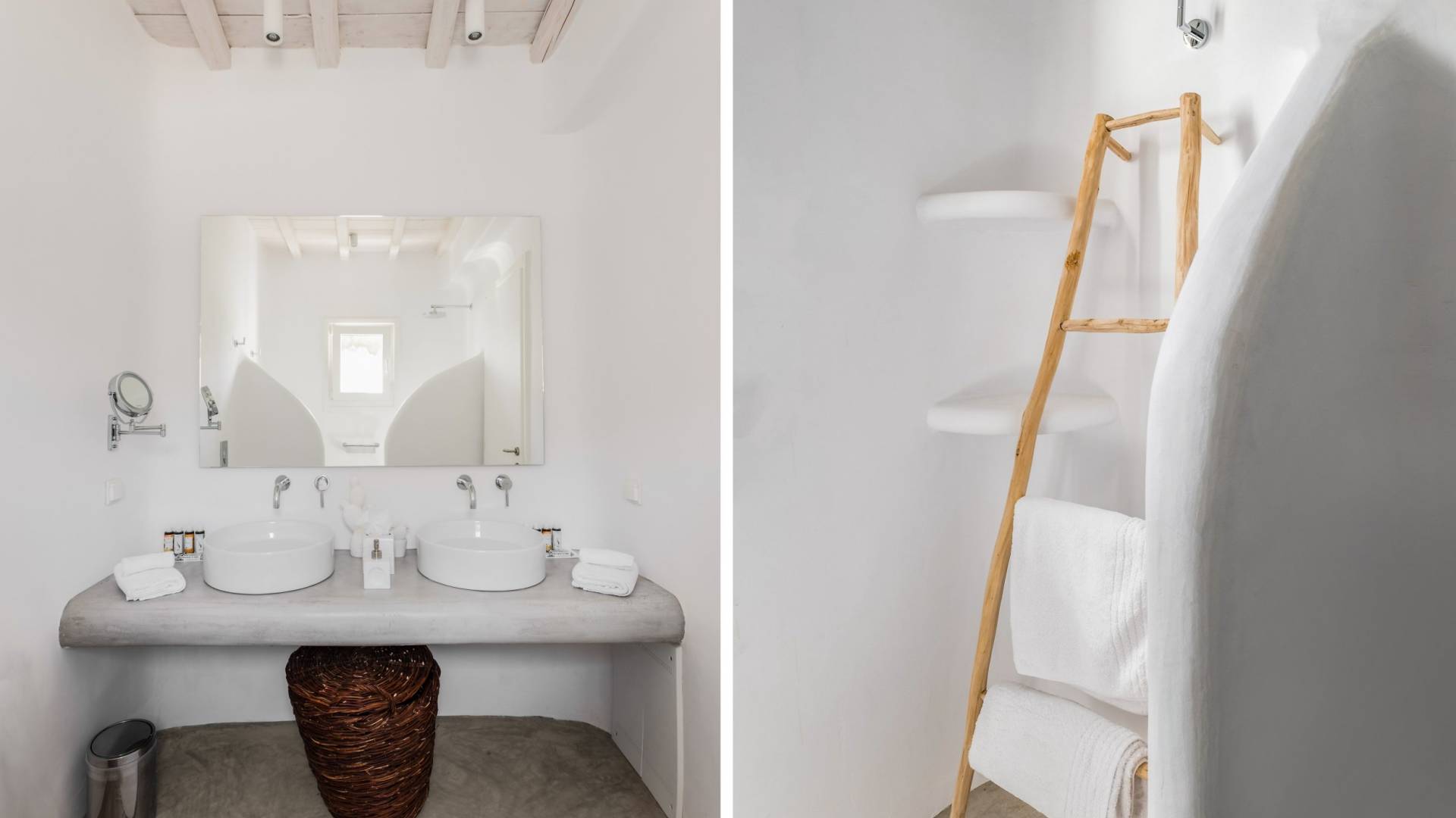 The Left Wing: First floor. Queen size bed. Sea view. TV Satellite. Air conditioning. Fan. Closet with a safe. Private bathroom. Double sink. Mykonian Shower. Quick room access to first-floor sunbeds. Size 19m2. The Back Side: First floor. Queen size bed.TV Satellite. Air conditioning. Closet with a safe. Private bathroom. Double sink. Mykonian shower. Quick room access to hammock room and rooftop stairs. Size 14m2.