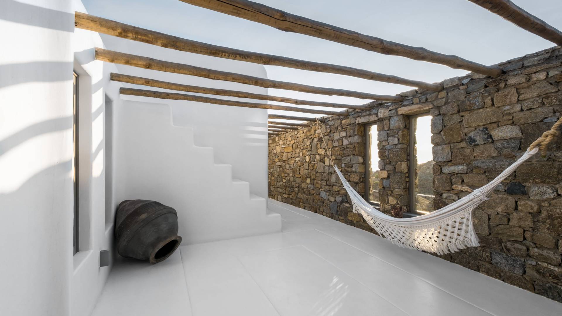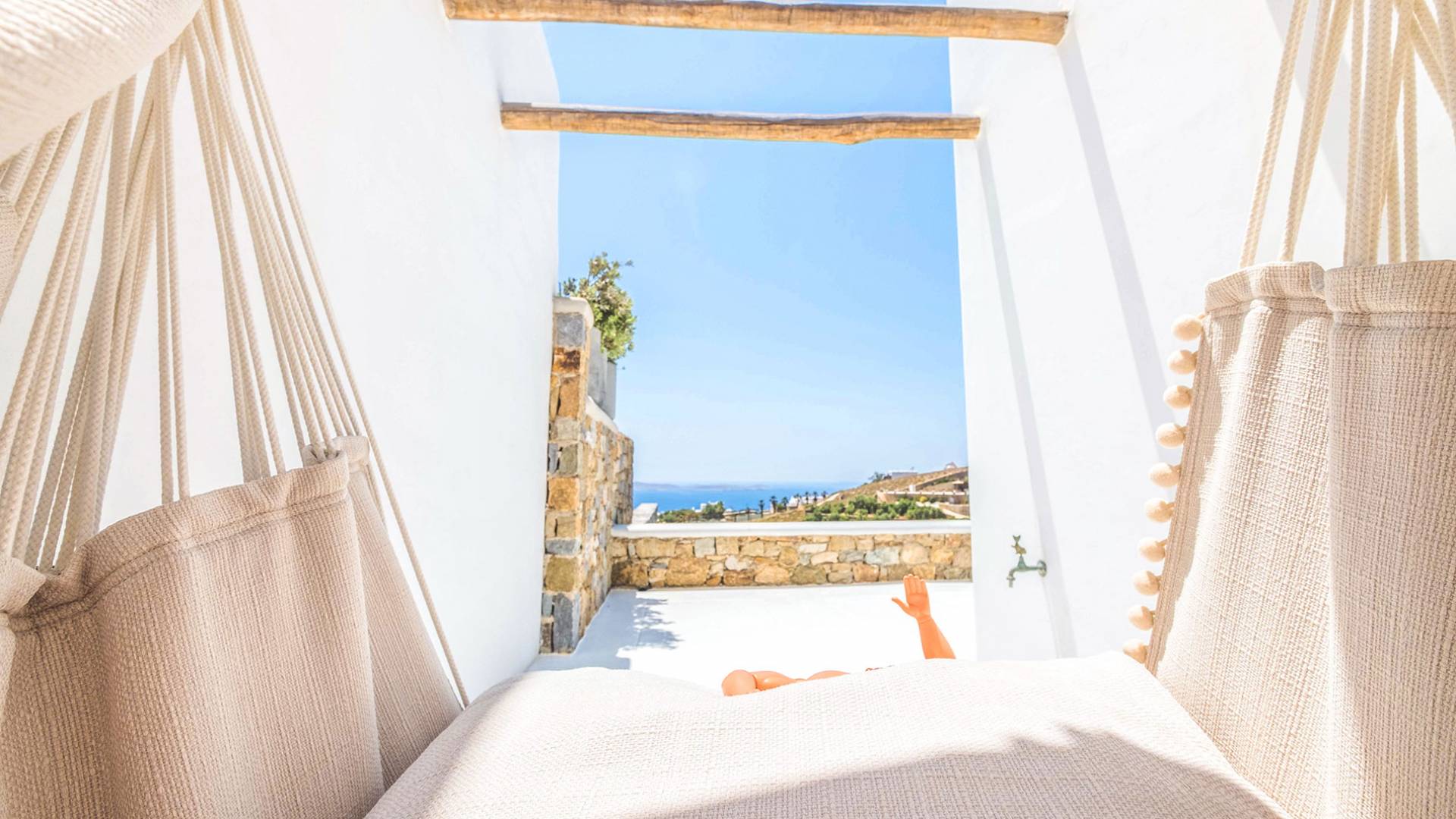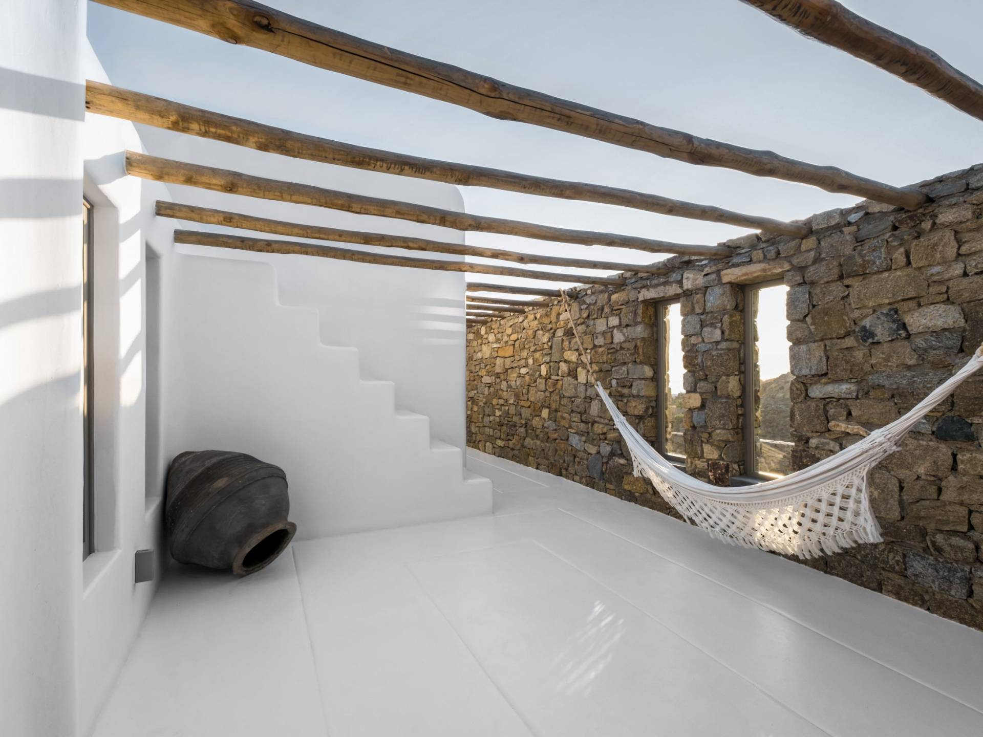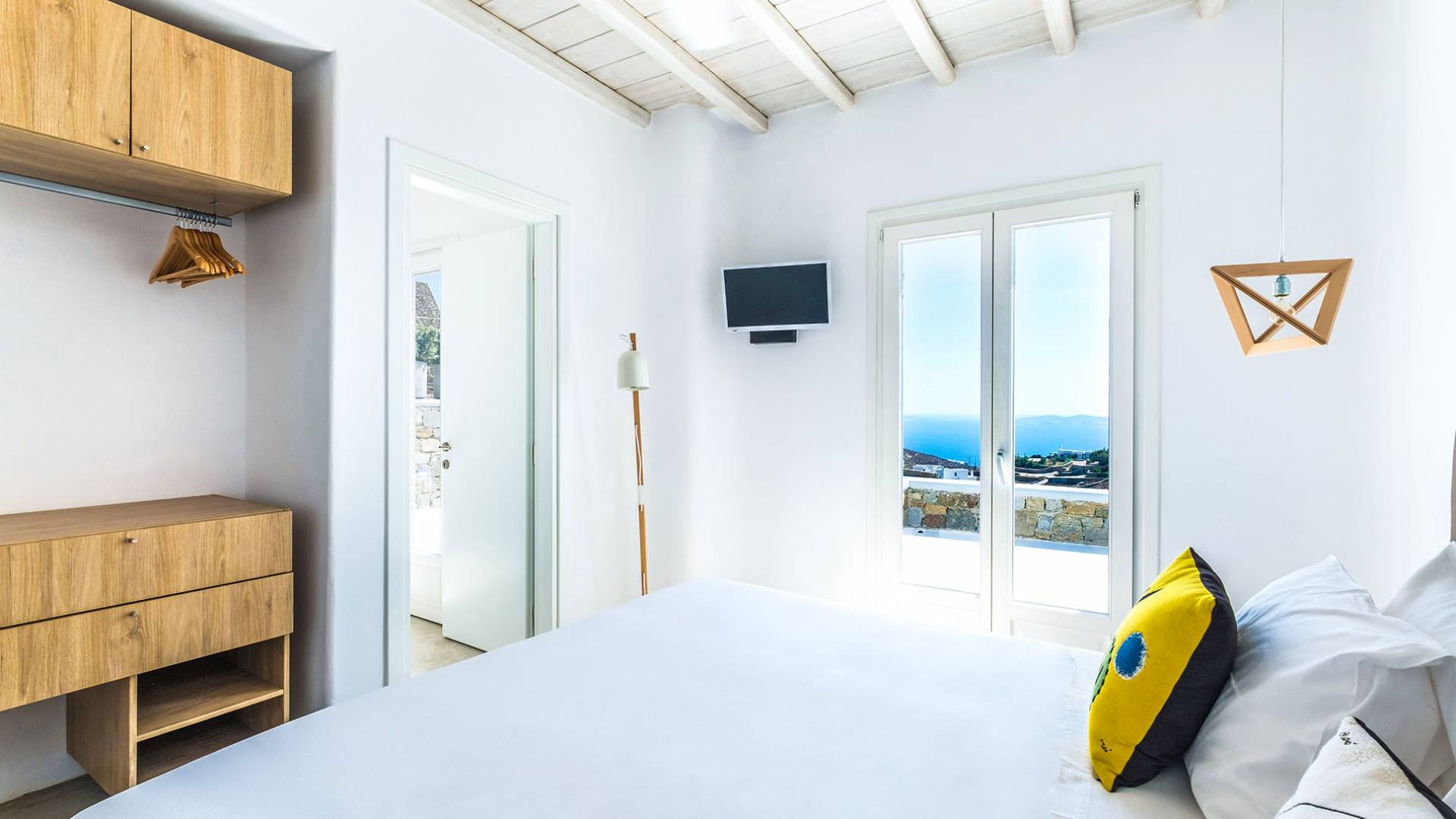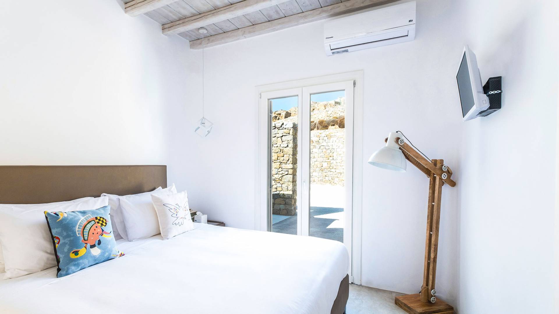 The Left Wing: First floor. Queen size bed. Sea view. TV Satellite. Air conditioning. Fan. Closet with a safe. Private bathroom. Double sink. Mykonian Shower. Quick room access to first-floor sunbeds. Size 19m2. The Back Side: First floor. Queen size bed.TV Satellite. Air conditioning. Closet with a safe. Private bathroom. Double sink. Mykonian shower. Quick room access to hammock room and rooftop stairs. Size 14m2.