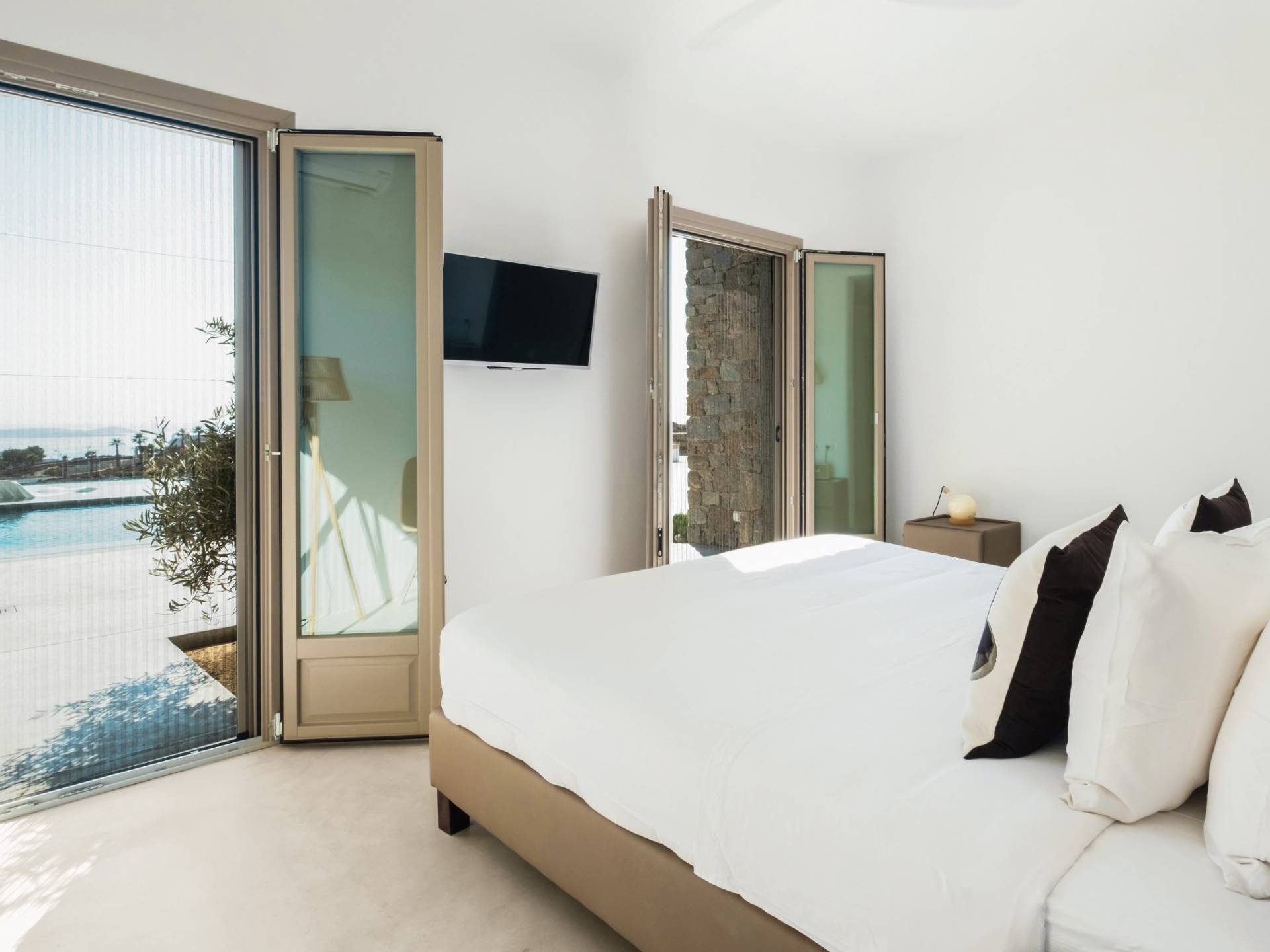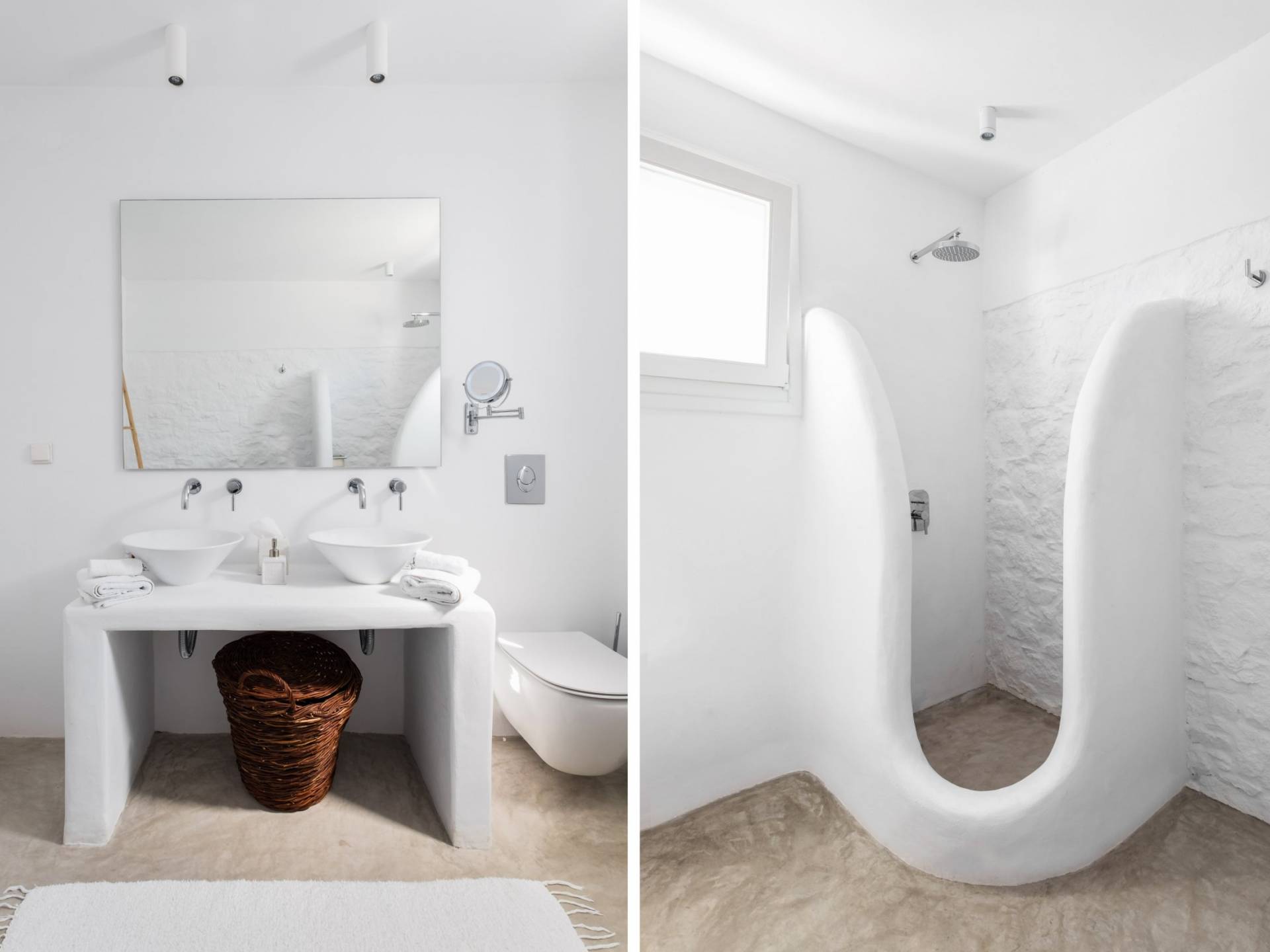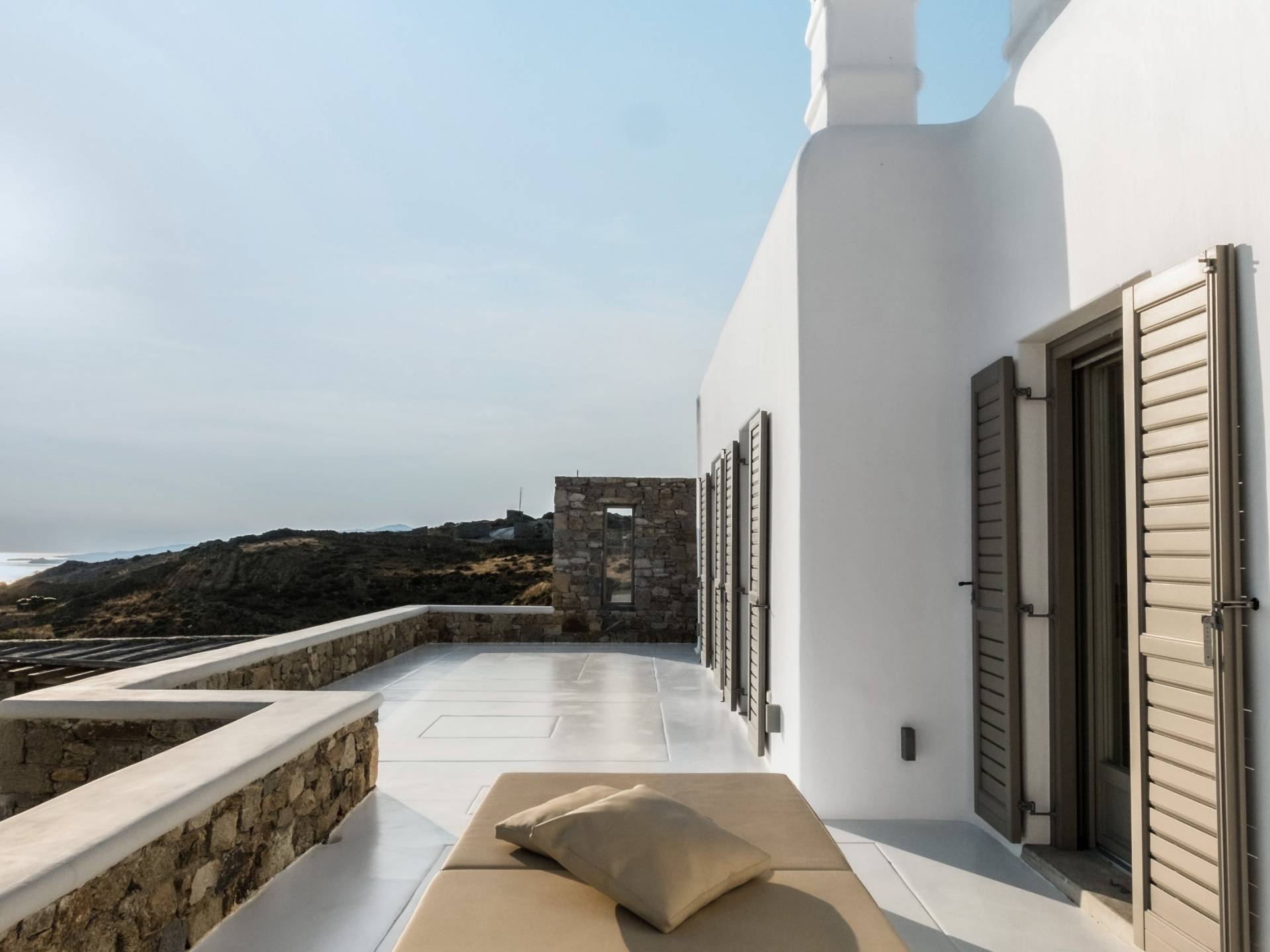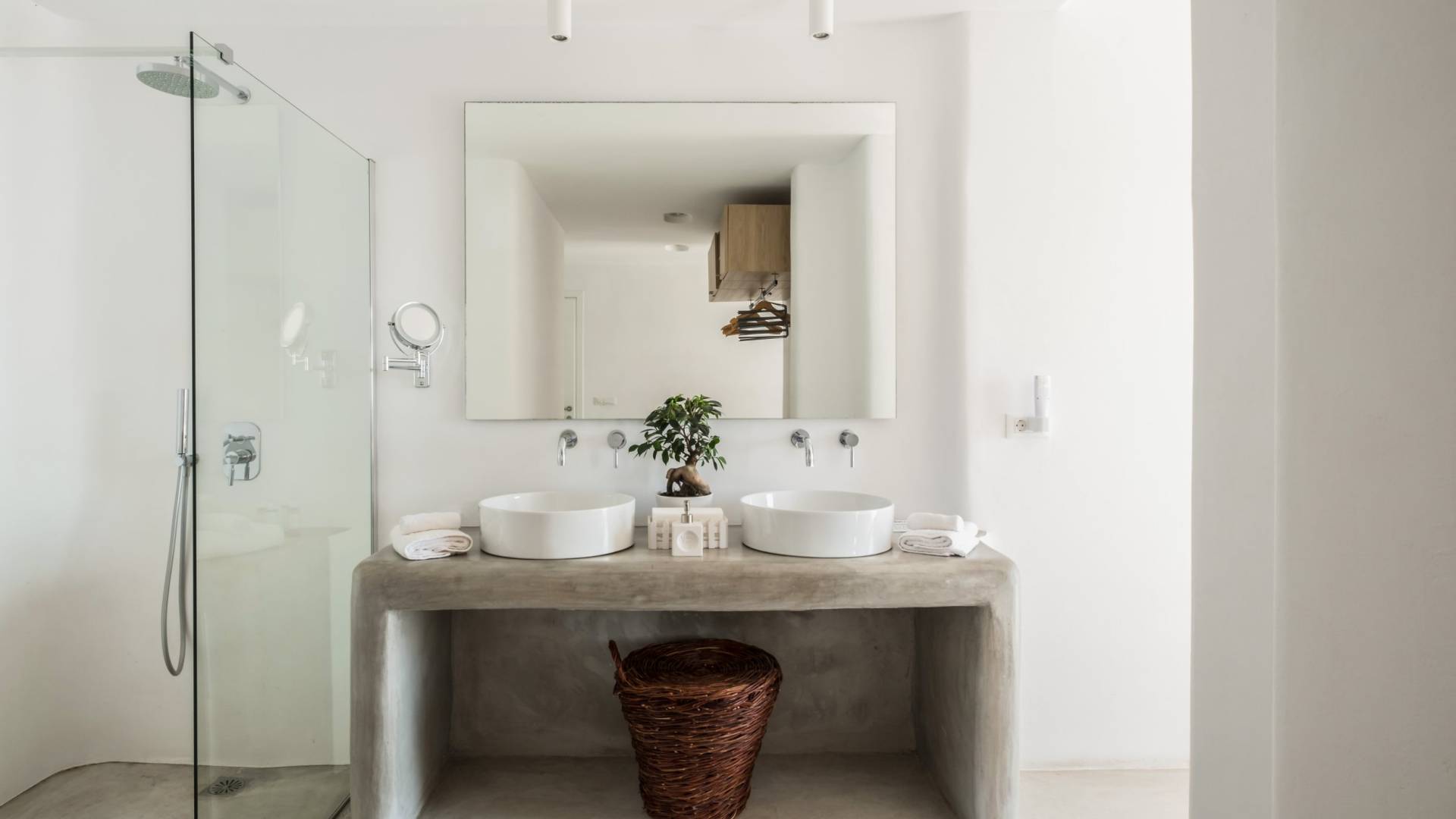 The Left Wing: First floor. Queen size bed. Sea view. TV Satellite. Air conditioning. Fan. Closet with a safe. Private bathroom. Double sink. Mykonian Shower. Quick room access to first-floor sunbeds. Size 19m2. The Back Side: First floor. Queen size bed.TV Satellite. Air conditioning. Closet with a safe. Private bathroom. Double sink. Mykonian shower. Quick room access to hammock room and rooftop stairs. Size 14m2.