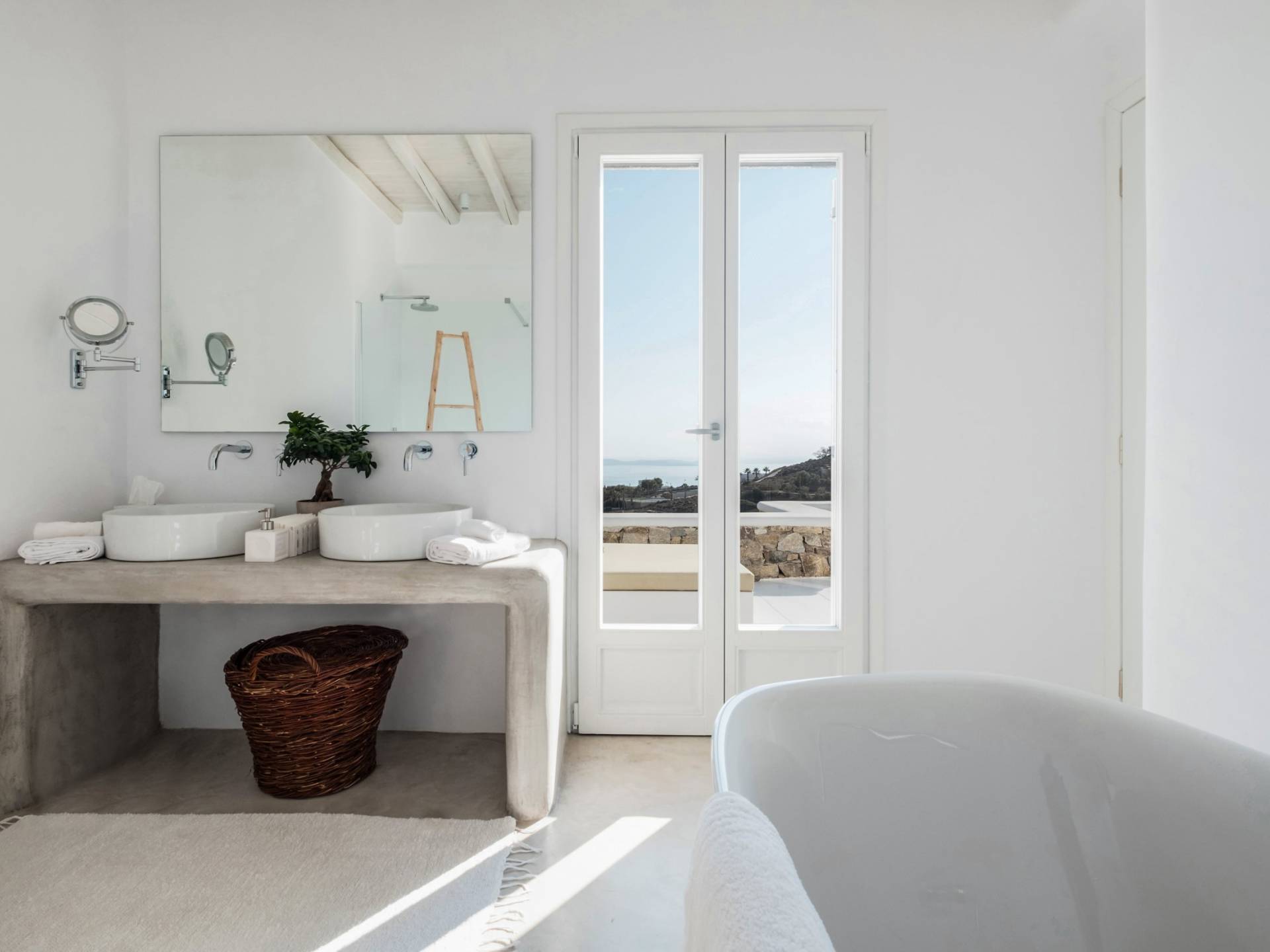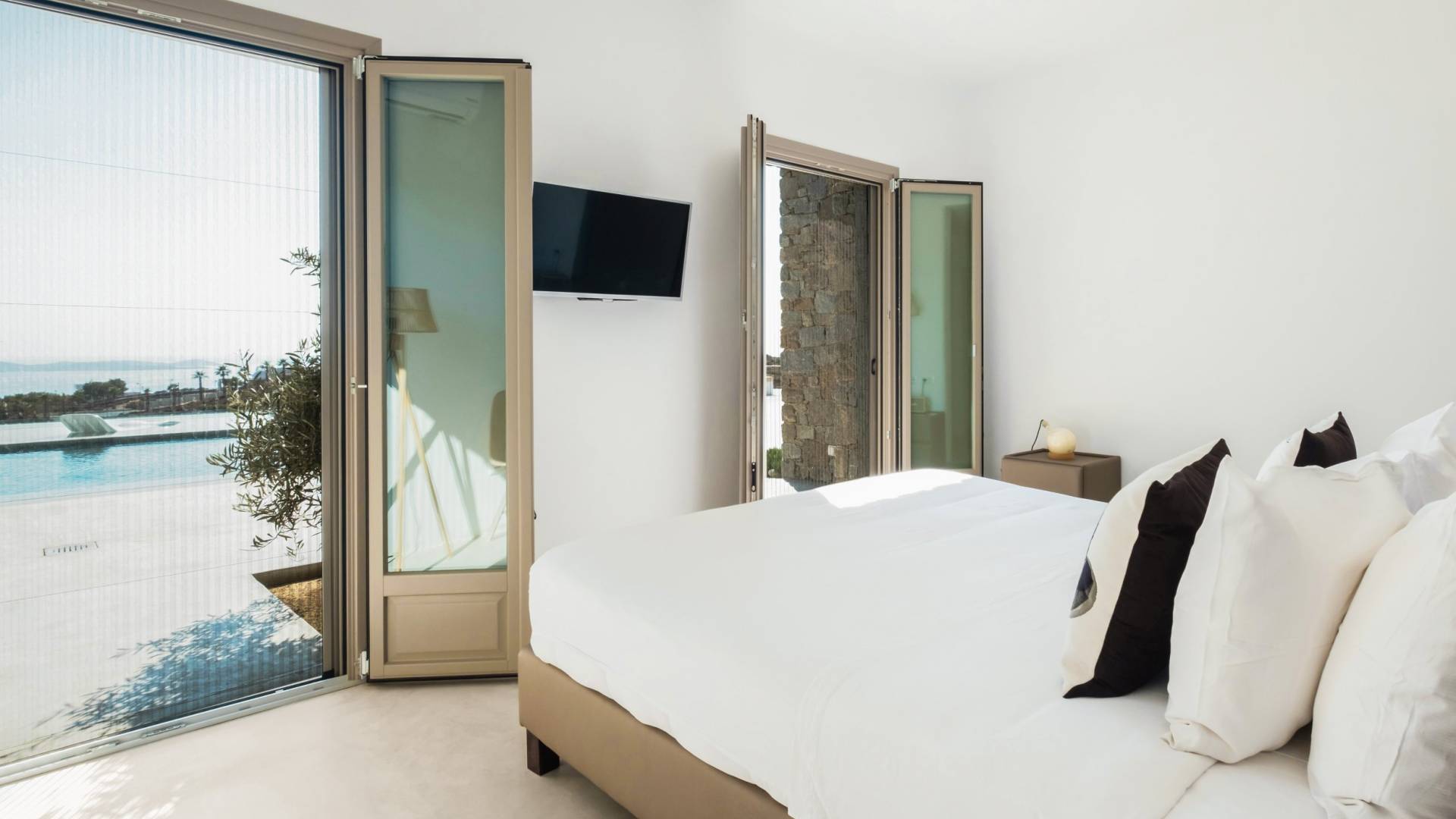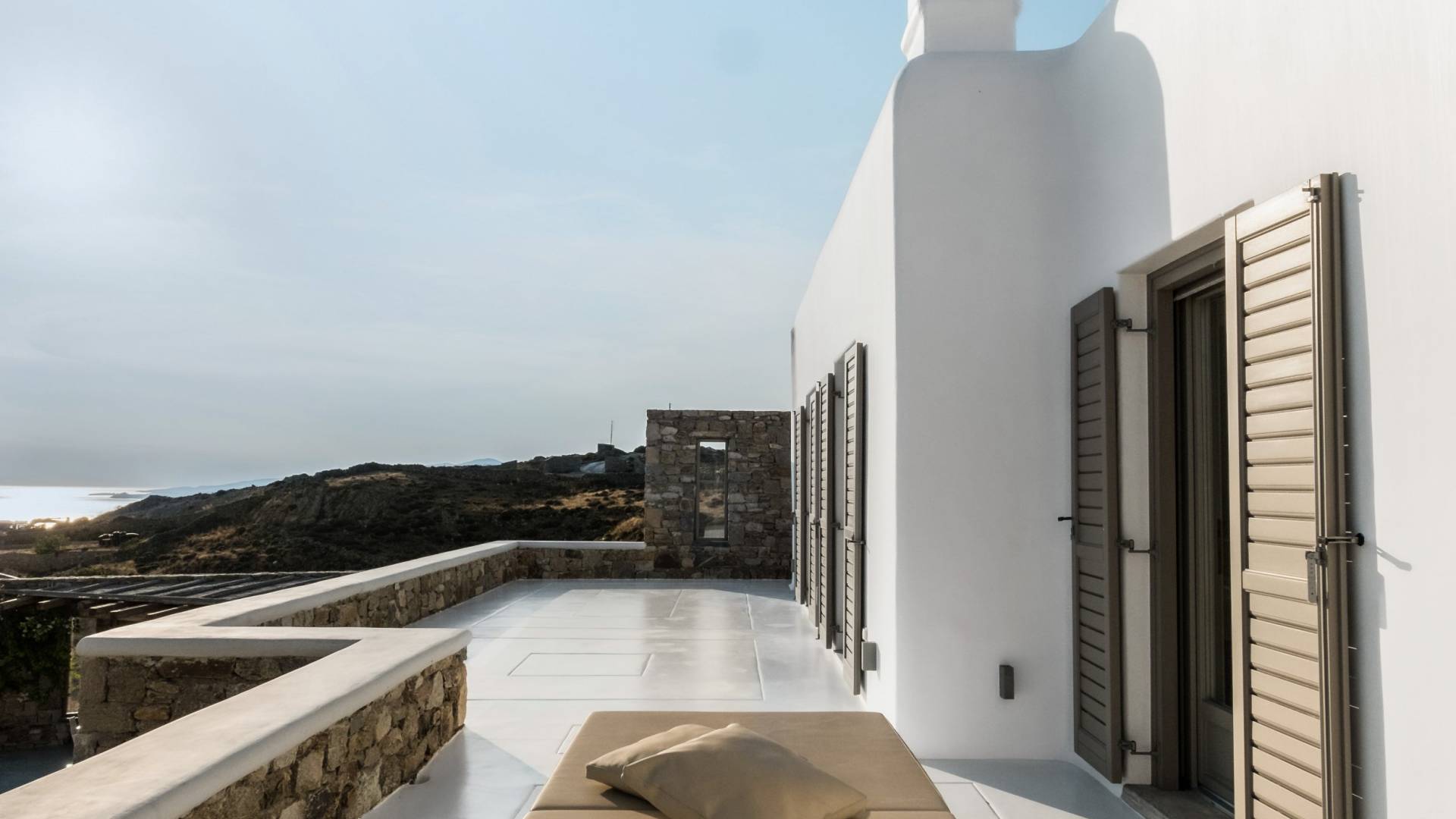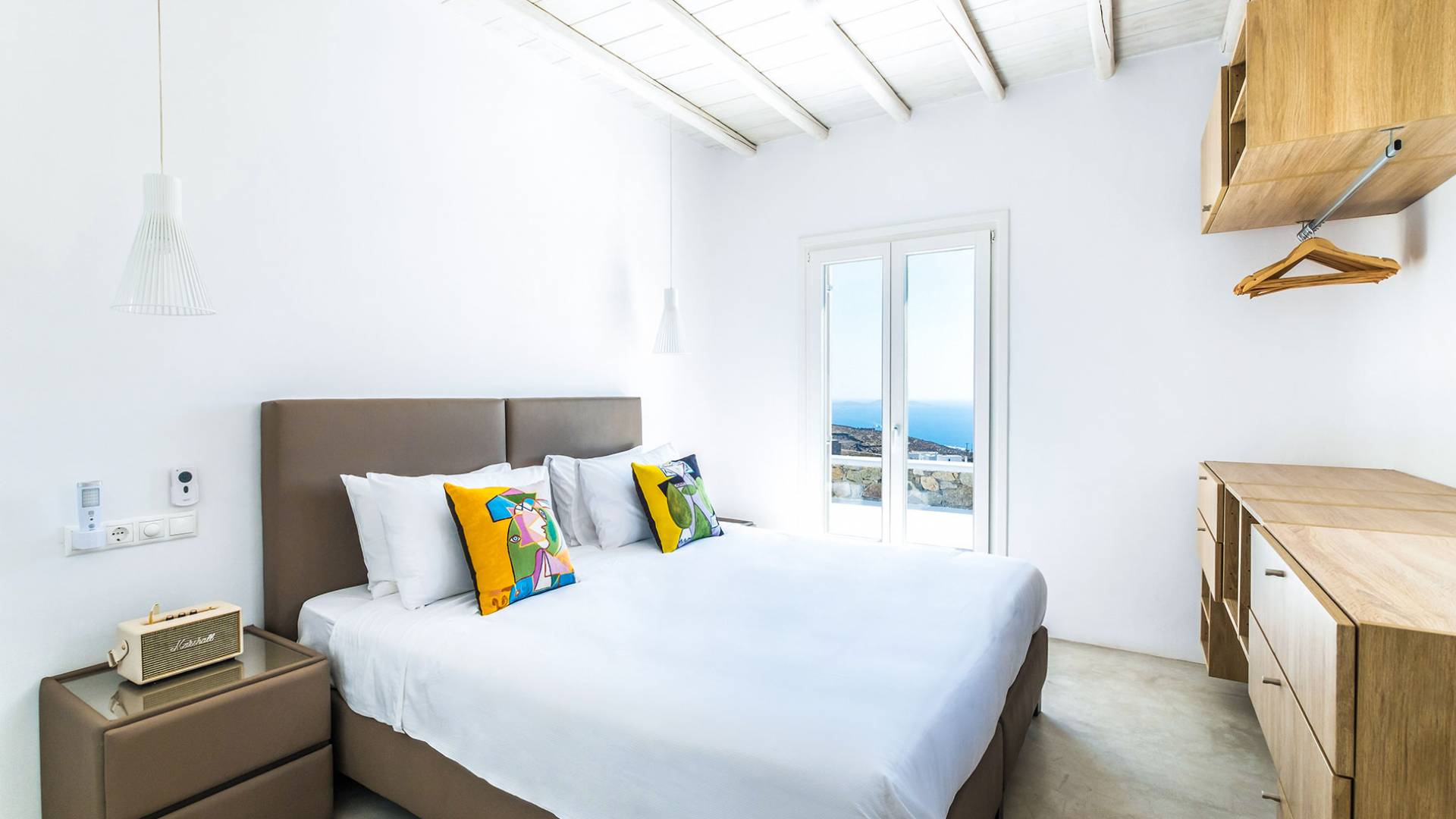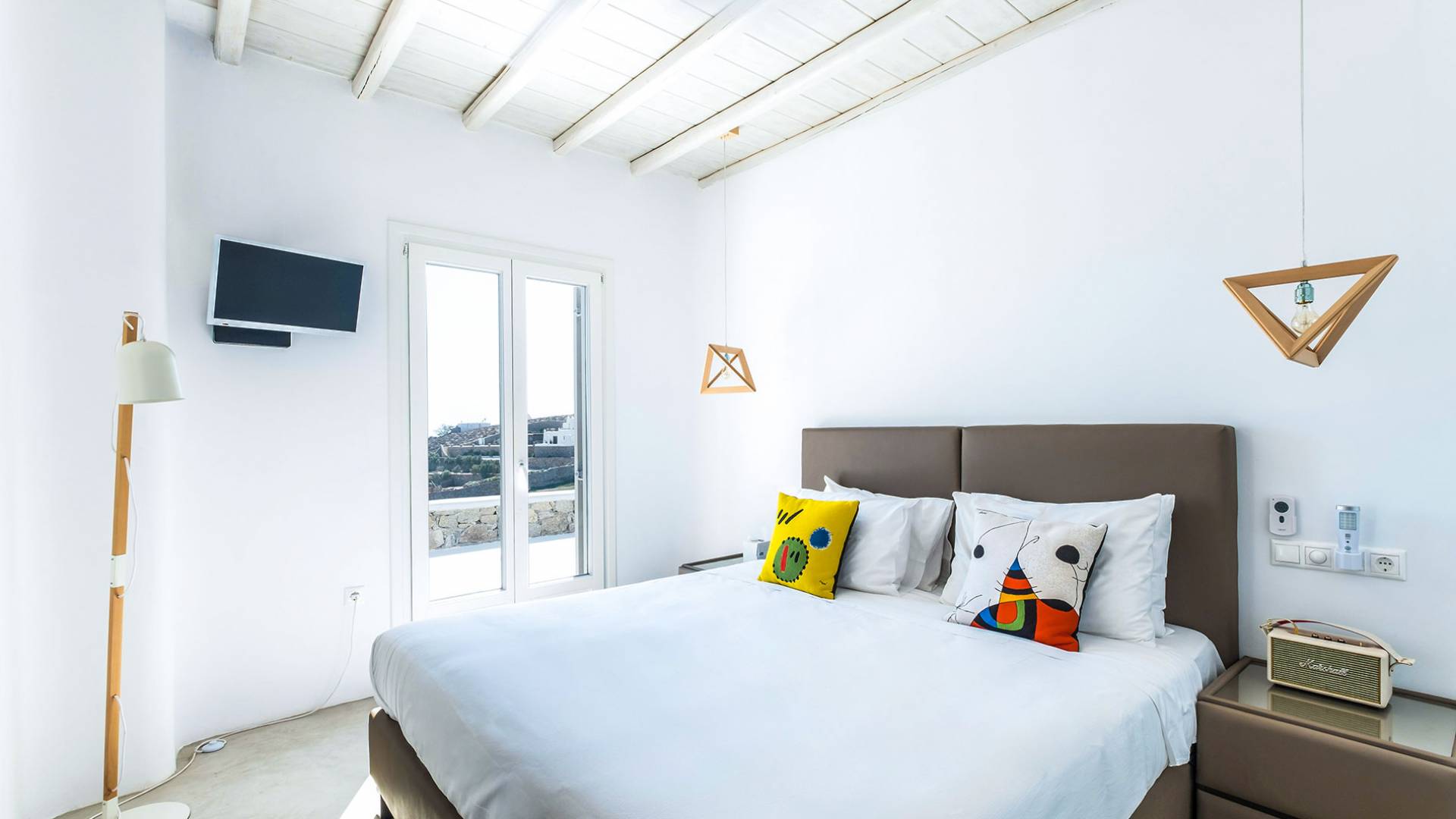 The Left Wing: First floor. Queen size bed. Sea view. TV Satellite. Air conditioning. Fan. Closet with a safe. Private bathroom. Double sink. Mykonian Shower. Quick room access to first-floor sunbeds. Size 19m2. The Back Side: First floor. Queen size bed.TV Satellite. Air conditioning. Closet with a safe. Private bathroom. Double sink. Mykonian shower. Quick room access to hammock room and rooftop stairs. Size 14m2.