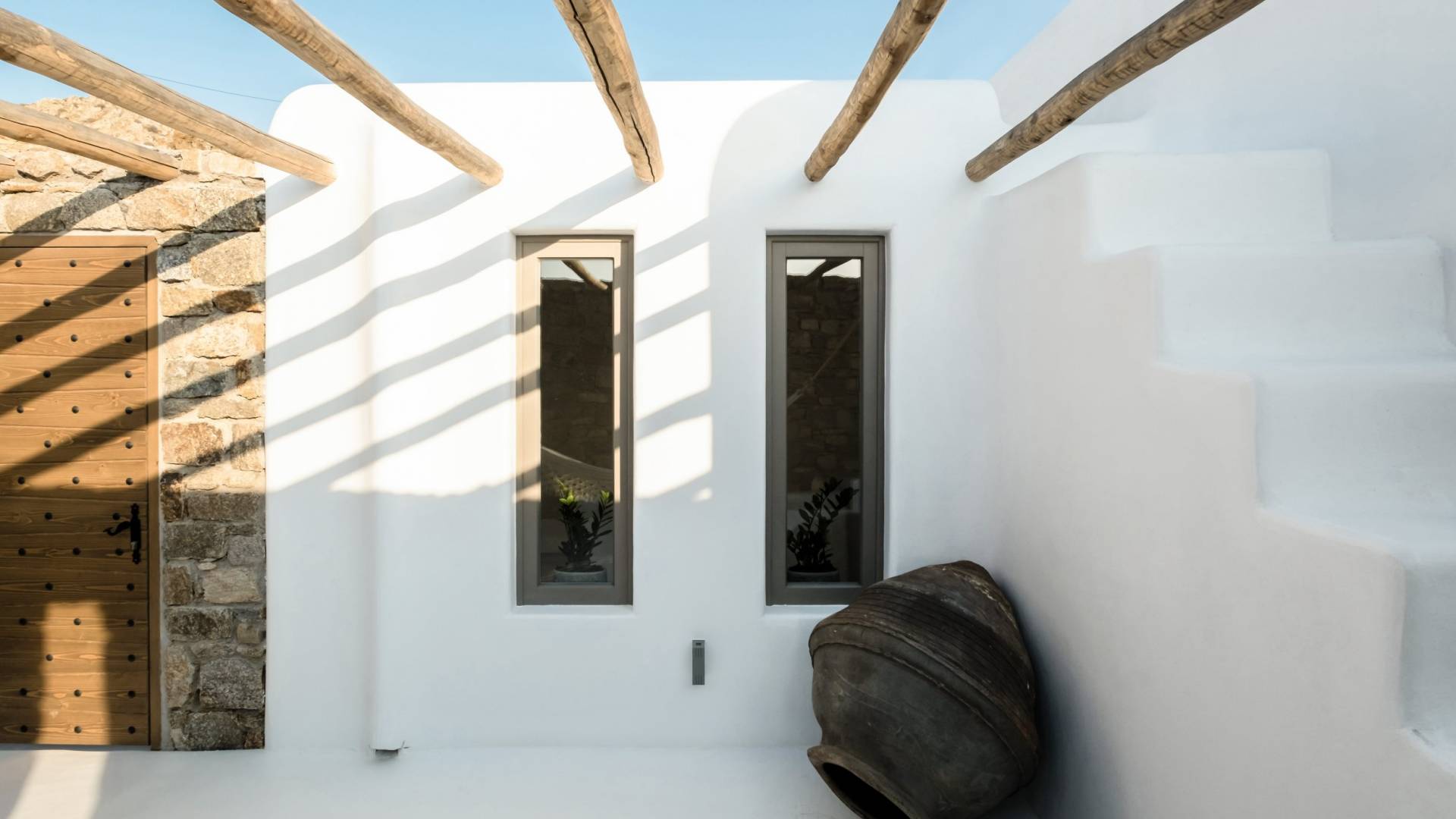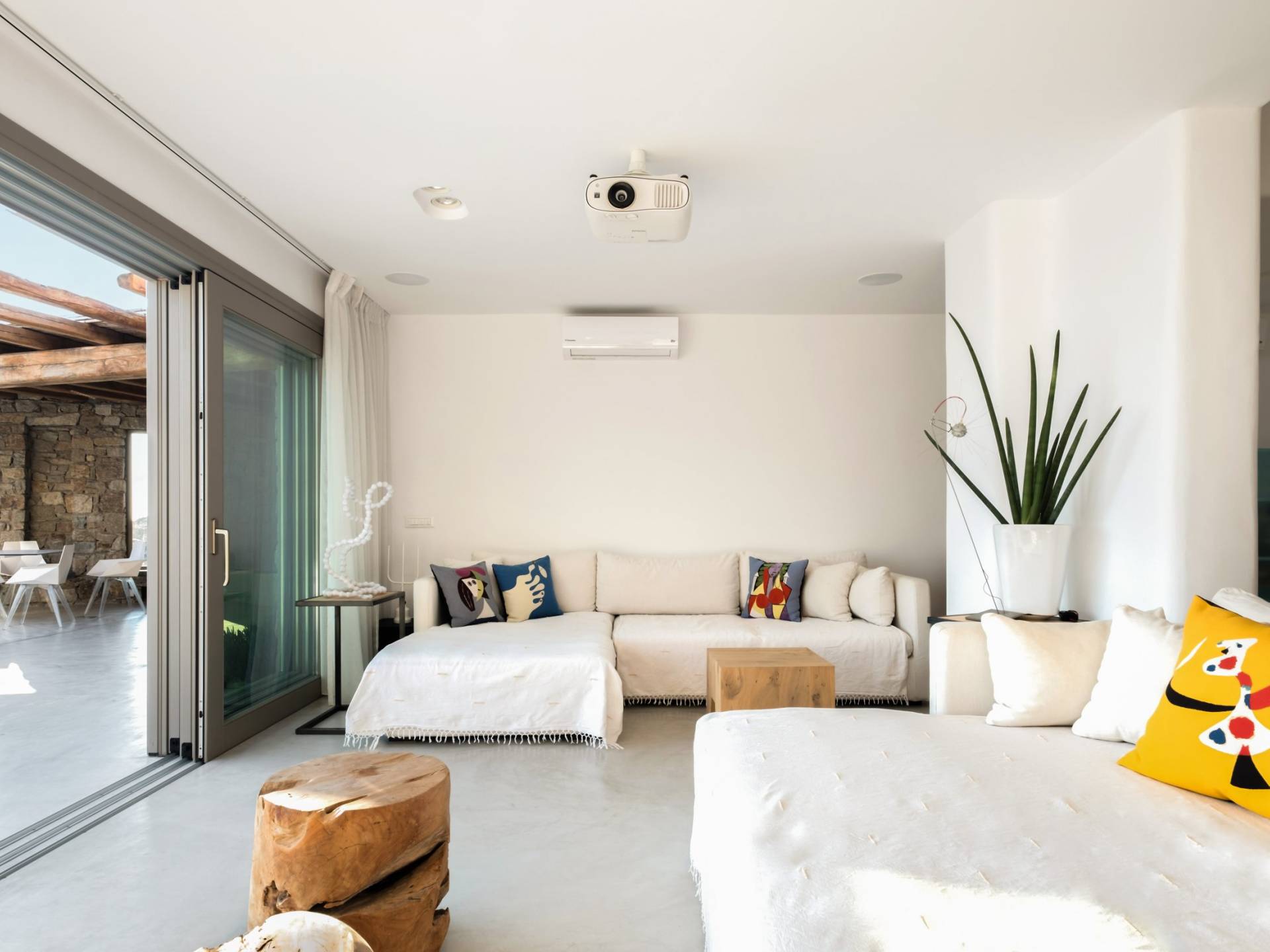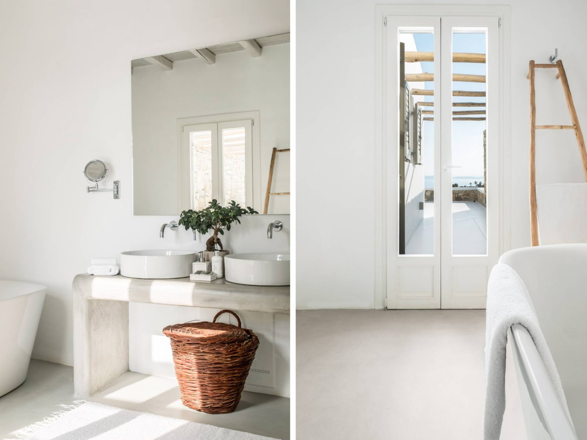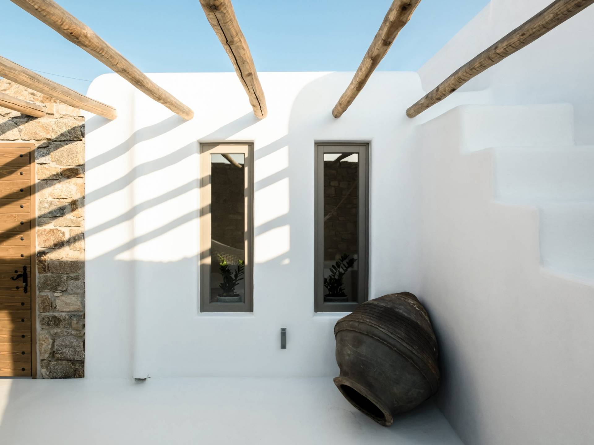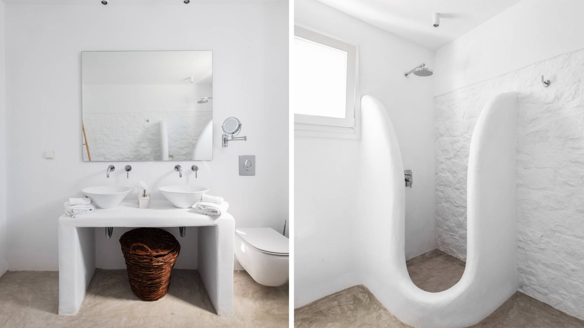 The Left Wing: First floor. Queen size bed. Sea view. TV Satellite. Air conditioning. Fan. Closet with a safe. Private bathroom. Double sink. Mykonian Shower. Quick room access to first-floor sunbeds. Size 19m2. The Back Side: First floor. Queen size bed.TV Satellite. Air conditioning. Closet with a safe. Private bathroom. Double sink. Mykonian shower. Quick room access to hammock room and rooftop stairs. Size 14m2.